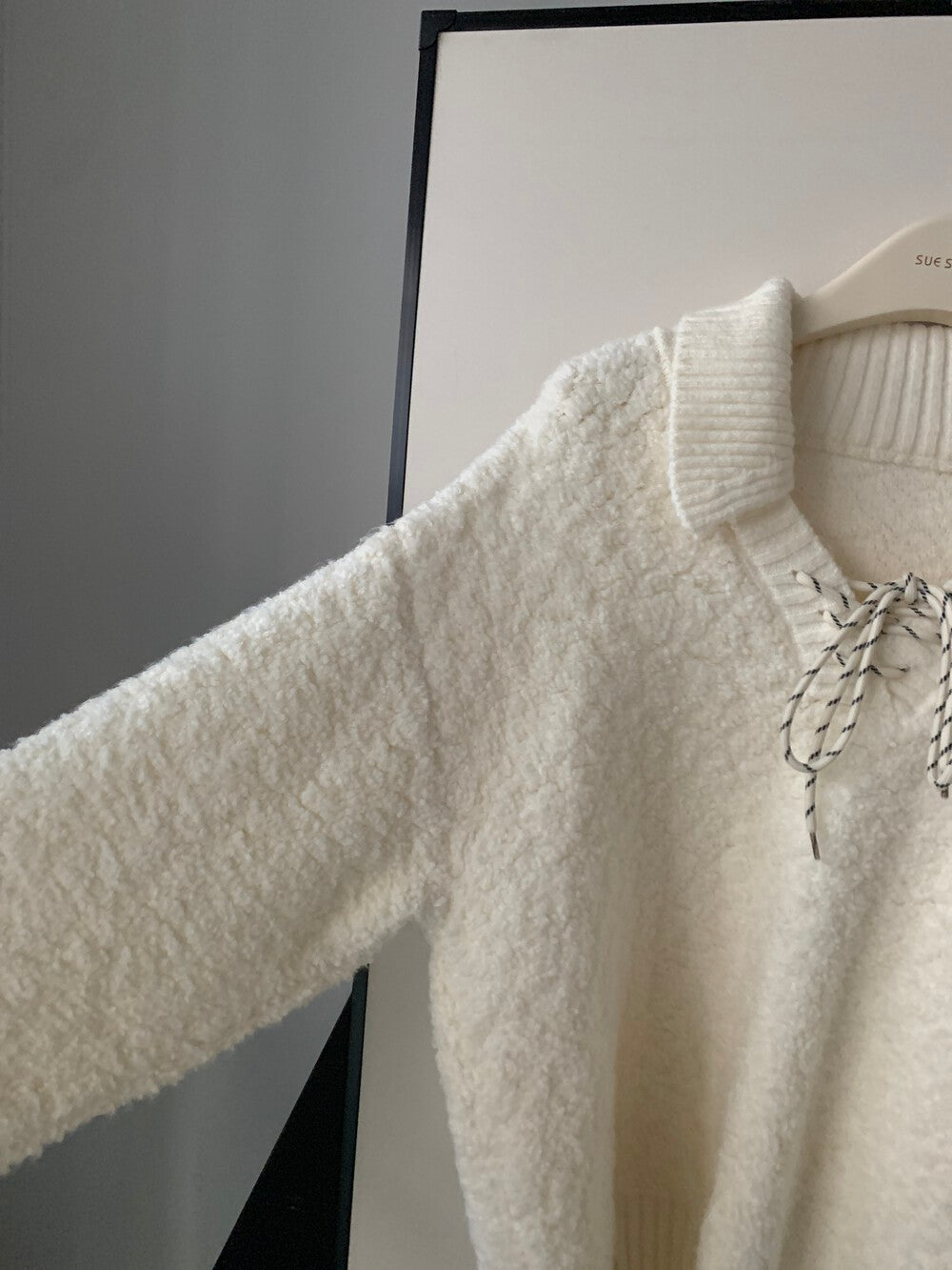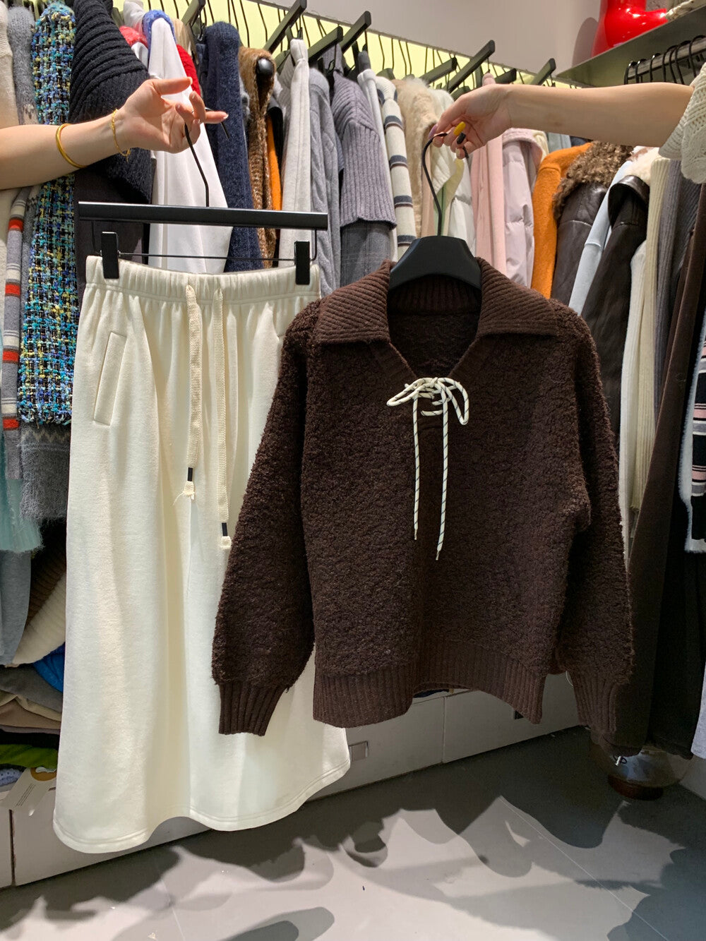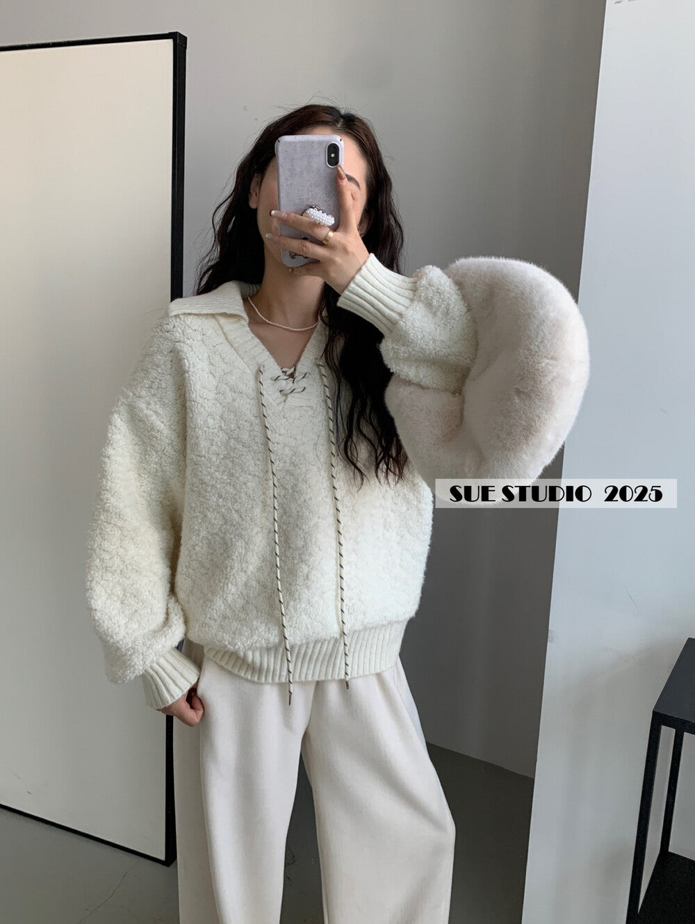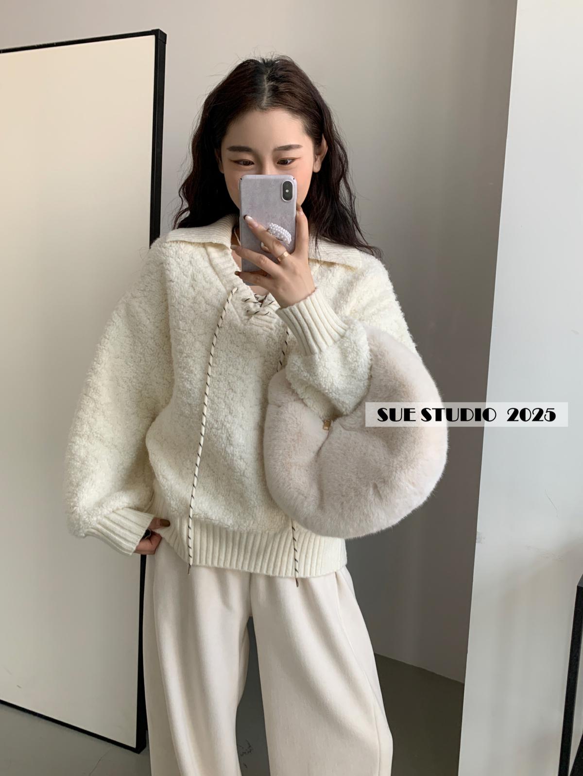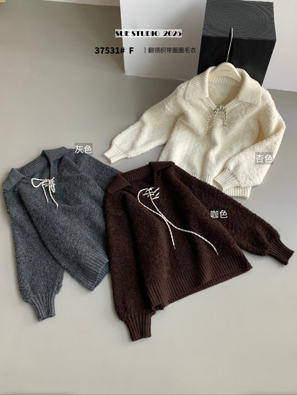 【C8189】韓系休閒翻領加厚圈圈毛套頭保暖毛衣(配織帶)