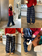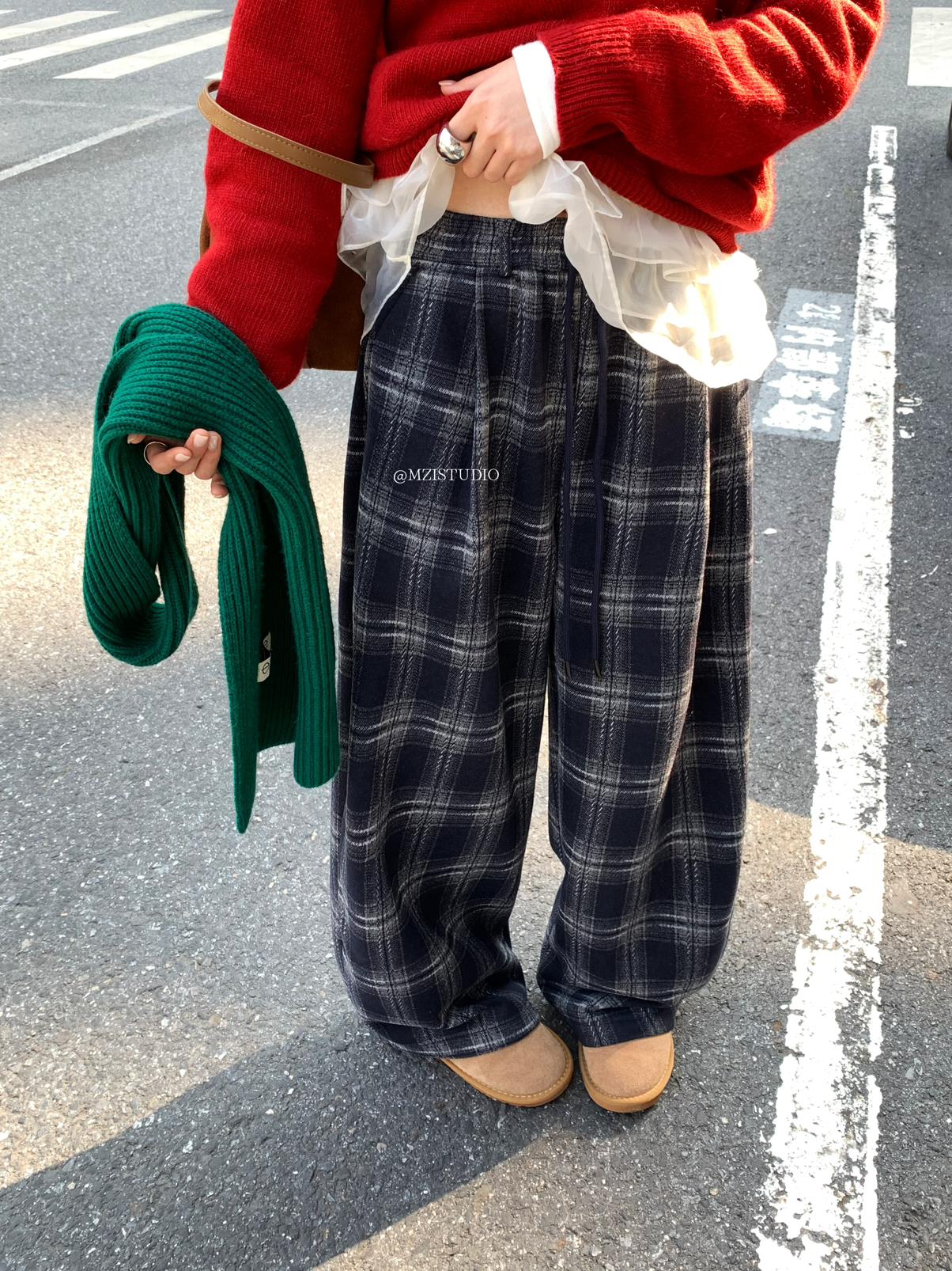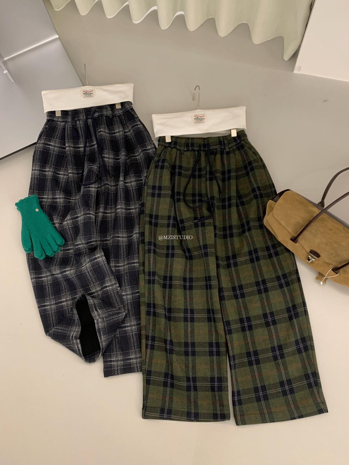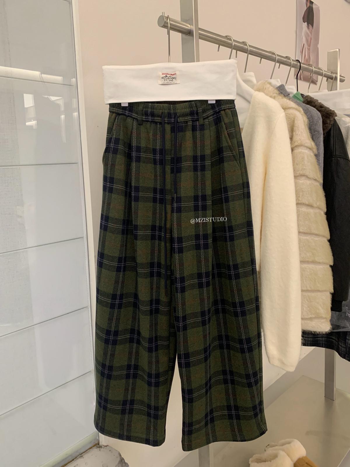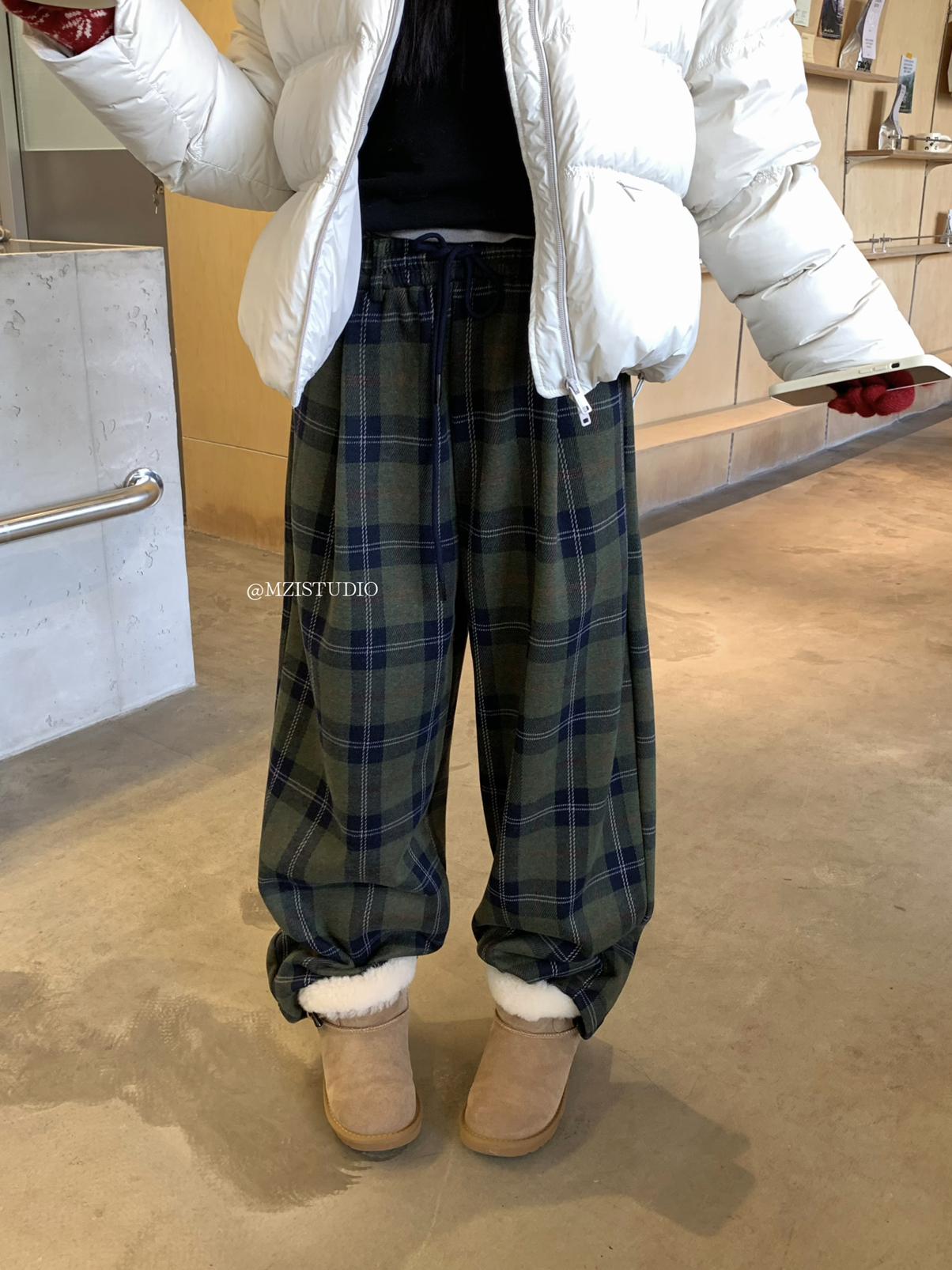 【C8199】感受細膩氣息韓系冬日毛呢加絨復古撞色格紋鬆緊腰加厚休閒褲