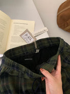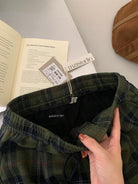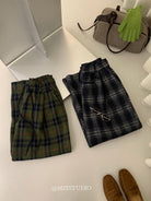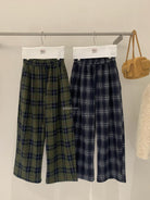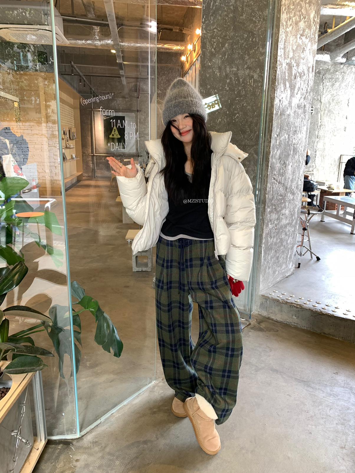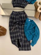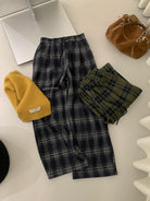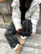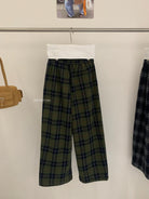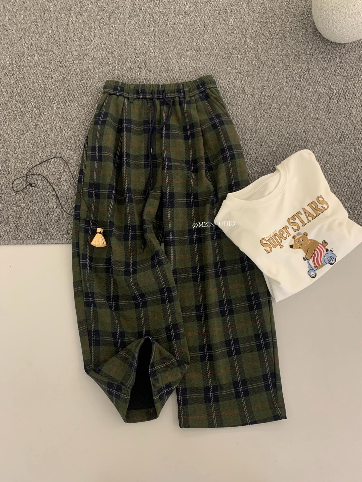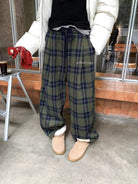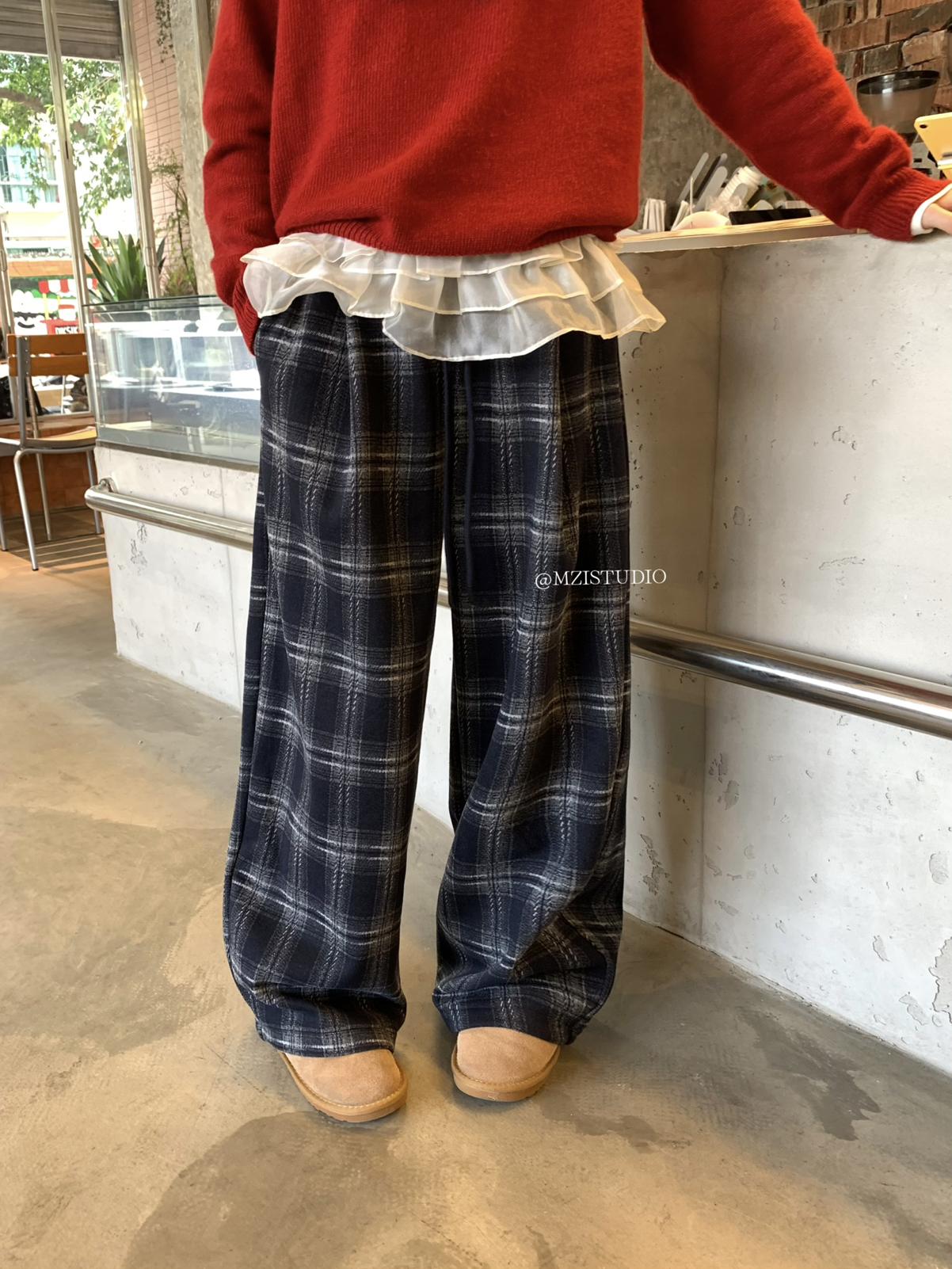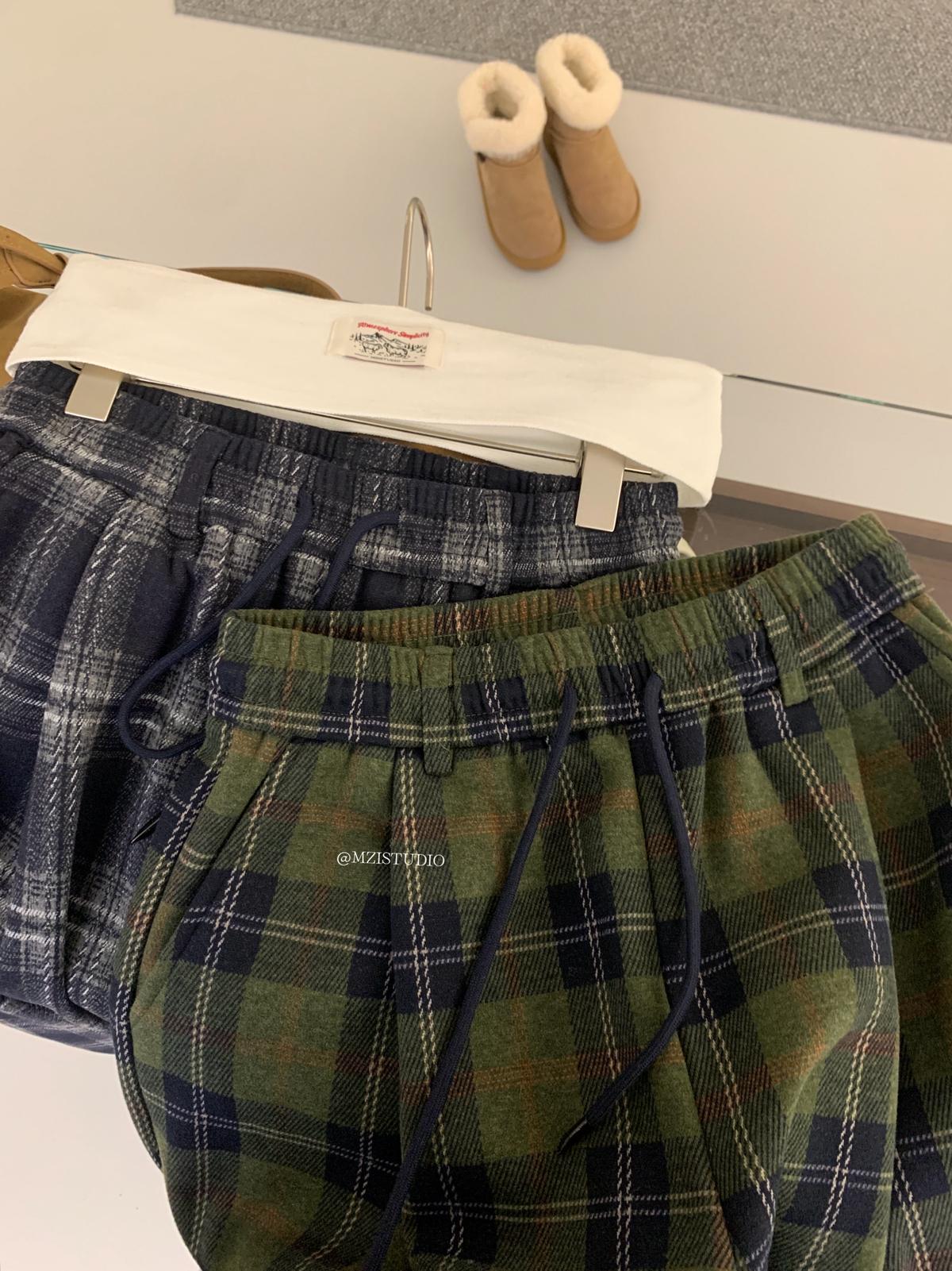 【C8199】感受細膩氣息韓系冬日毛呢加絨復古撞色格紋鬆緊腰加厚休閒褲