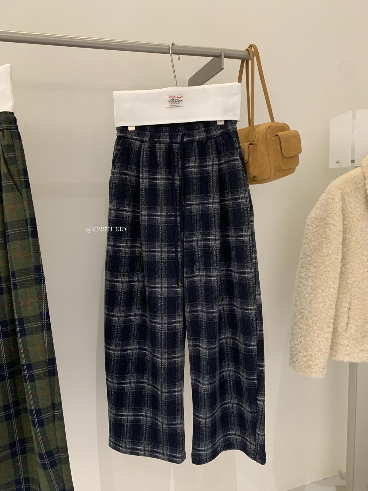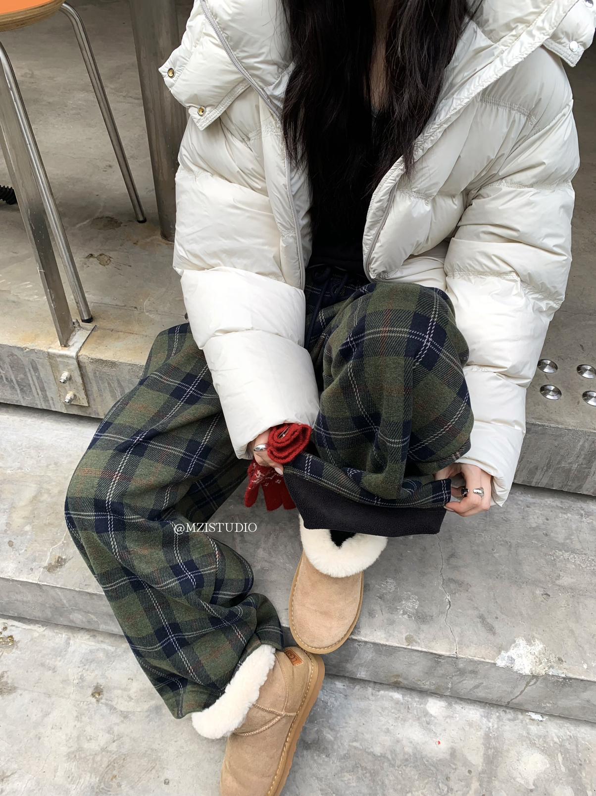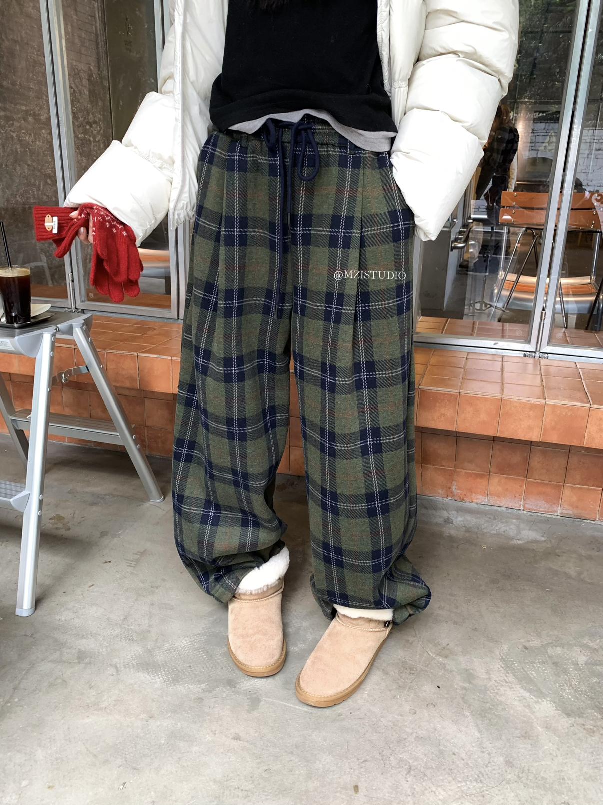 3. 【C8199】感受細膩氣息韓系冬日毛呢加絨復古撞色格紋鬆緊腰加厚休閒褲
