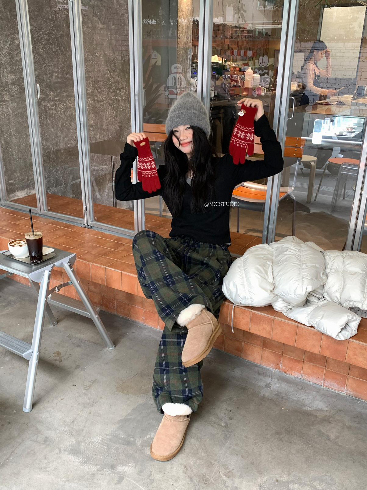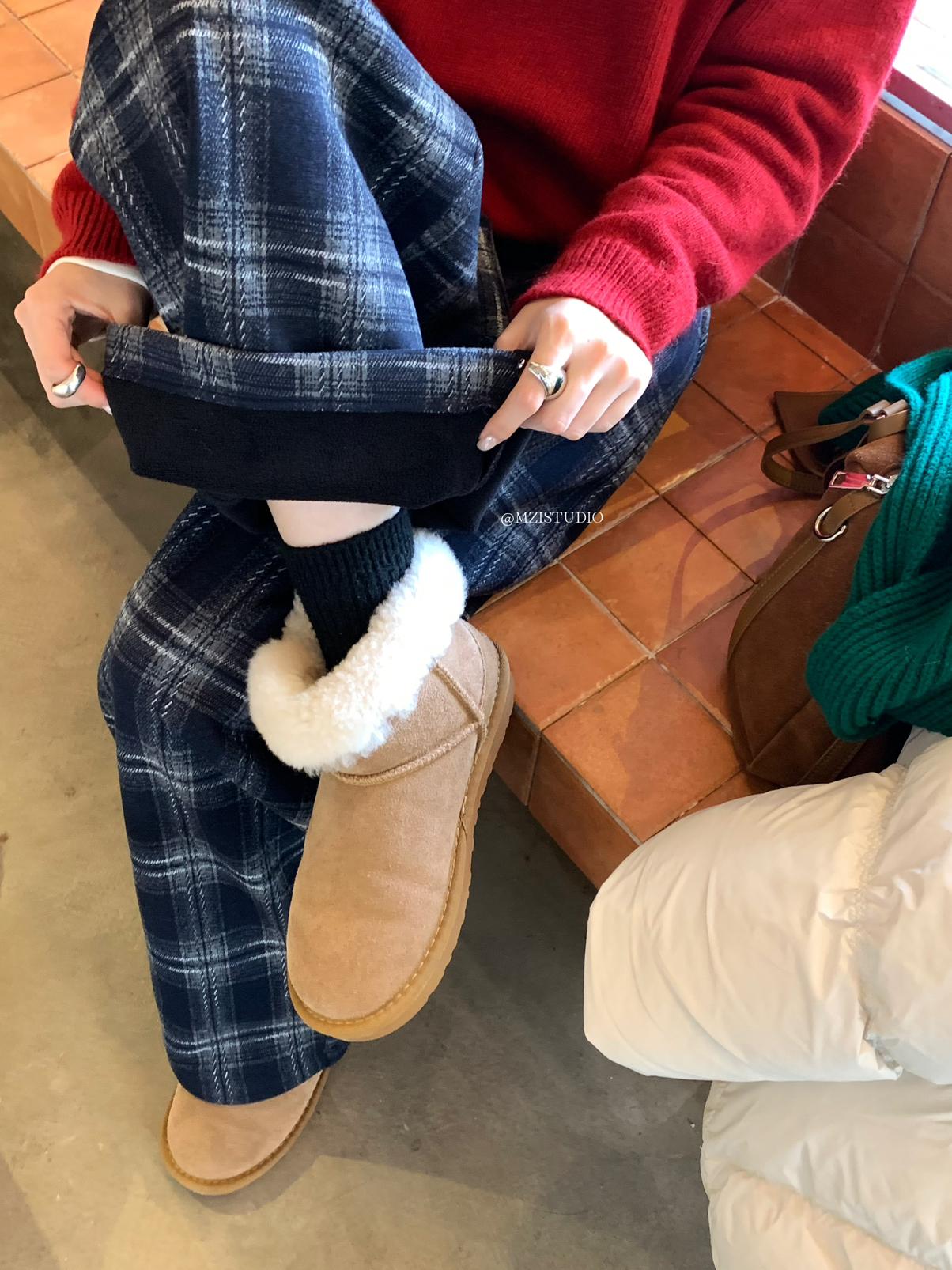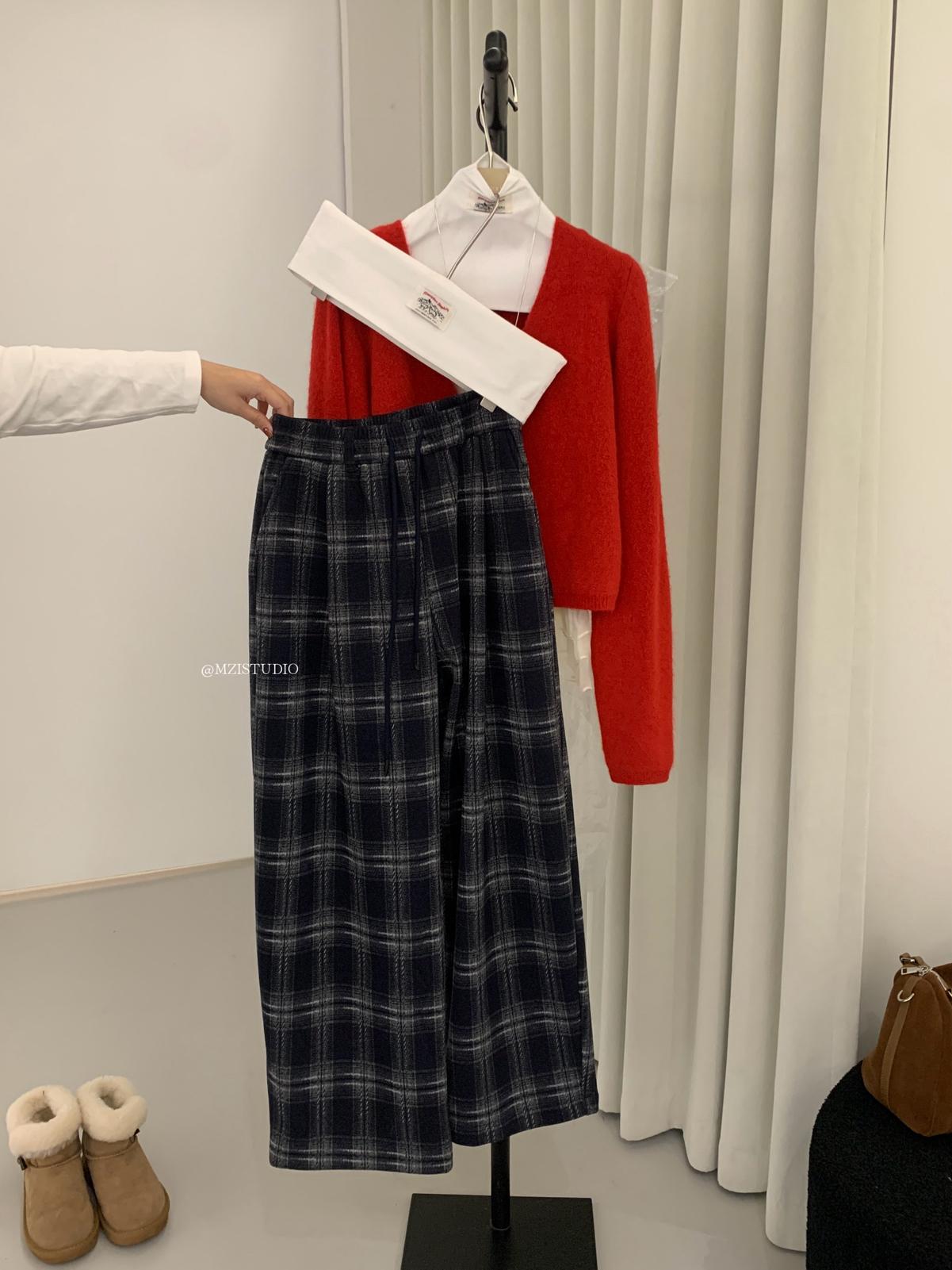 3. 【C8199】感受細膩氣息韓系冬日毛呢加絨復古撞色格紋鬆緊腰加厚休閒褲