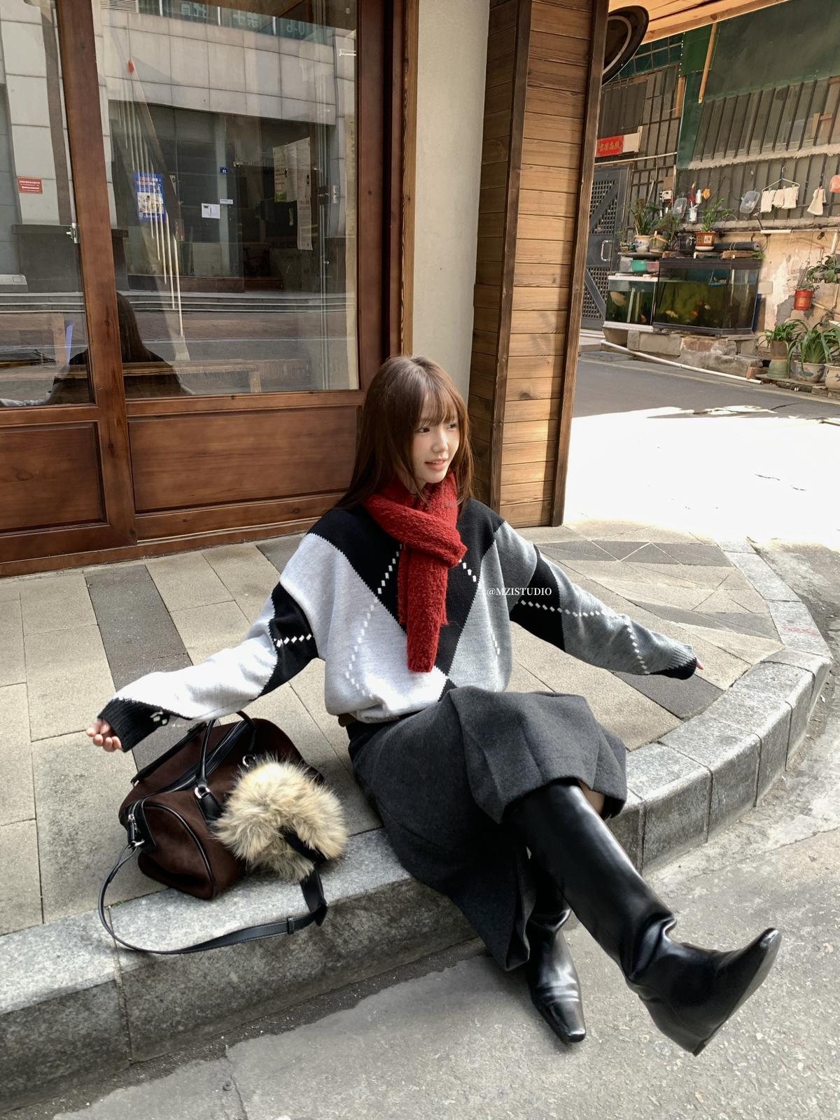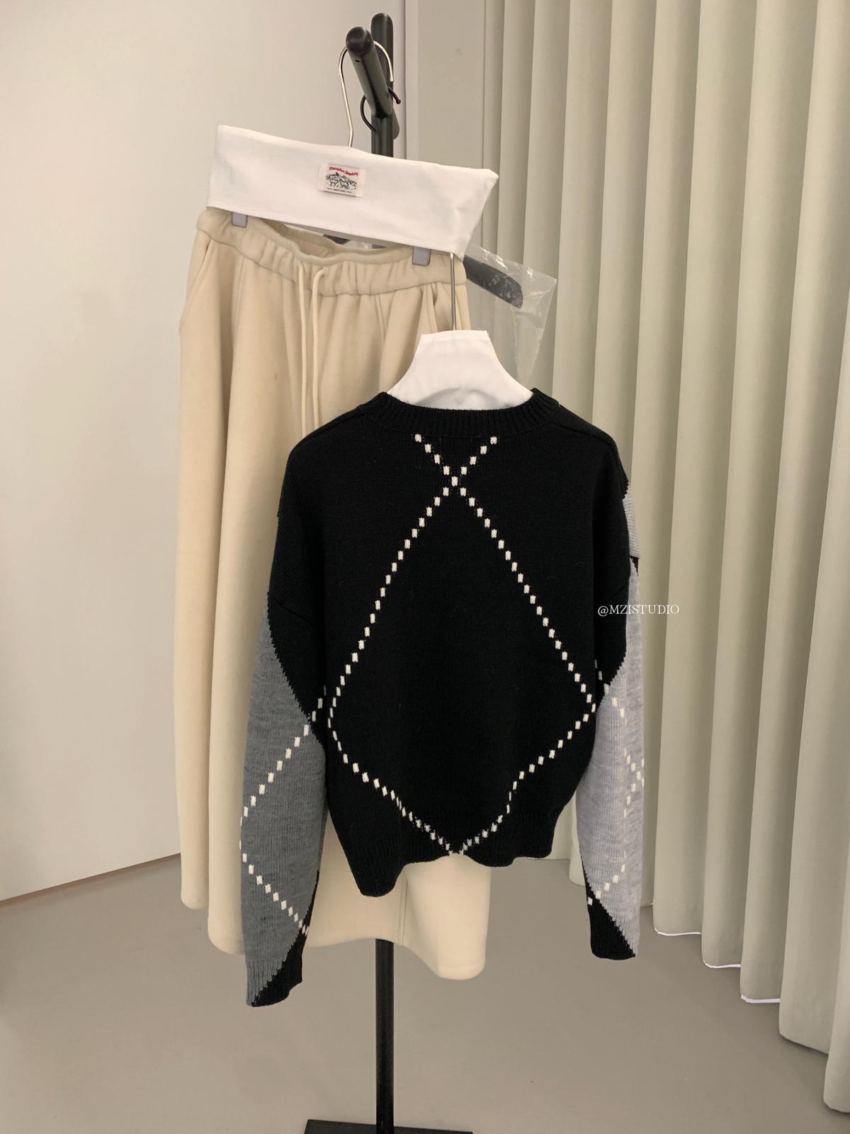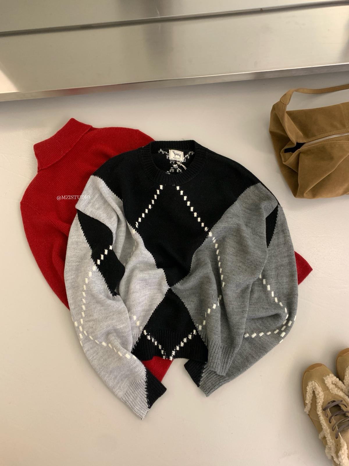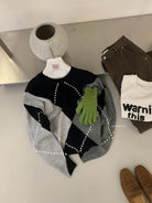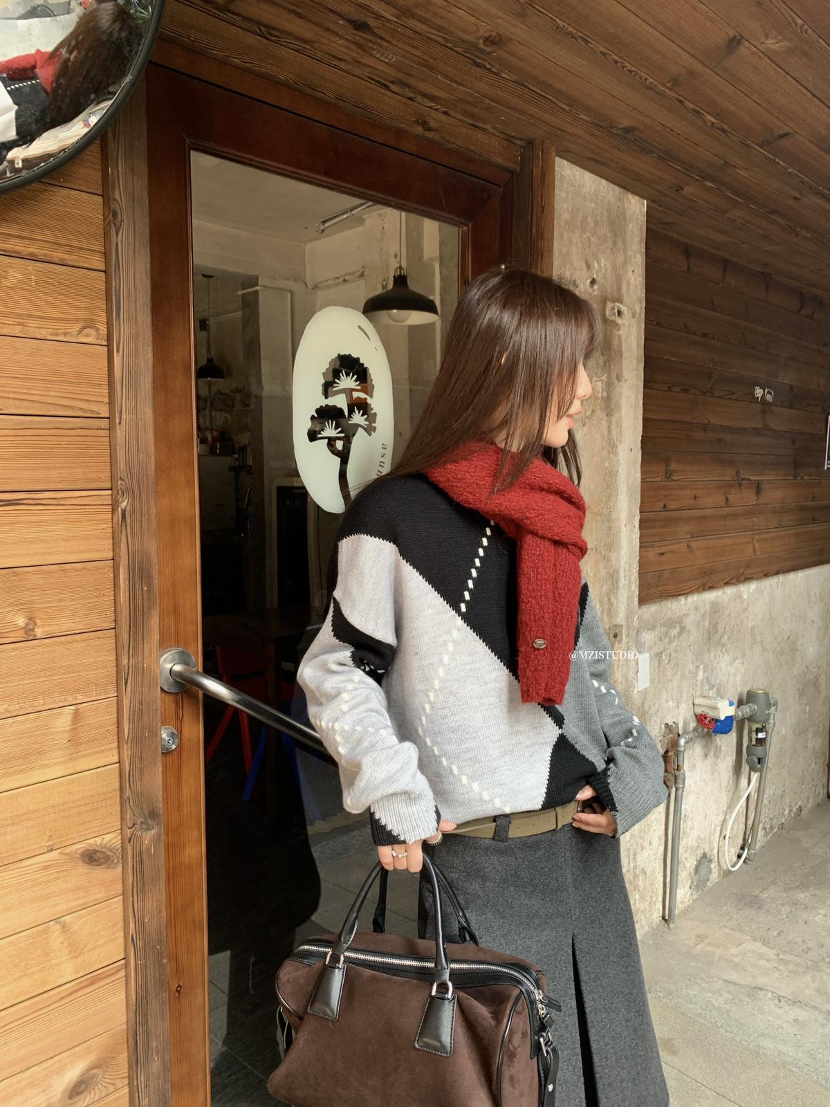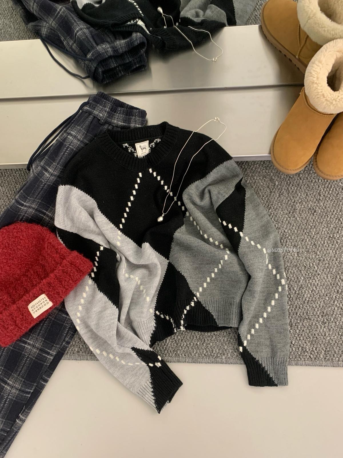 3. 【C8201】經典不過時韓版大菱形復古冬日神祕黑灰色軟糯套頭保暖毛衣(含20%羊毛)