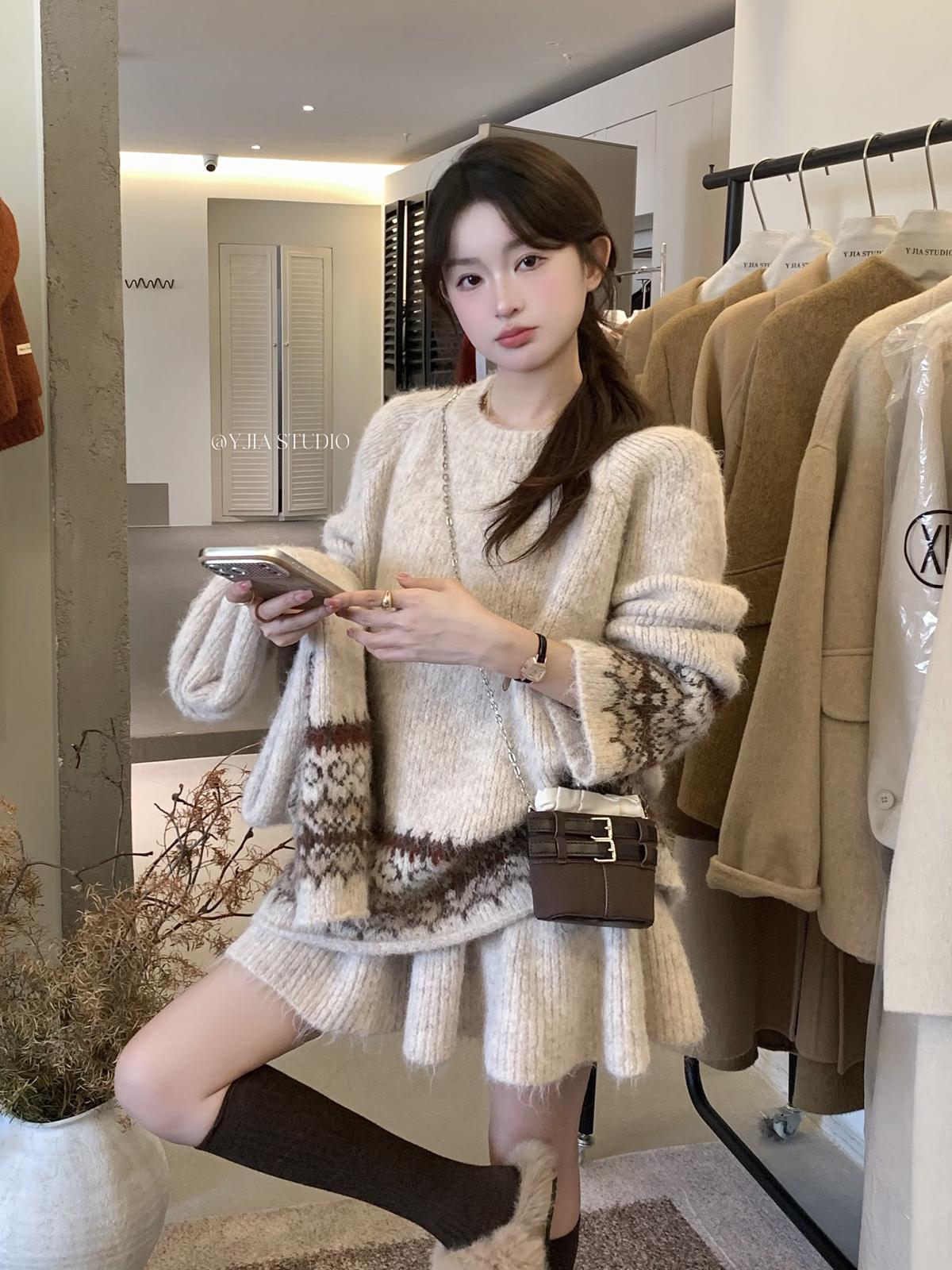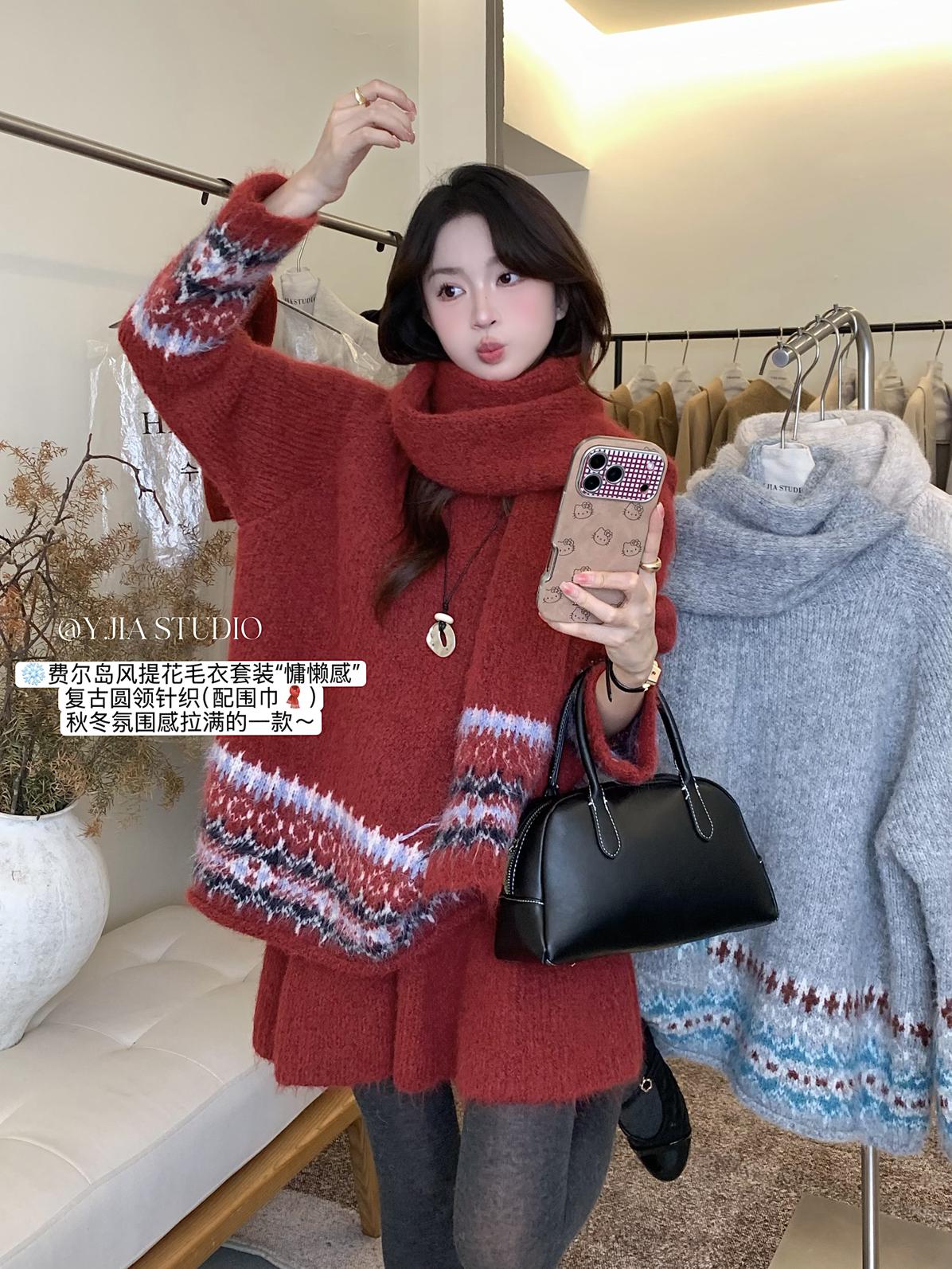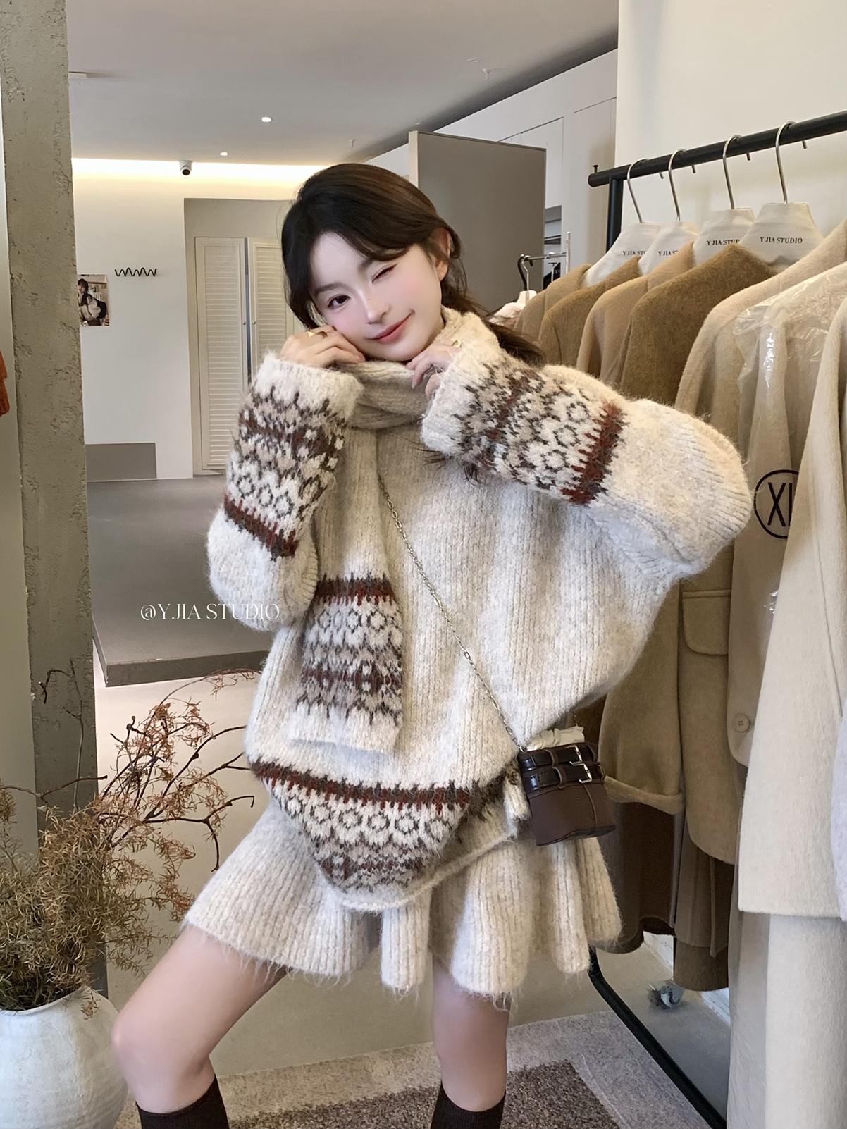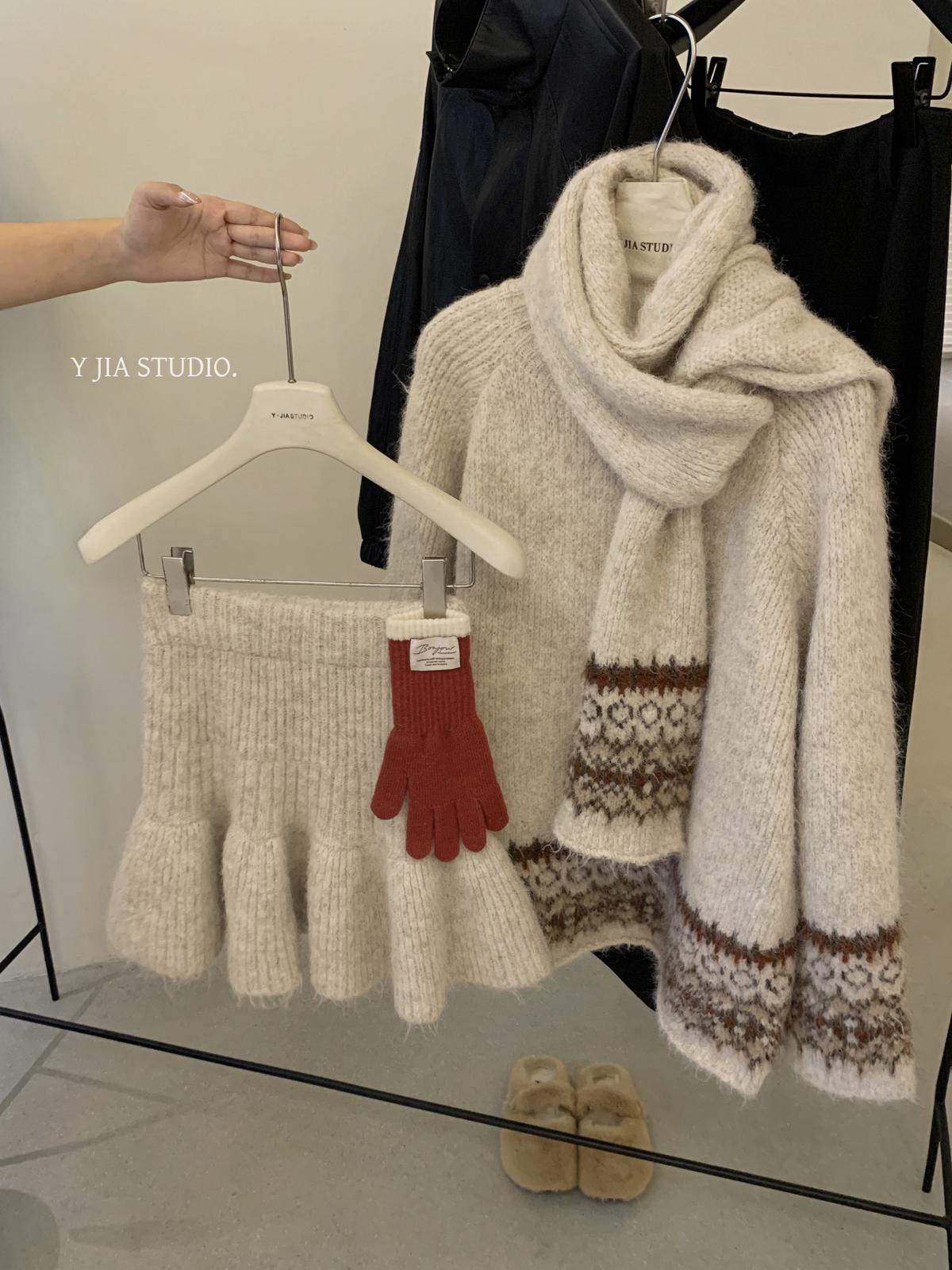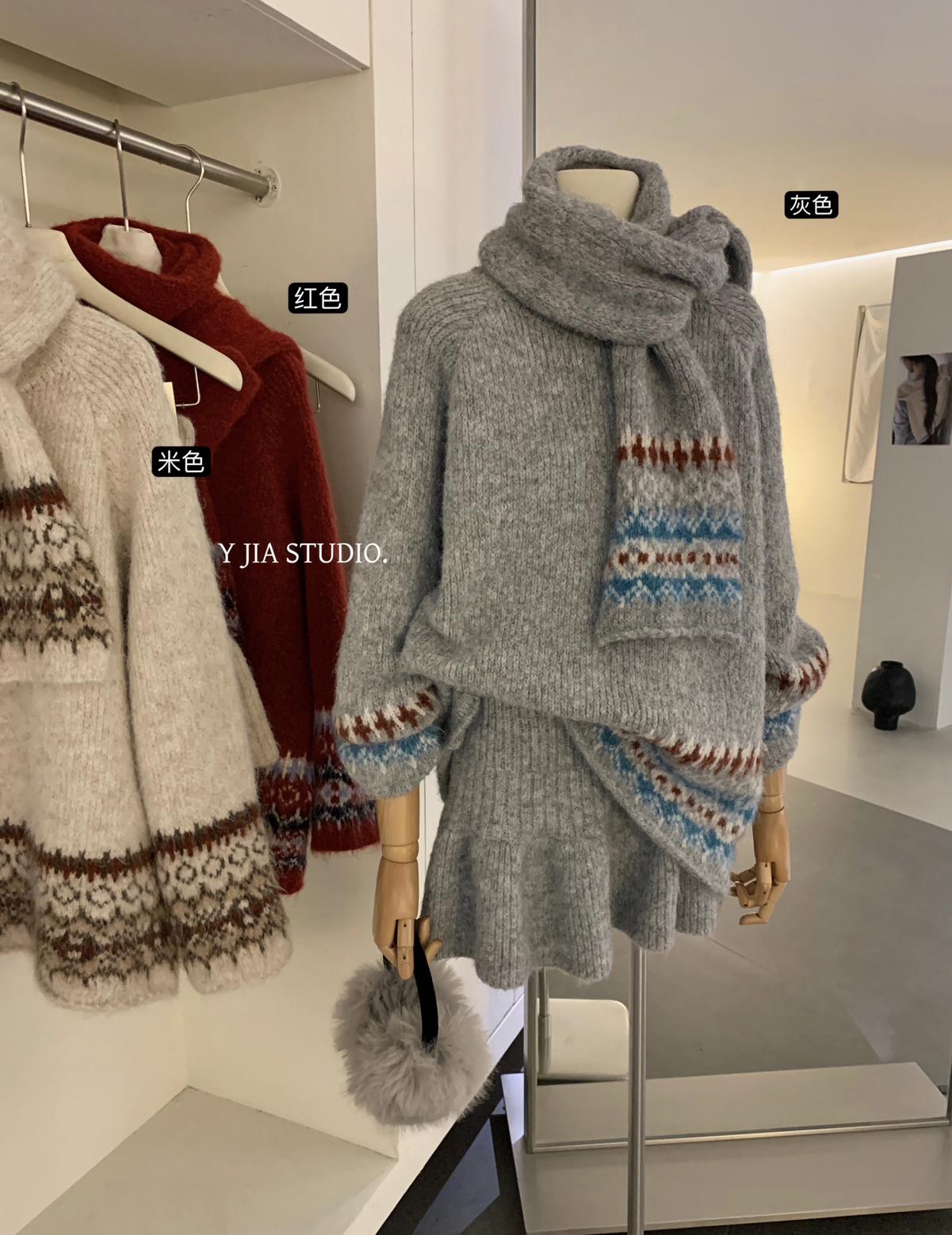 【C8203】秋冬費爾島風復古慵懶風提花毛衣+短裙套裝(配圍巾)