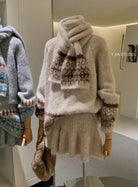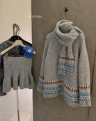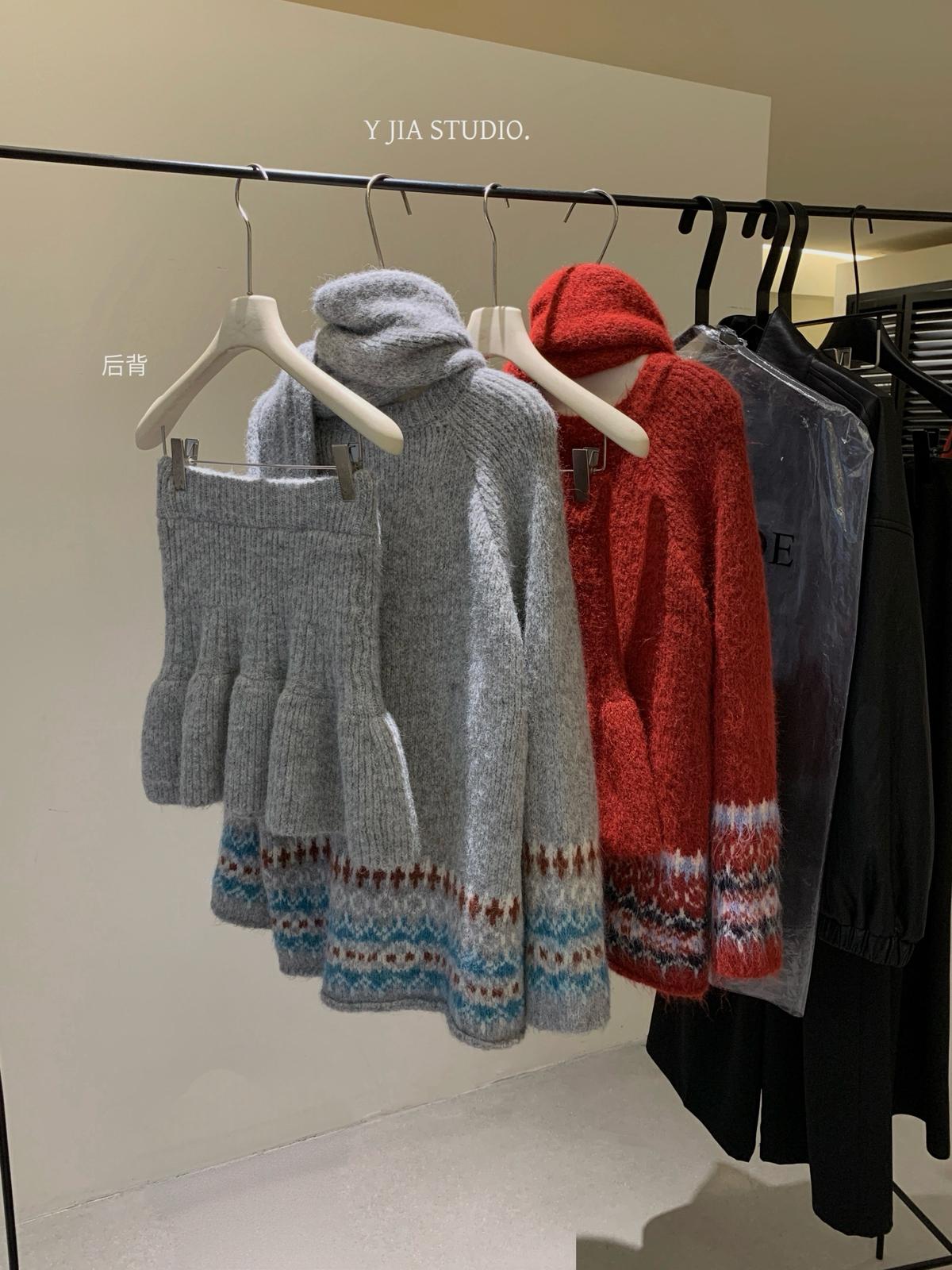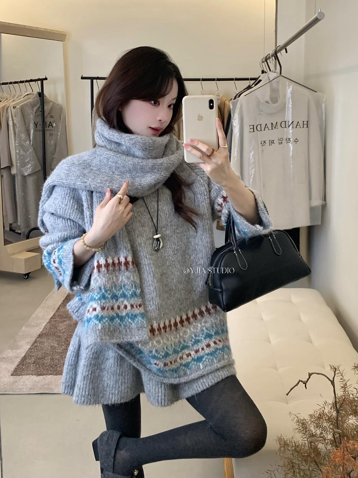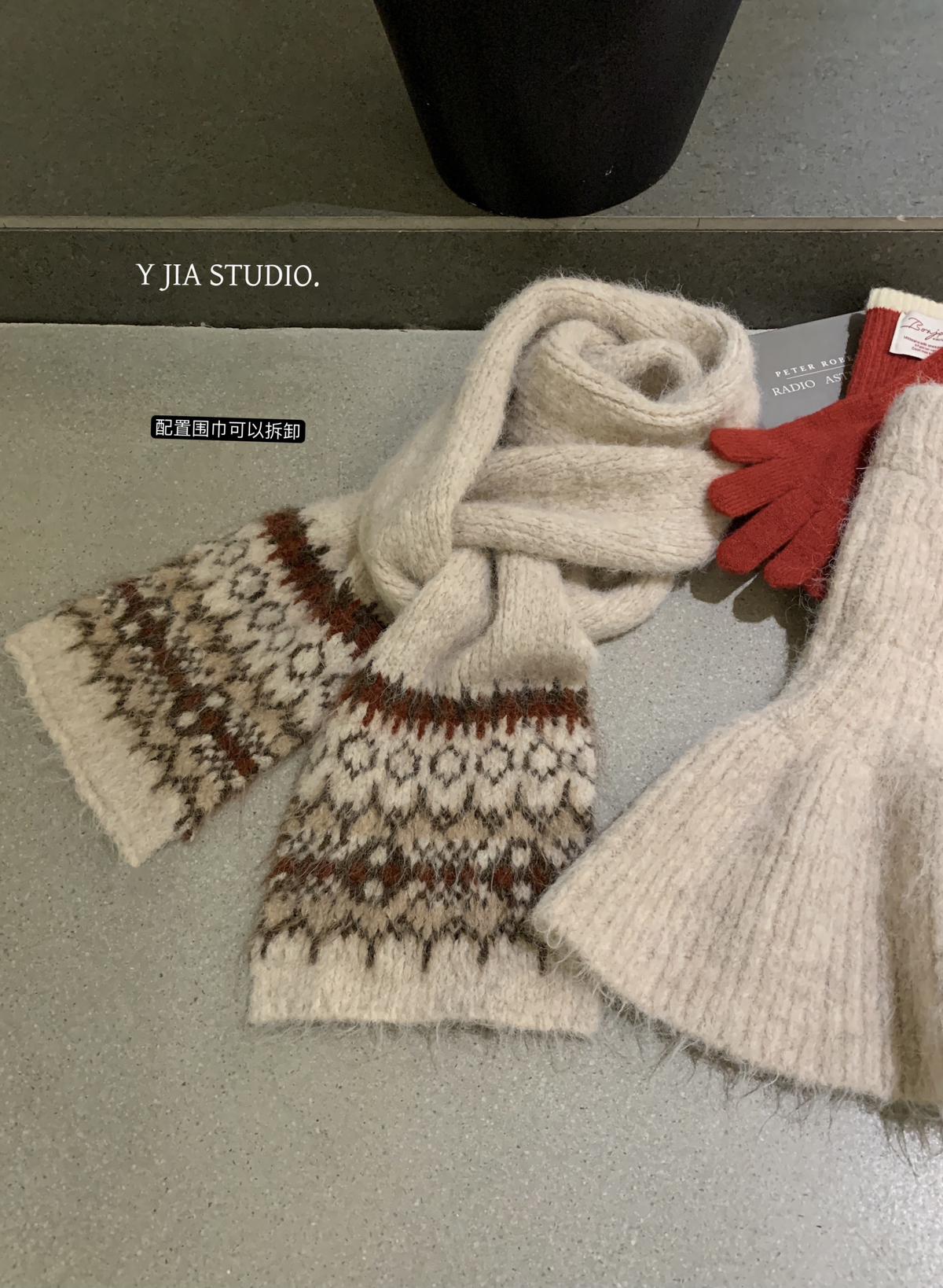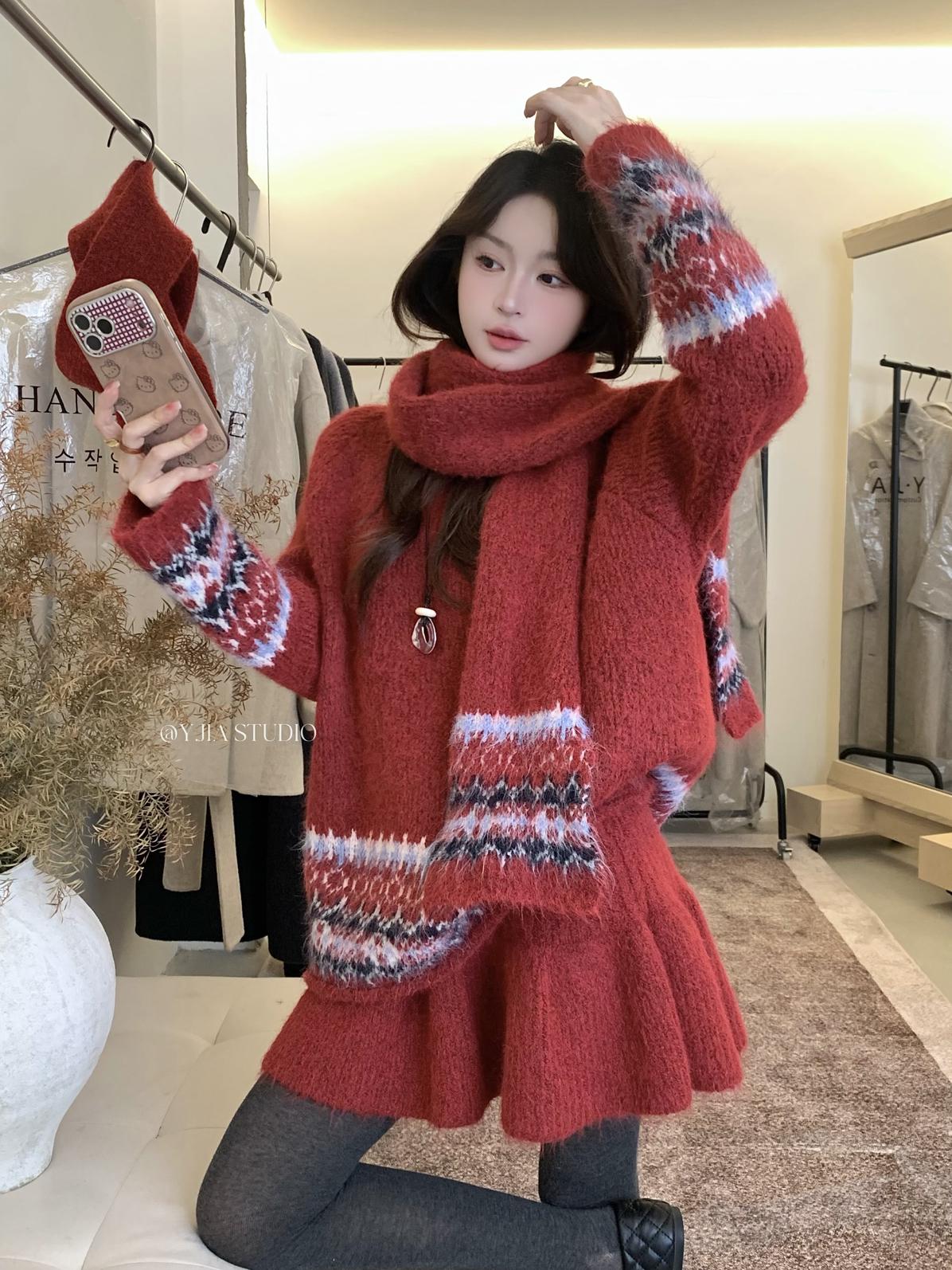 【C8203】秋冬費爾島風復古慵懶風提花毛衣+短裙套裝(配圍巾)