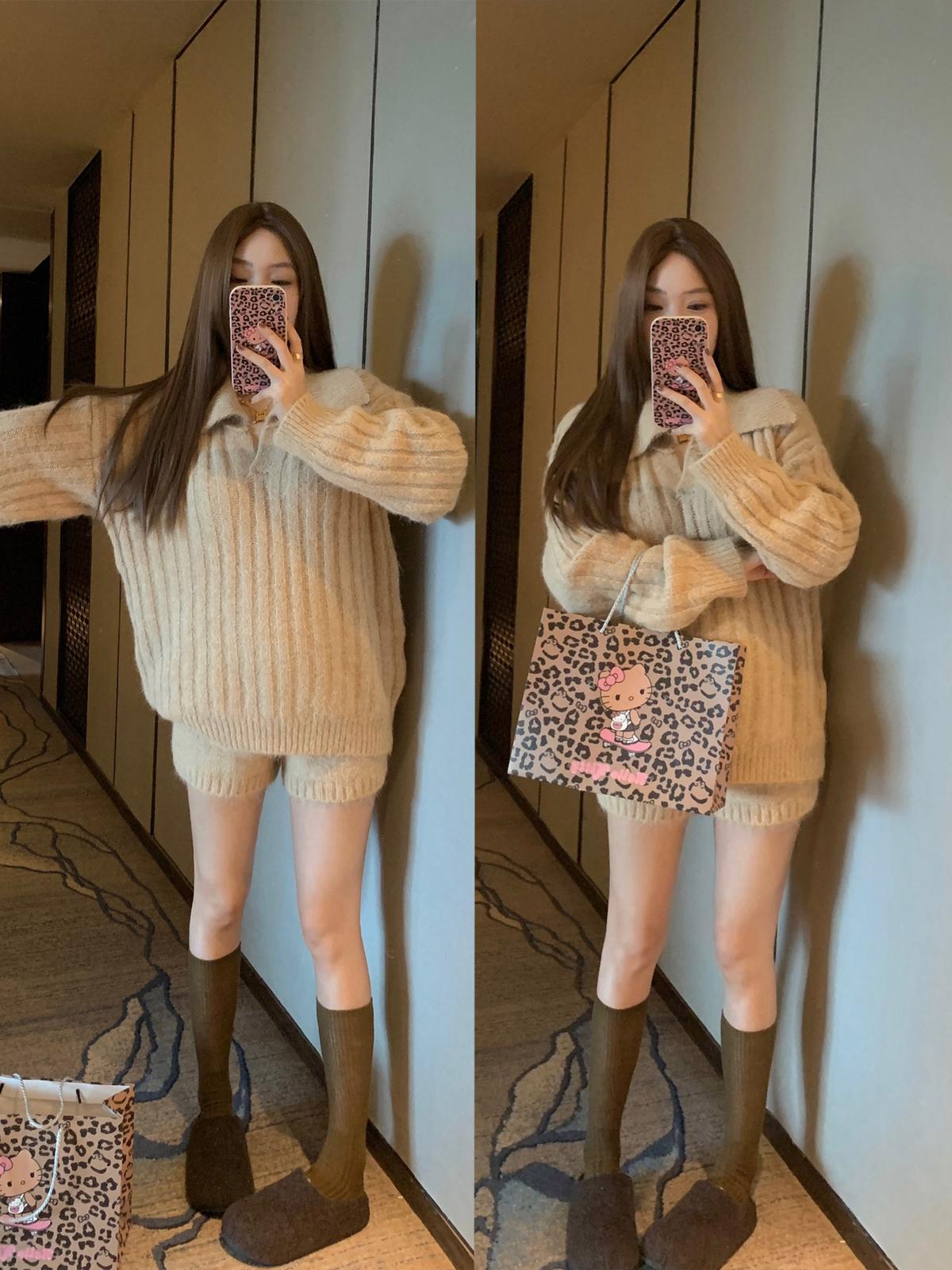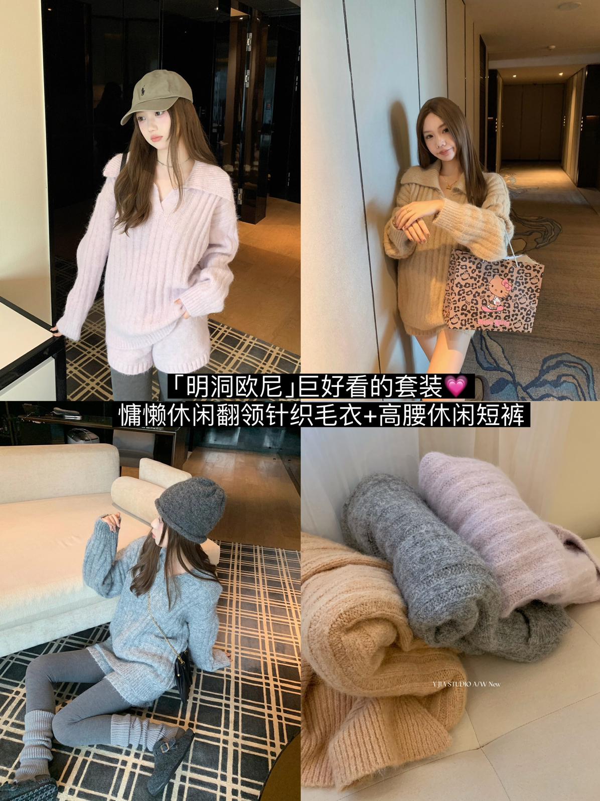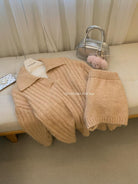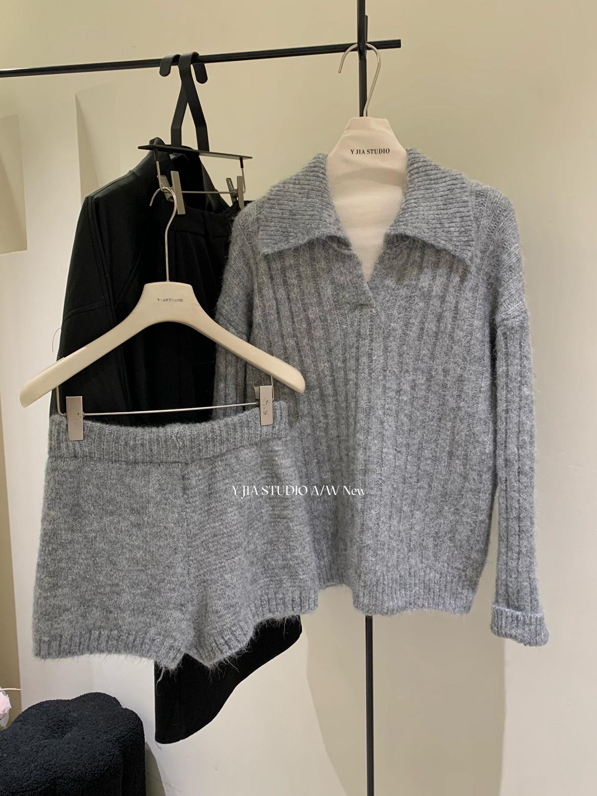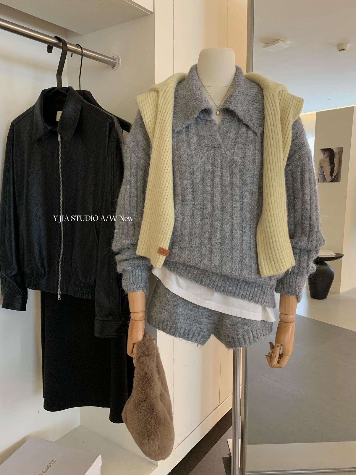 3. 【C8204】「明洞歐尼」巨好看的套裝女慵懶休閒翻領針織毛衣+高腰休閒短褲套裝