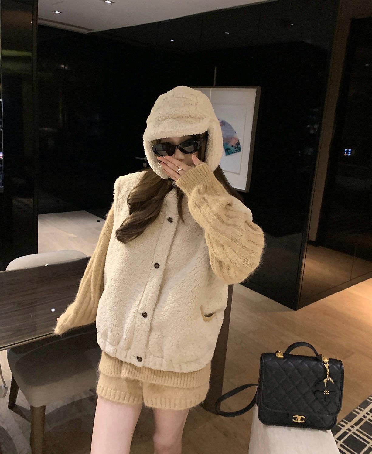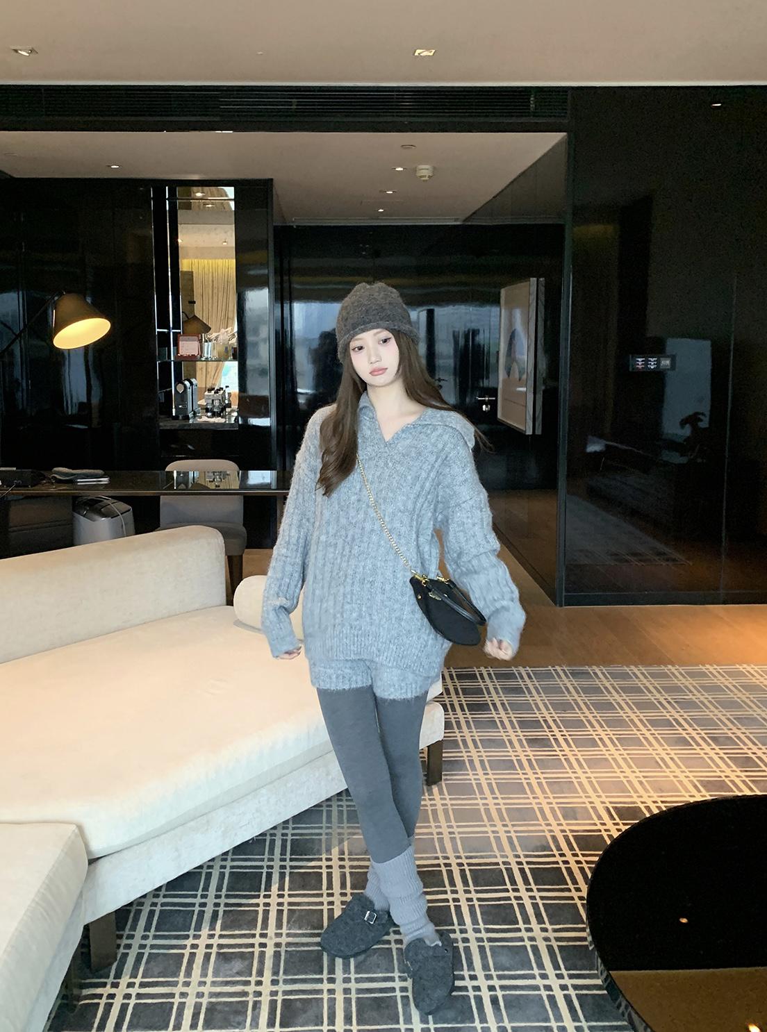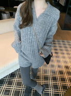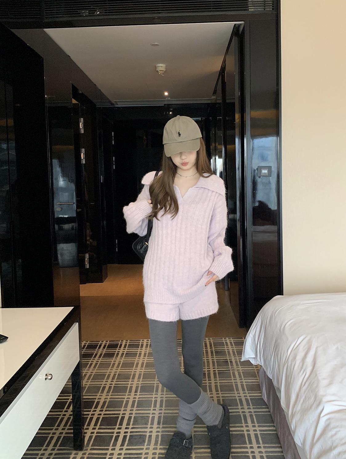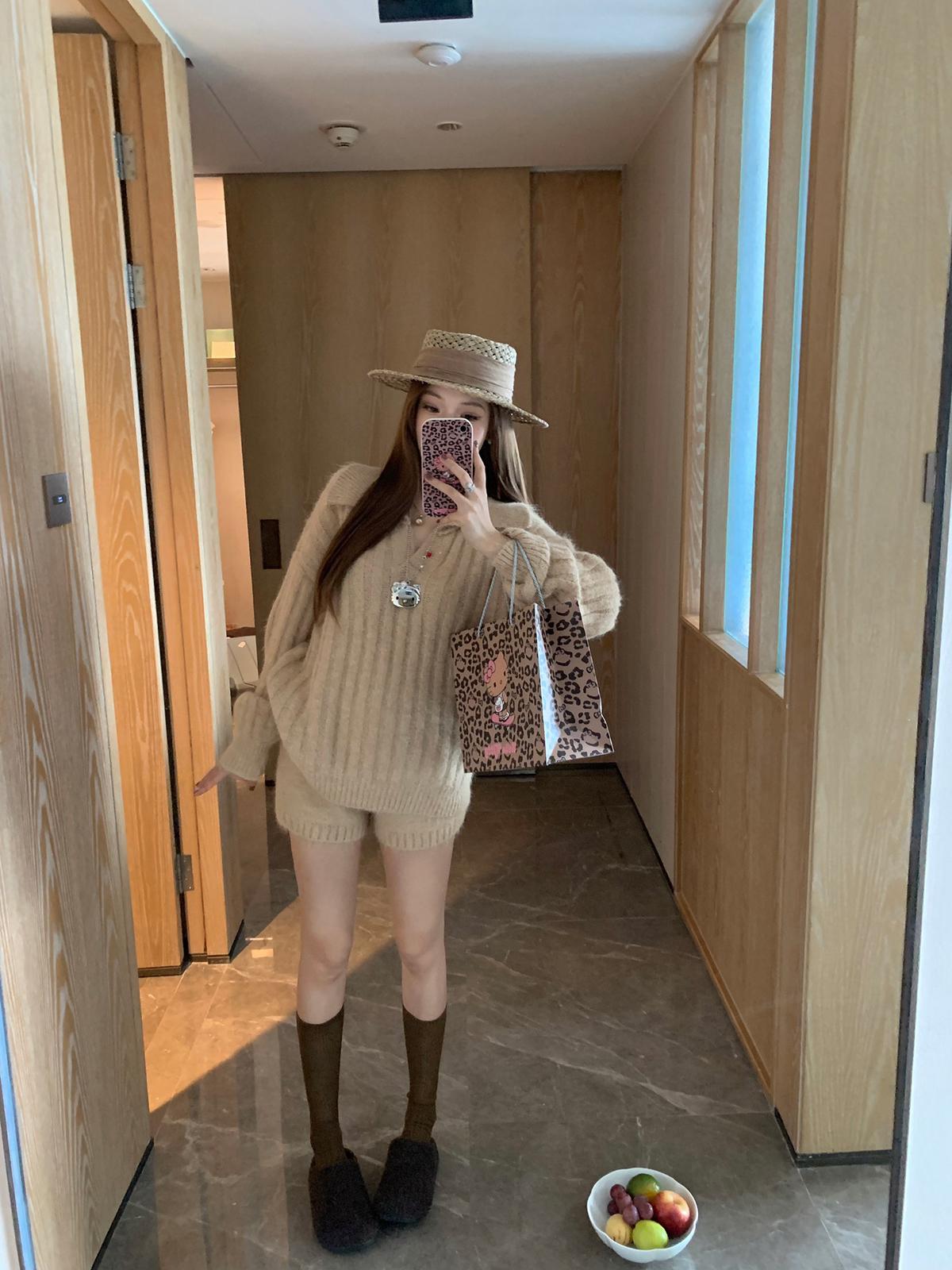 3. 【C8204】「明洞歐尼」巨好看的套裝女慵懶休閒翻領針織毛衣+高腰休閒短褲套裝