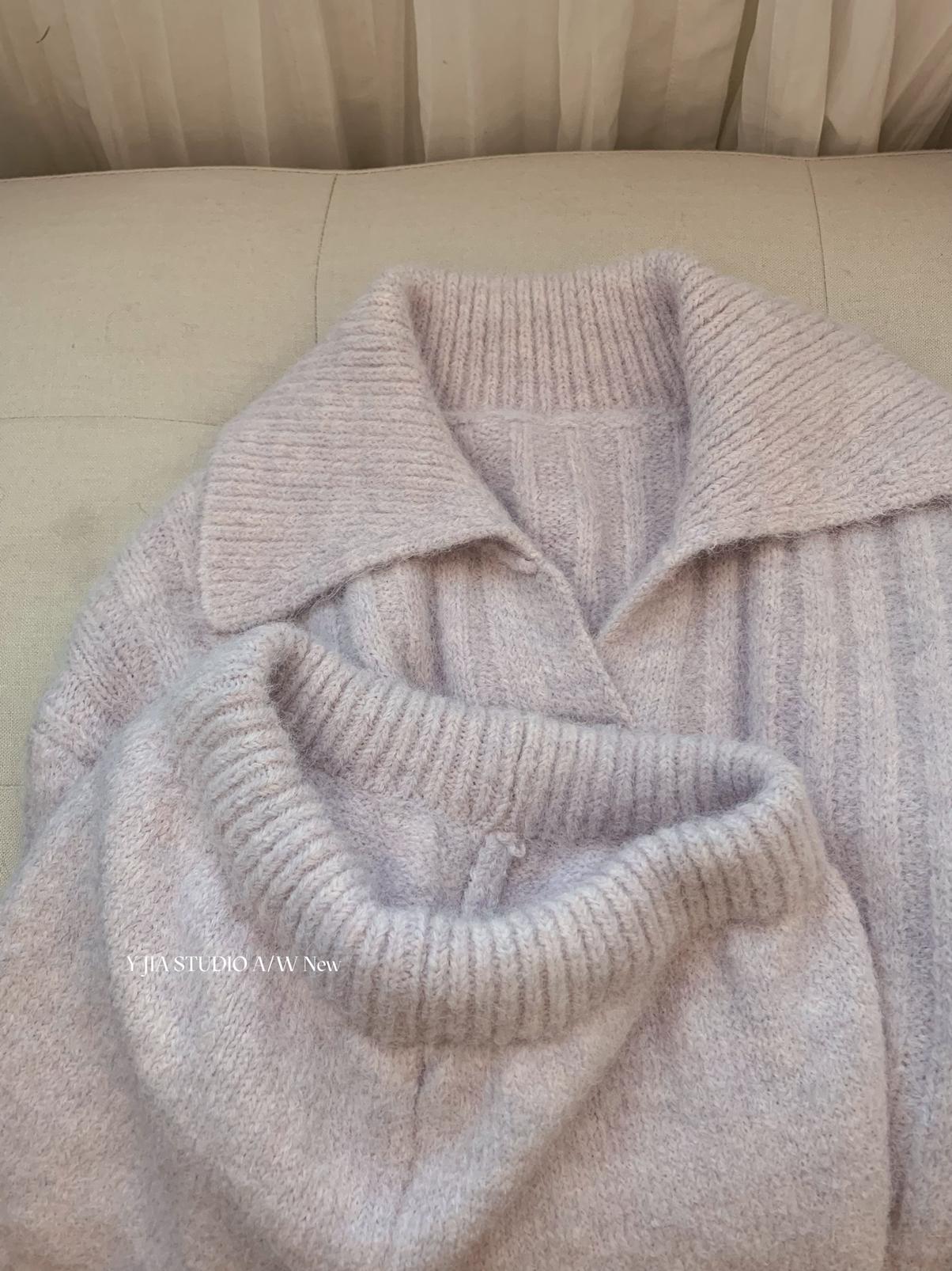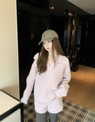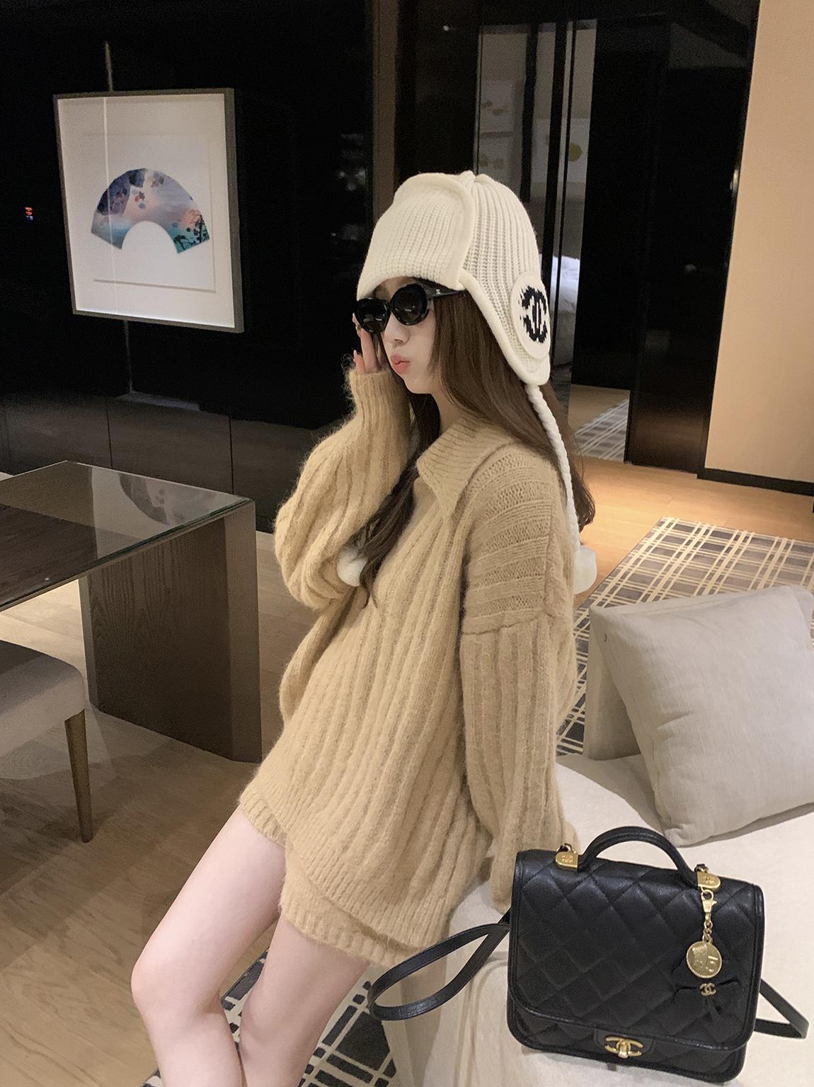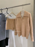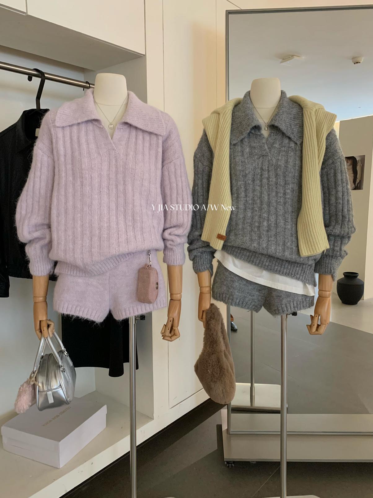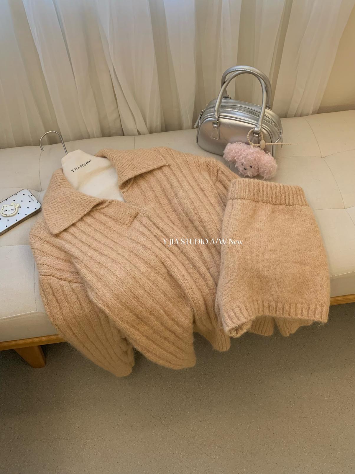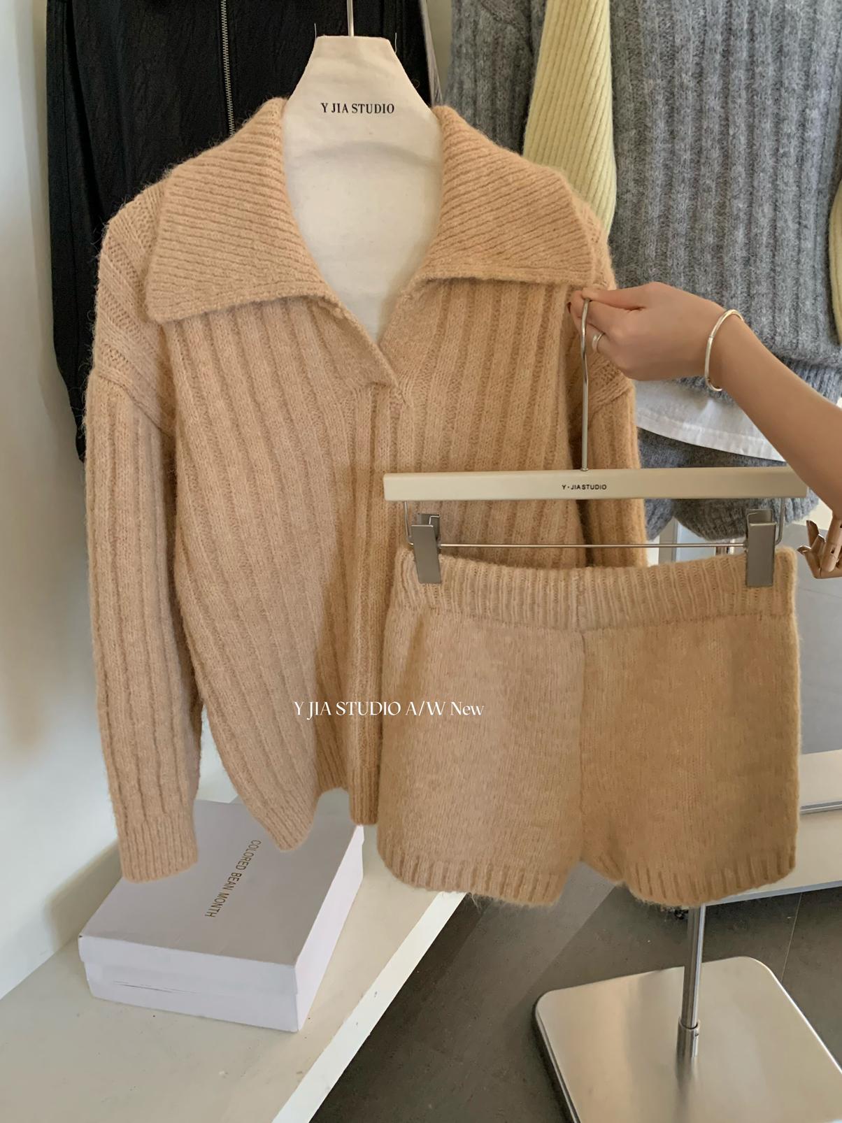 【C8204】「明洞歐尼」巨好看的套裝女慵懶休閒翻領針織毛衣+高腰休閒短褲套裝