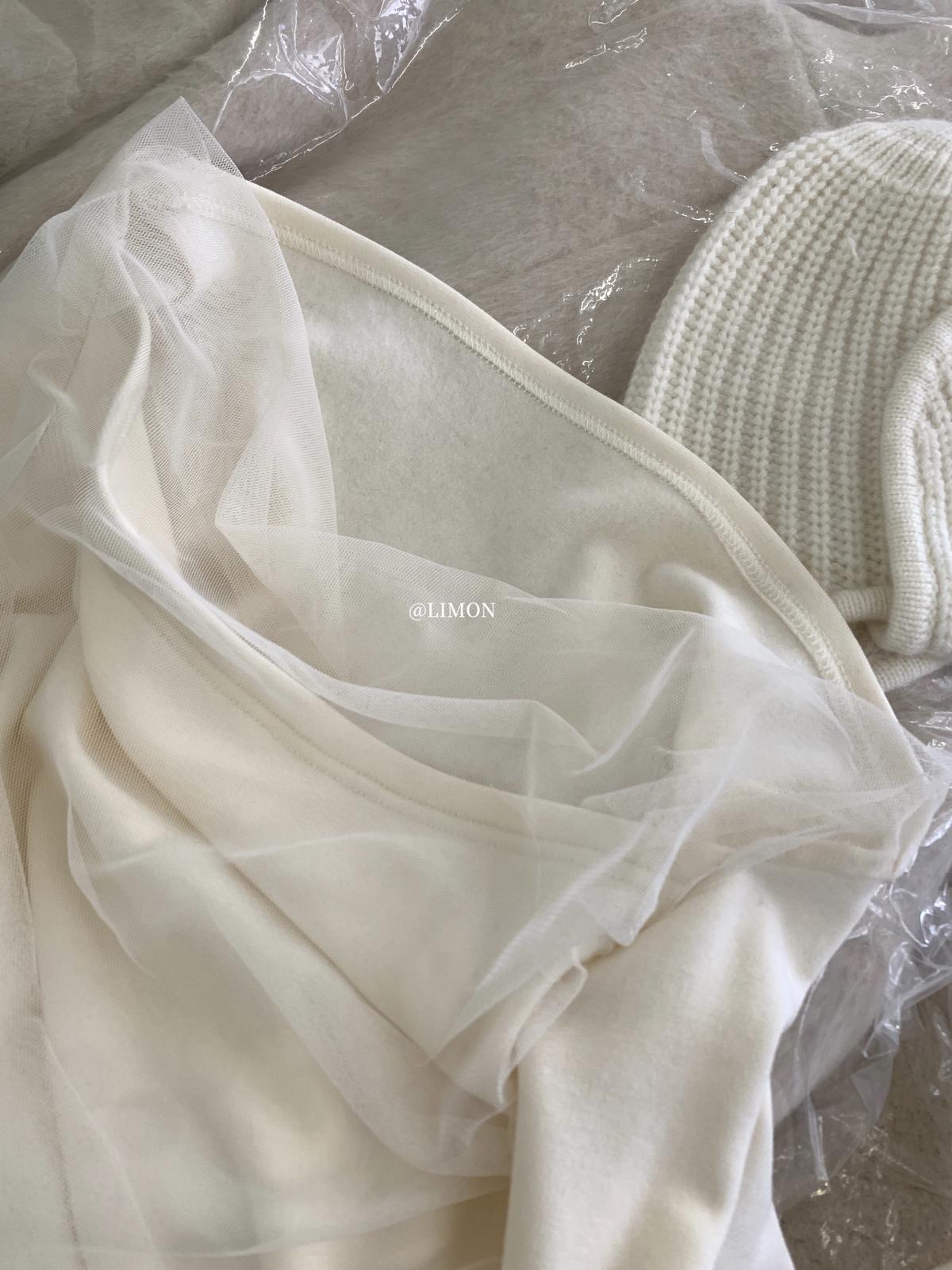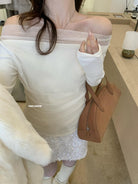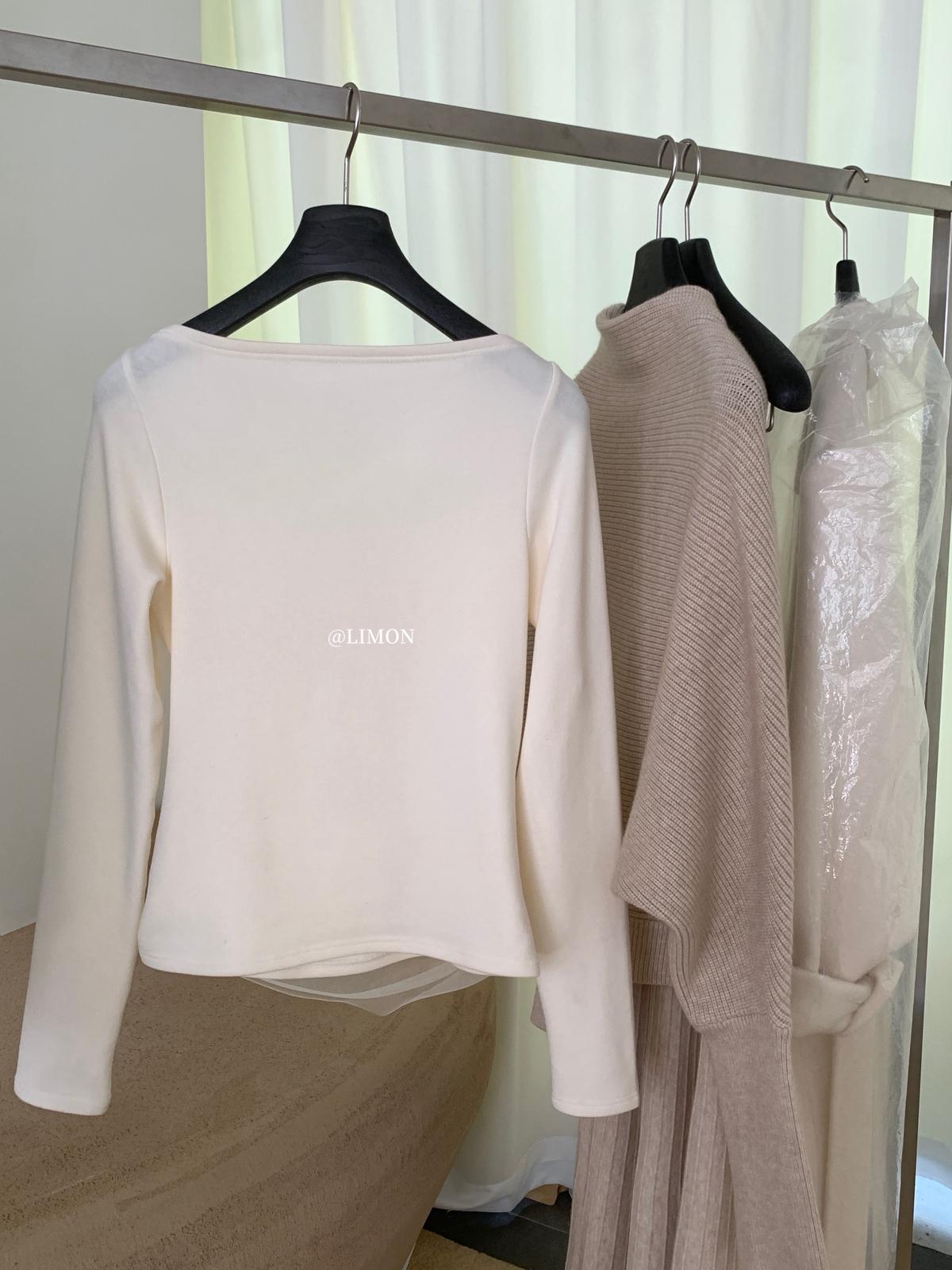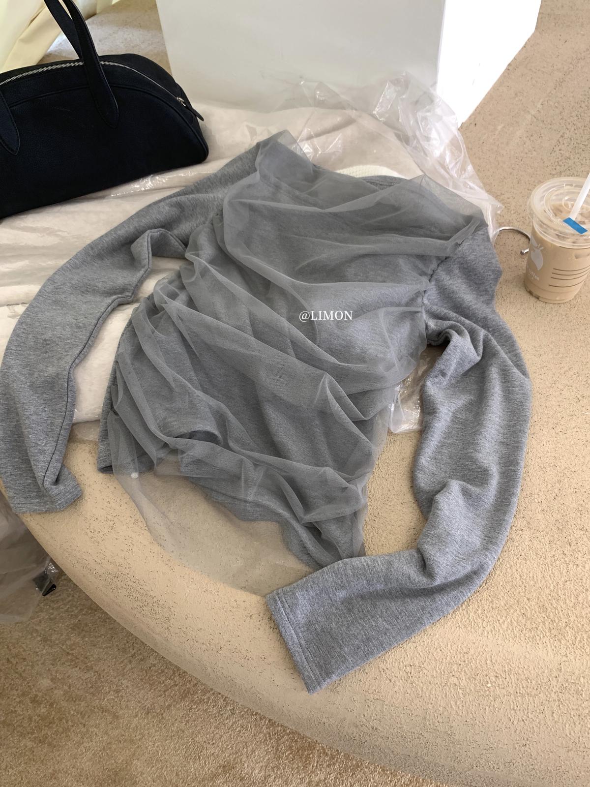 3. 【C8224】氛圍一字肩拼接網紗褶皺修身長袖T針織衫