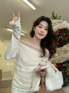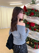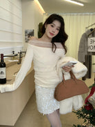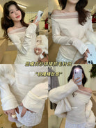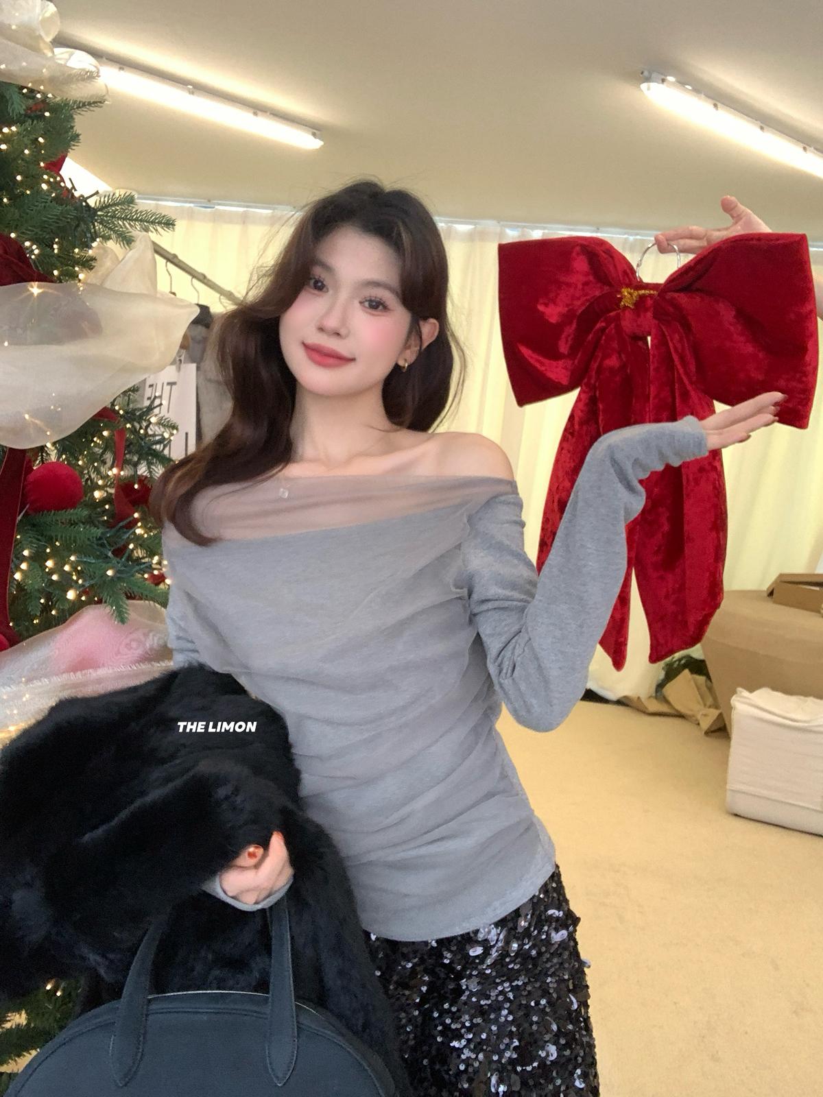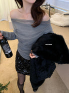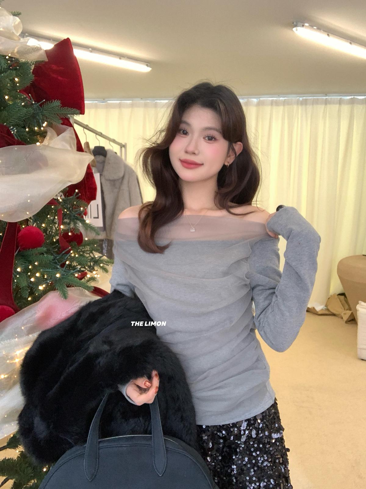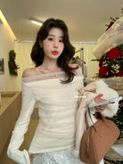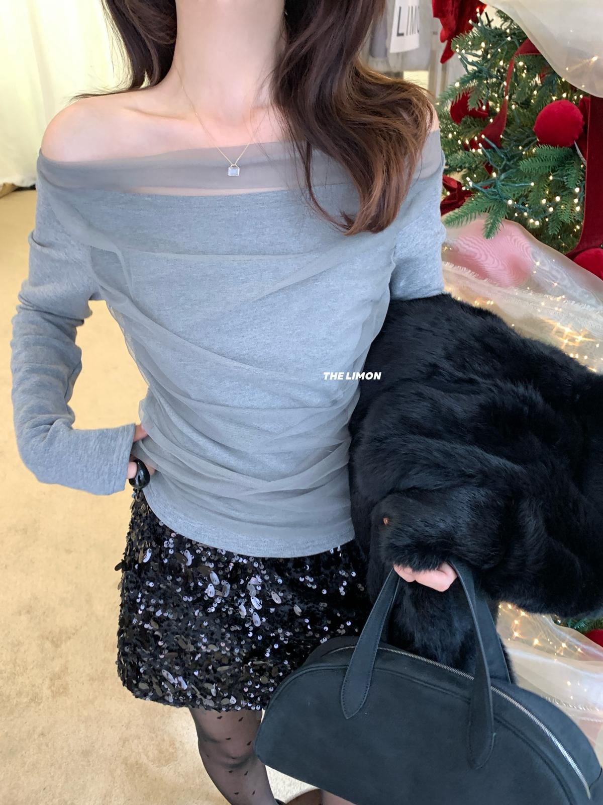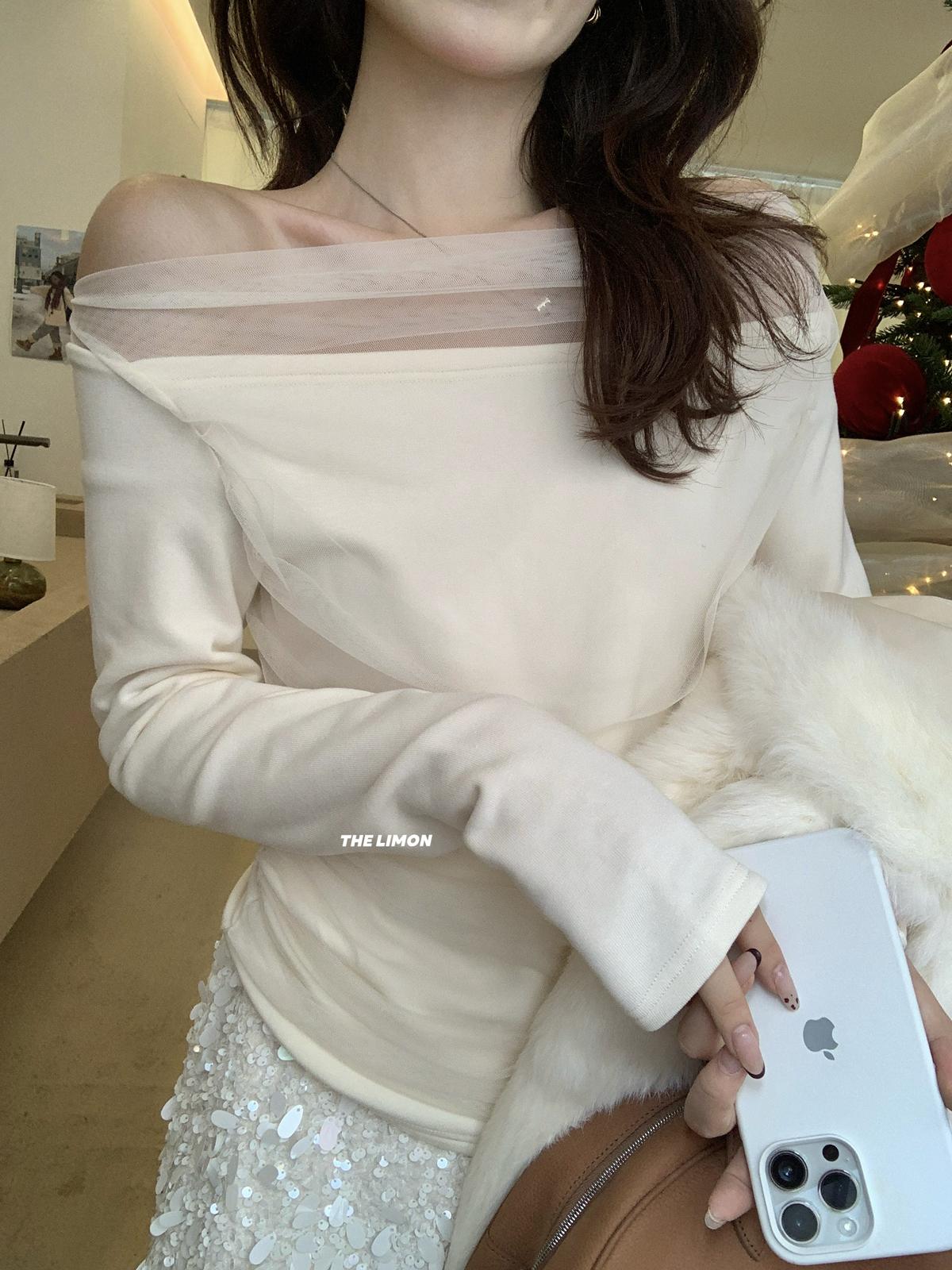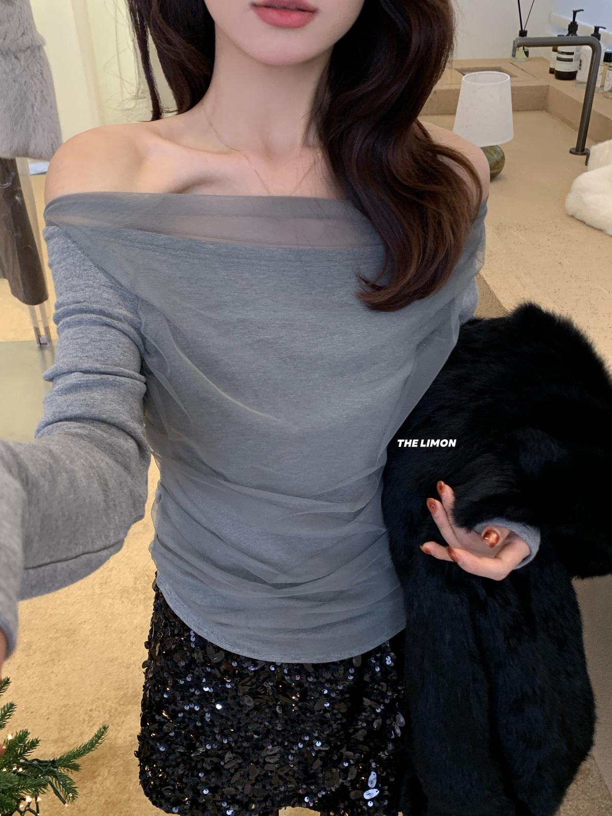 【C8224】氛圍一字肩拼接網紗褶皺修身長袖T針織衫