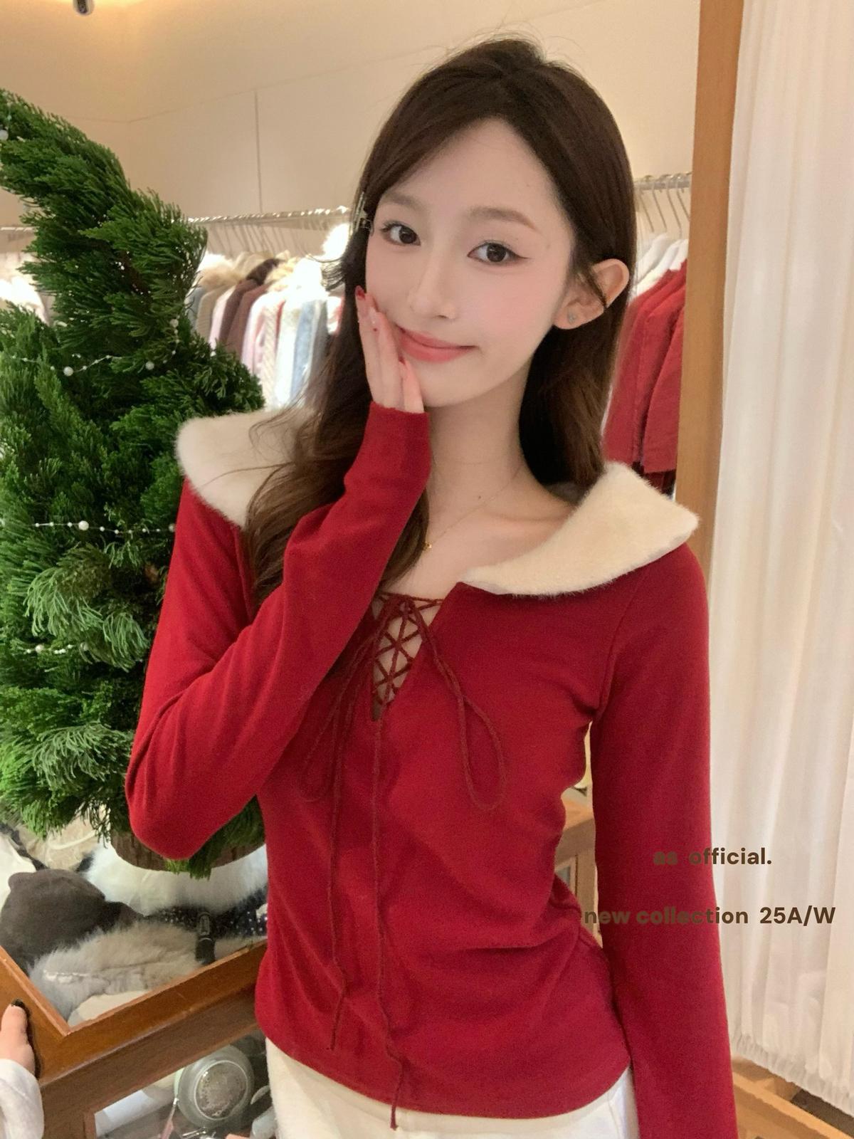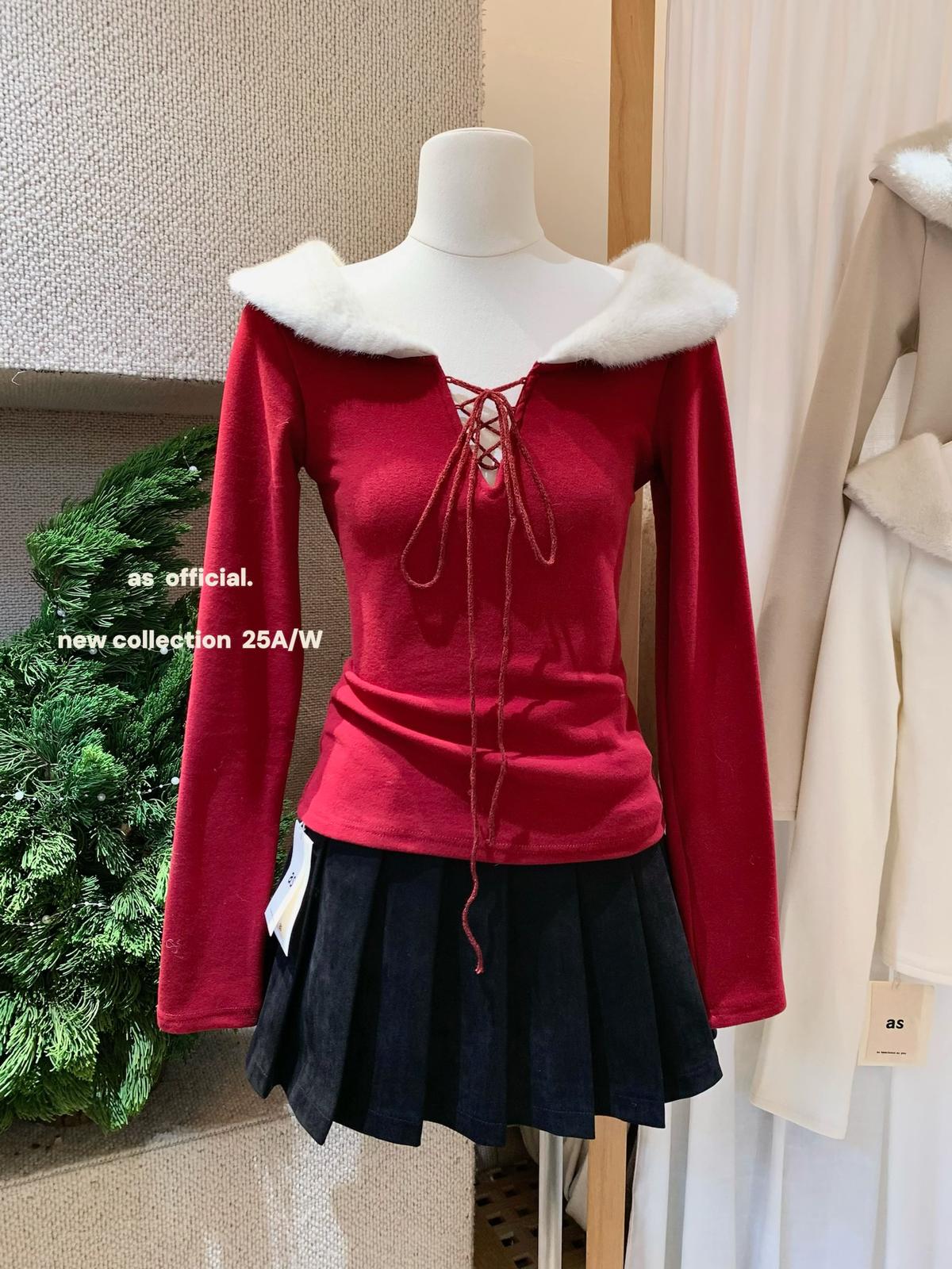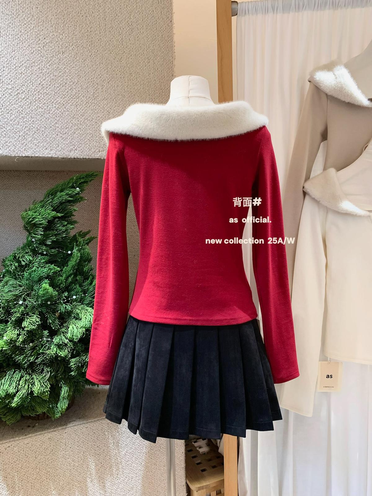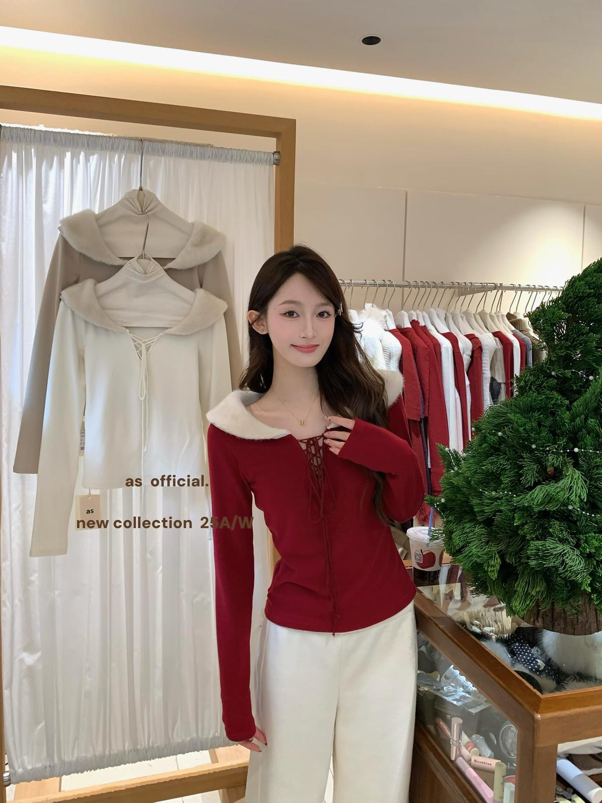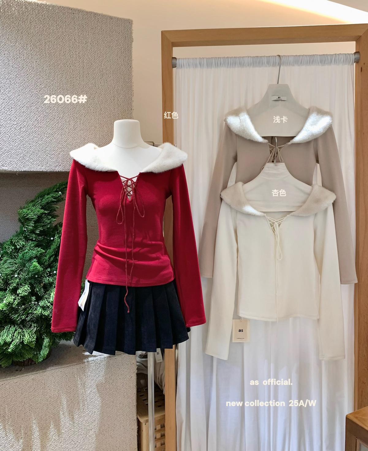 【C8243】絕美上新!節日氛圍首選• 嬌滴滴撞色毛領小衫