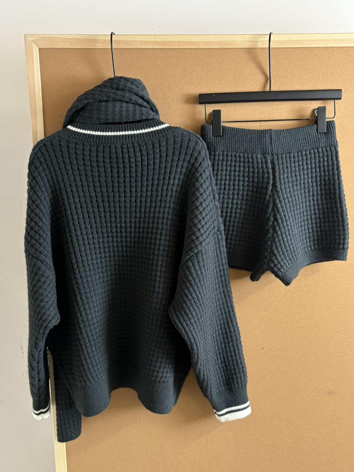 【C8266】洋氣v領撞色寬鬆大版毛衣+短褲加厚針織套裝(配圍巾)