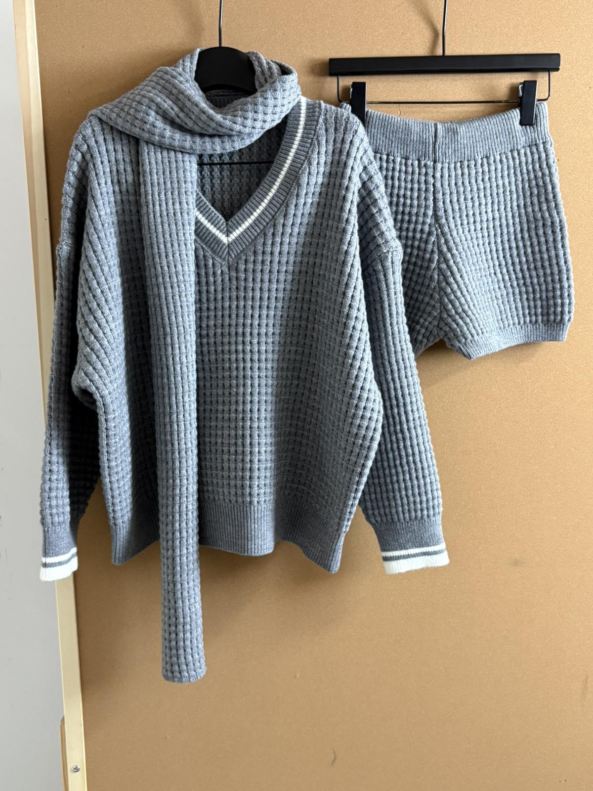 3. 【C8266】洋氣v領撞色寬鬆大版毛衣+短褲加厚針織套裝(配圍巾)