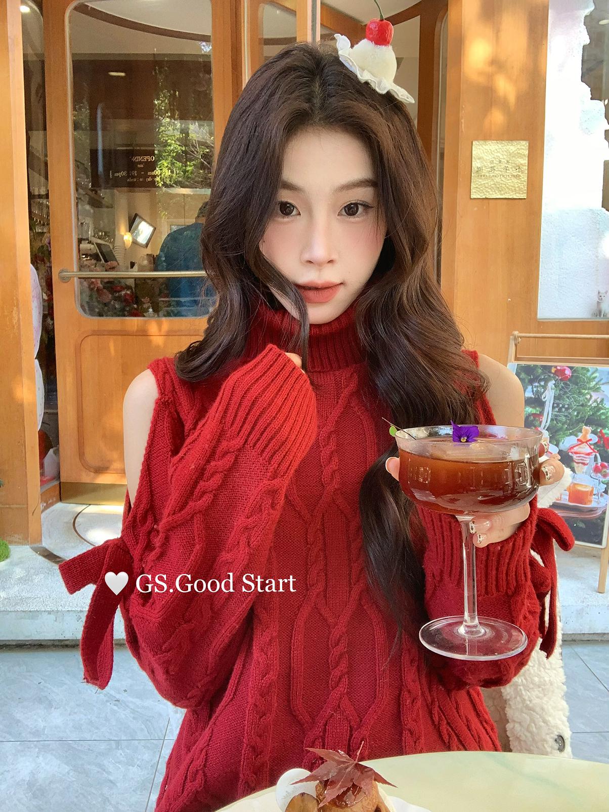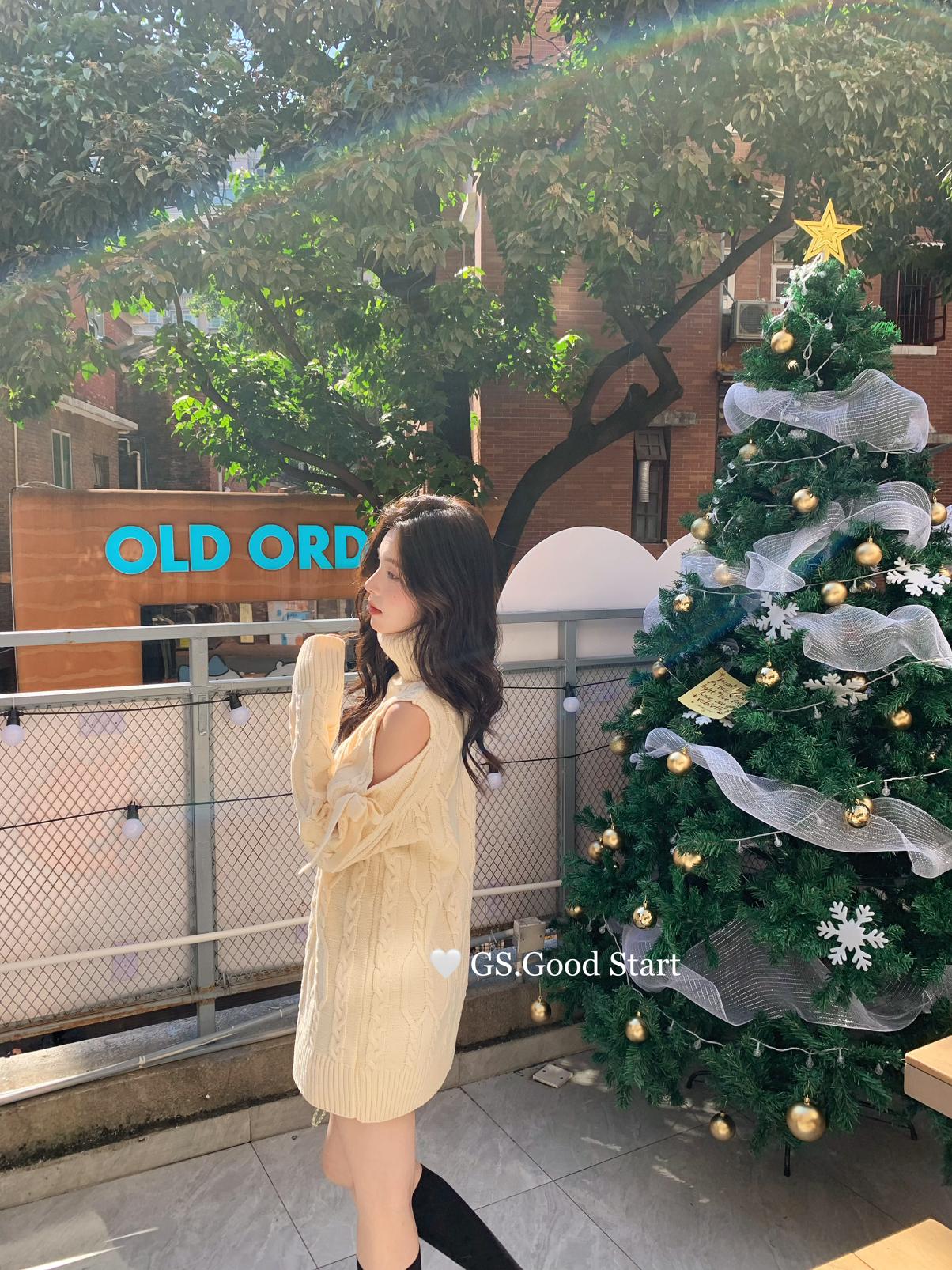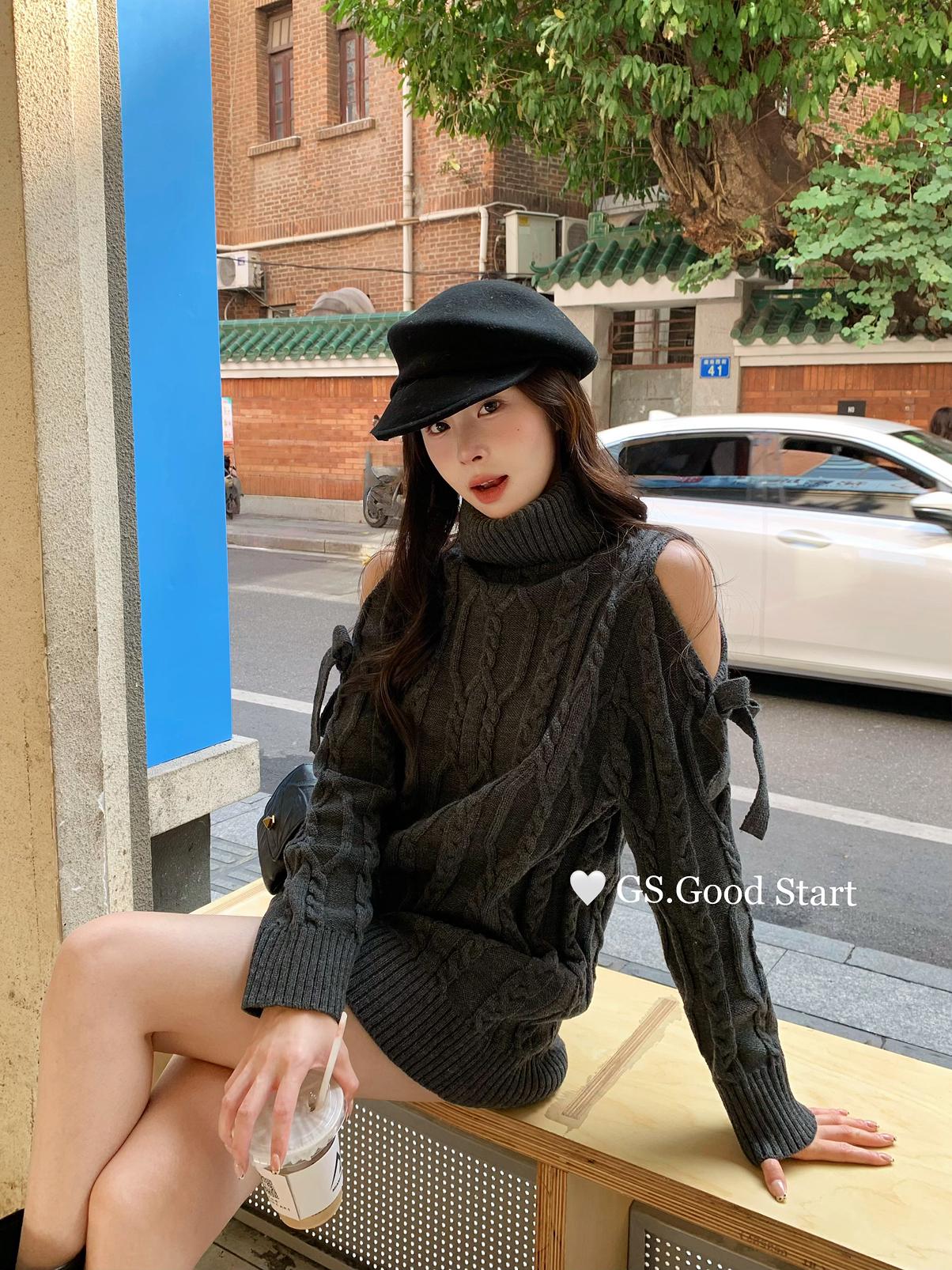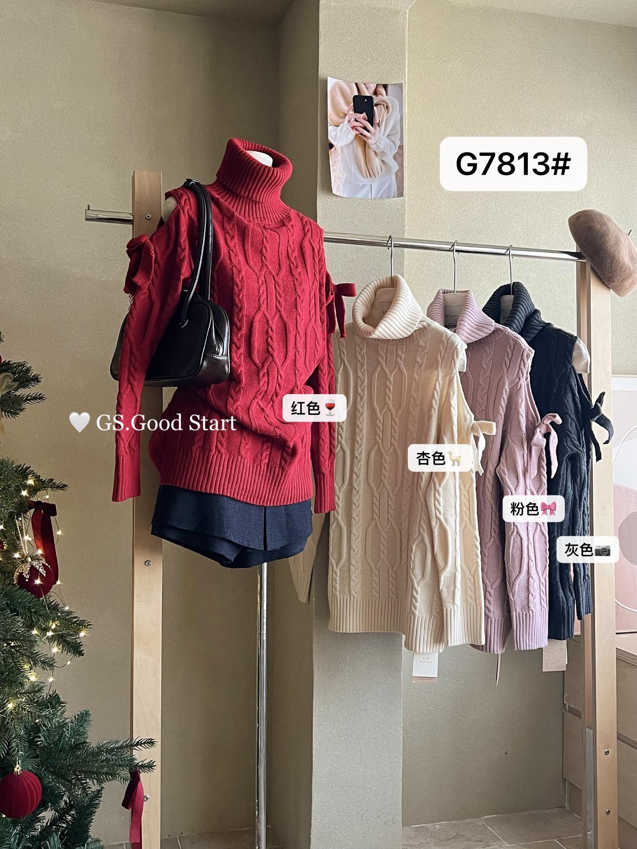 【C8291】節日戰裙*重磅主推!檔口開單不停!冬氣質純欲蝴蝶結露肩設計感保暖毛衣