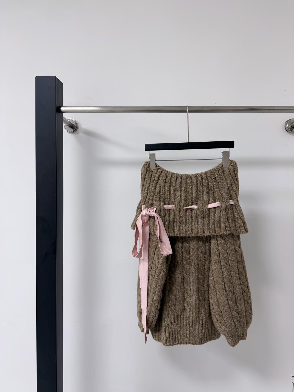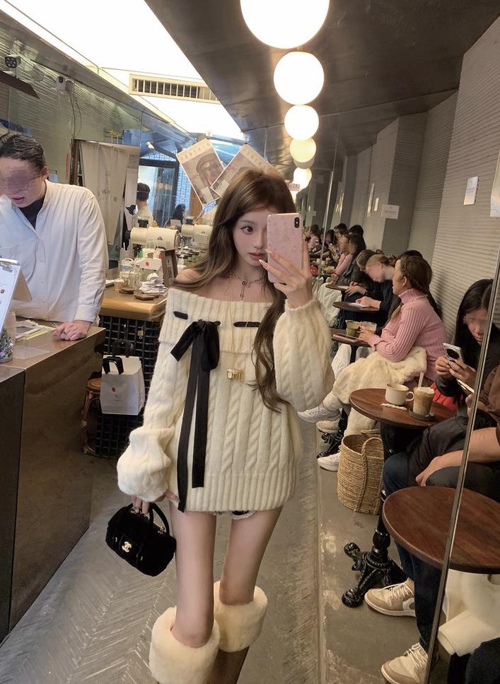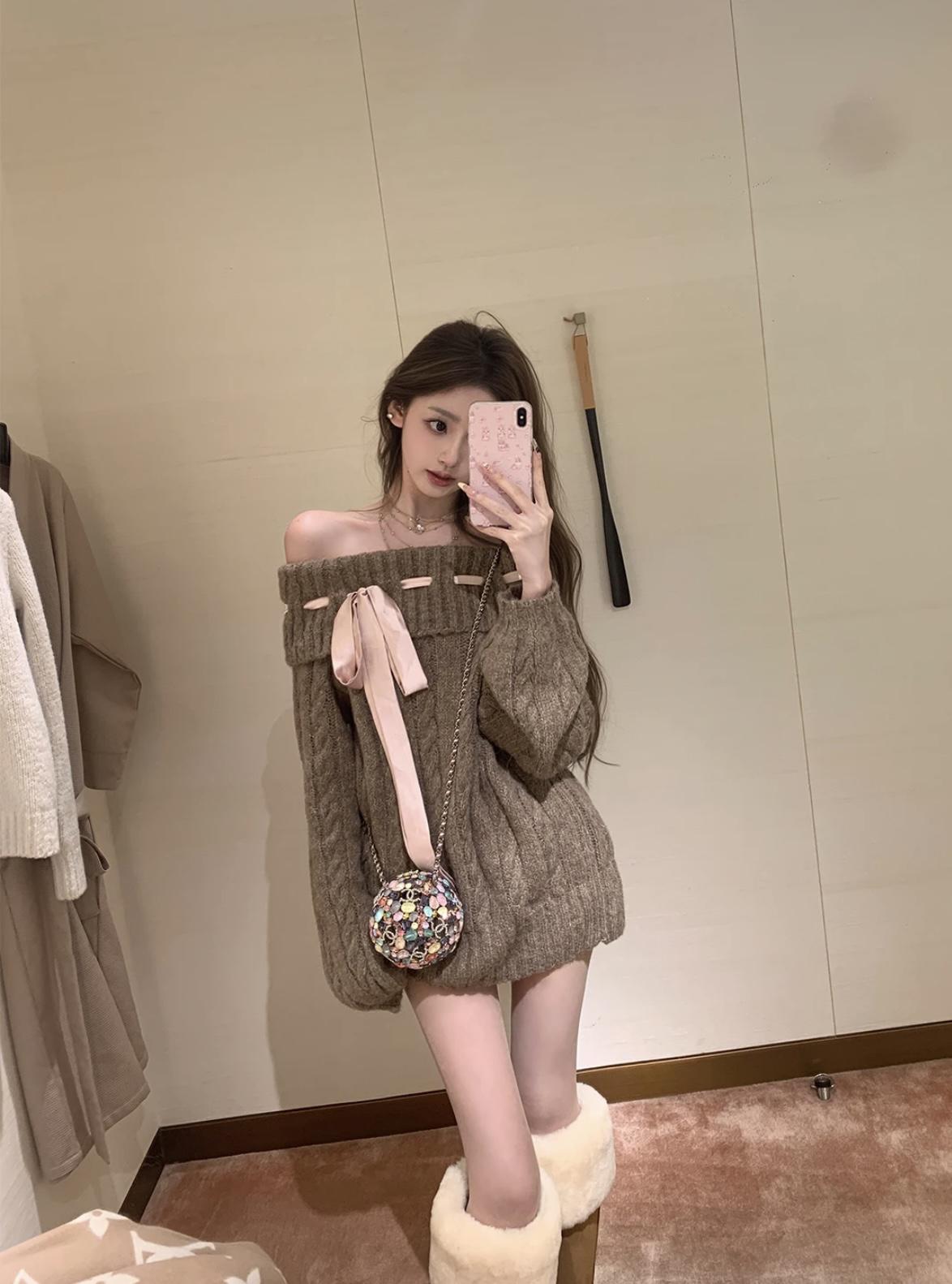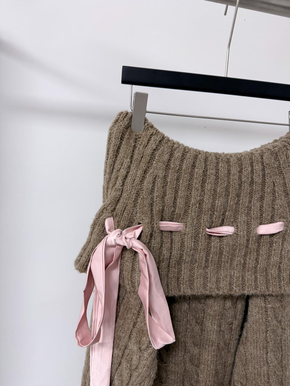 【C8301】純欲氣質小女人翻邊一字領撞色系帶蝴蝶結麻花針織毛衣連衣裙