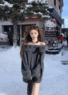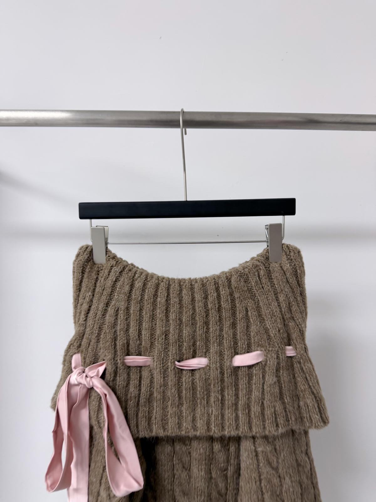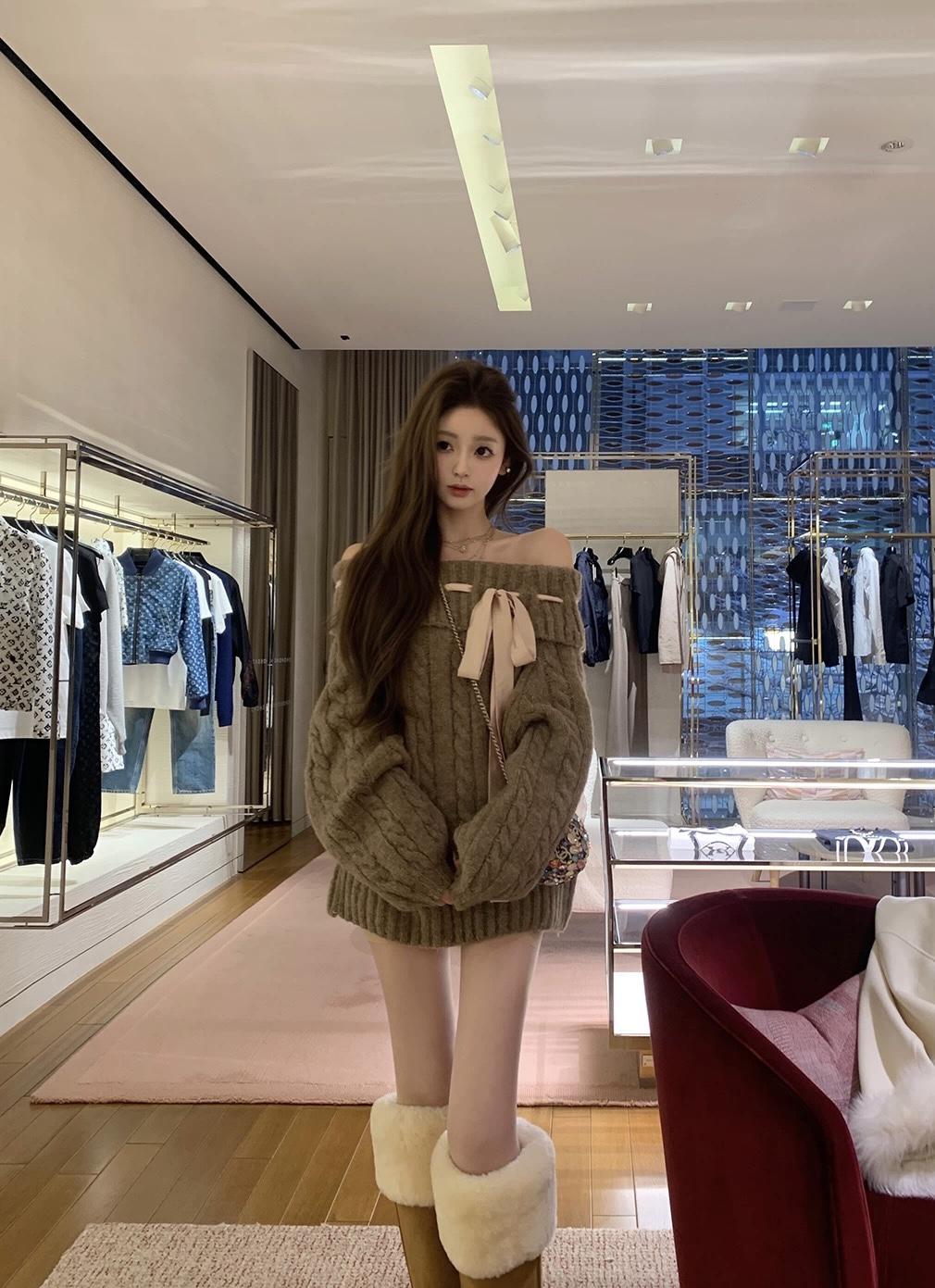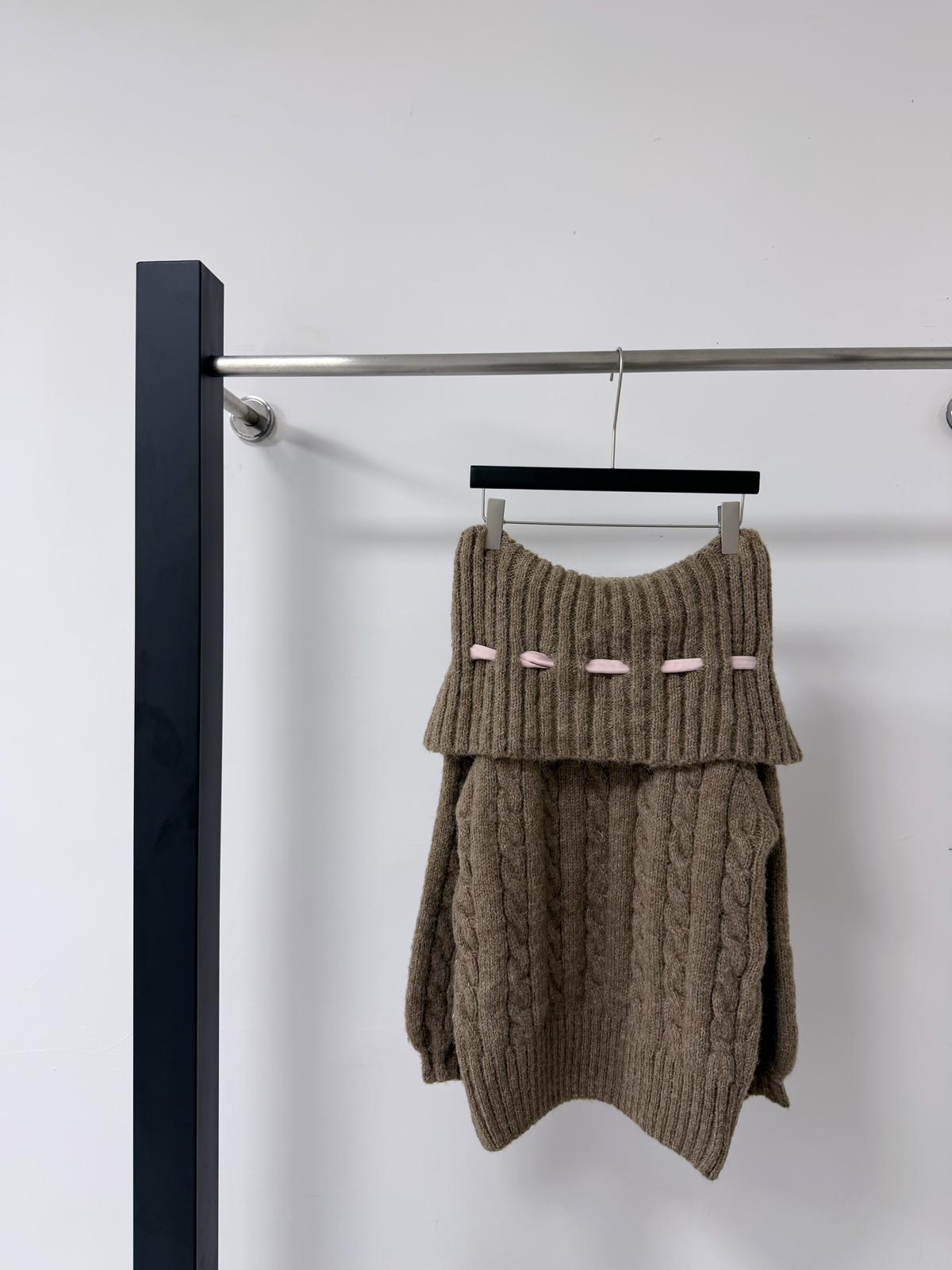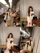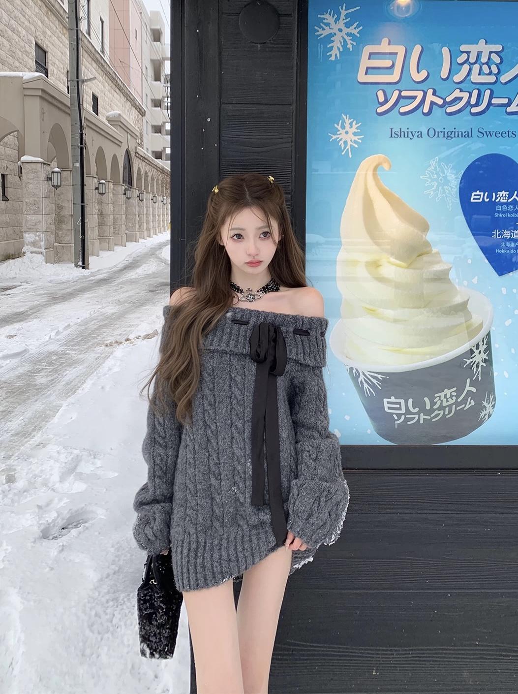 【C8301】純欲氣質小女人翻邊一字領撞色系帶蝴蝶結麻花針織毛衣連衣裙