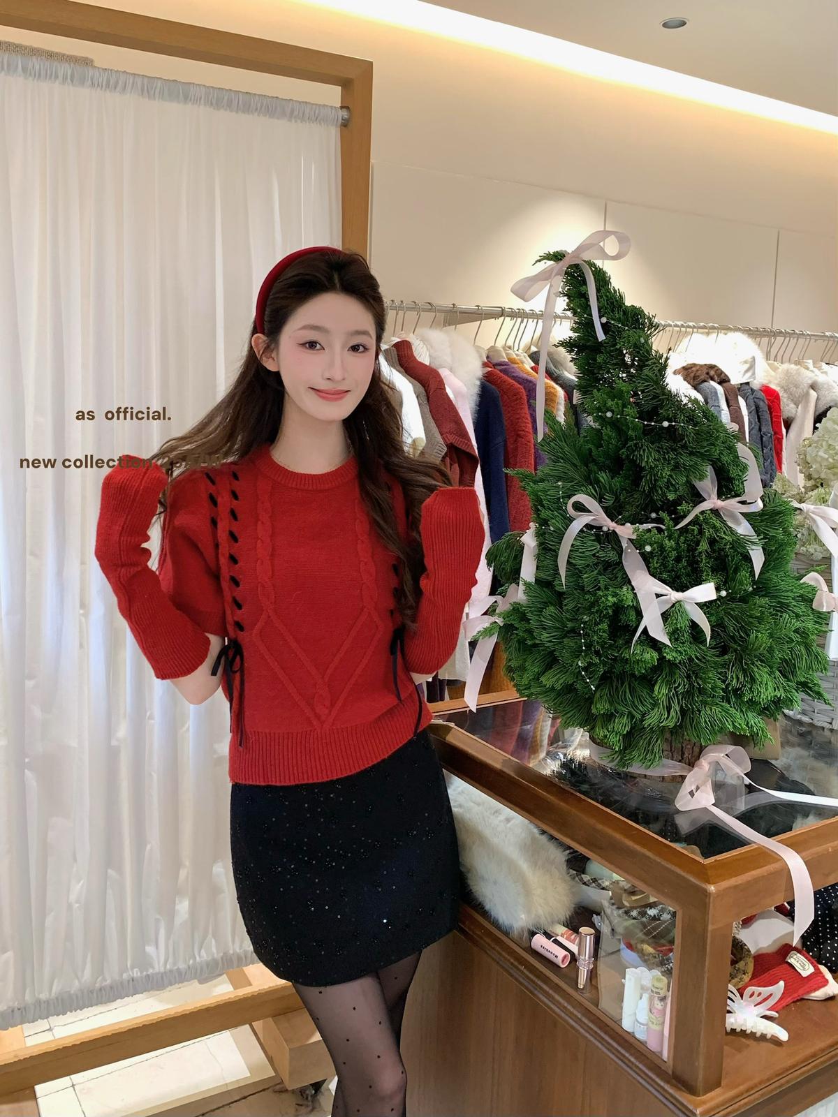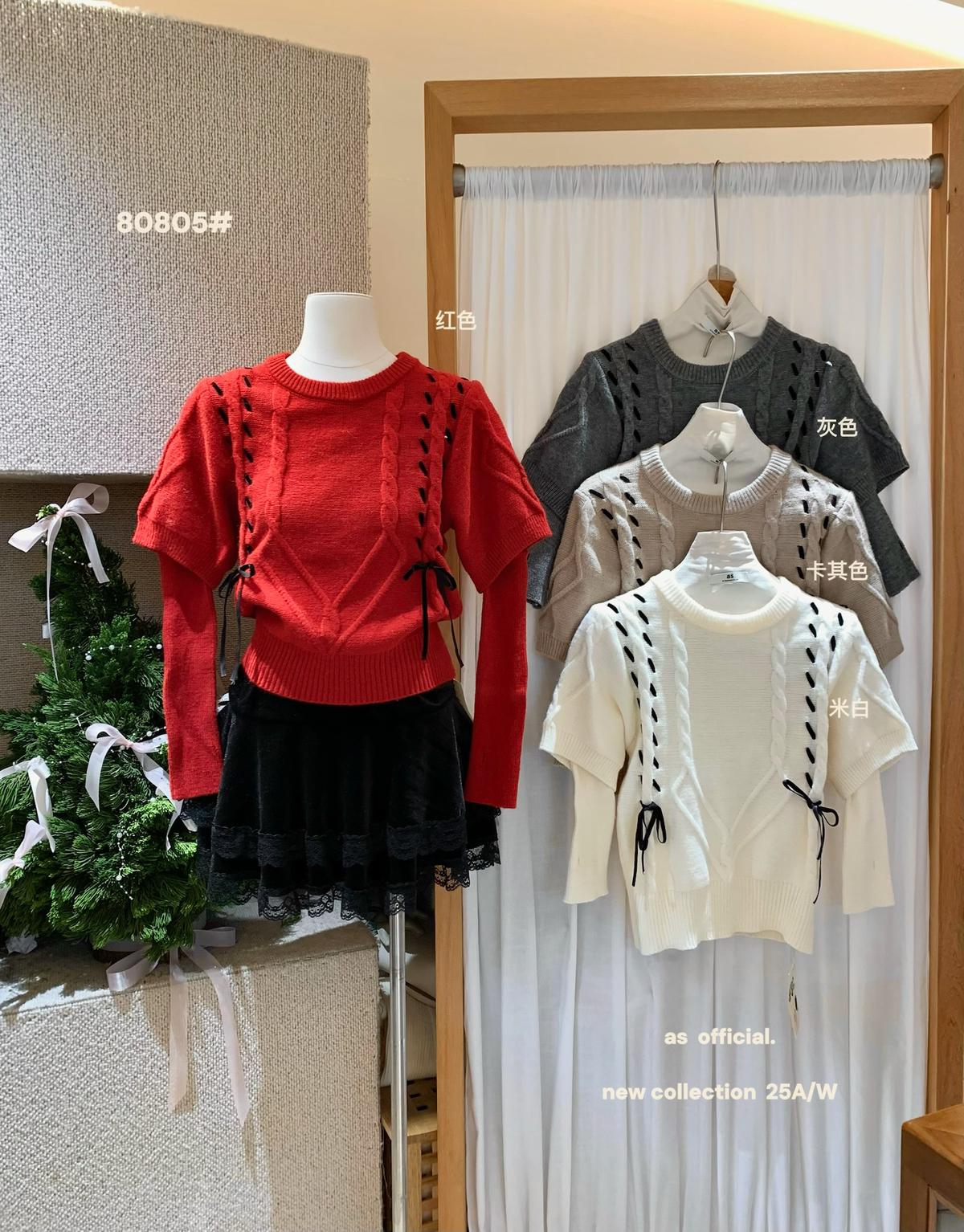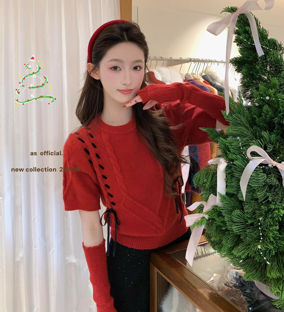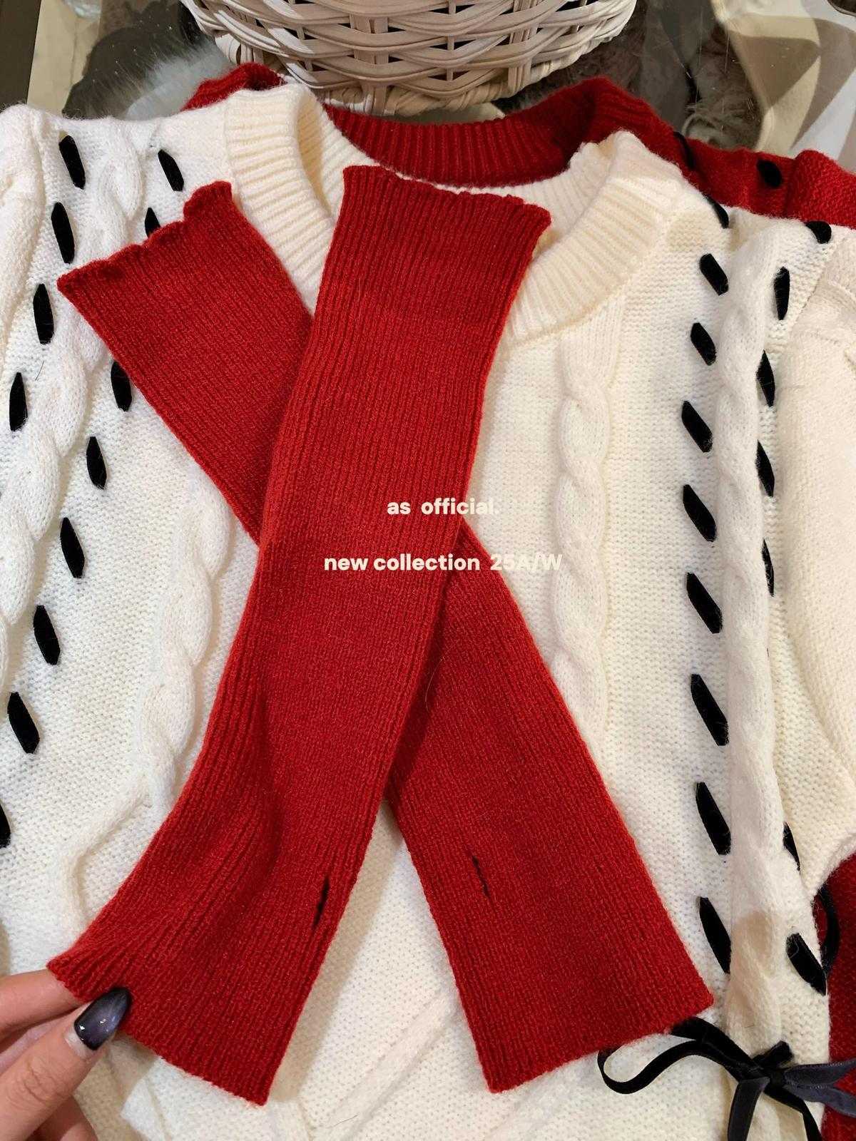 【C8313】紅色穿搭”獨特漂亮 |小香風聖誕新年 絲絨蝴蝶結繫帶保暖毛衣(配袖套)(收到很多誇誇!!)