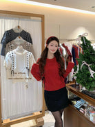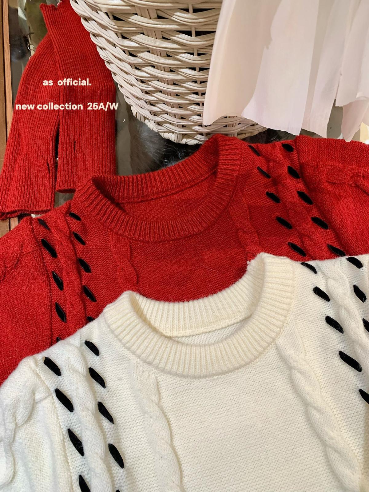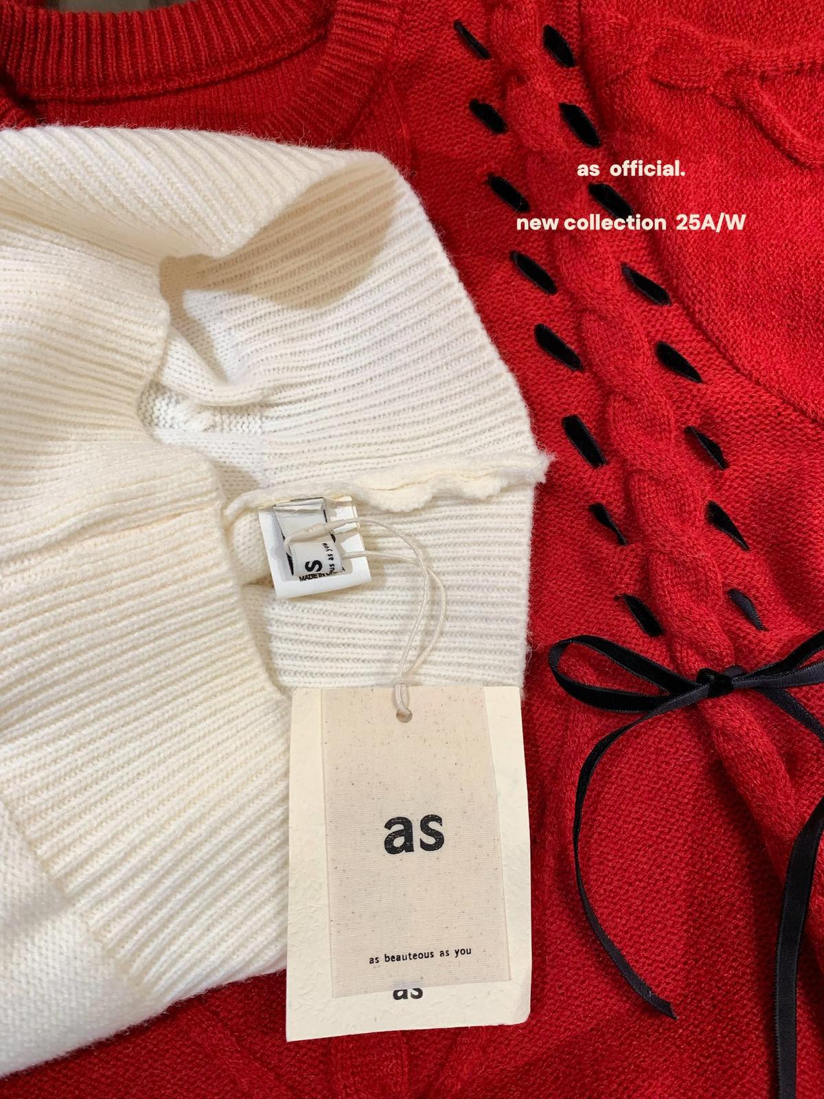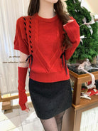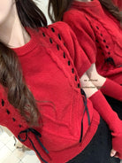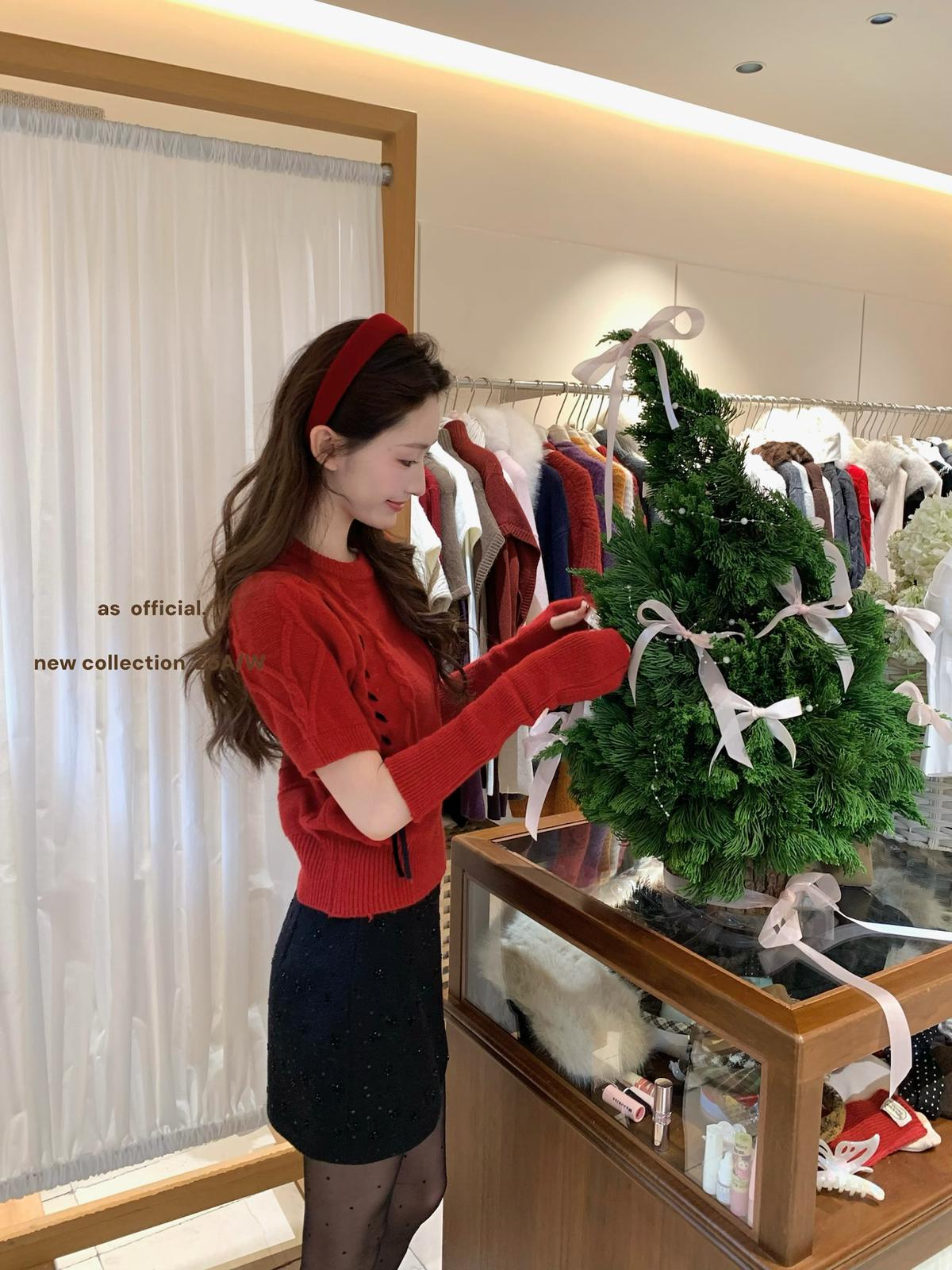 【C8313】紅色穿搭”獨特漂亮 |小香風聖誕新年 絲絨蝴蝶結繫帶保暖毛衣(配袖套)(收到很多誇誇!!)