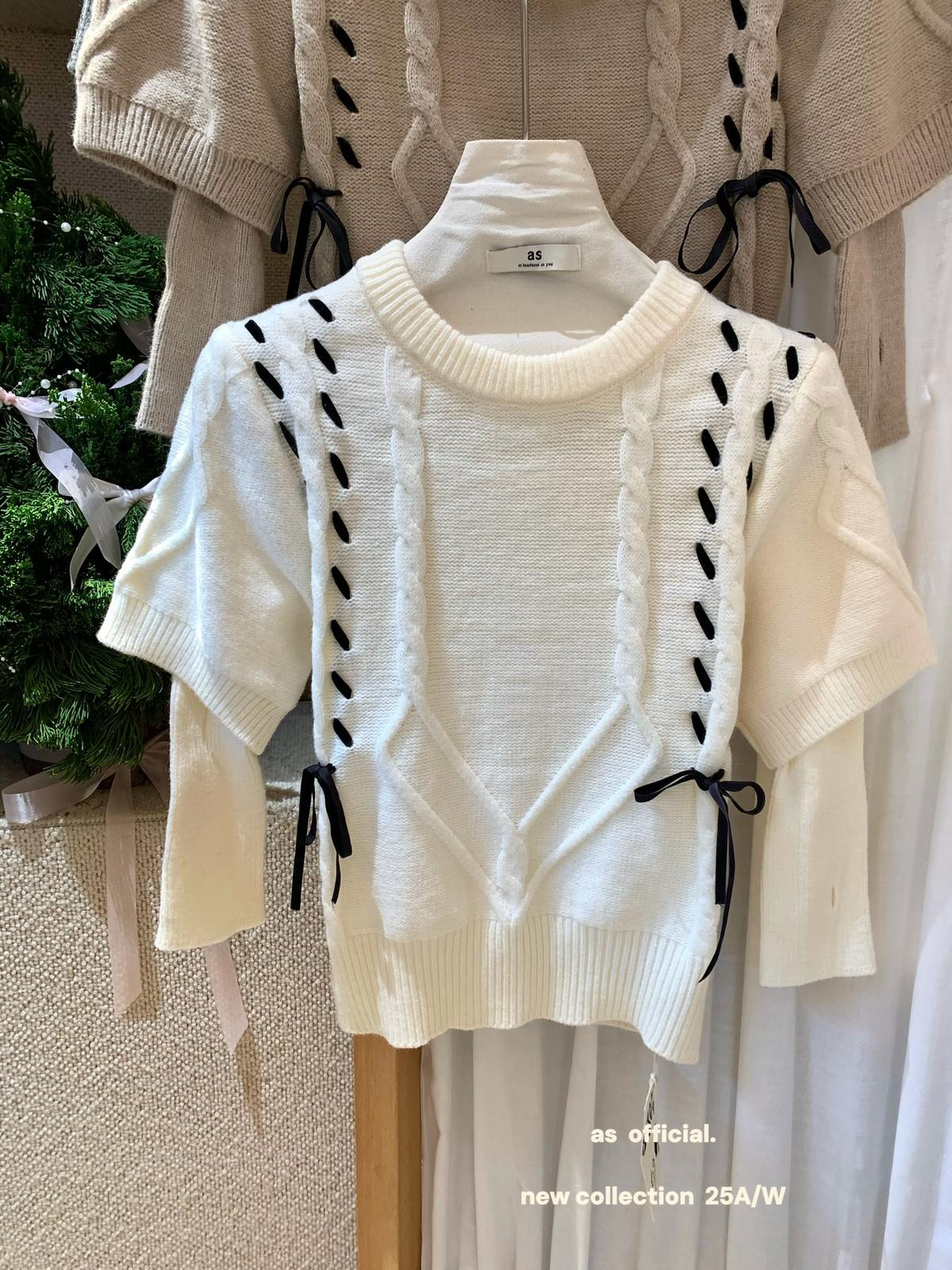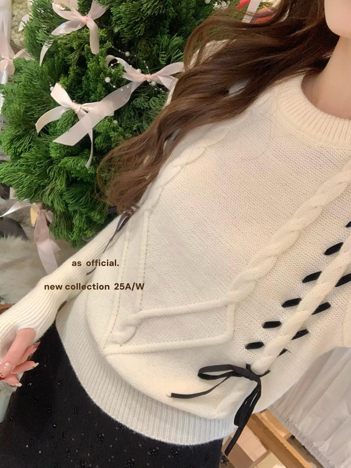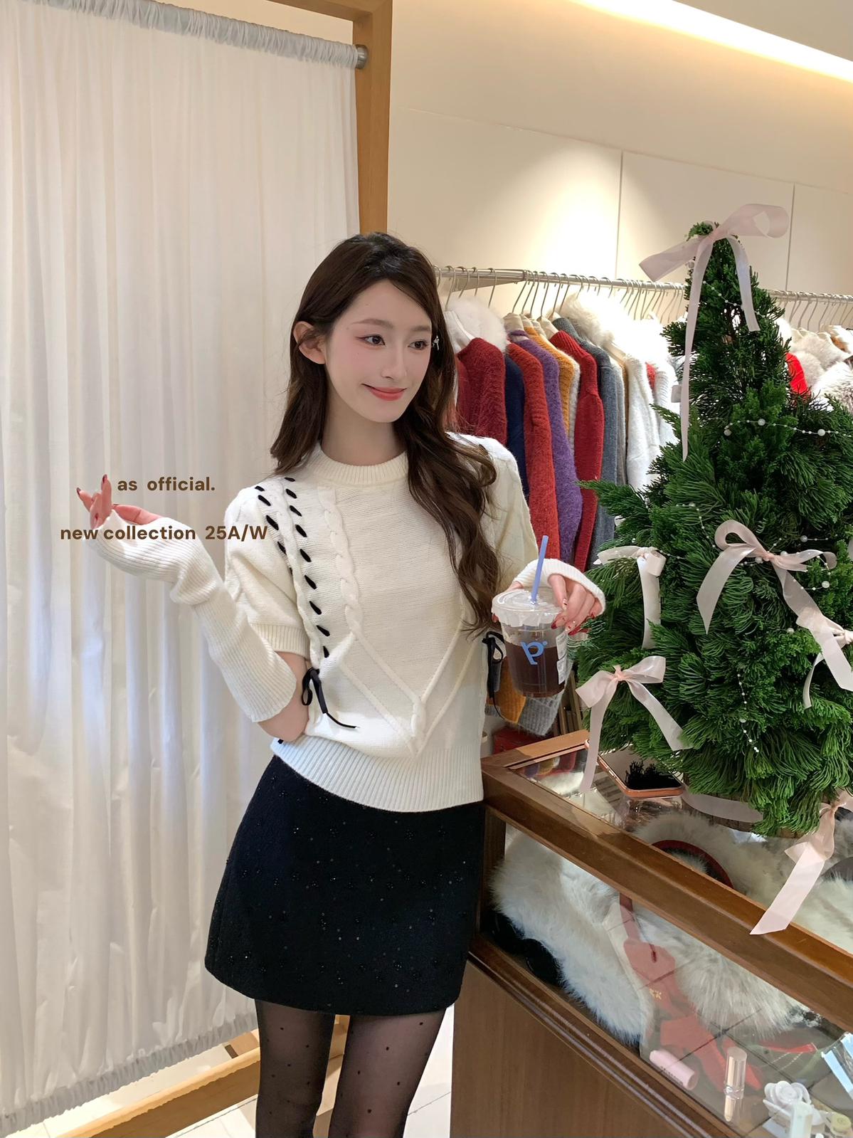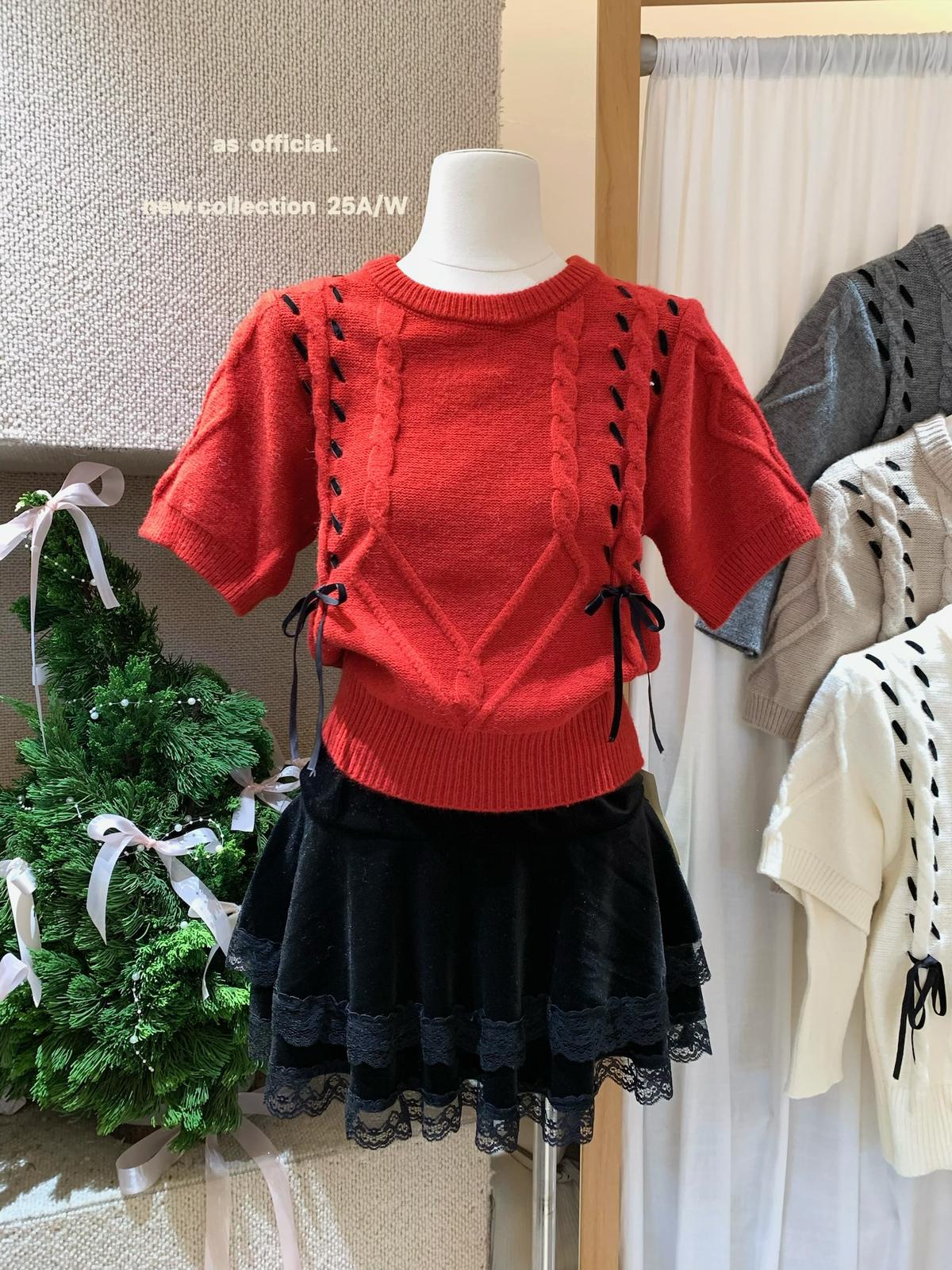 【C8313】紅色穿搭”獨特漂亮 |小香風聖誕新年 絲絨蝴蝶結繫帶保暖毛衣(配袖套)(收到很多誇誇!!)