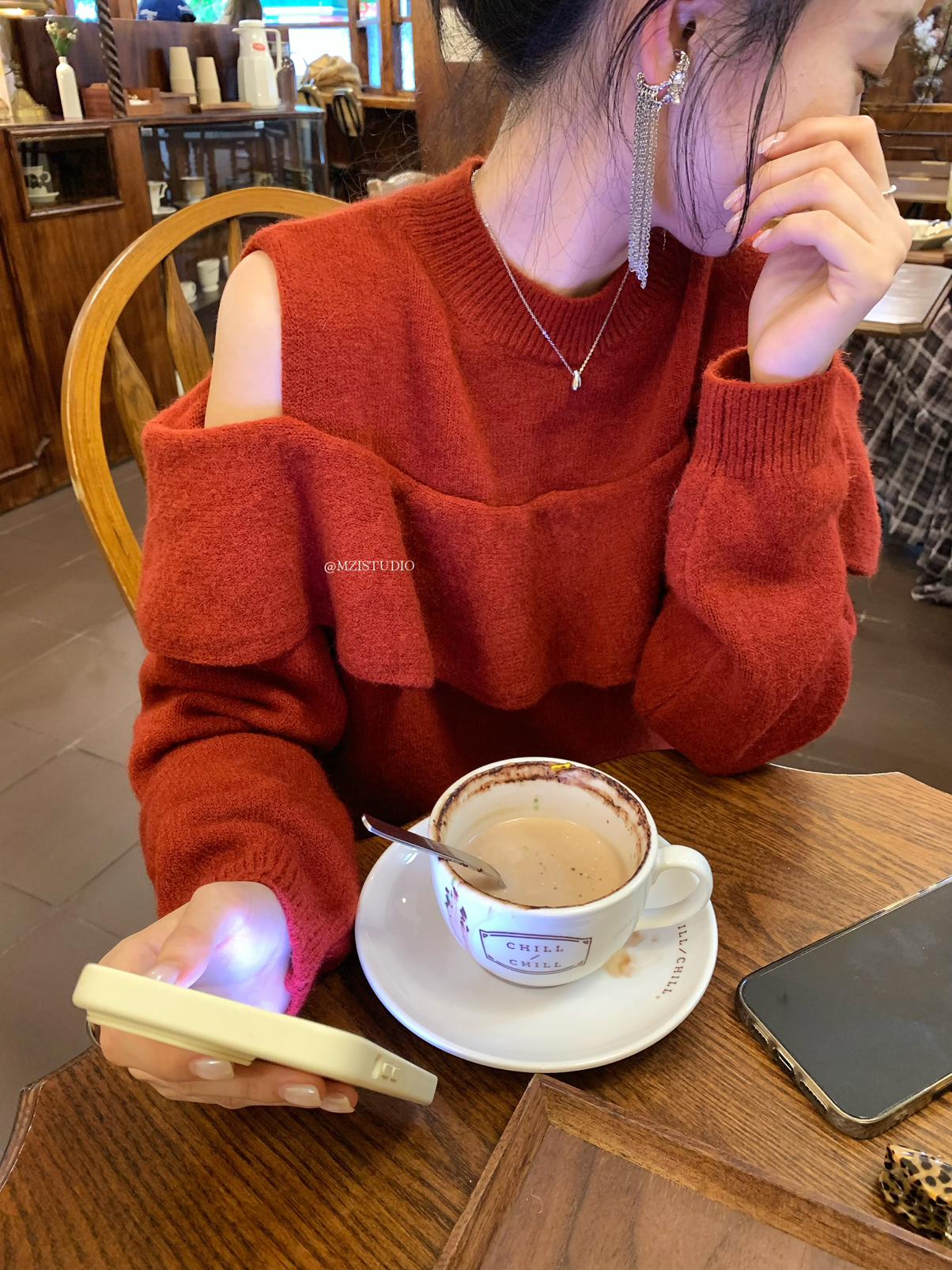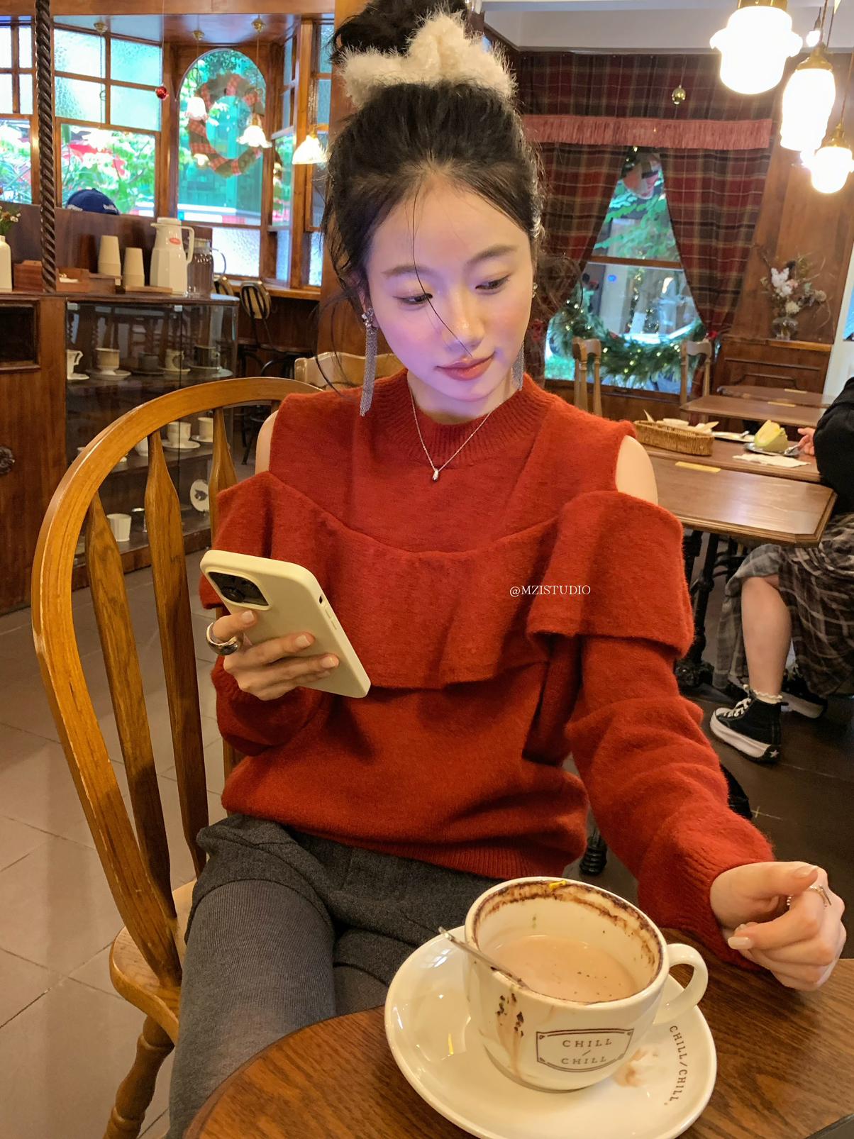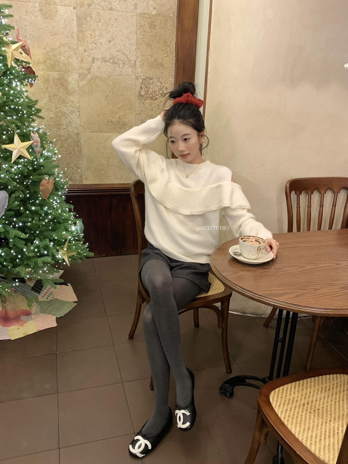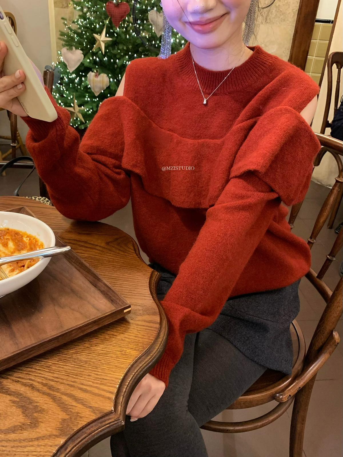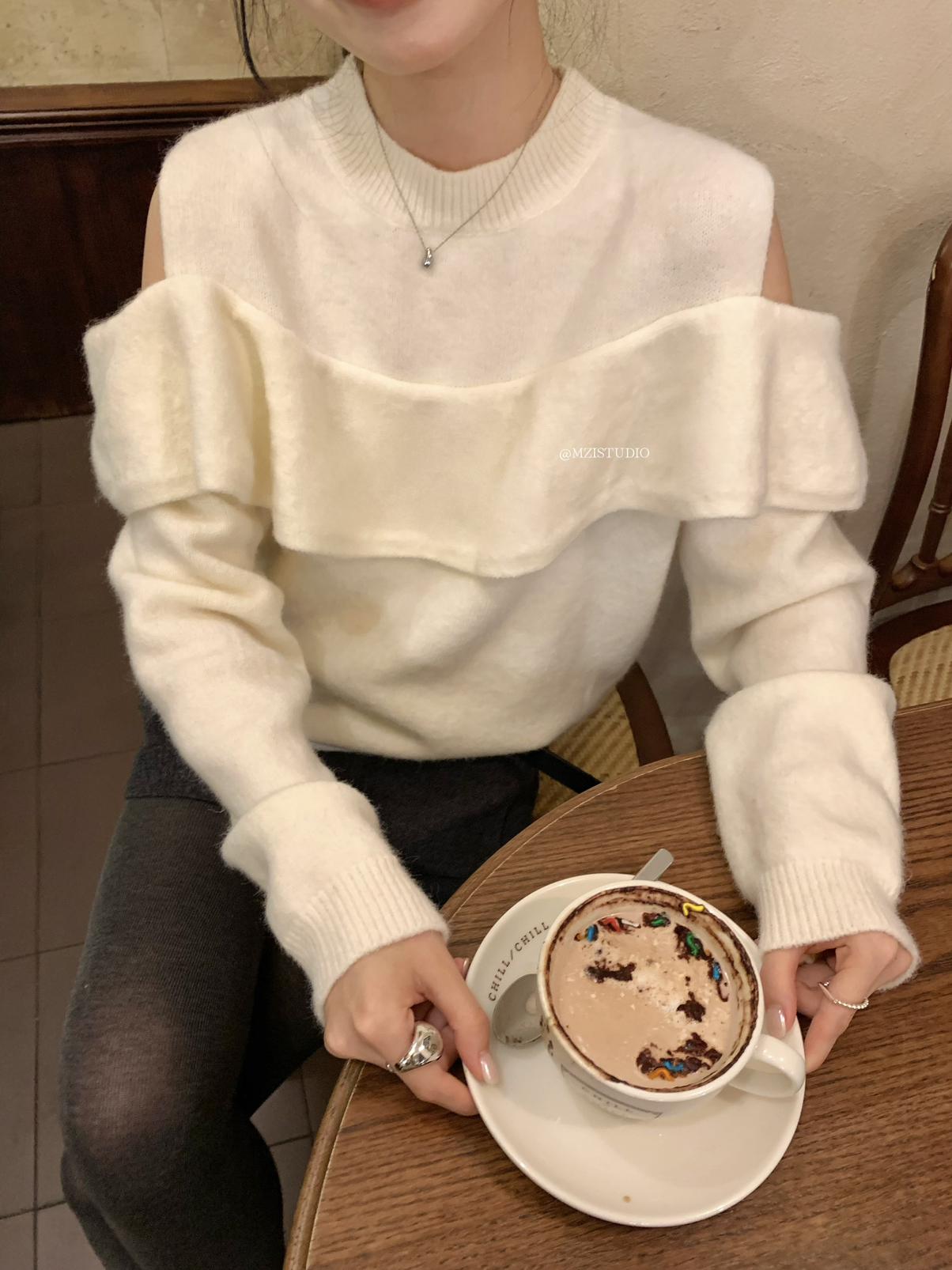 3. 【C8315】韓感約會小心機假兩件荷葉邊露肩顯瘦氛圍感冬日保暖毛衣
