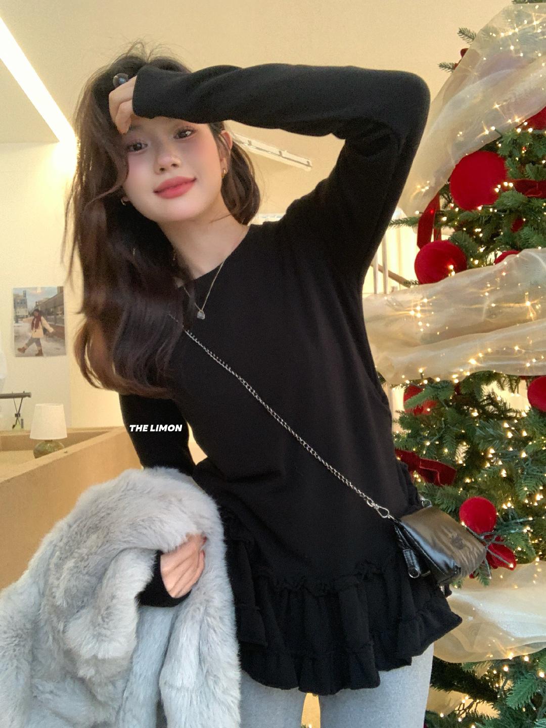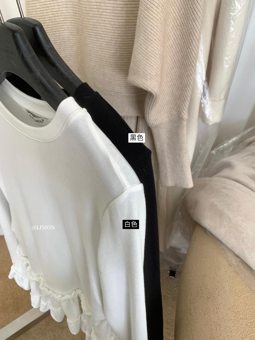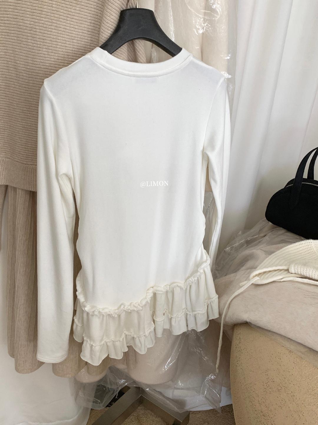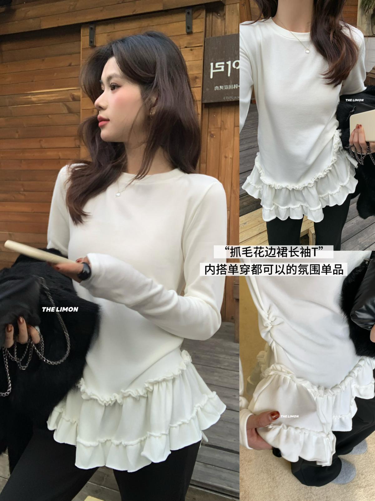 3. 【C8332】設計感芭蕾花邊裙襬圓領抓毛長袖T恤