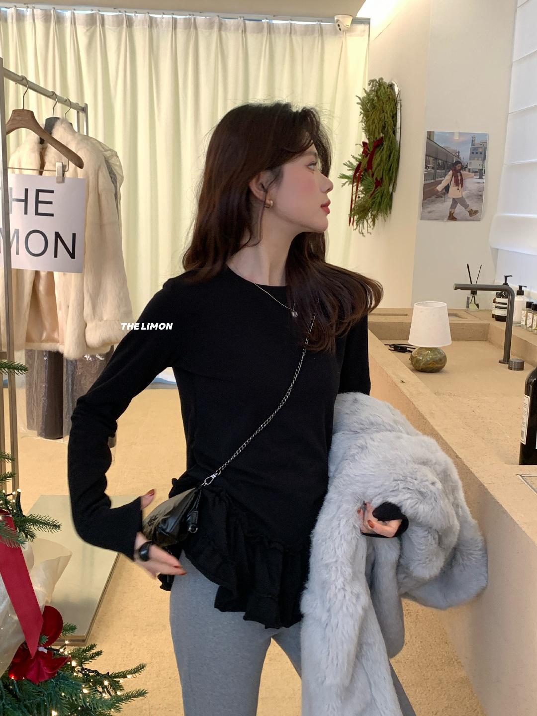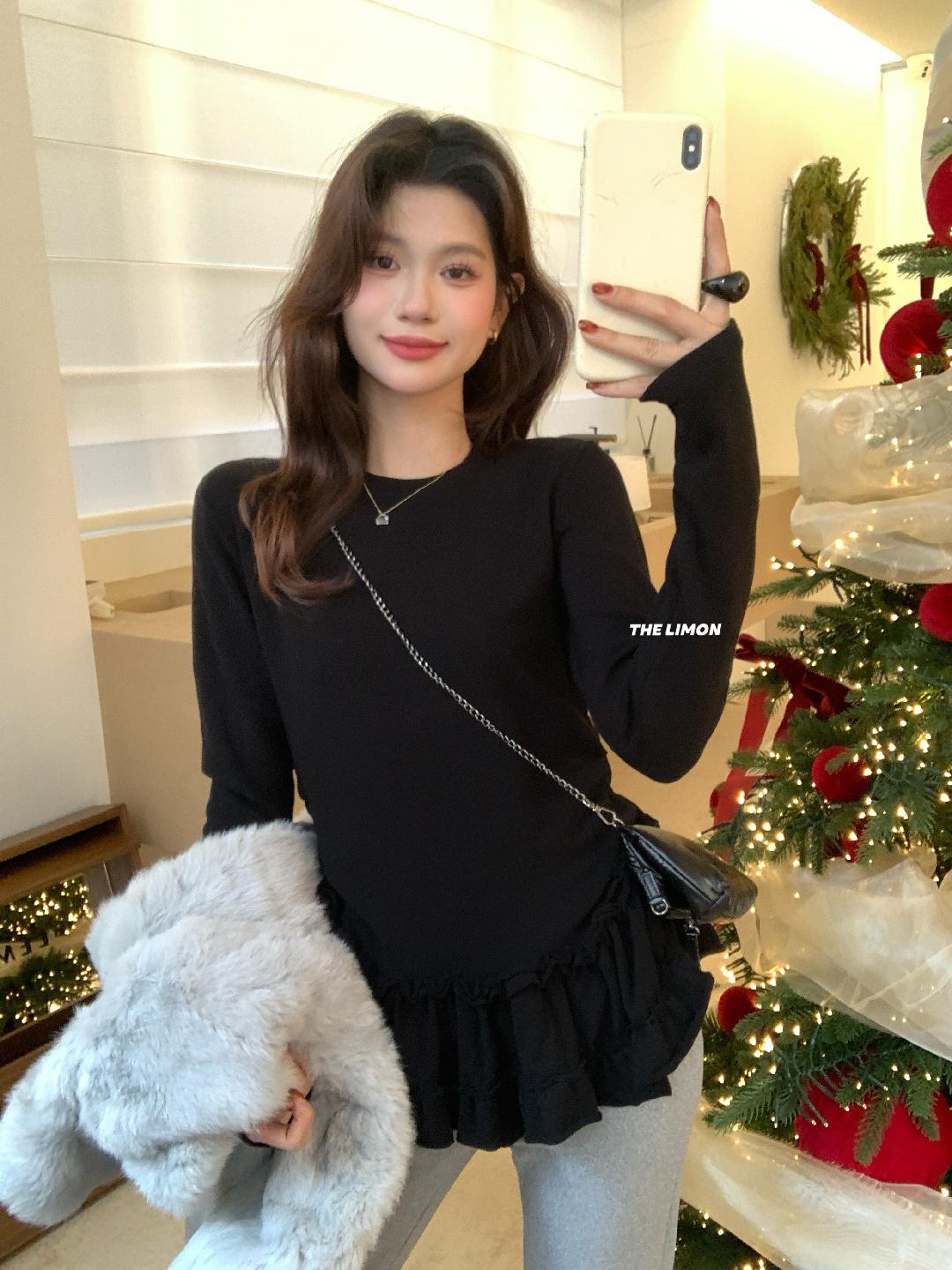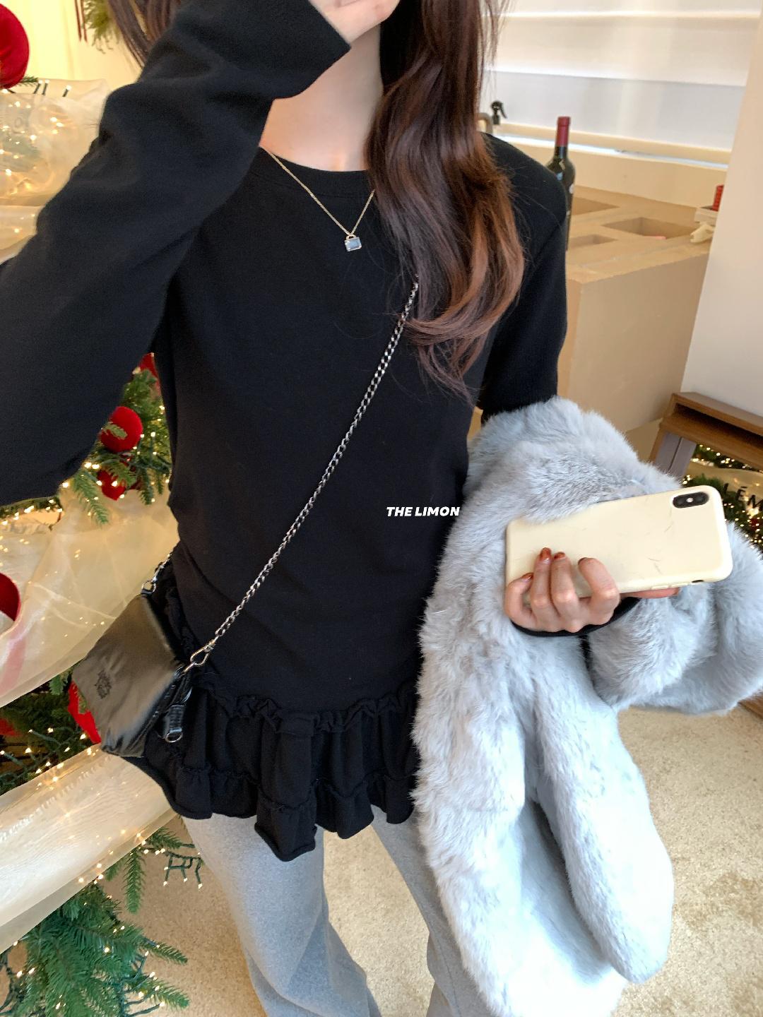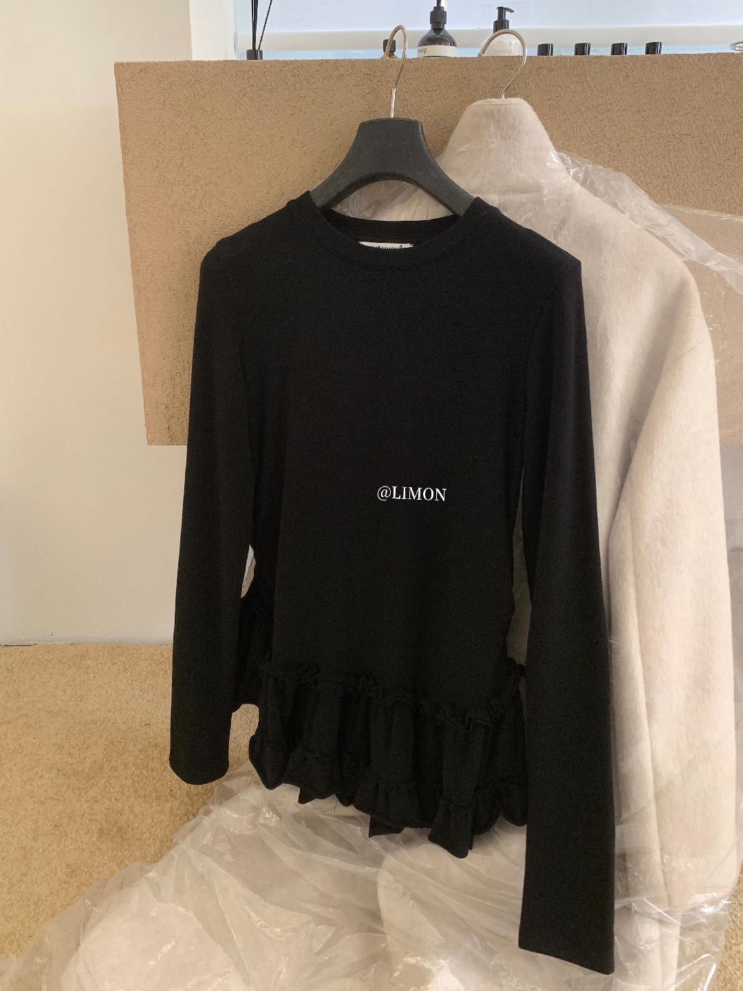3. 【C8332】設計感芭蕾花邊裙襬圓領抓毛長袖T恤