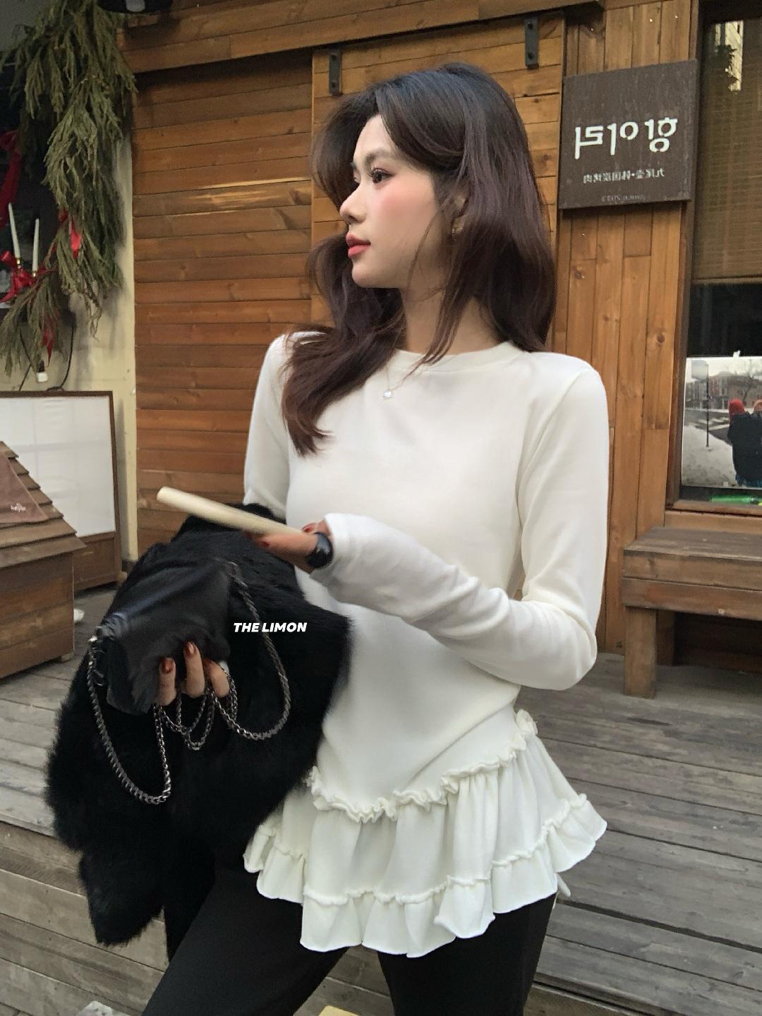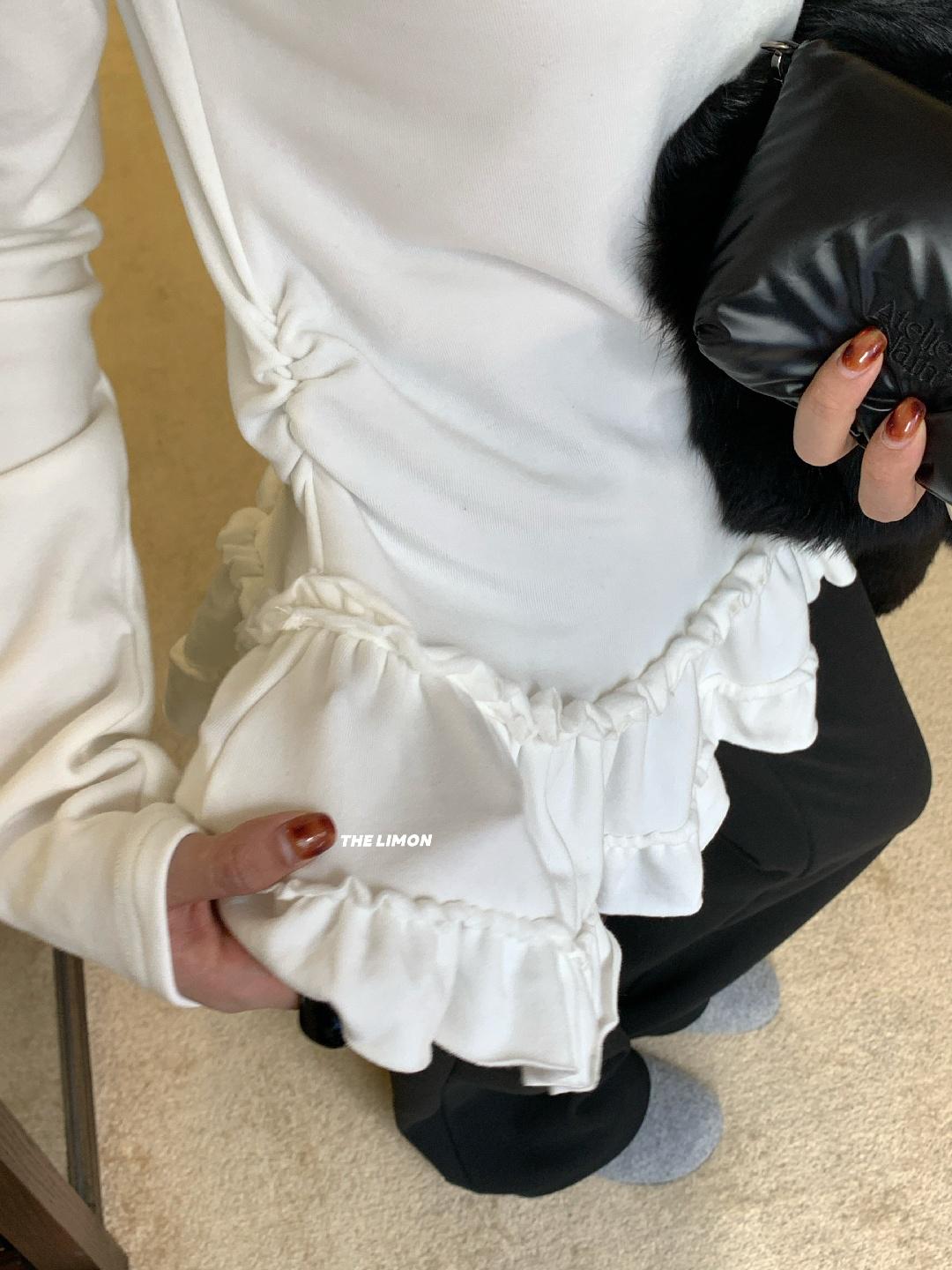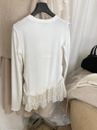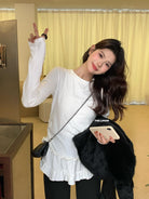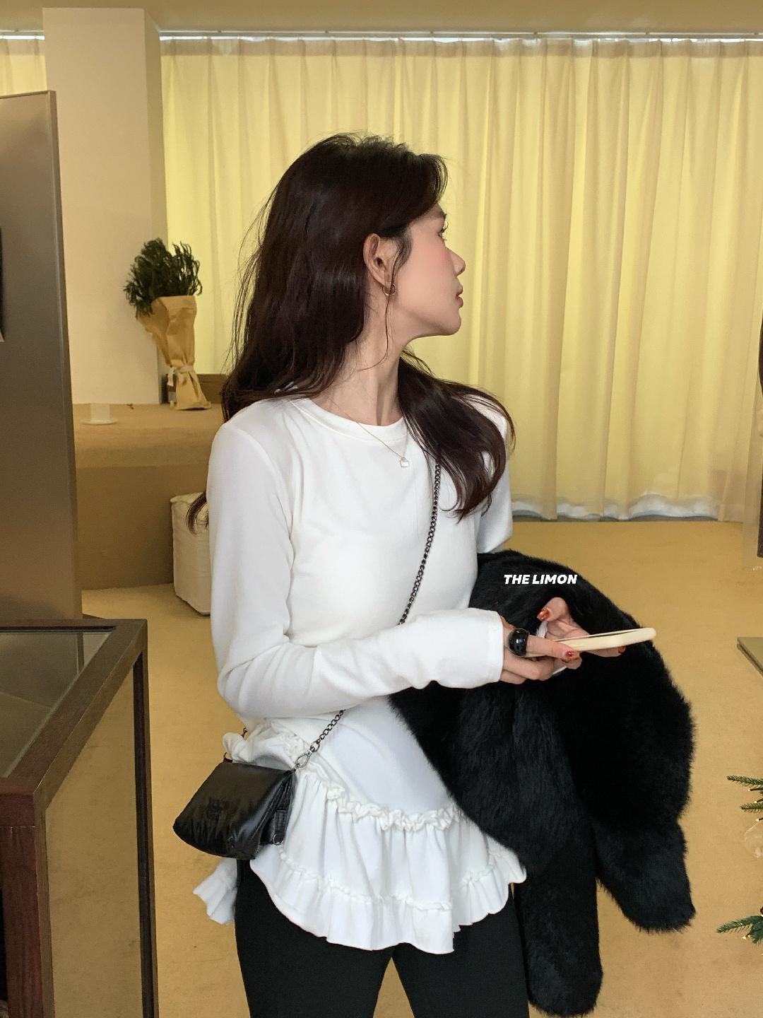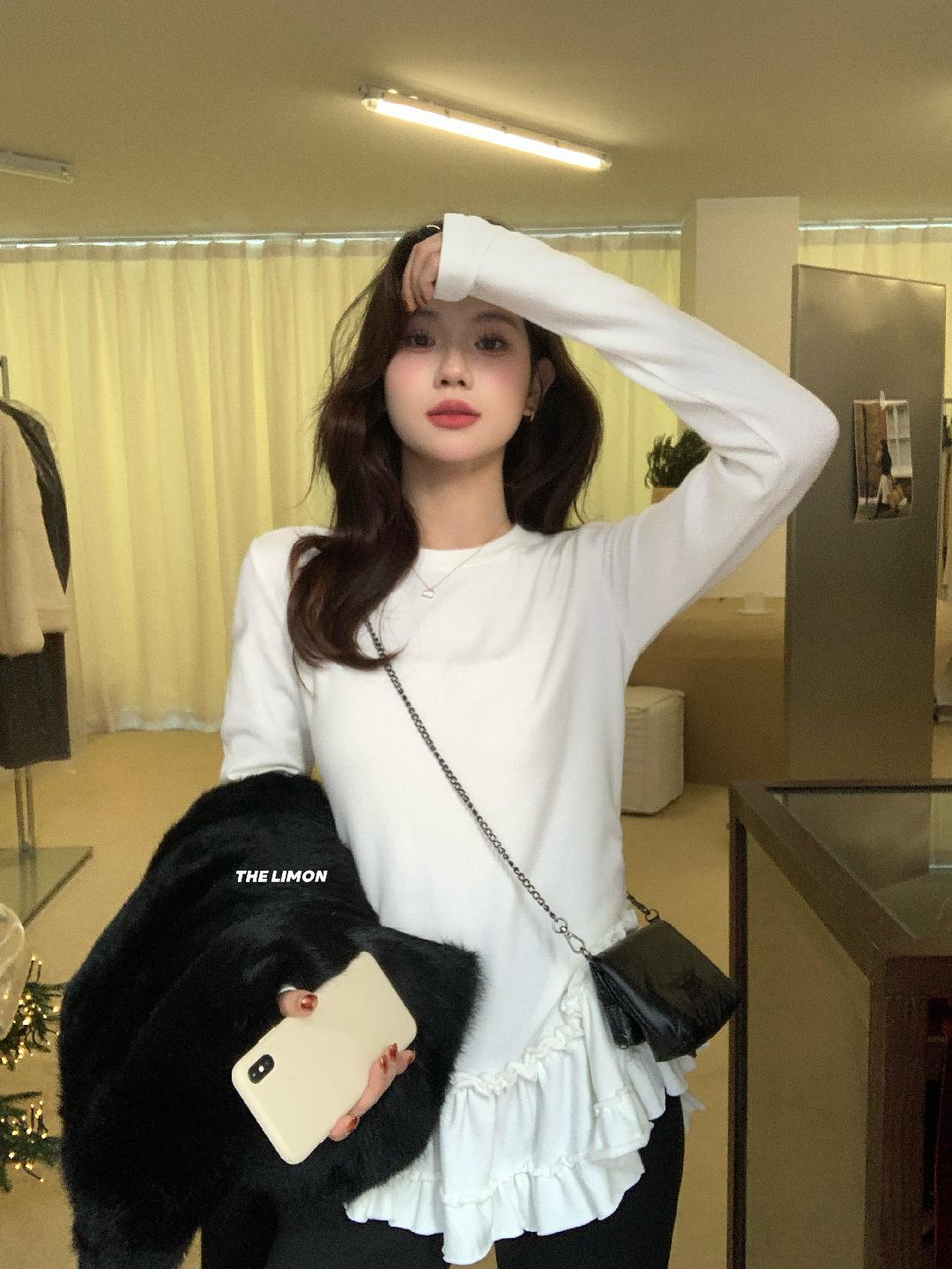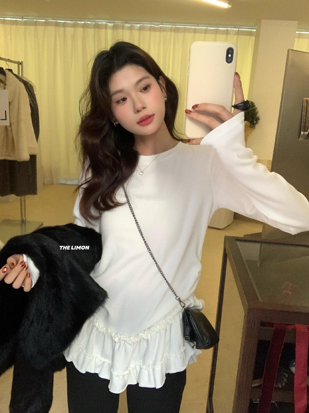 【C8332】設計感芭蕾花邊裙襬圓領抓毛長袖T恤