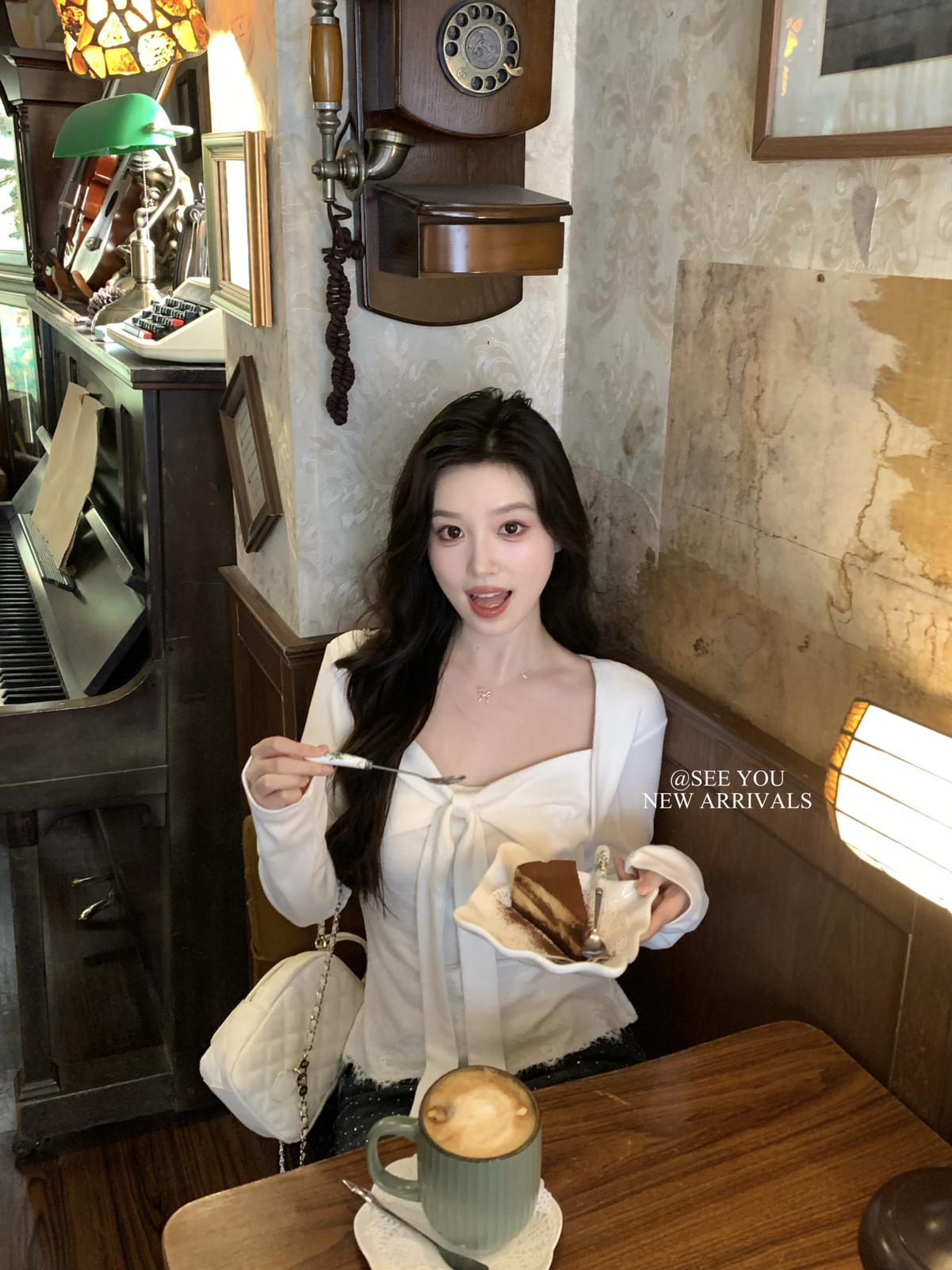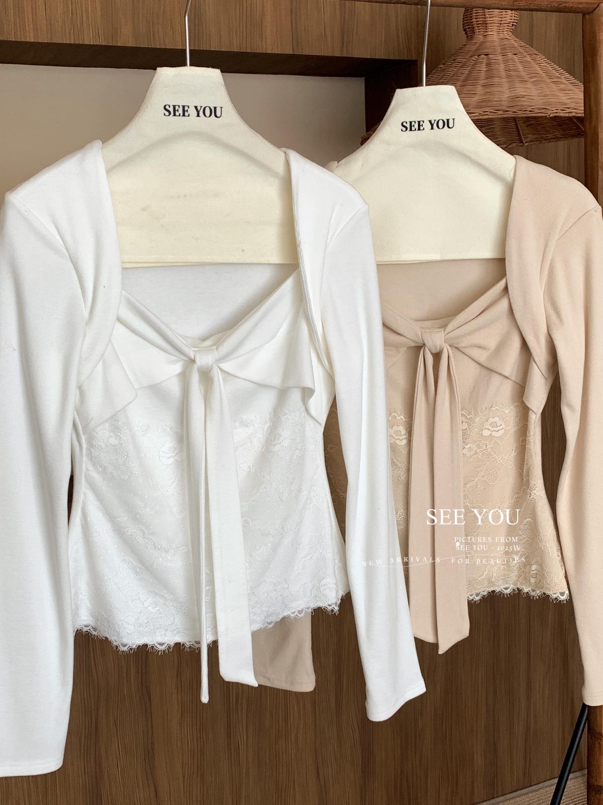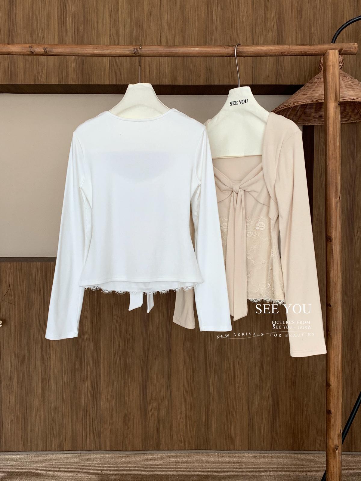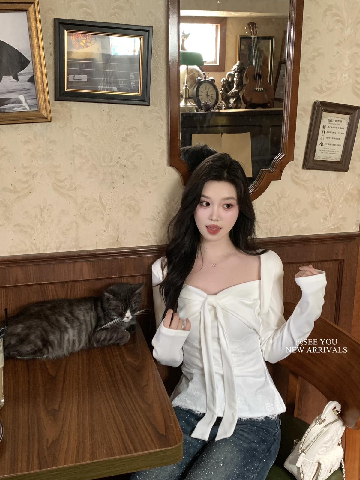 【C8338】迪士尼在逃公主丨法式復古綁帶氣質蕾絲修身薄絨小衫