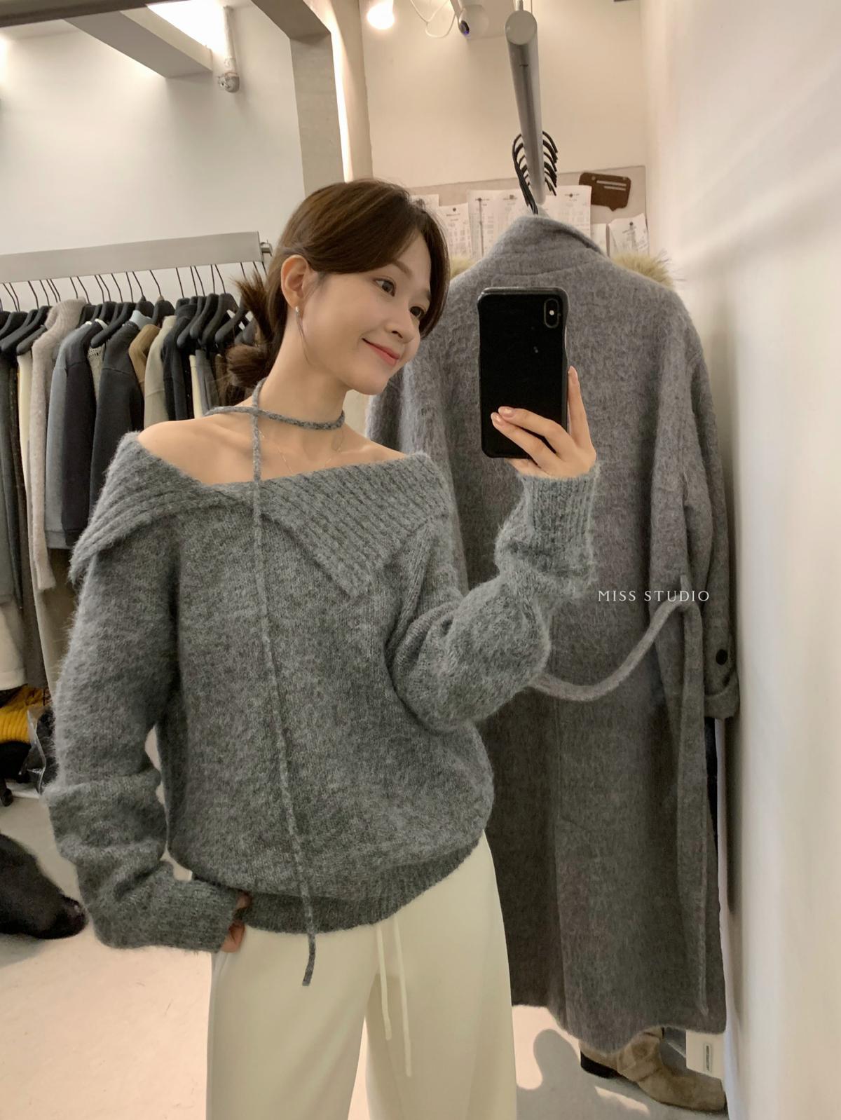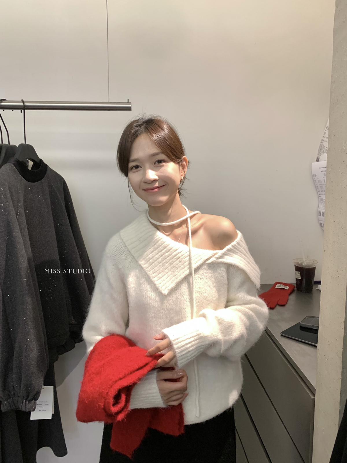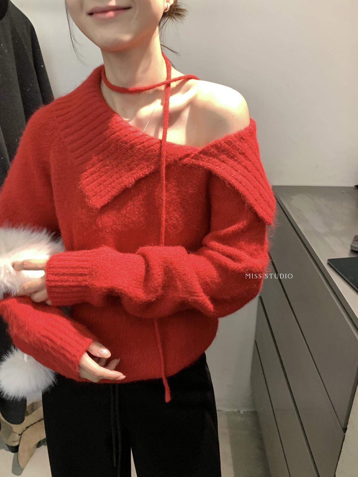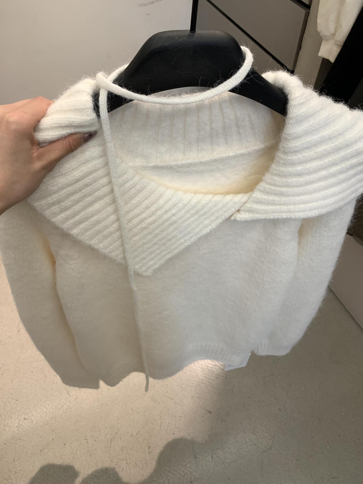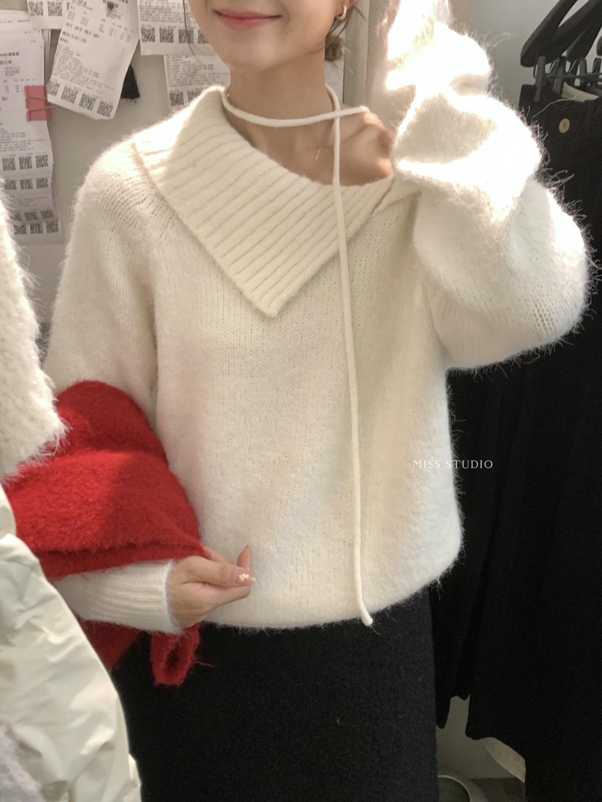 【C8341】韓系簡約年會款不規則領繫帶保暖毛衣(配腰繩)(含8%羊毛)
