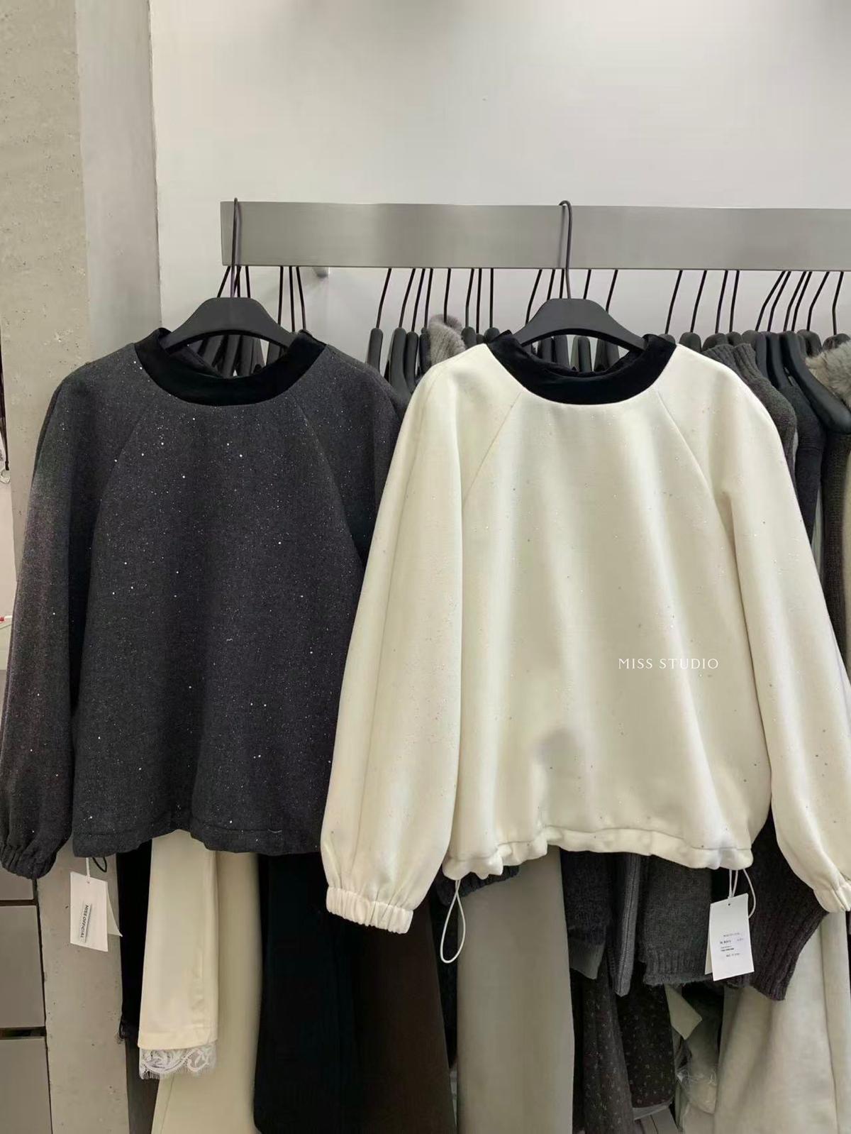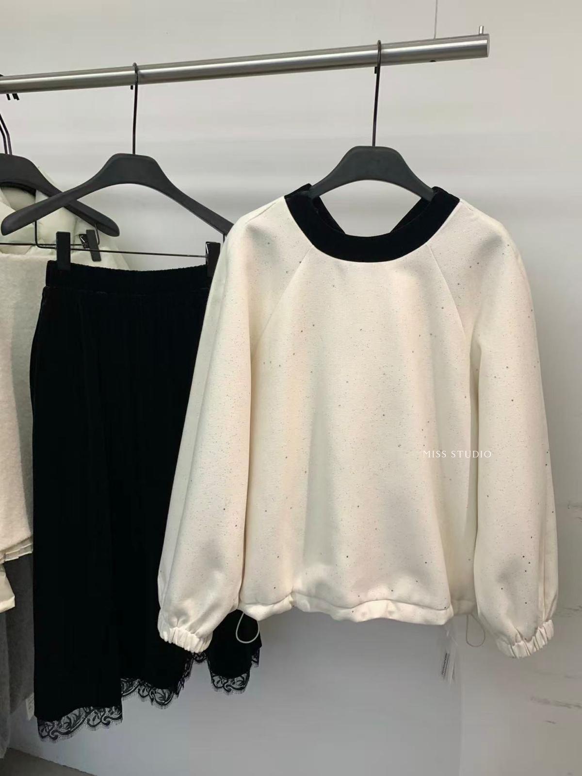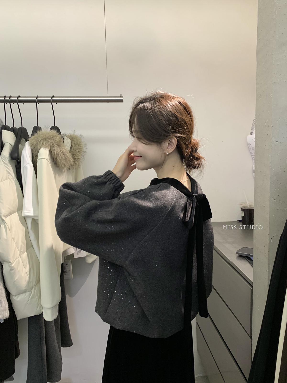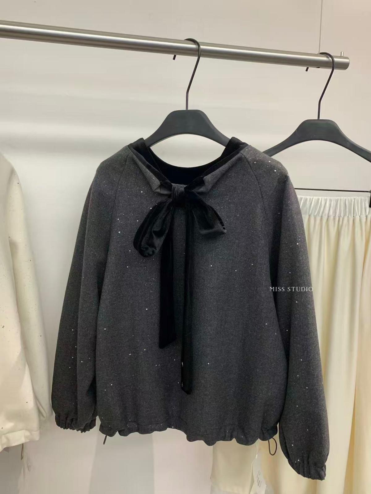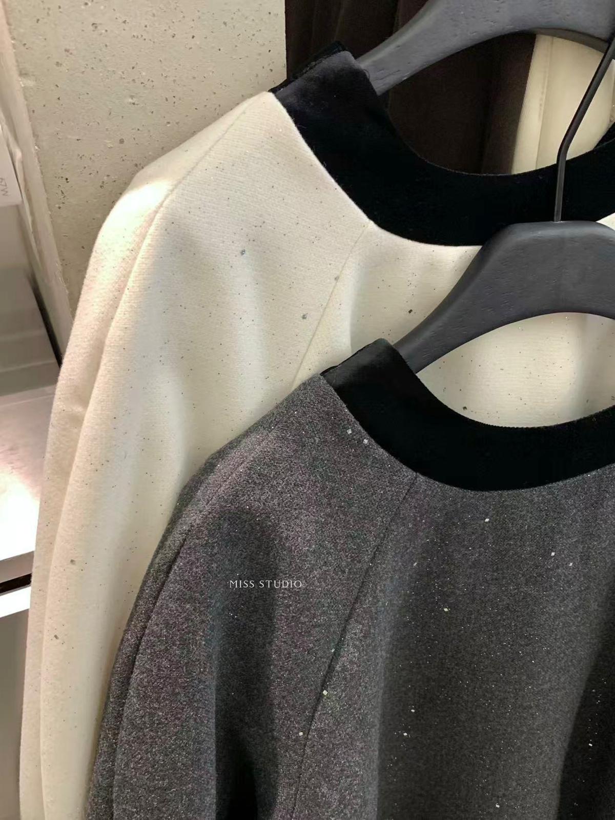 【C8342】法式精緻主義~拼絲絨繫帶領燙鑽呢子上衣衛衣