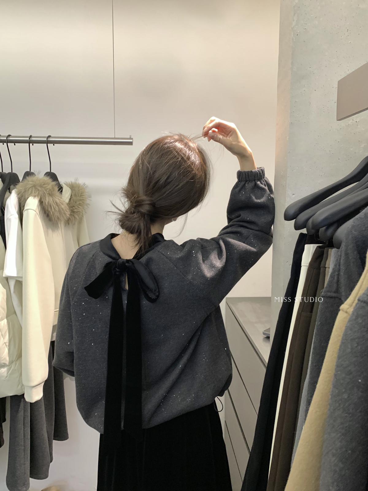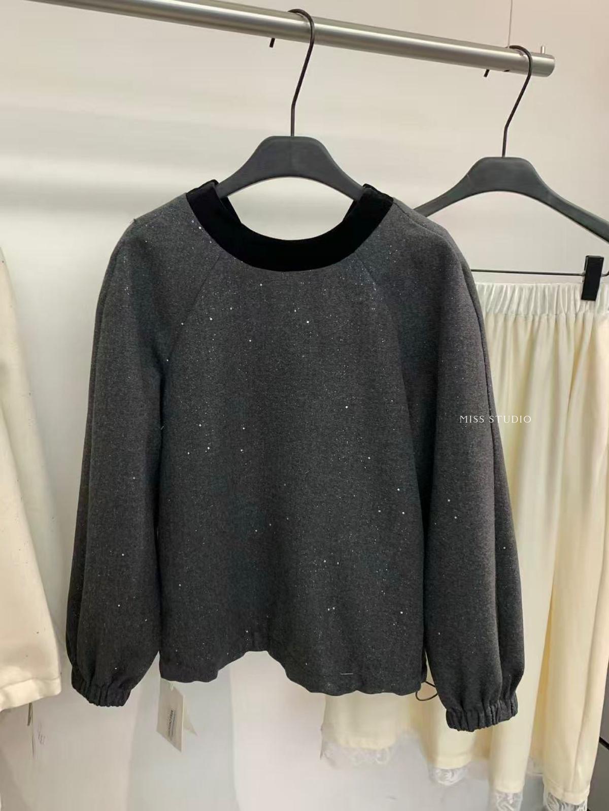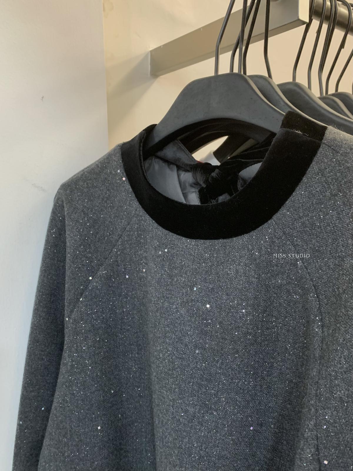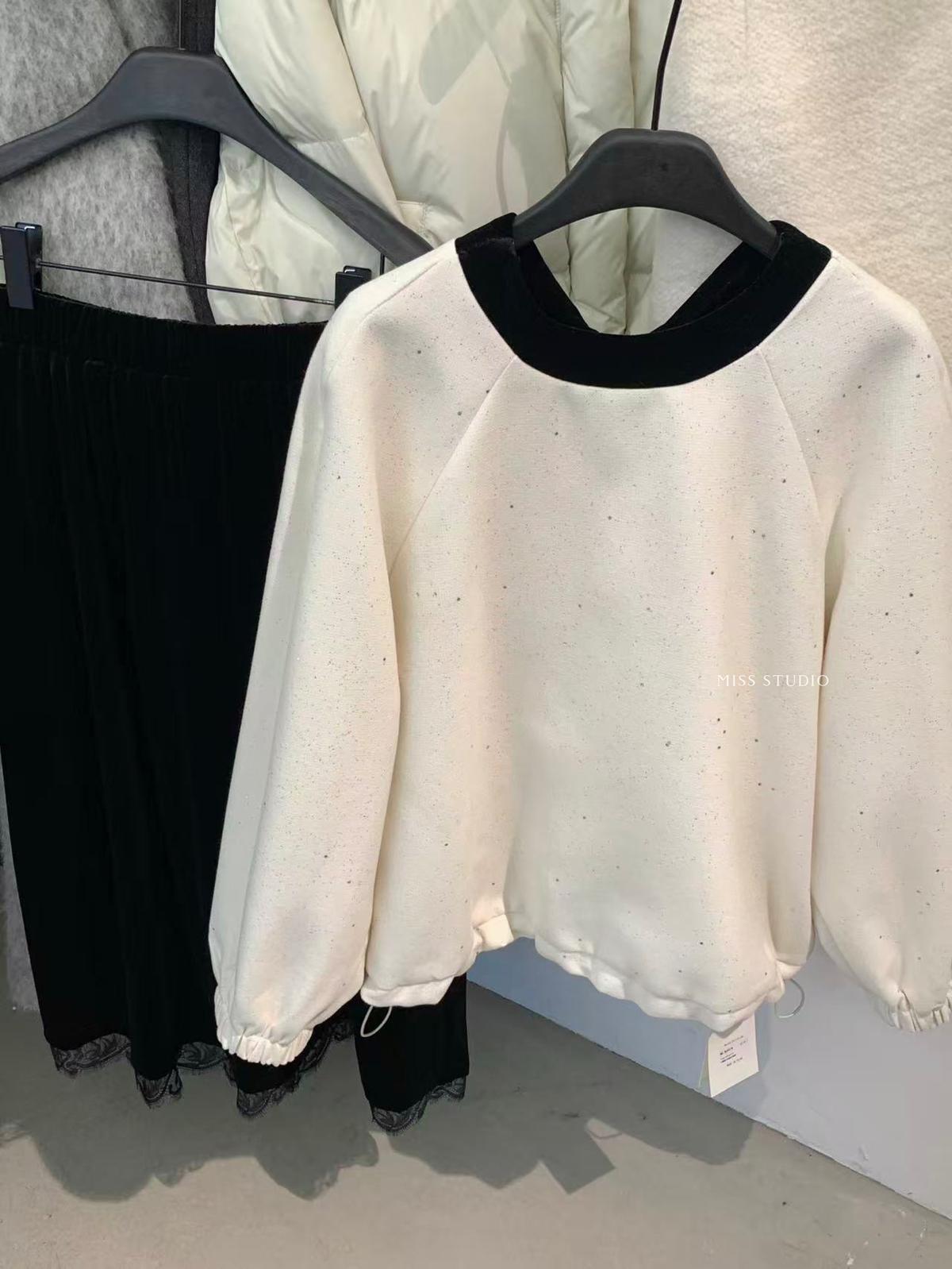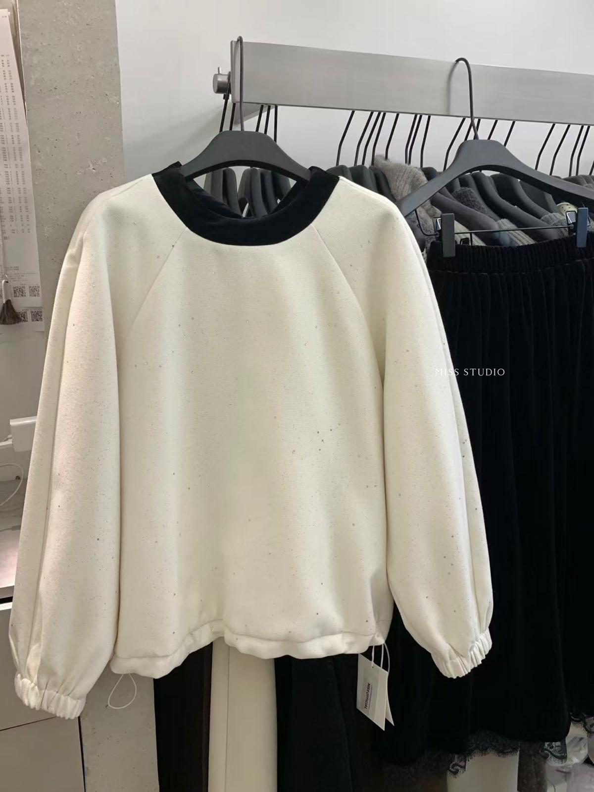 【C8342】法式精緻主義~拼絲絨繫帶領燙鑽呢子上衣衛衣
