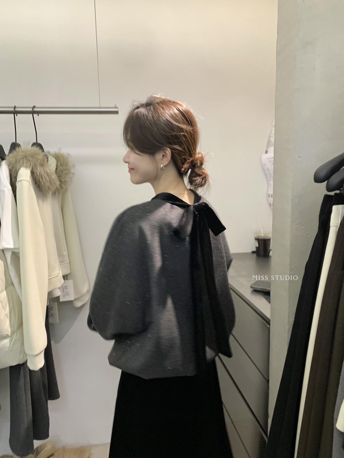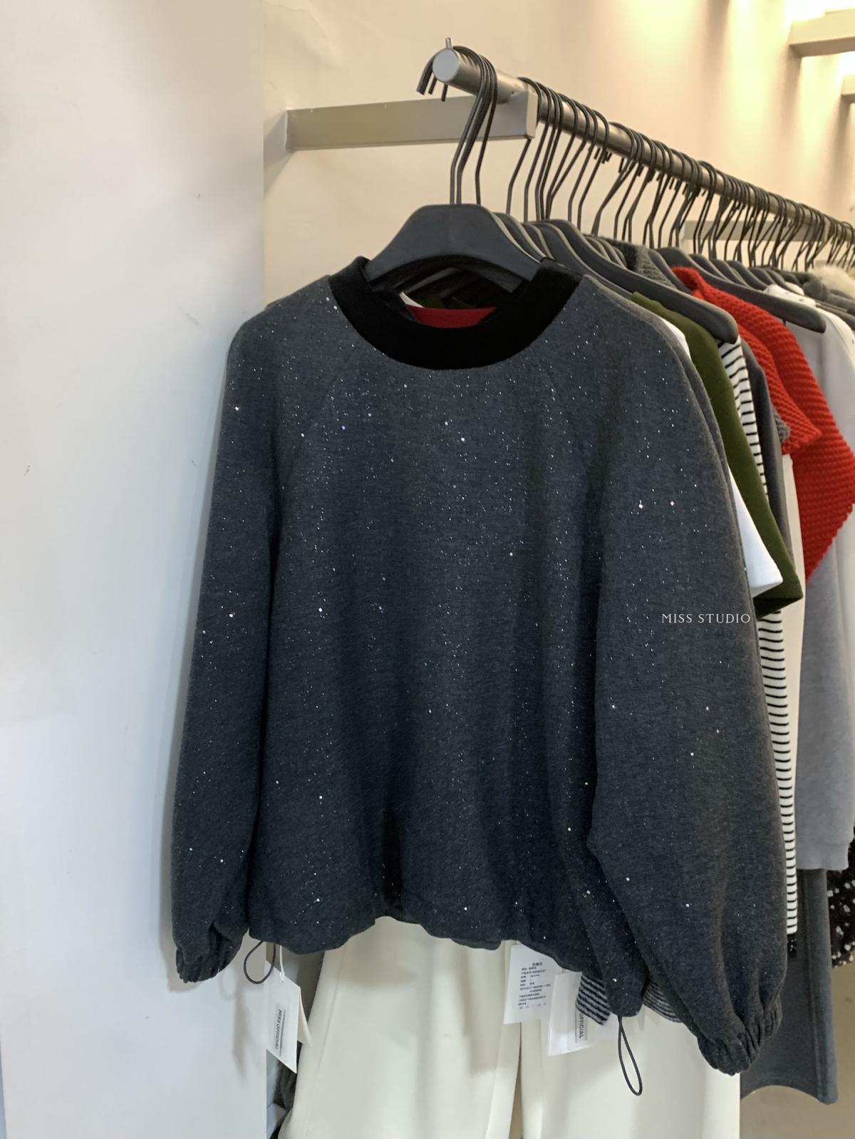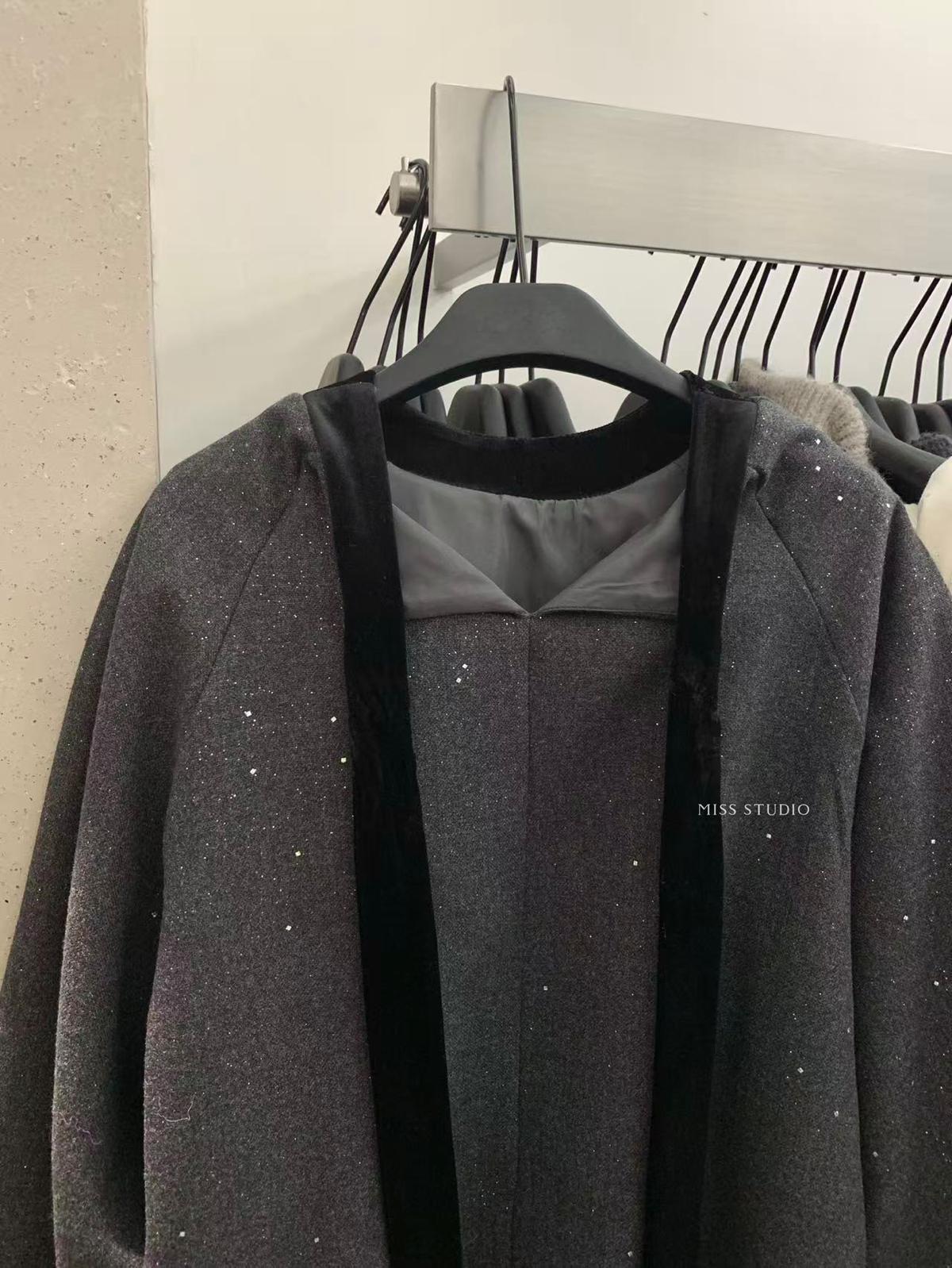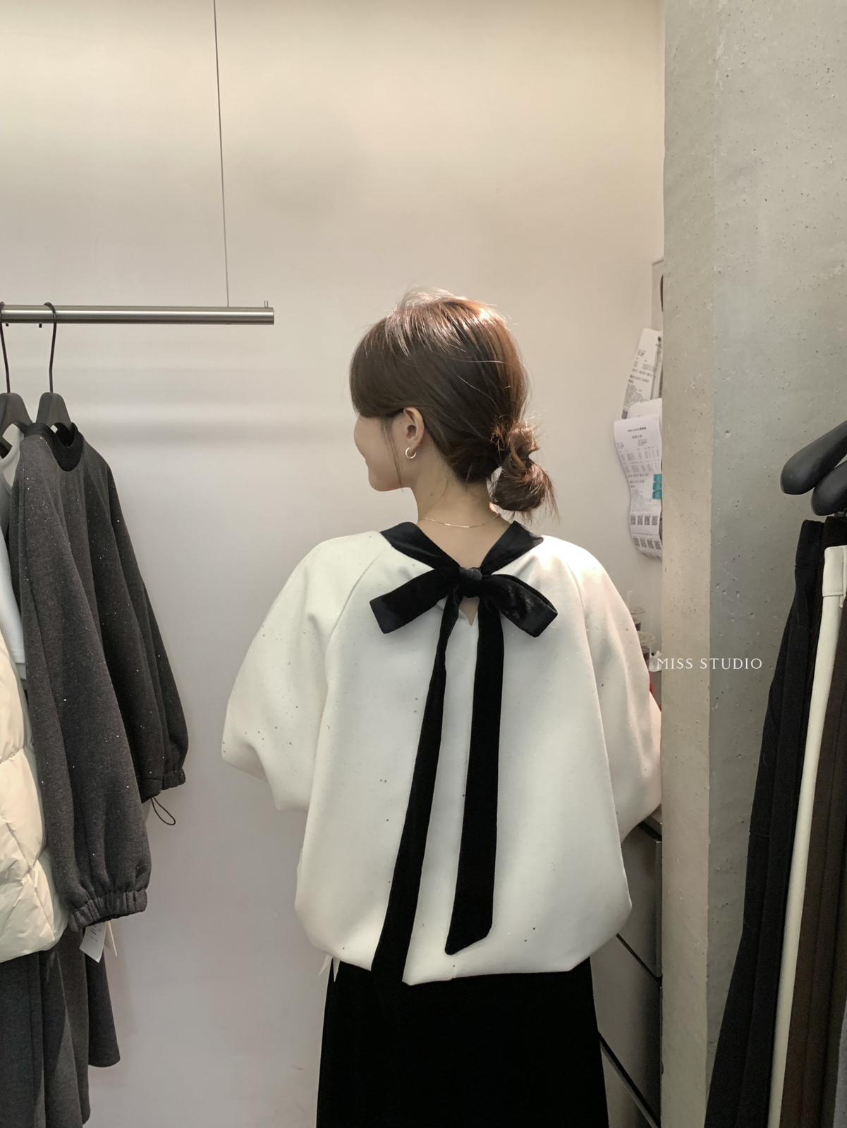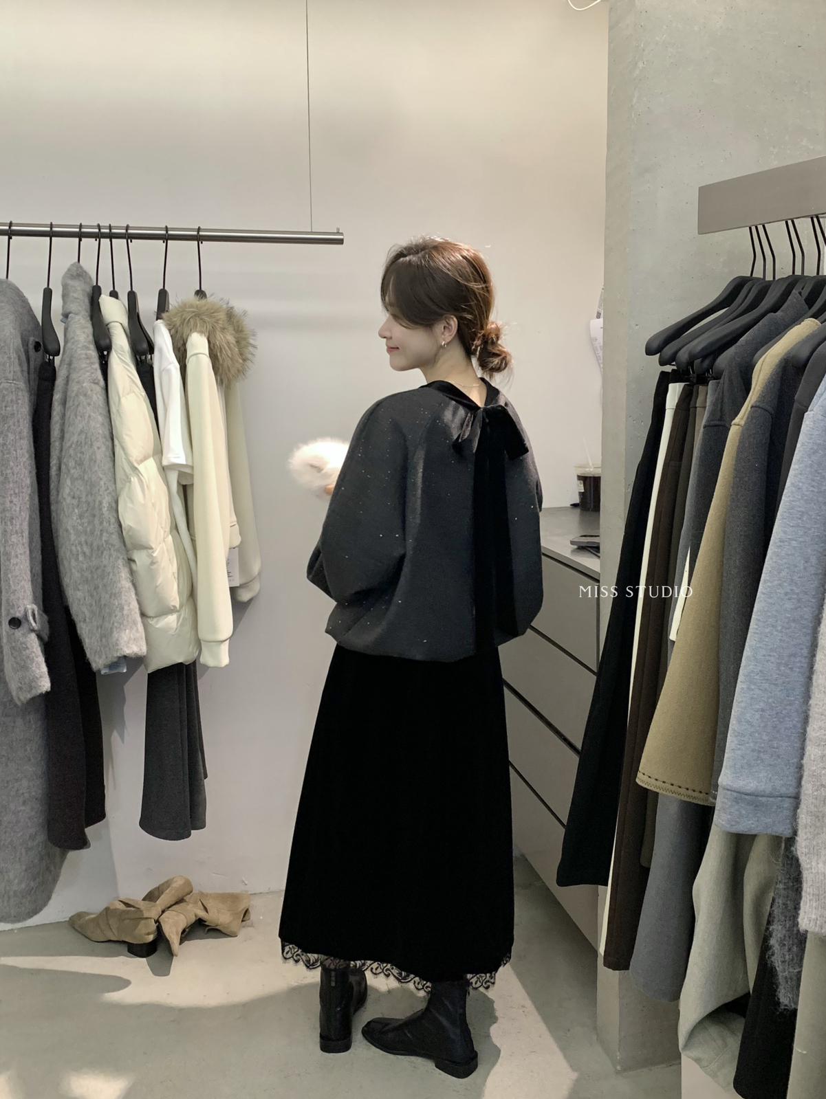 【C8342】法式精緻主義~拼絲絨繫帶領燙鑽呢子上衣衛衣