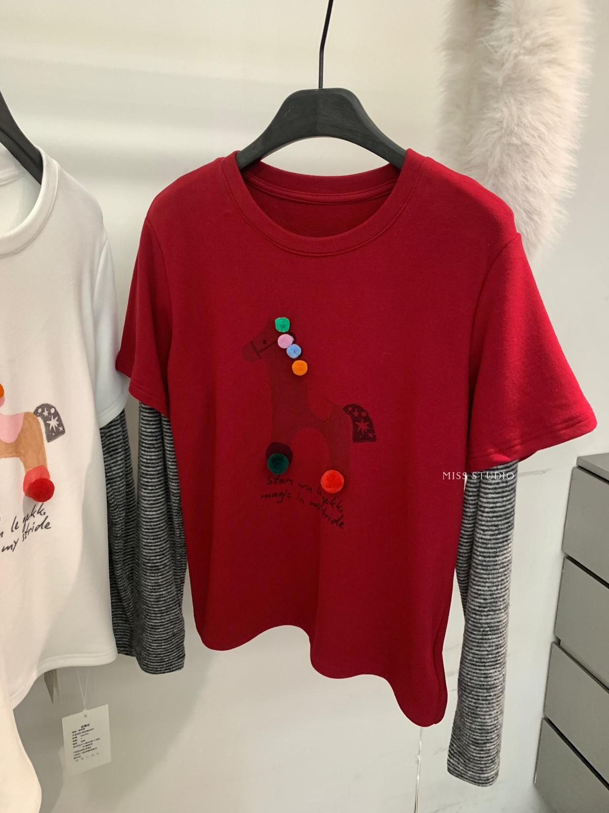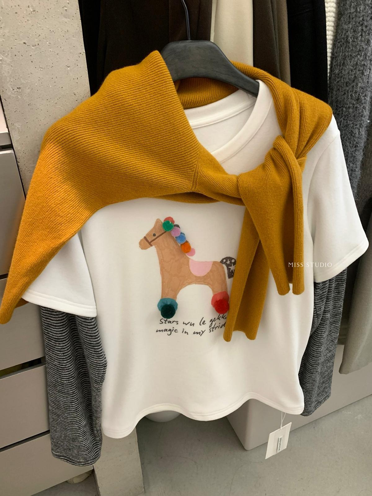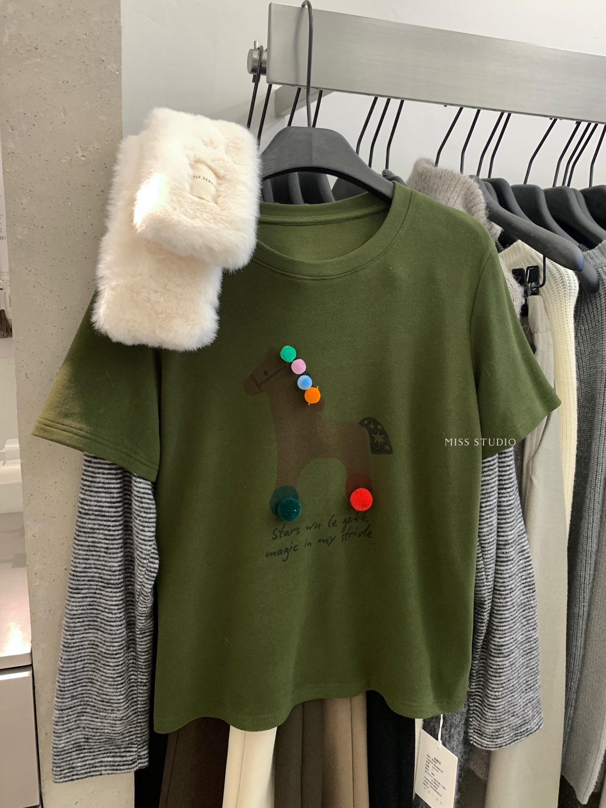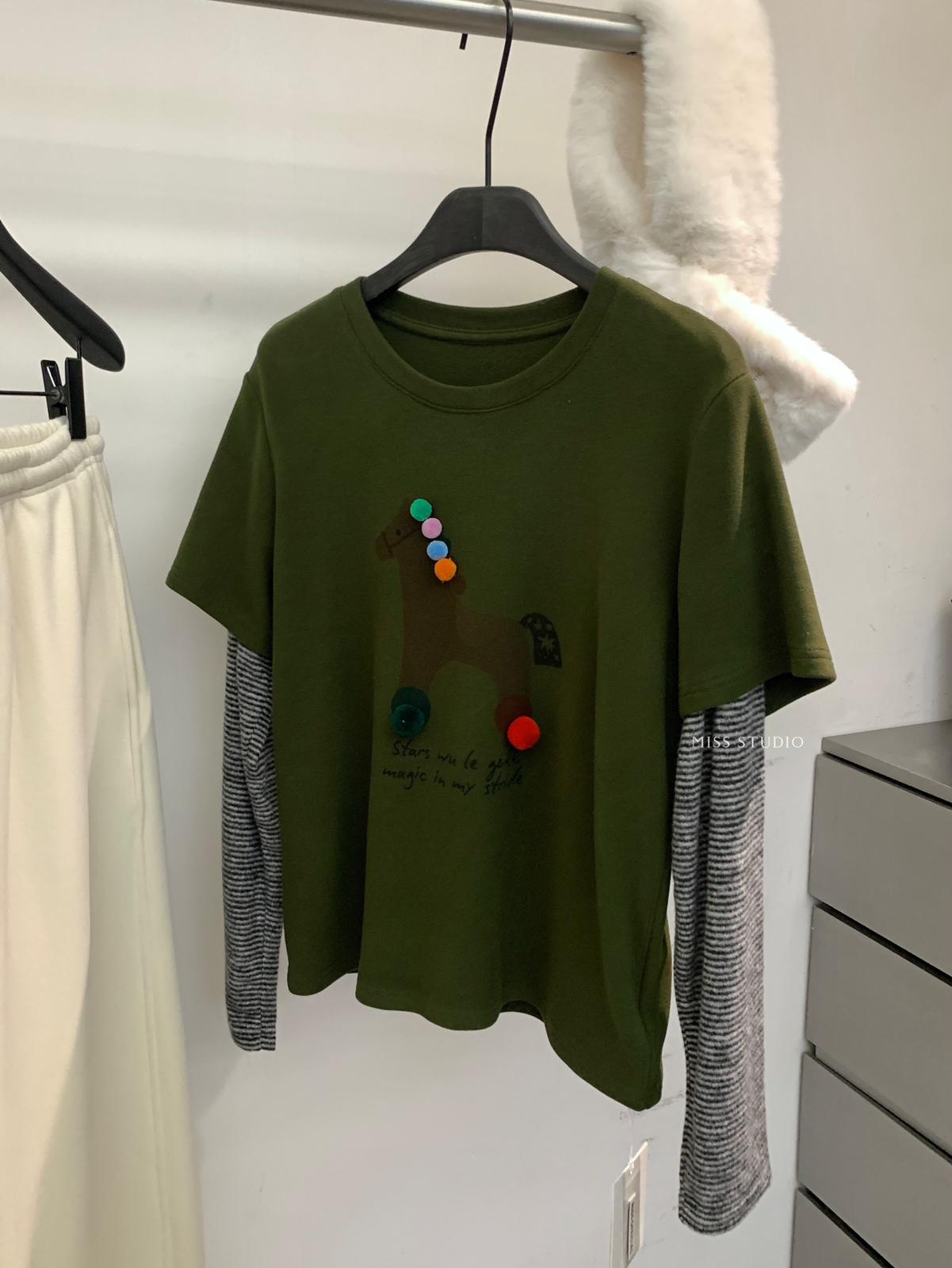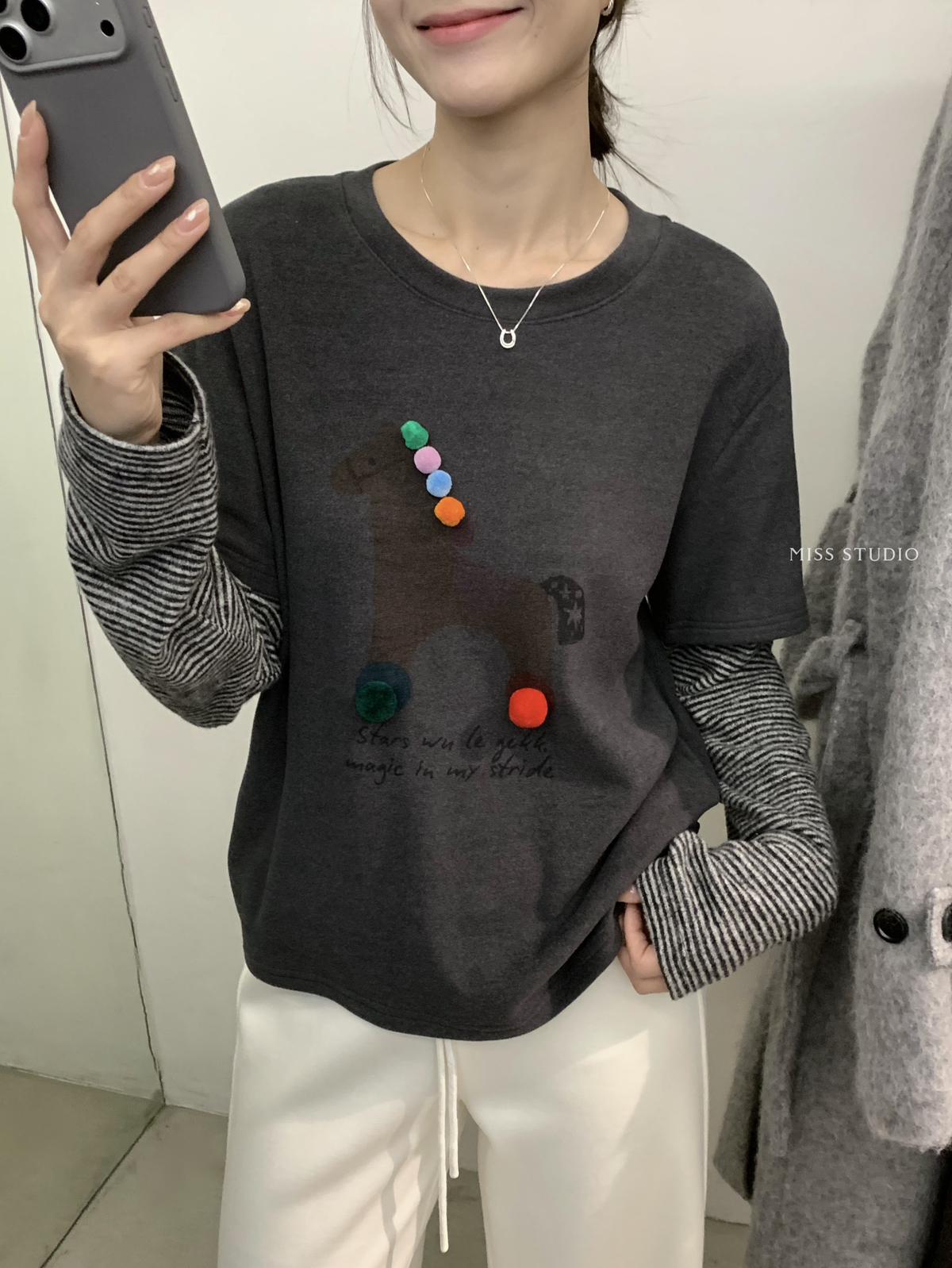 3. 【C8343】立體裝飾小馬拼接條紋磨毛加厚假兩件長袖T恤