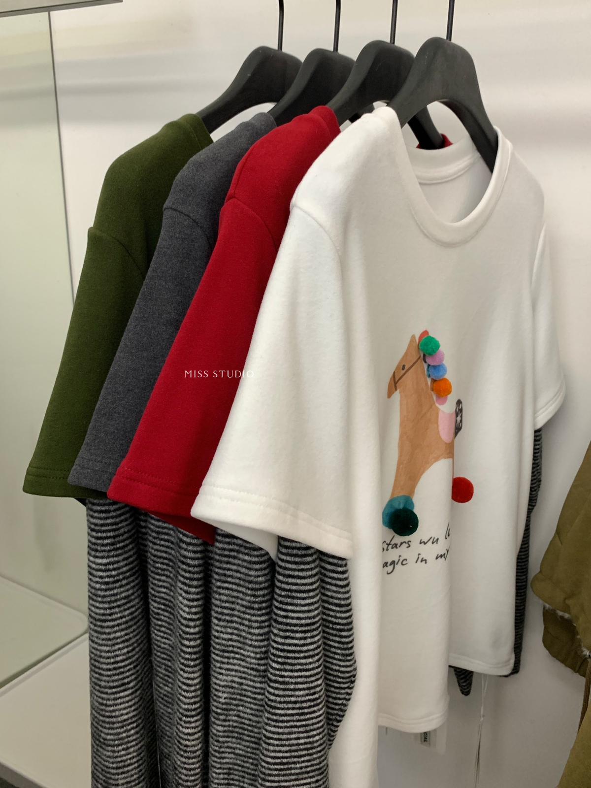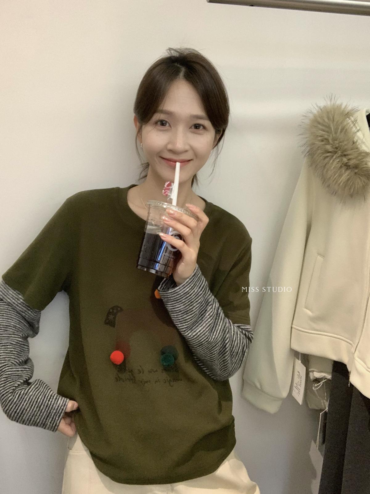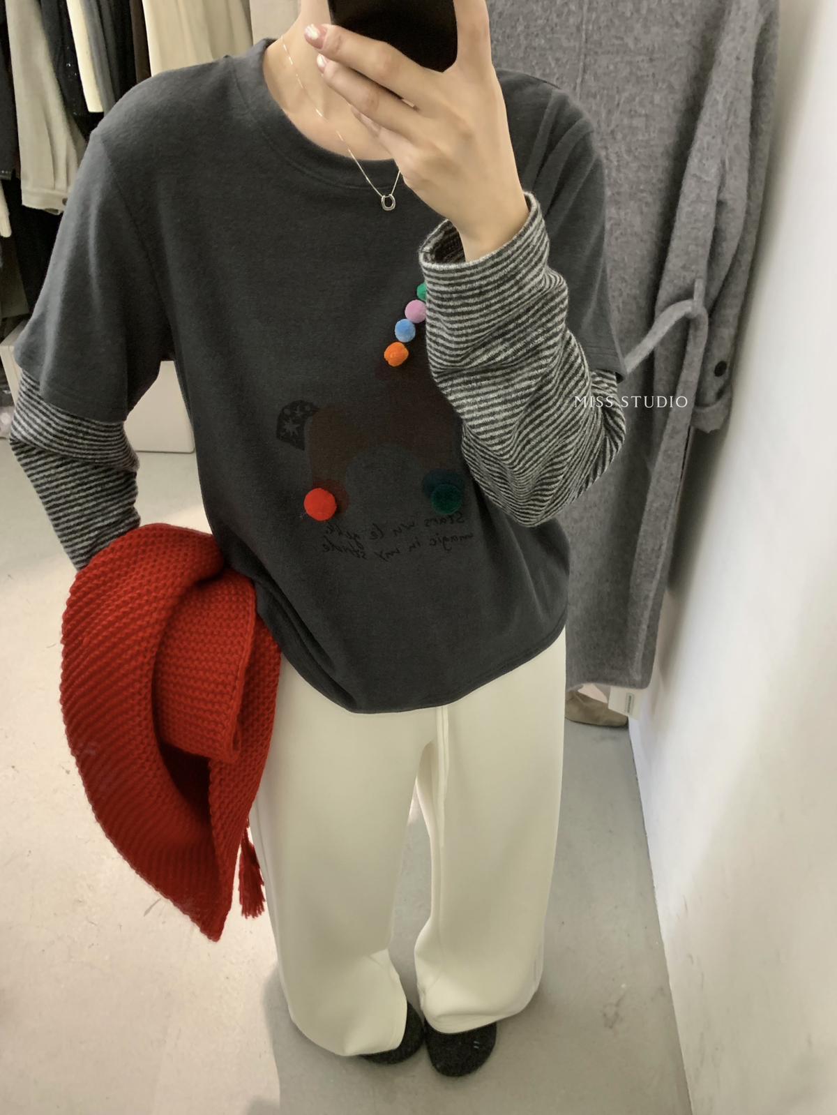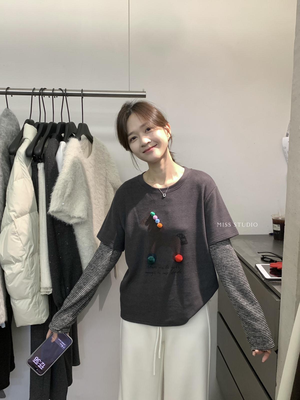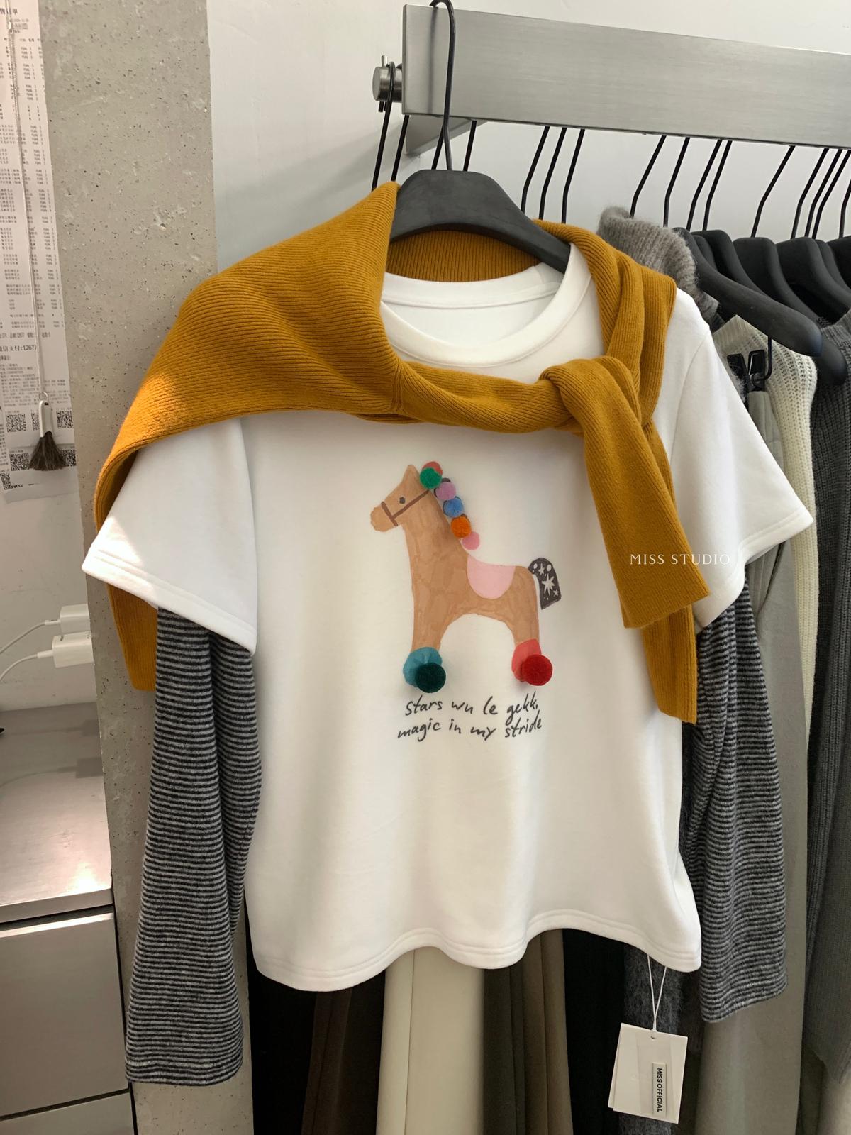 3. 【C8343】立體裝飾小馬拼接條紋磨毛加厚假兩件長袖T恤