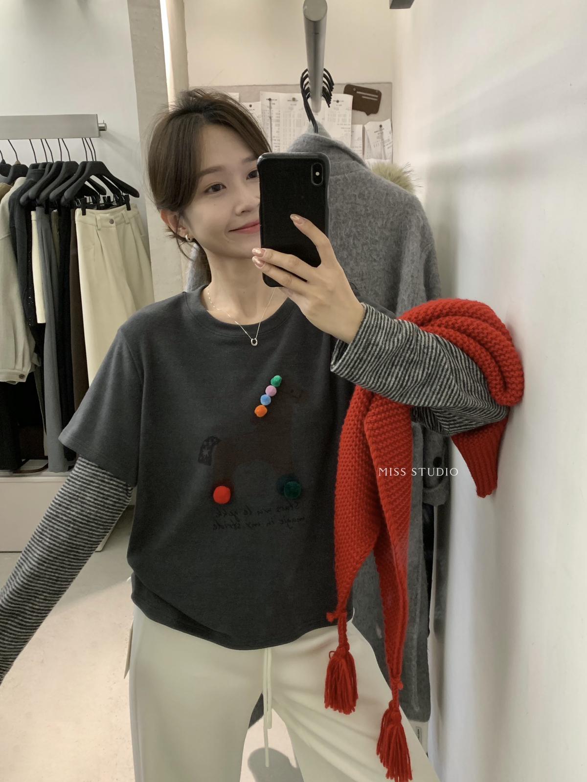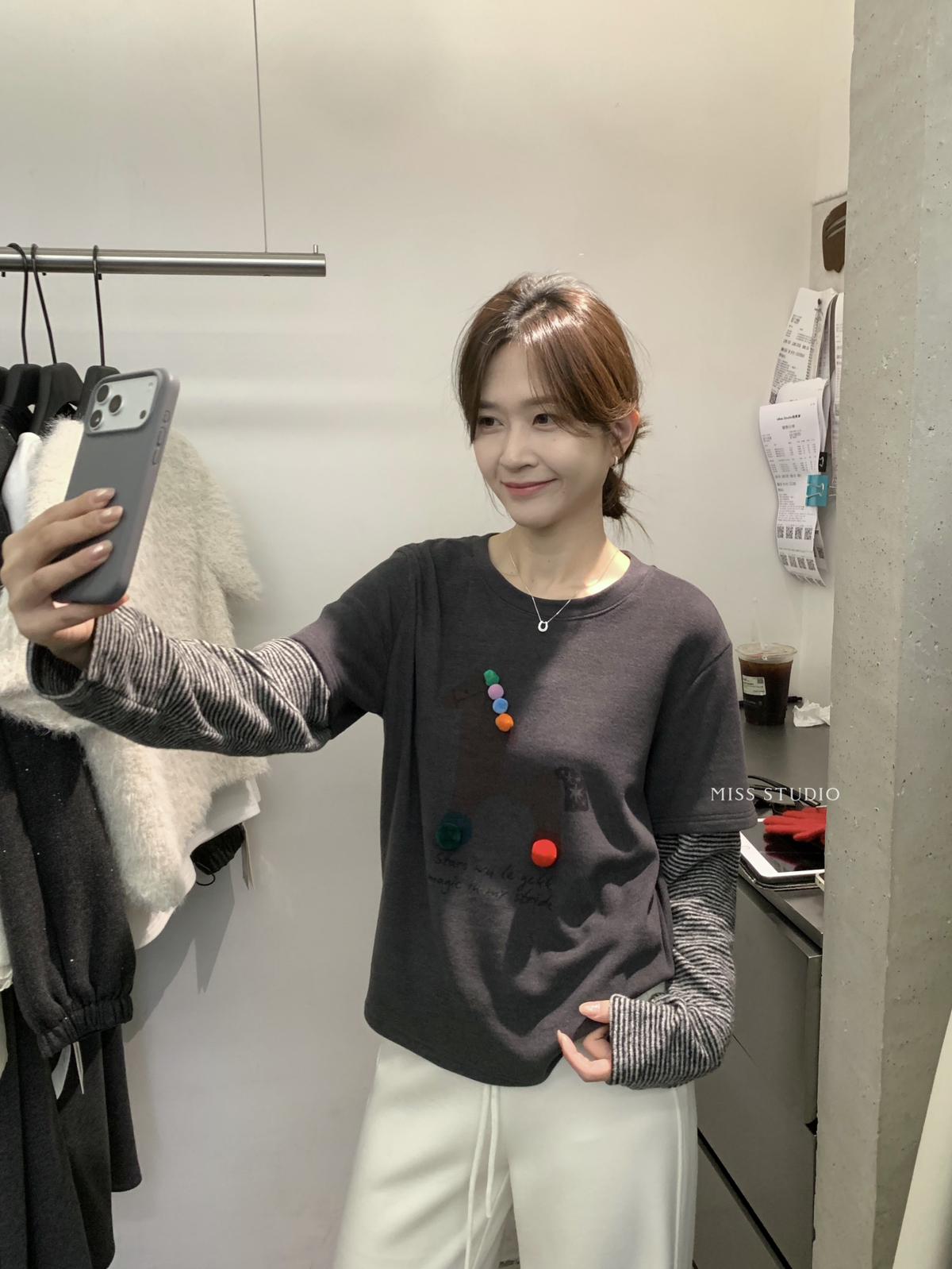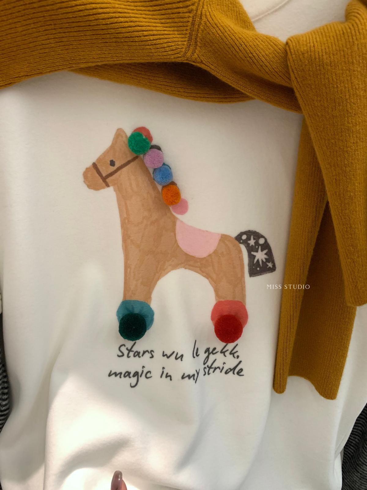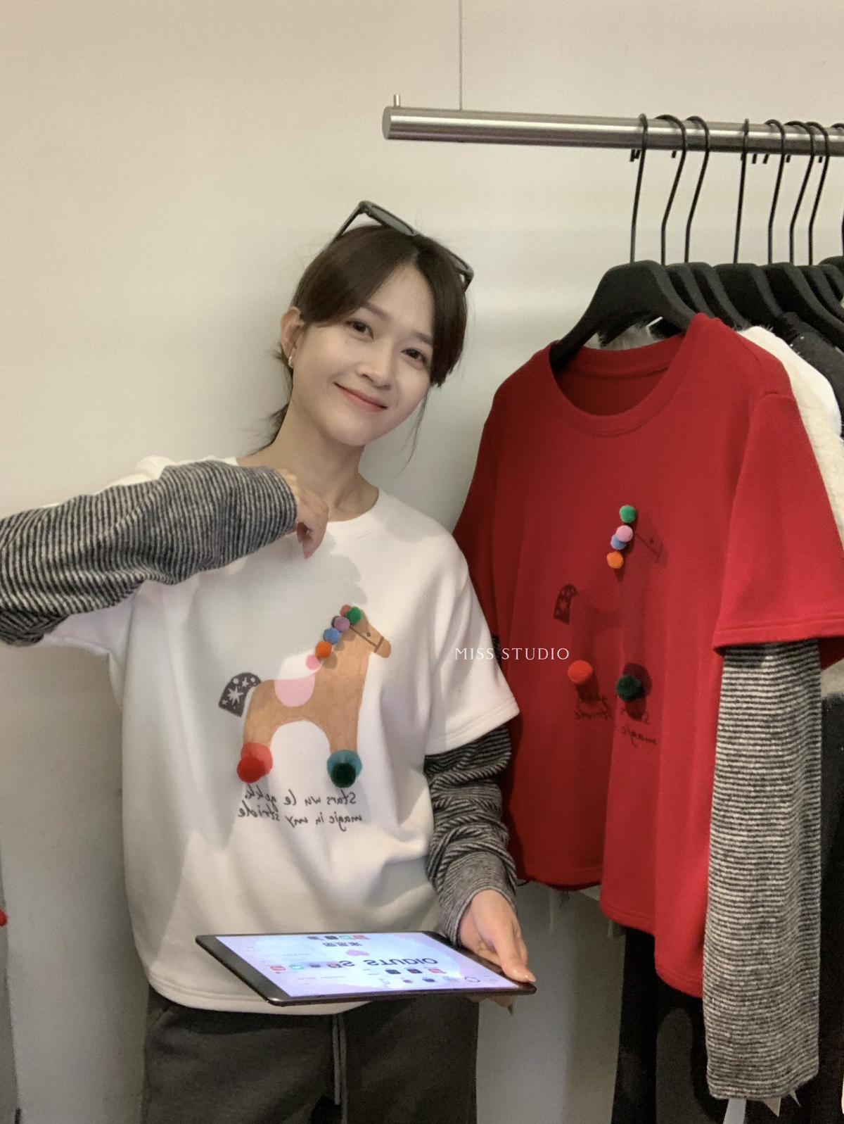 3. 【C8343】立體裝飾小馬拼接條紋磨毛加厚假兩件長袖T恤