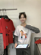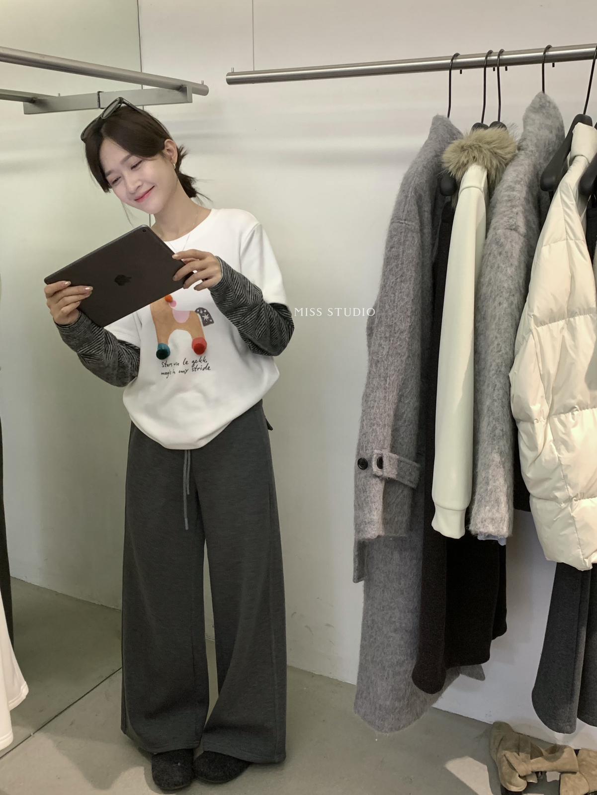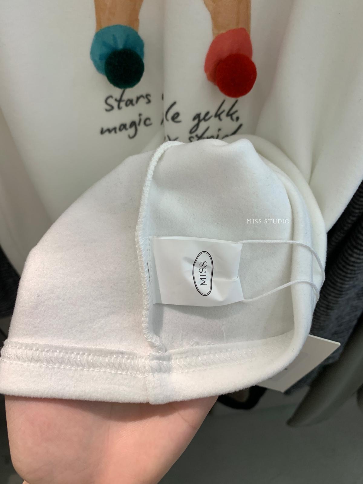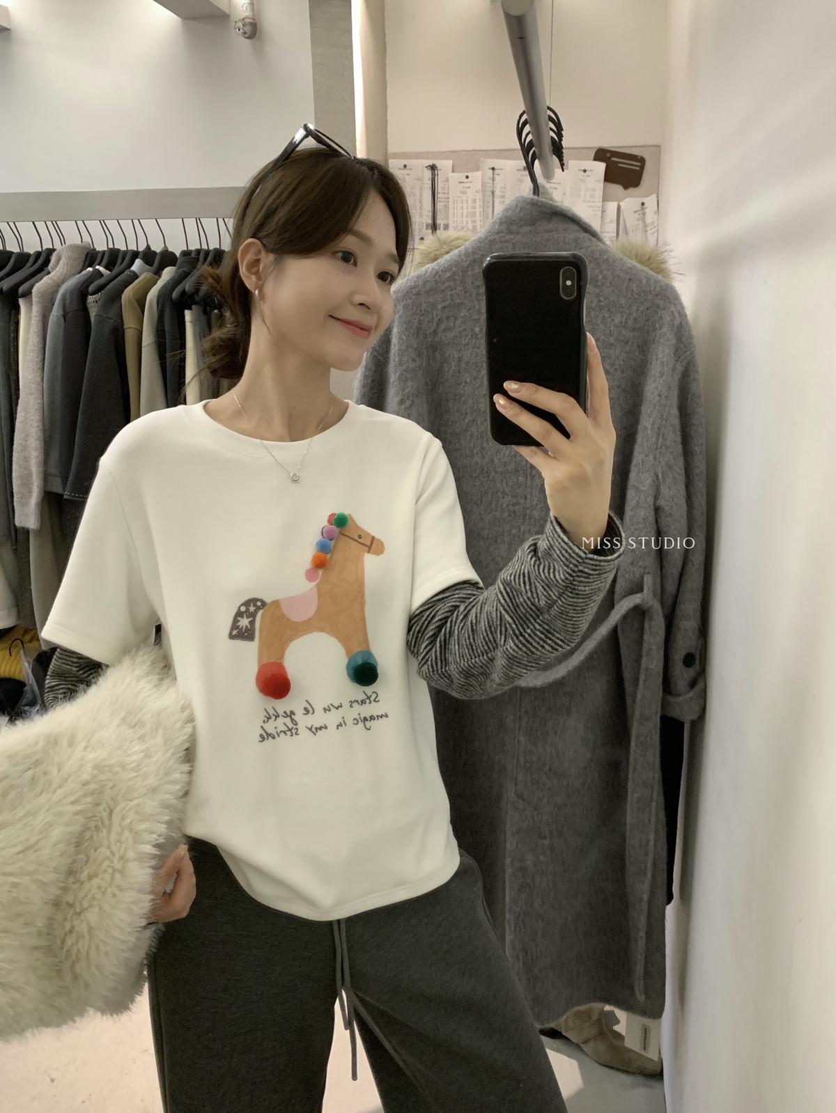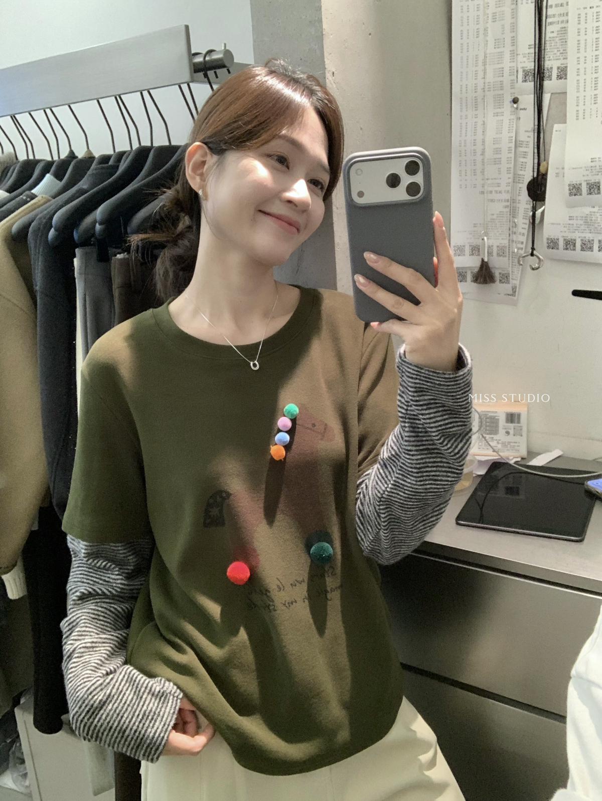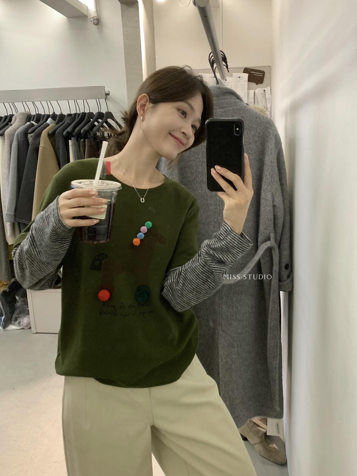 3. 【C8343】立體裝飾小馬拼接條紋磨毛加厚假兩件長袖T恤