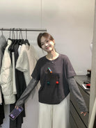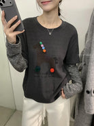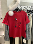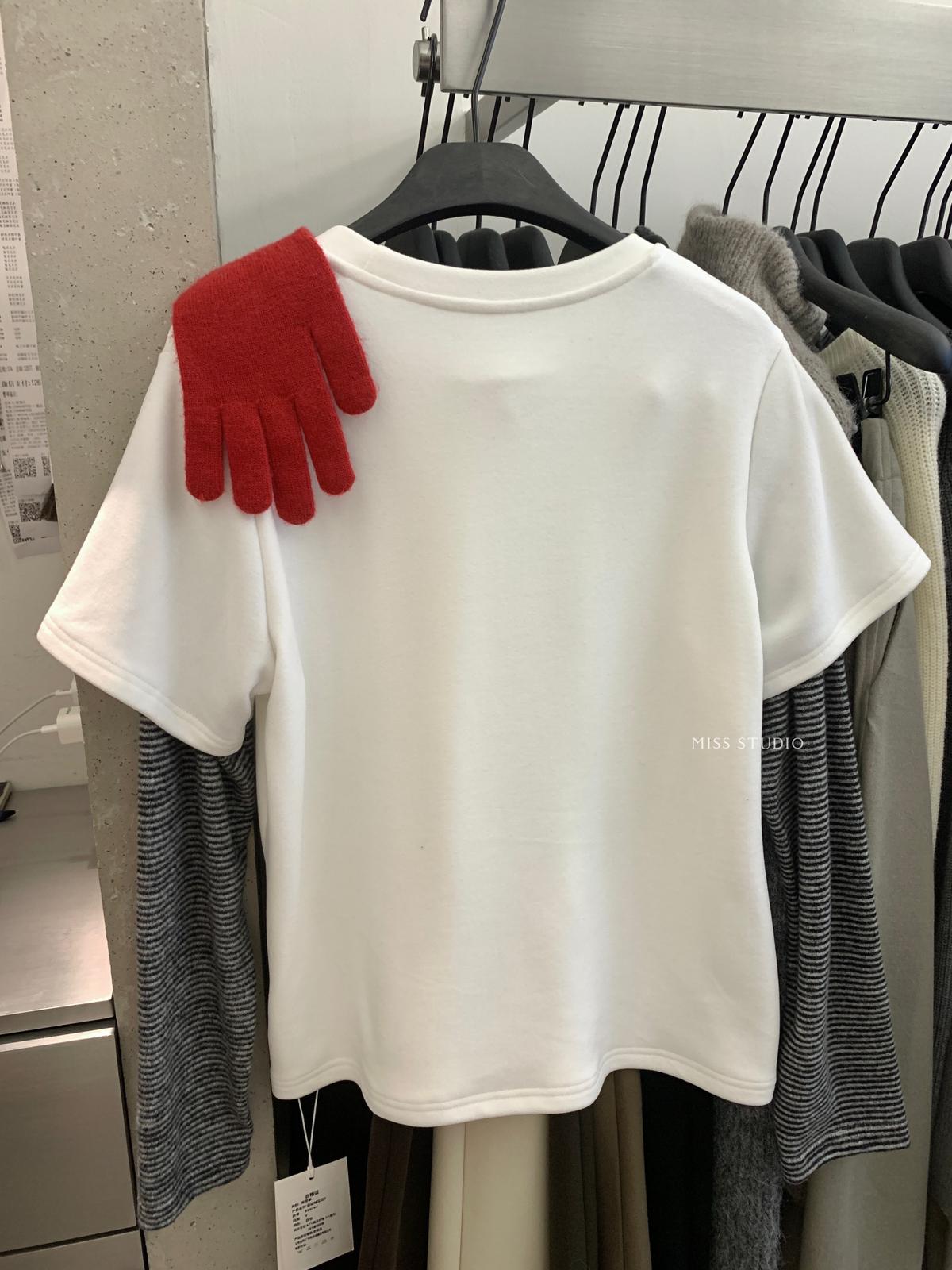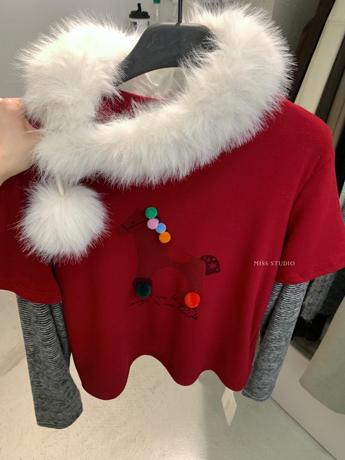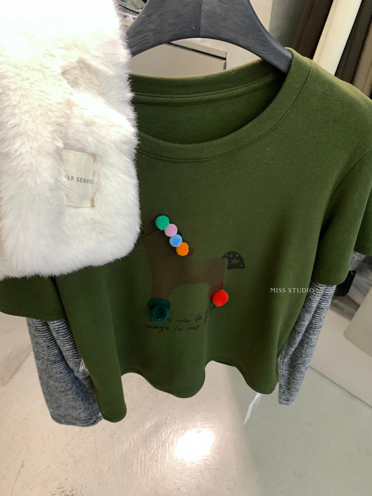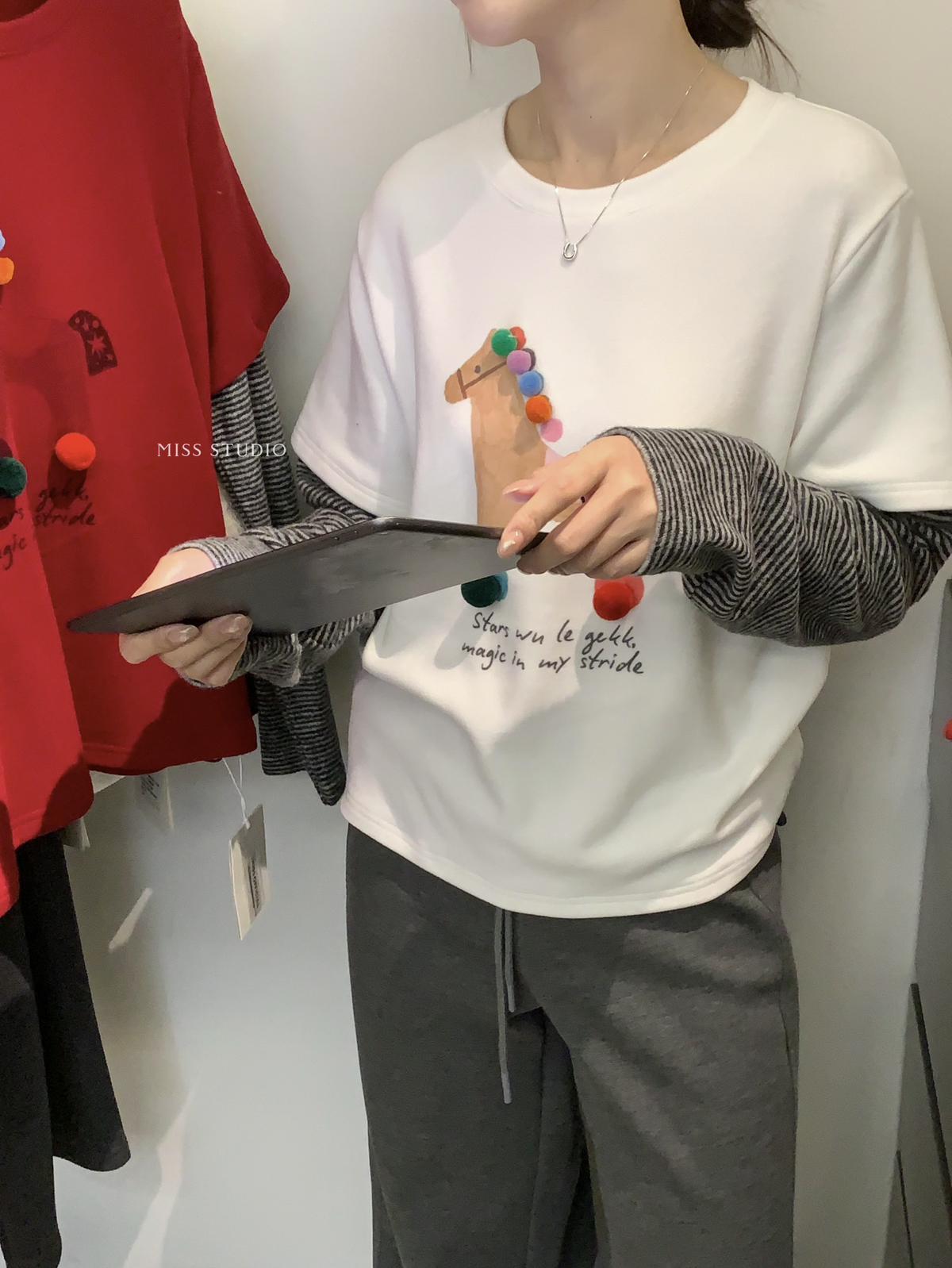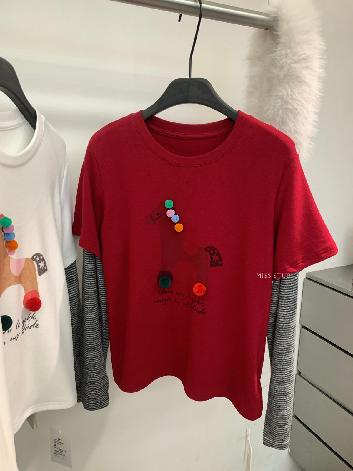 【C8343】立體裝飾小馬拼接條紋磨毛加厚假兩件長袖T恤