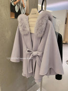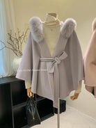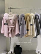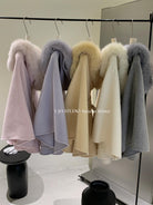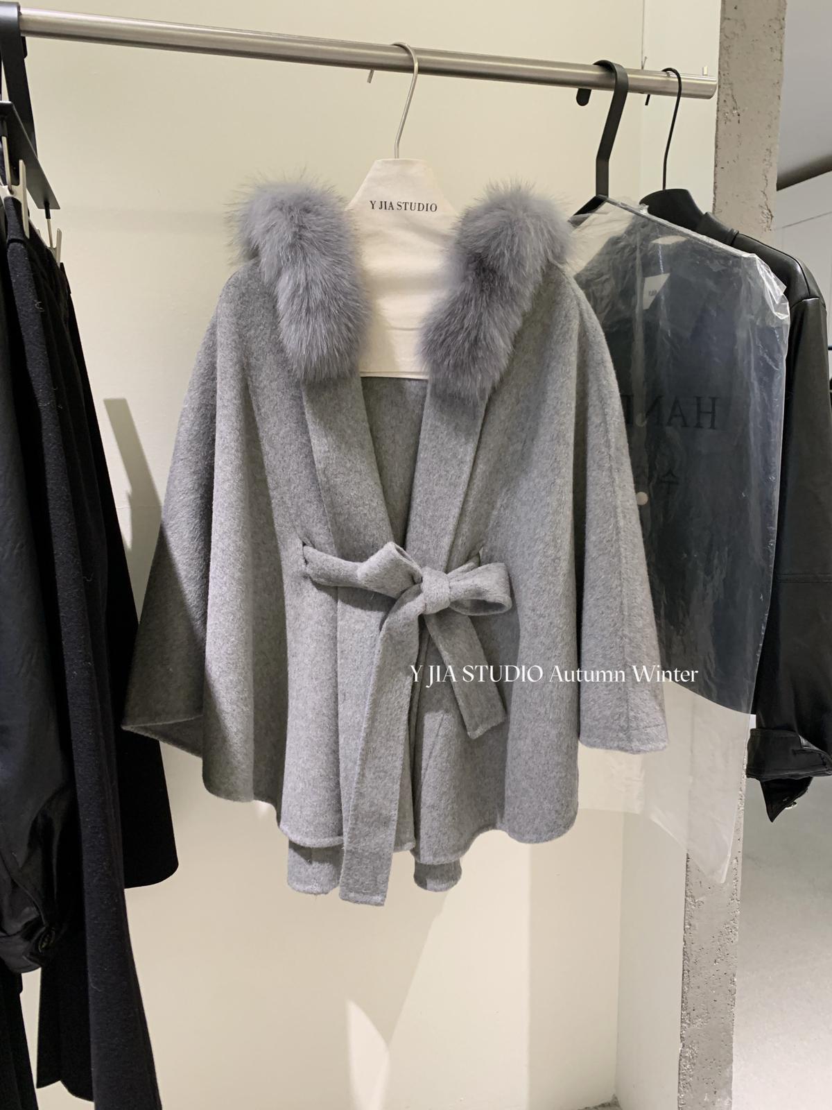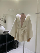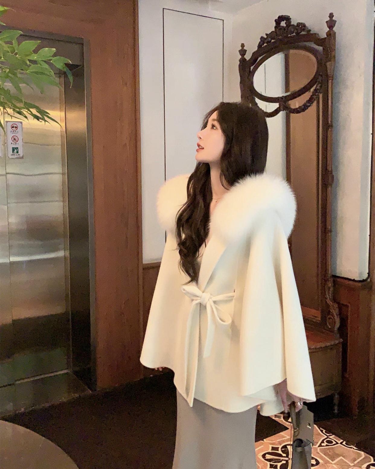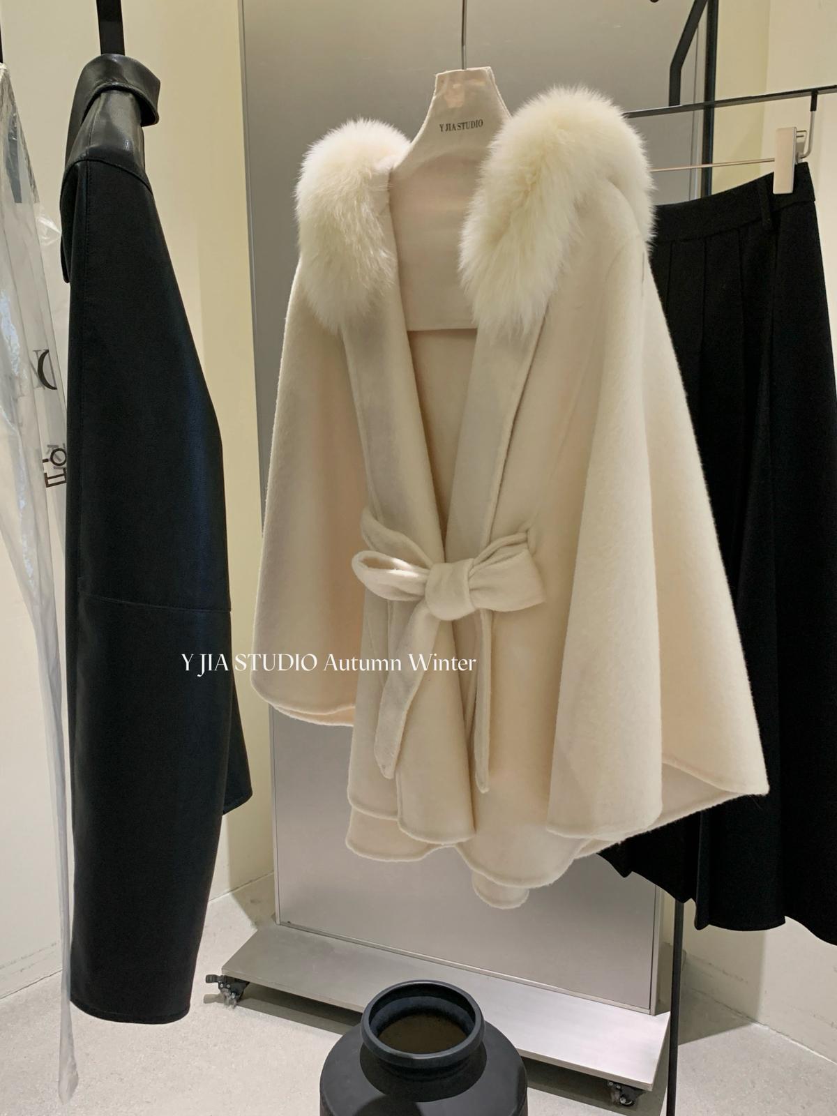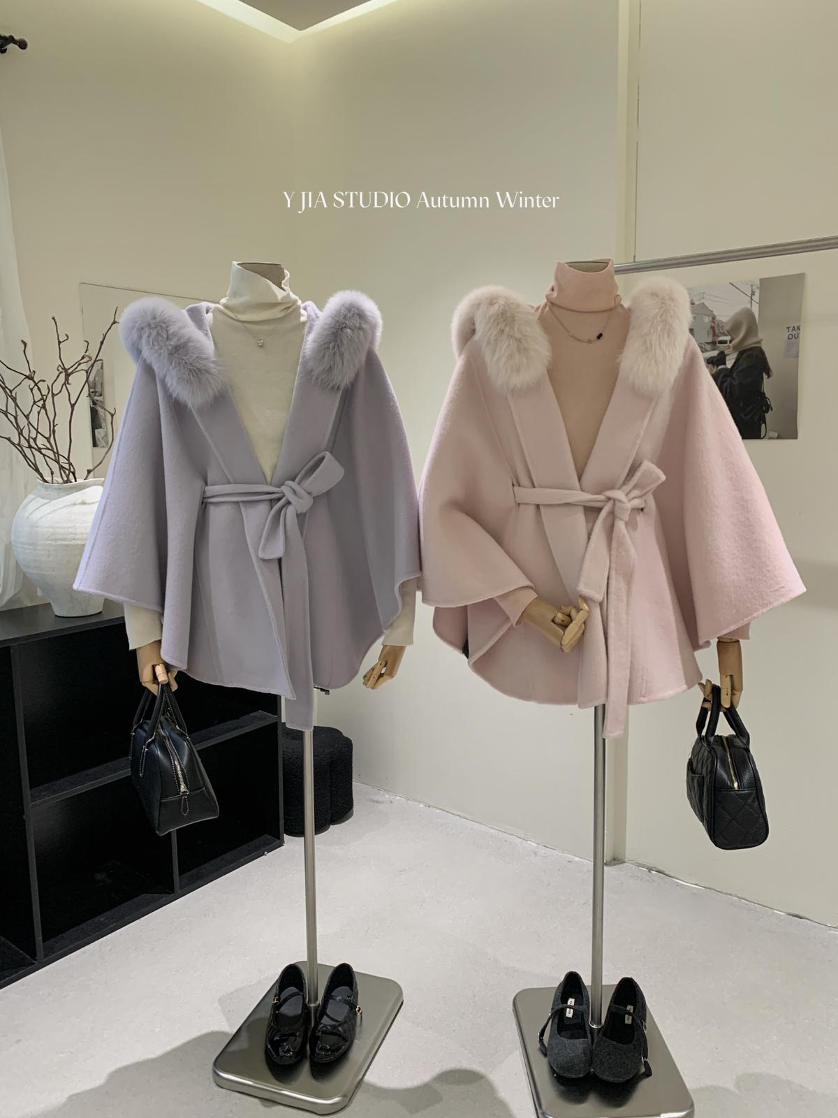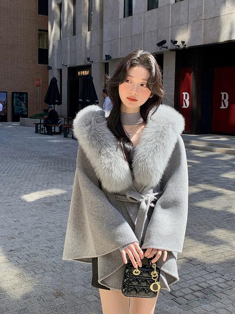 3. 【C8359】京都千金重磅狐狸毛大毛領斗篷外套雙面羊毛呢子大衣羊毛外套(配毛領狐狸毛仿毛可拆卸,腰繩)(含70%羊毛)