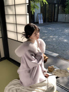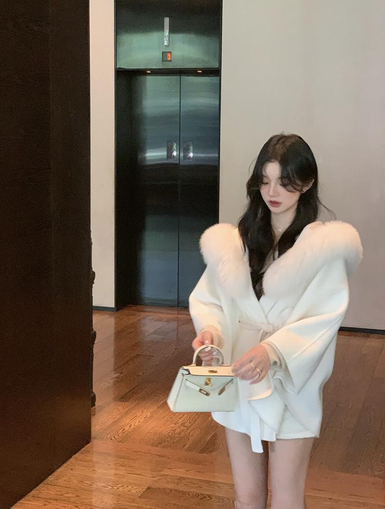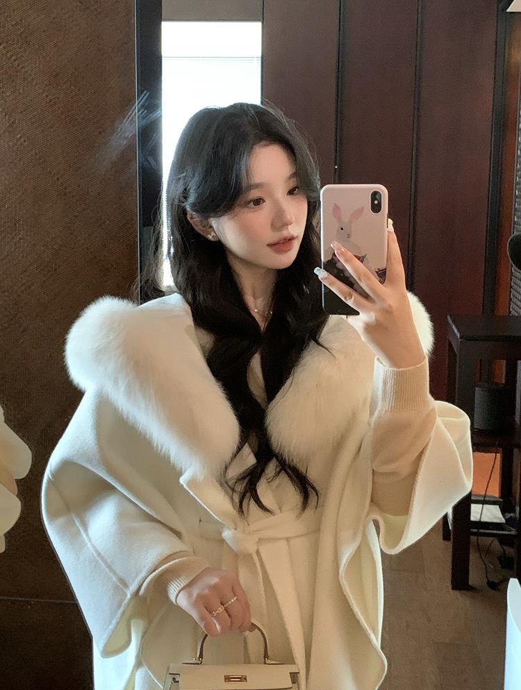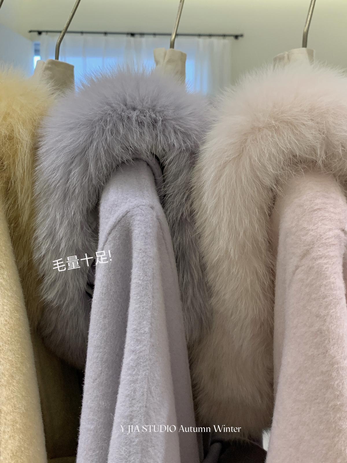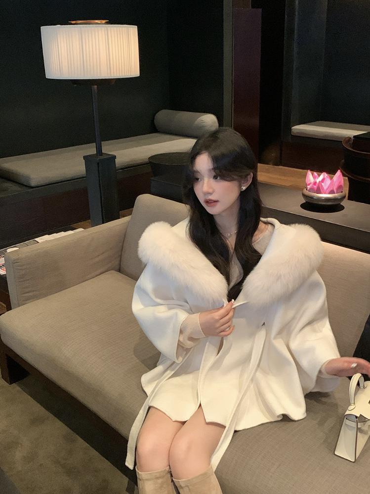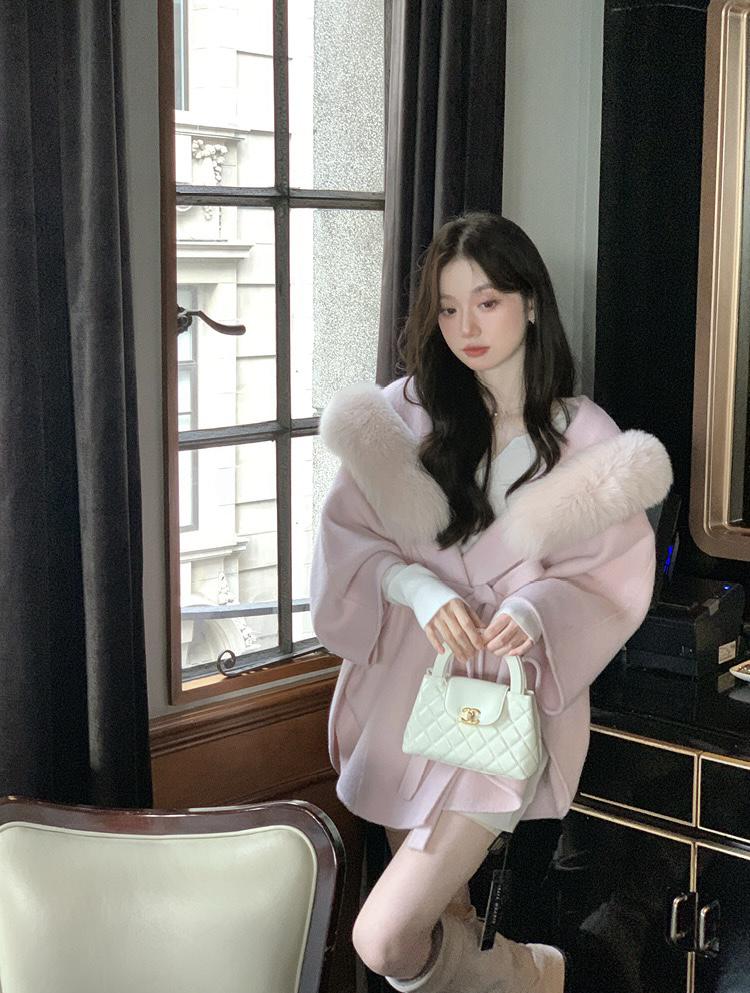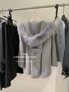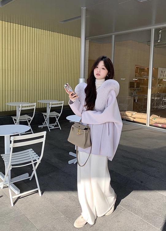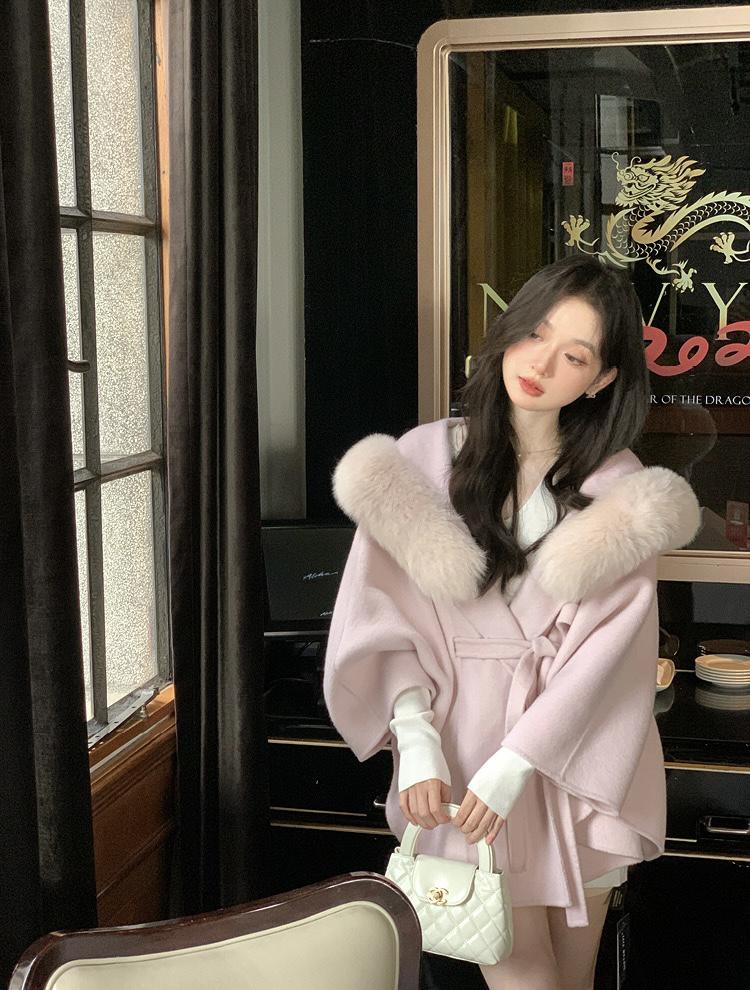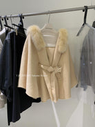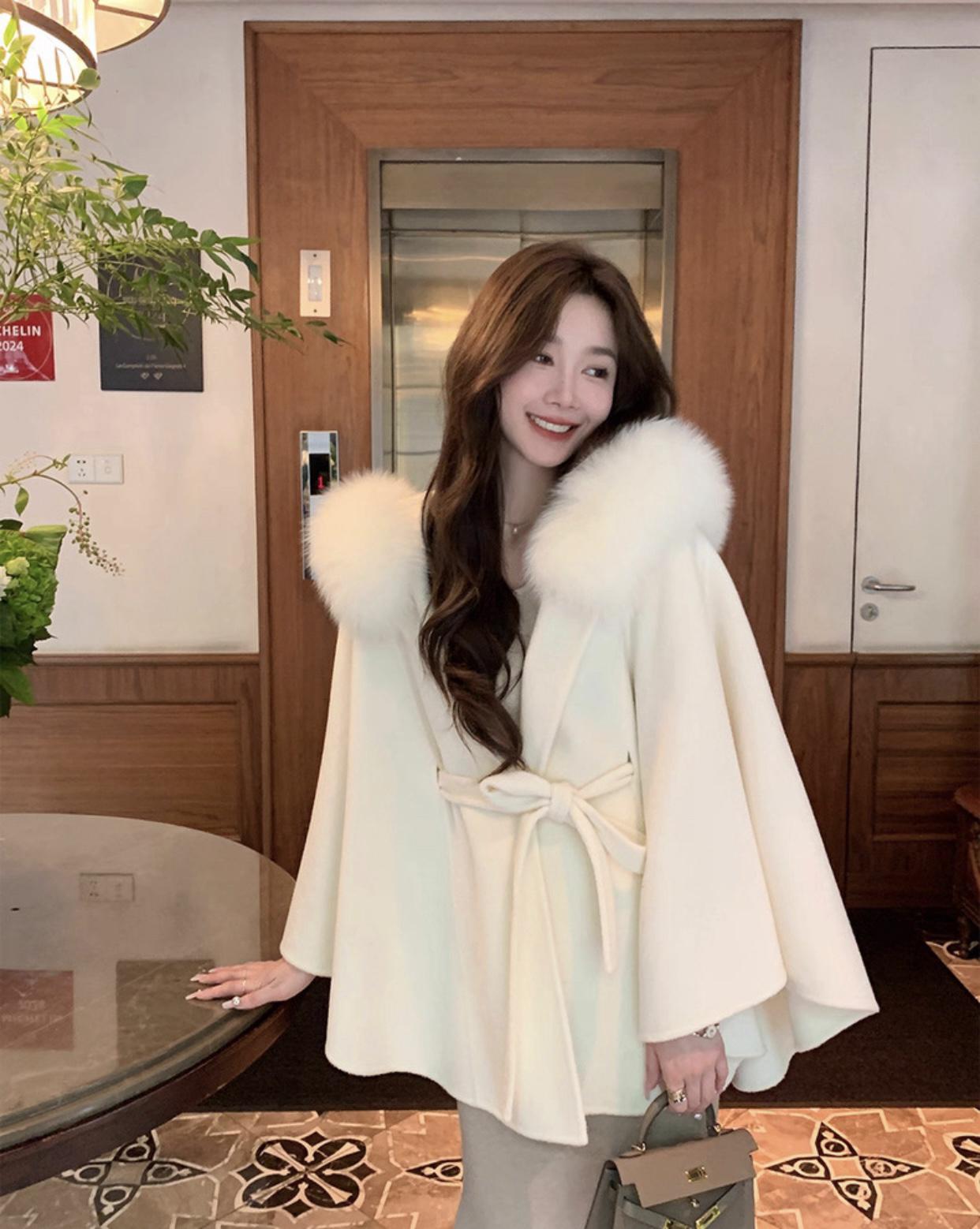 3. 【C8359】京都千金重磅狐狸毛大毛領斗篷外套雙面羊毛呢子大衣羊毛外套(配毛領狐狸毛仿毛可拆卸,腰繩)(含70%羊毛)