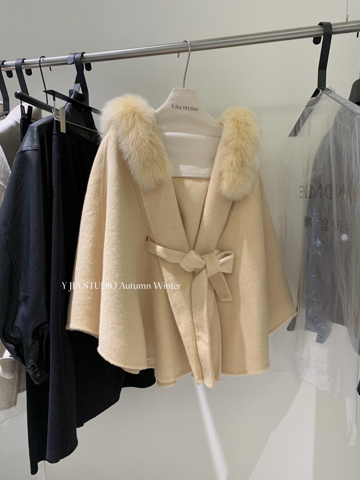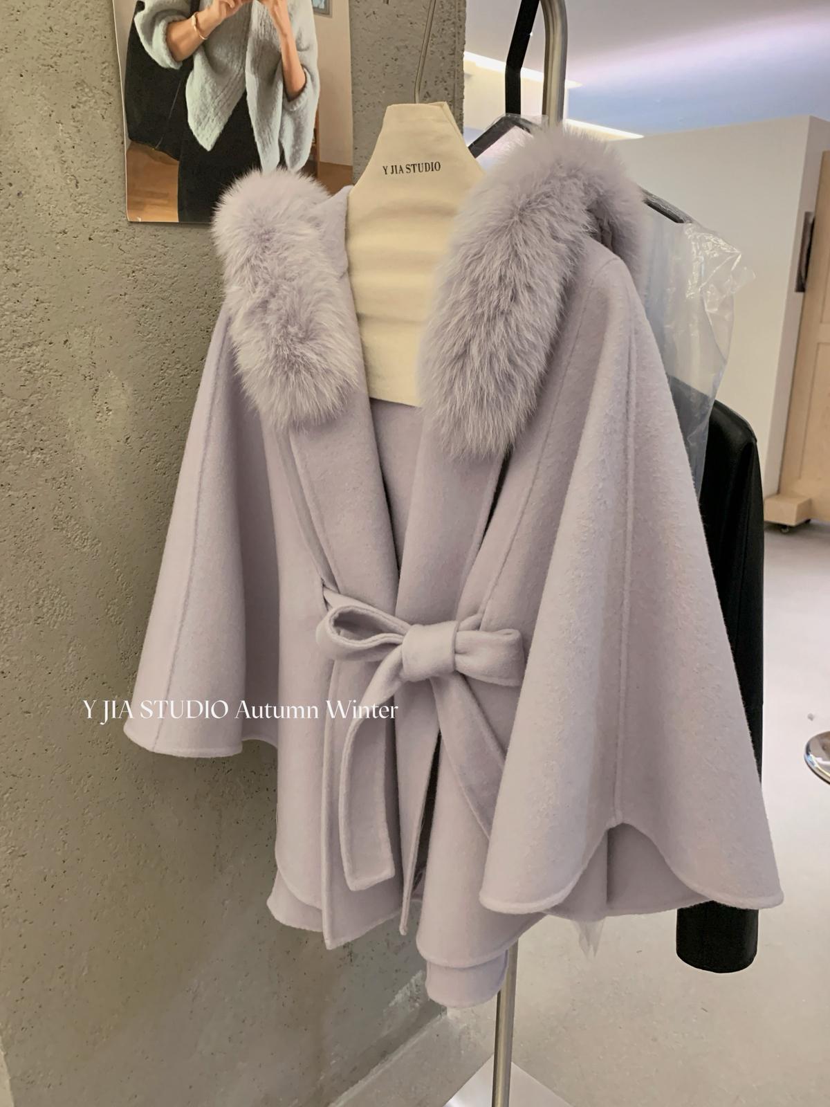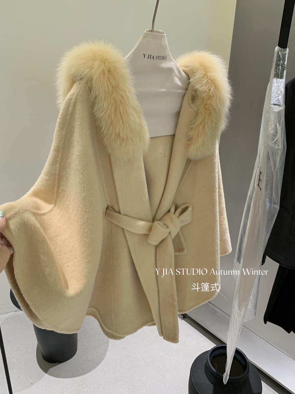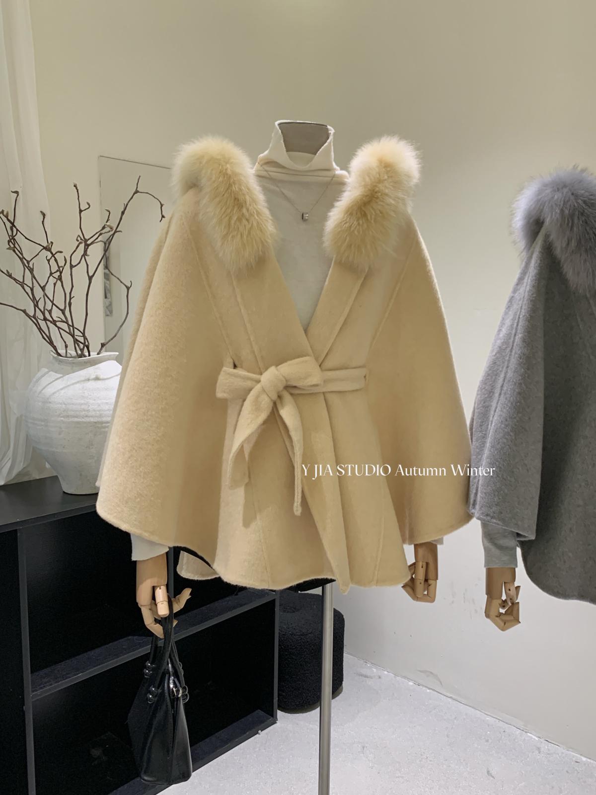 【C8359】京都千金重磅狐狸毛大毛領斗篷外套雙面羊毛呢子大衣羊毛外套(配毛領狐狸毛仿毛可拆卸,腰繩)(含70%羊毛)