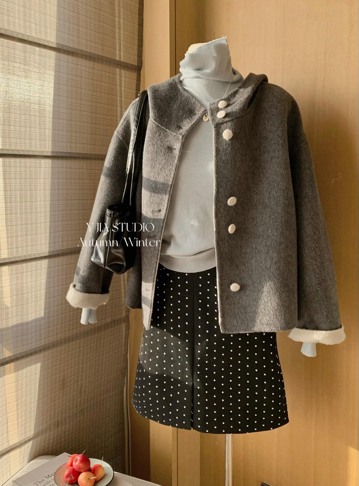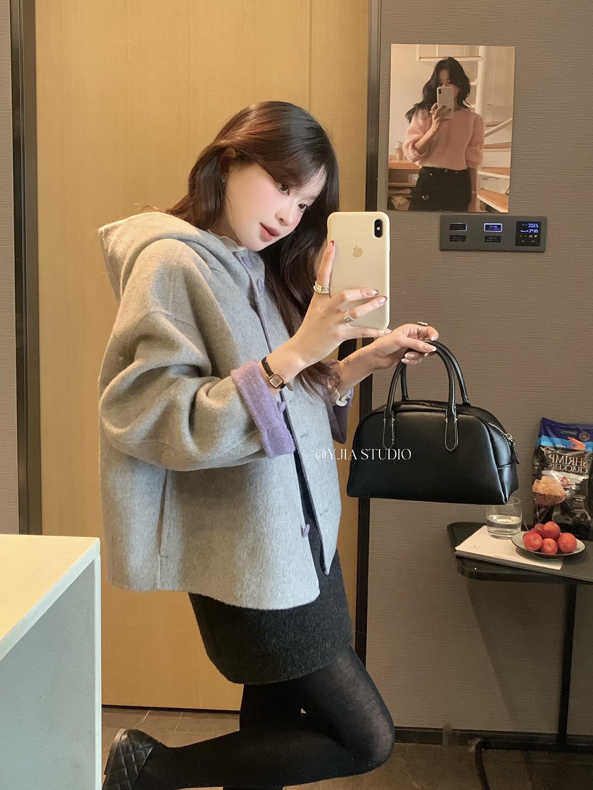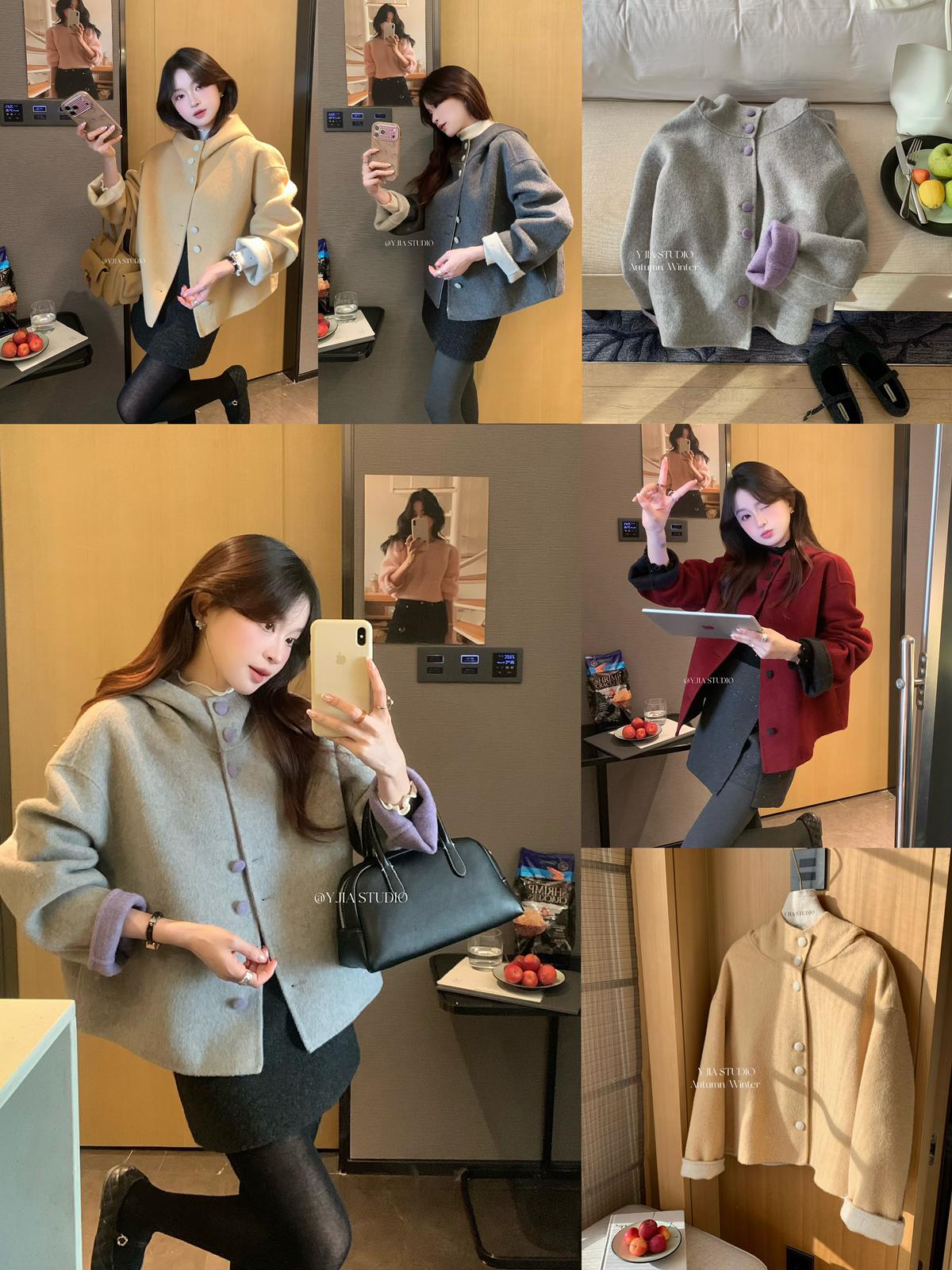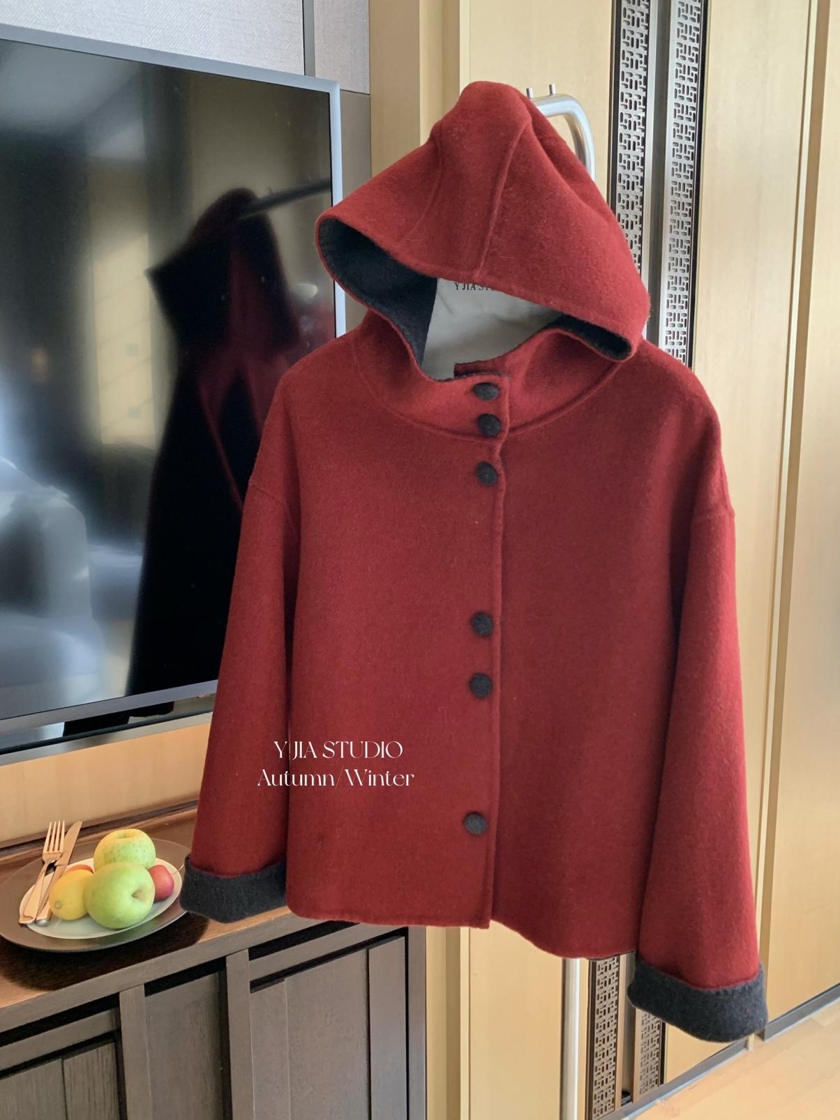 【C8361】撞色雙面呢連帽羊毛短外套羊毛外套(含70.2%羊毛)