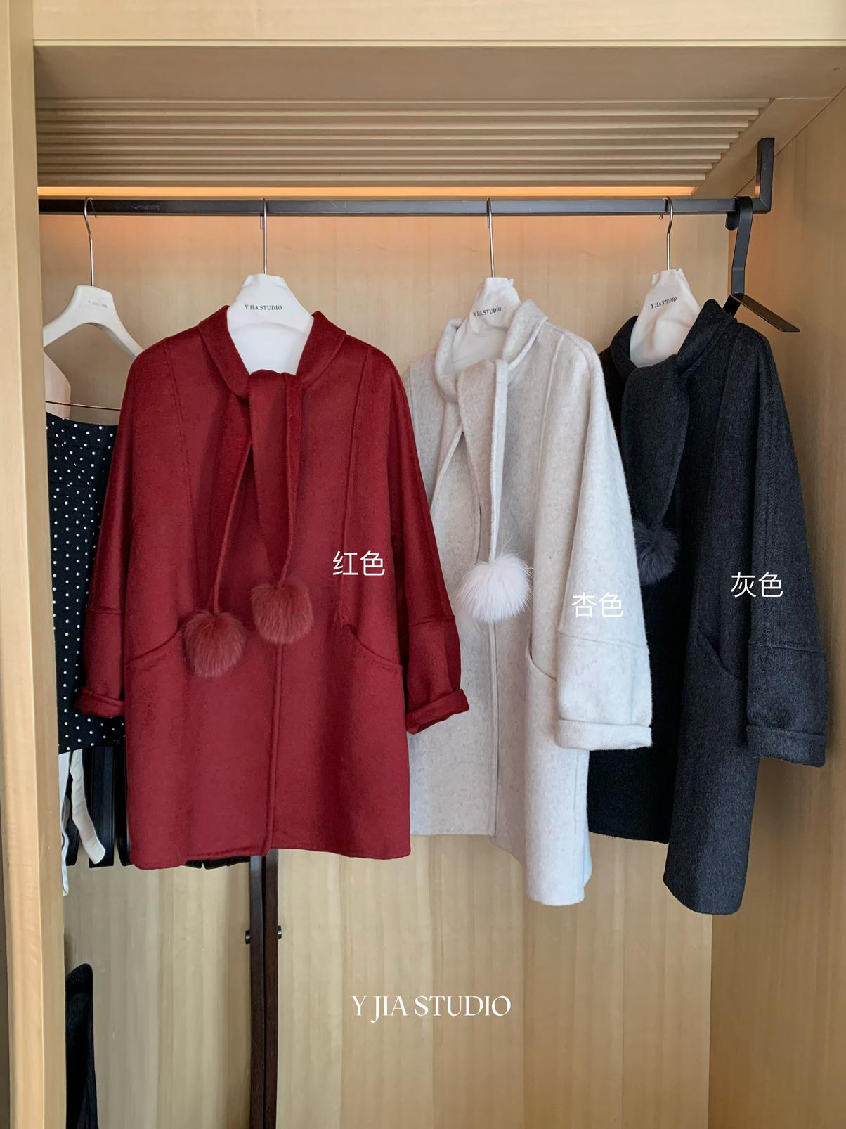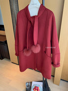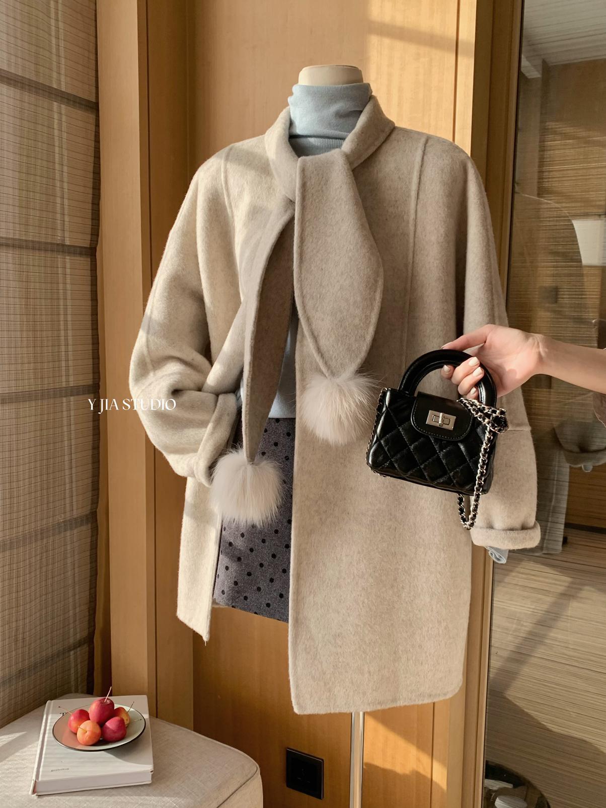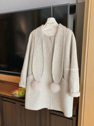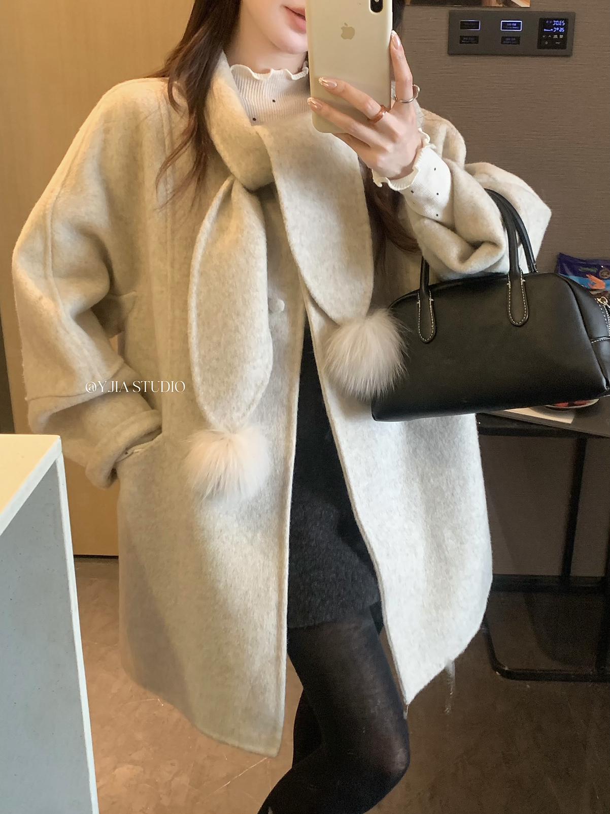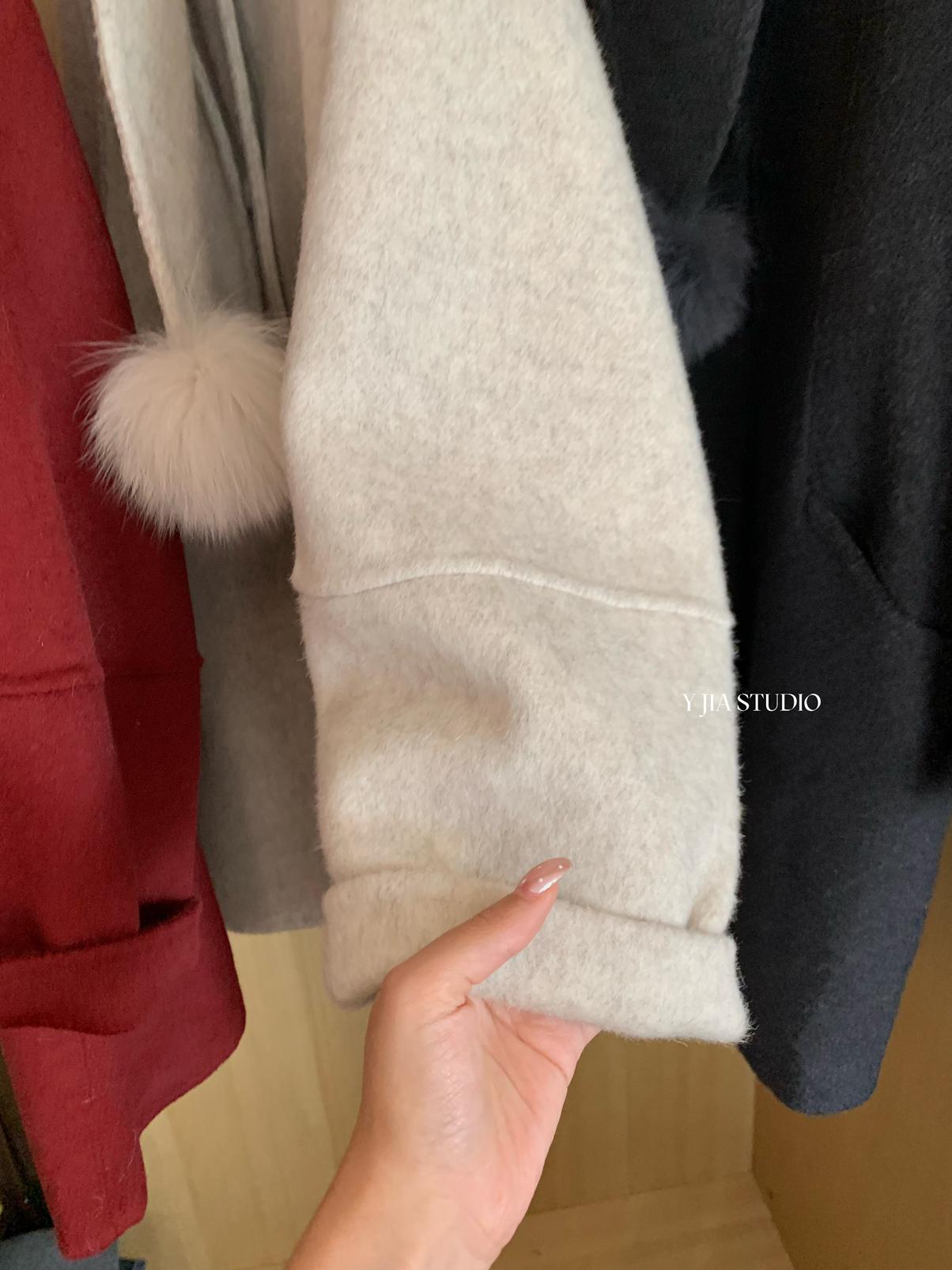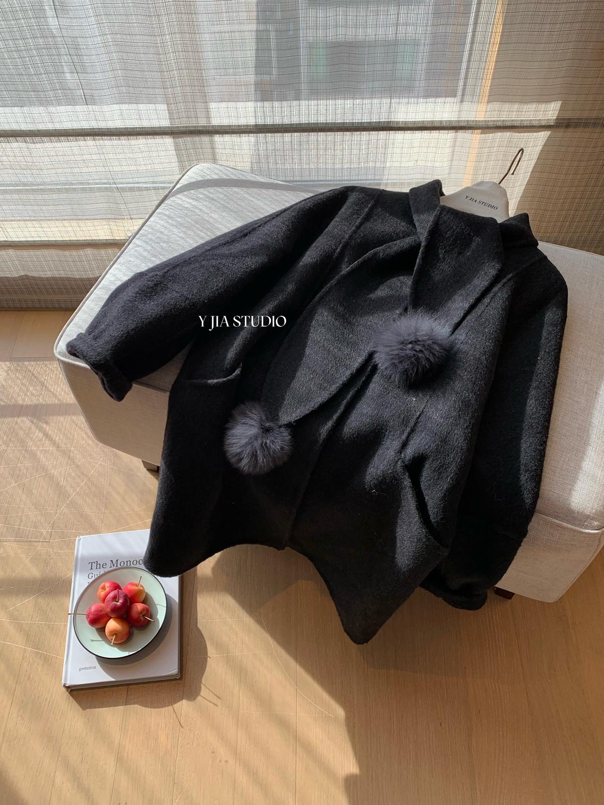 【C8363】減齡可愛兔耳毛球圍脖雙面呢羊毛外套(含100%澳毛)