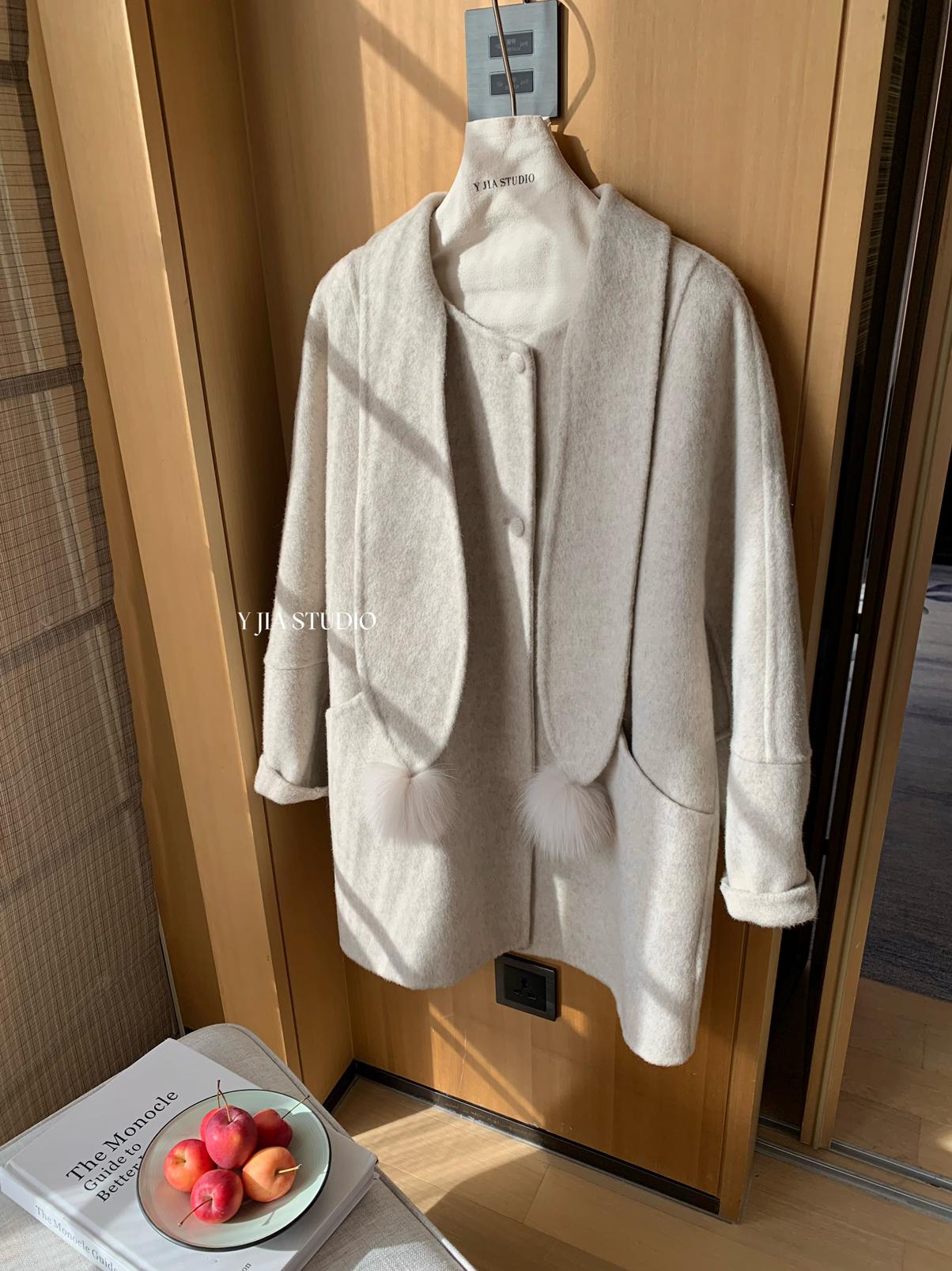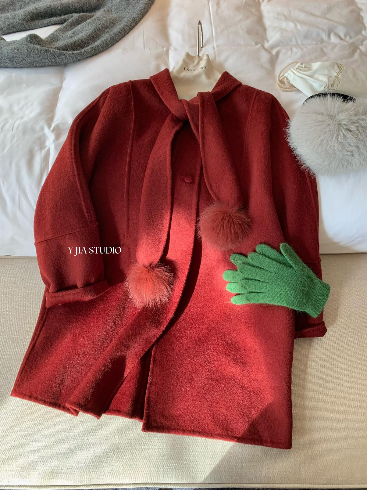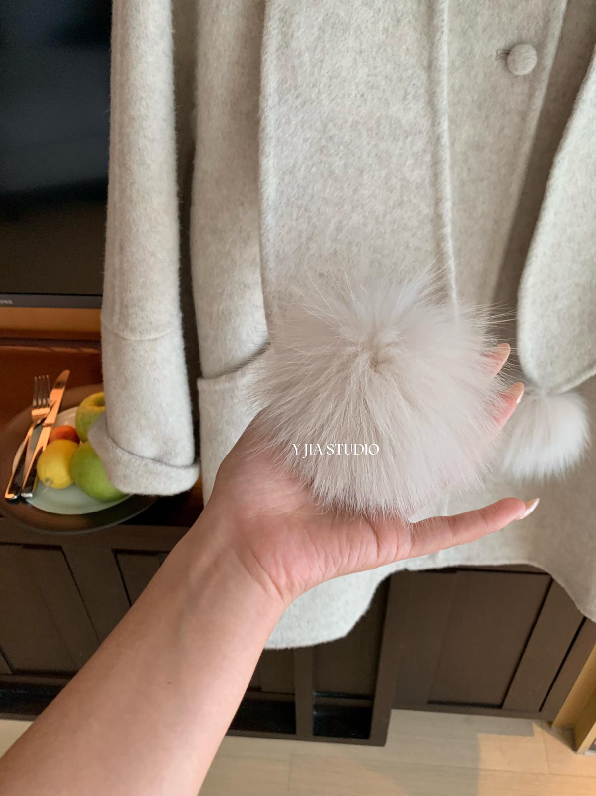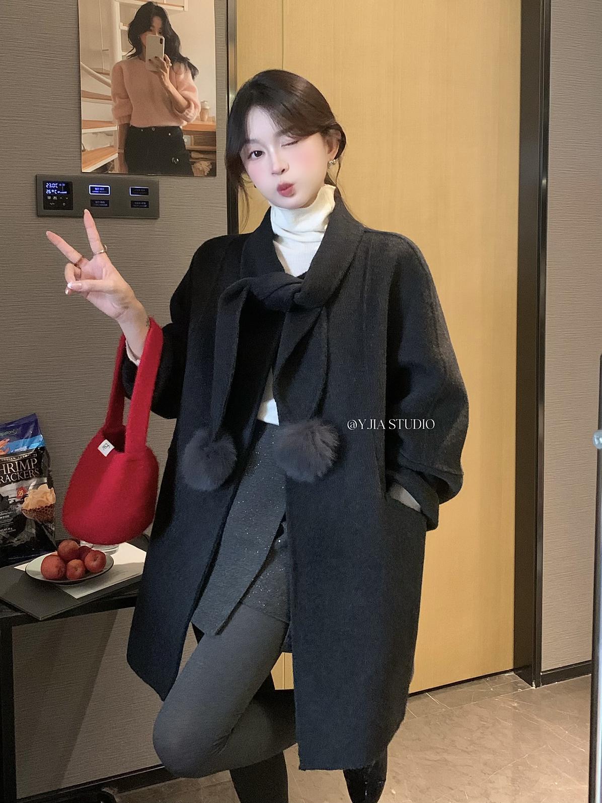 【C8363】減齡可愛兔耳毛球圍脖雙面呢羊毛外套(含100%澳毛)