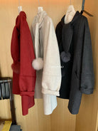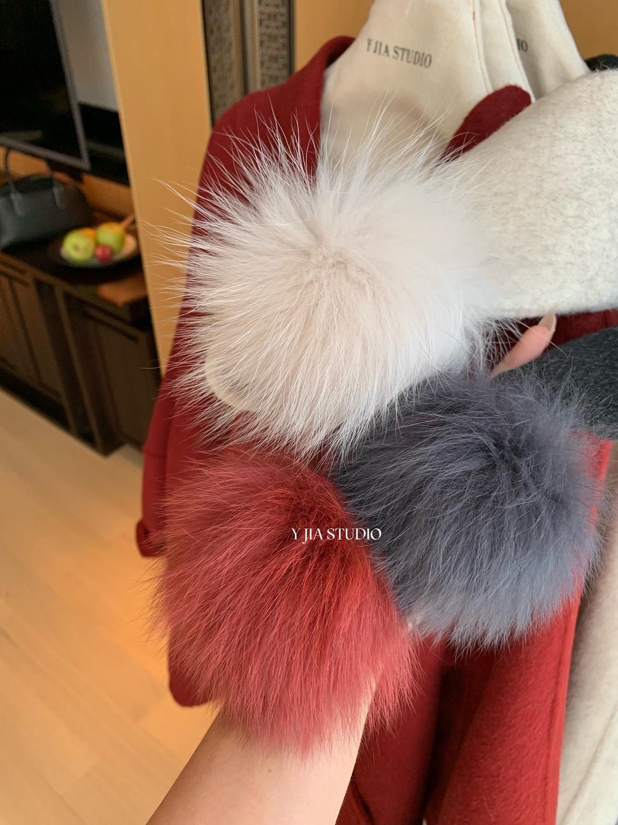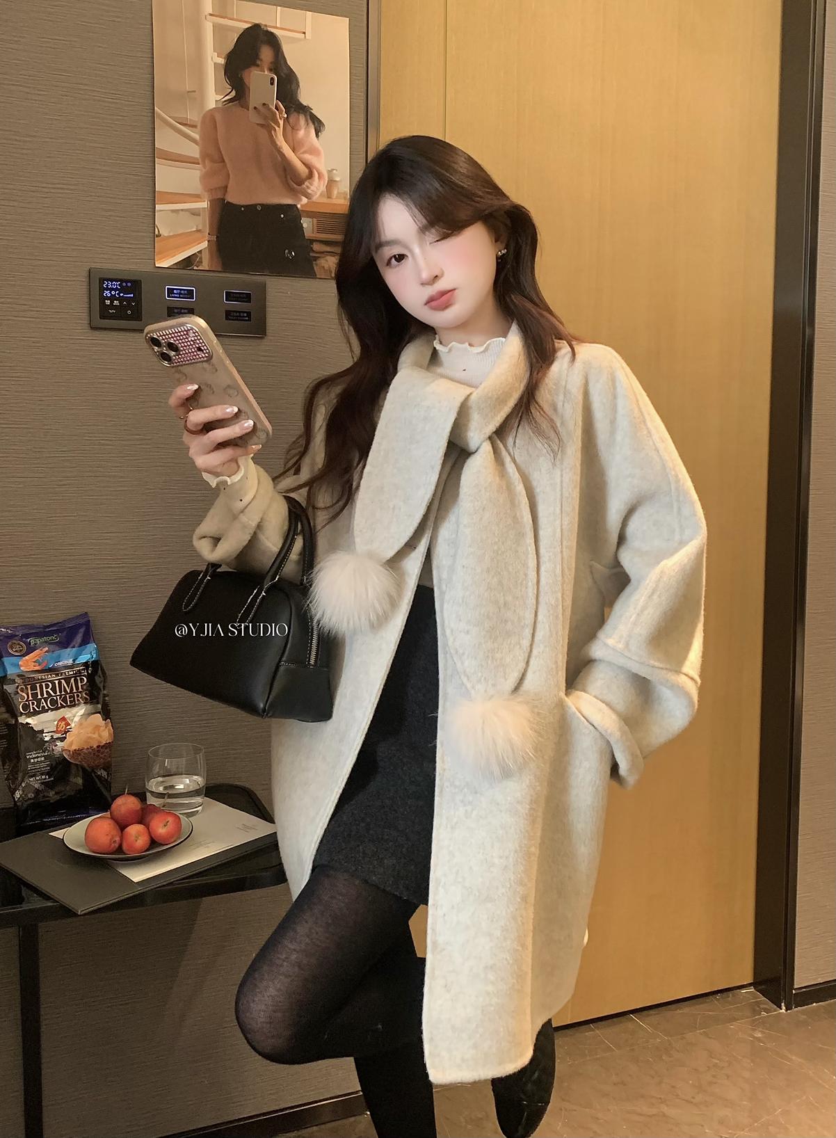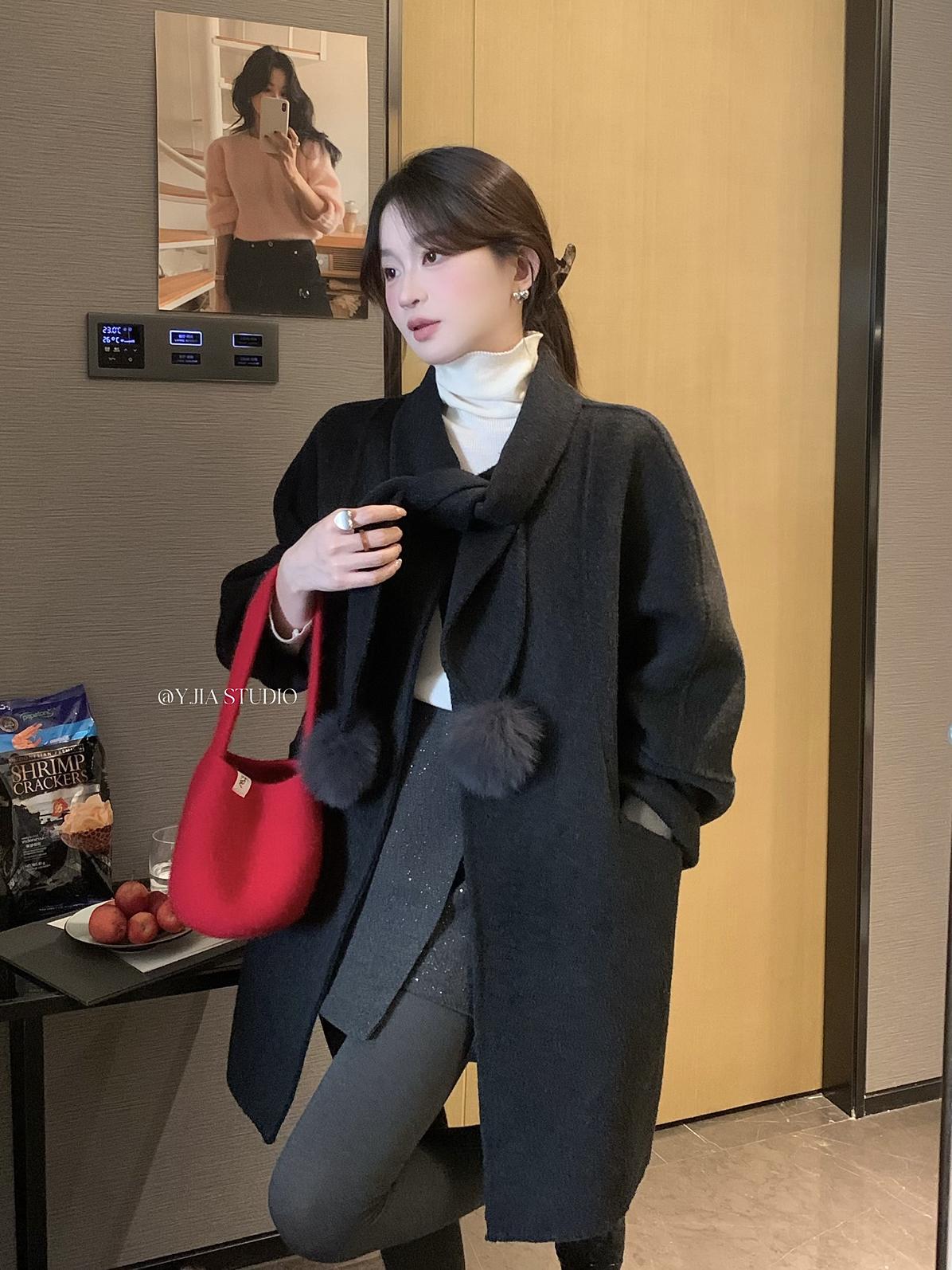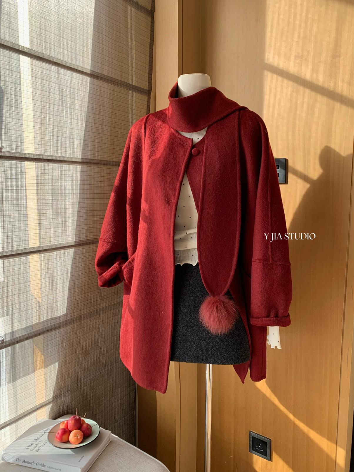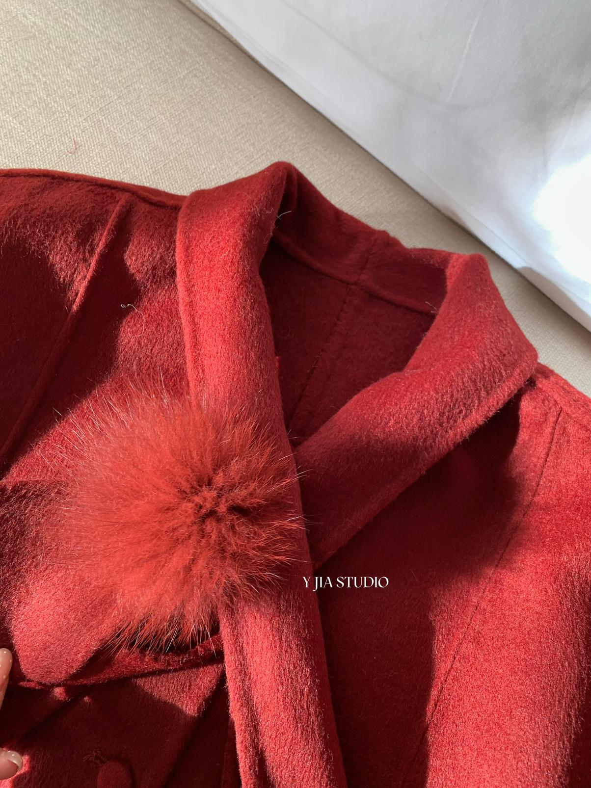 【C8363】減齡可愛兔耳毛球圍脖雙面呢羊毛外套(含100%澳毛)
