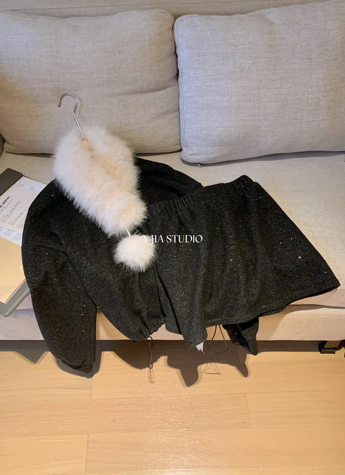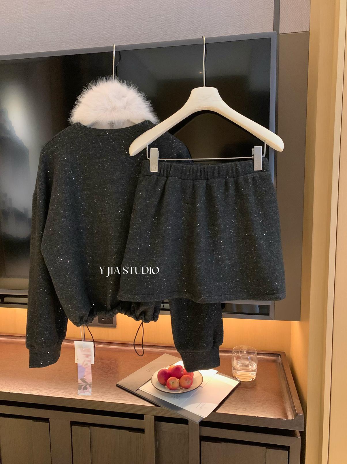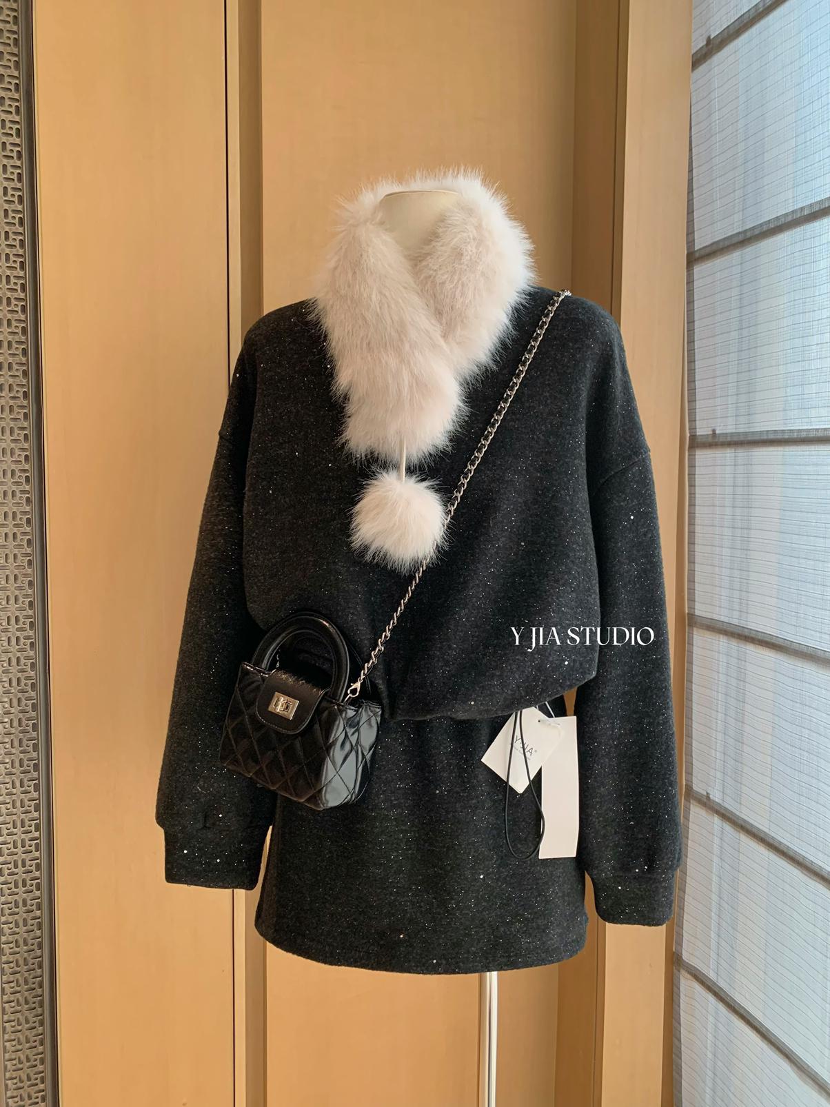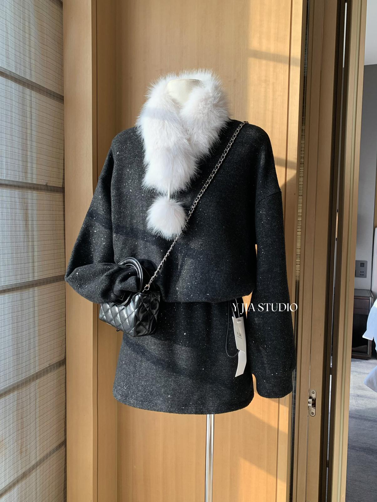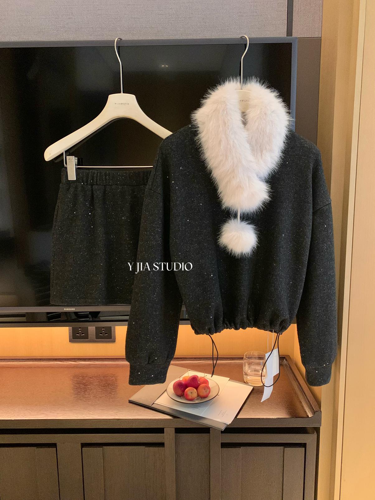 【C8365】亮閃閃套裝”高級感亮片圓領毛呢衛衣+高腰A字半身裙套裝(配可拆卸狐狸毛仿毛毛領)