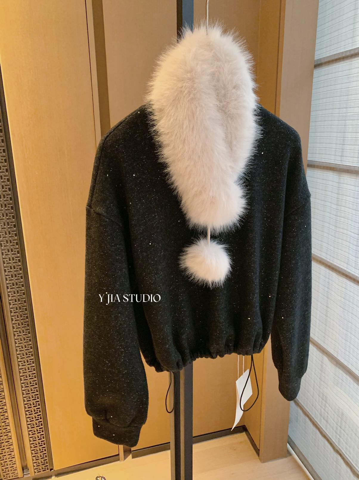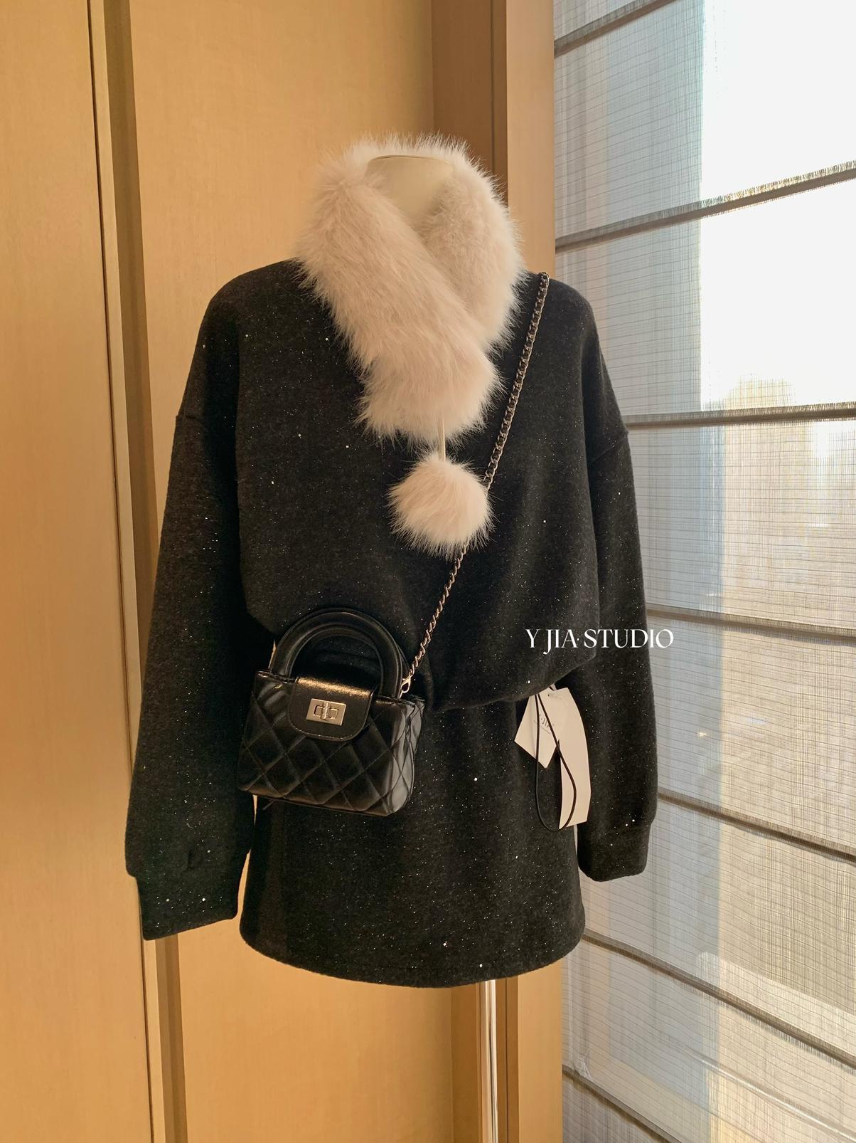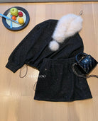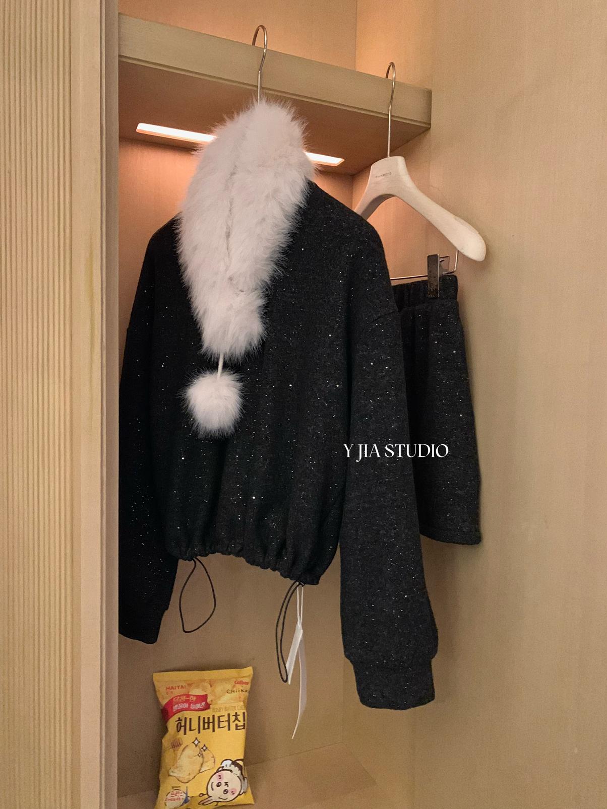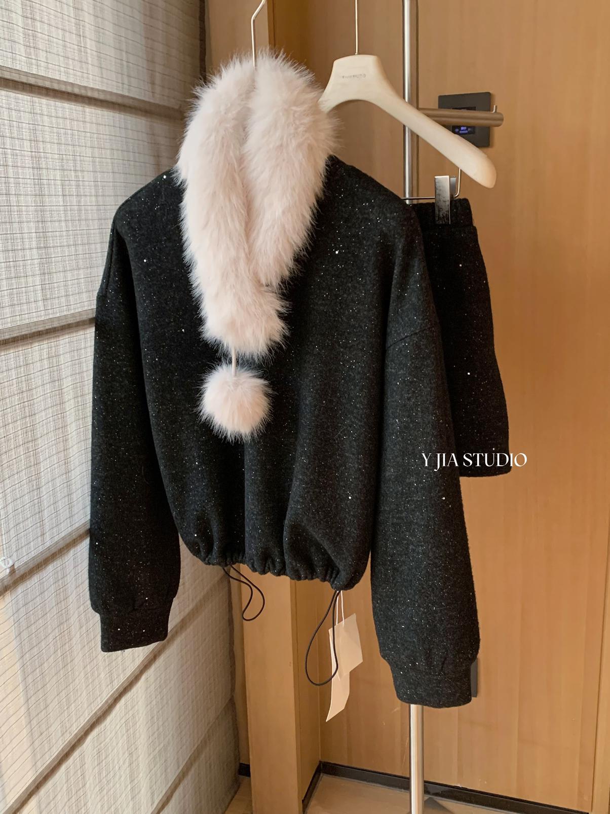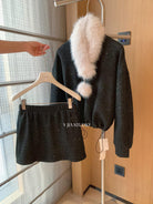 【C8365】亮閃閃套裝”高級感亮片圓領毛呢衛衣+高腰A字半身裙套裝(配可拆卸狐狸毛仿毛毛領)
