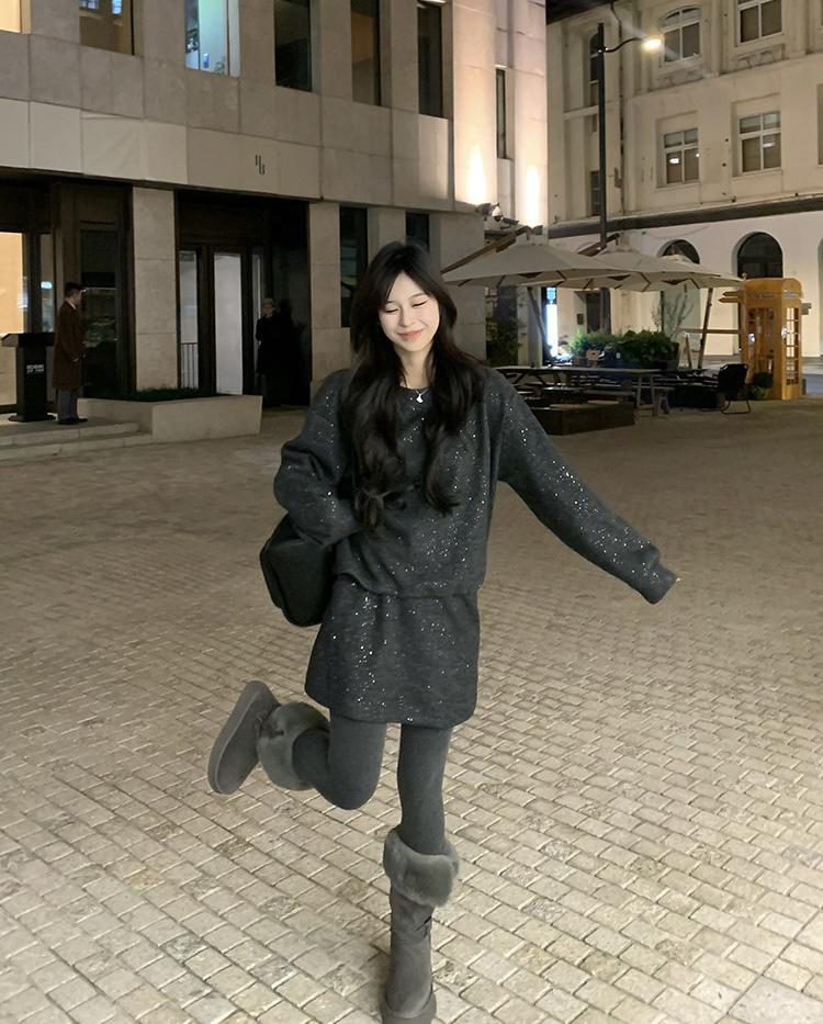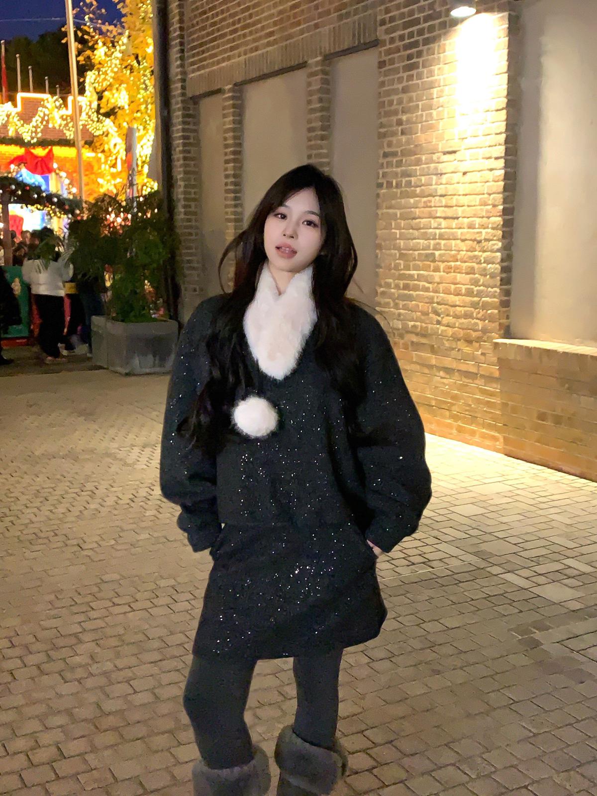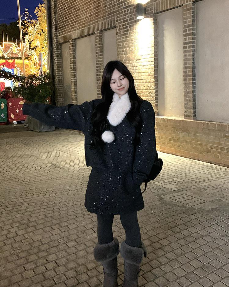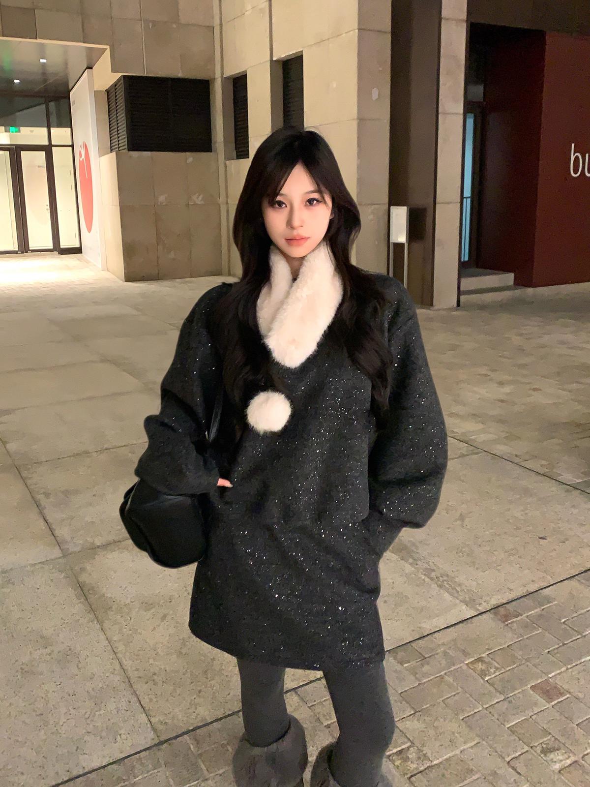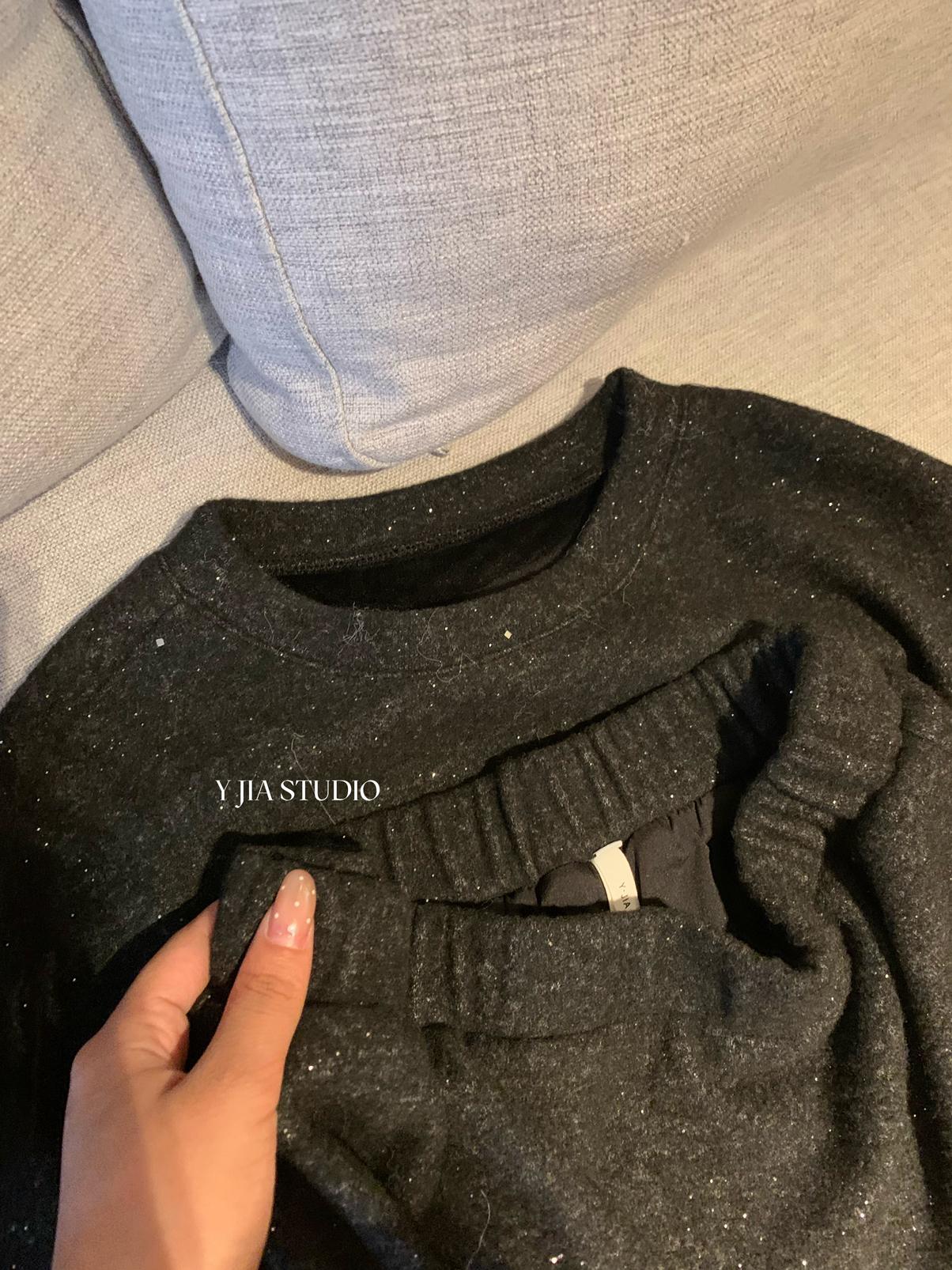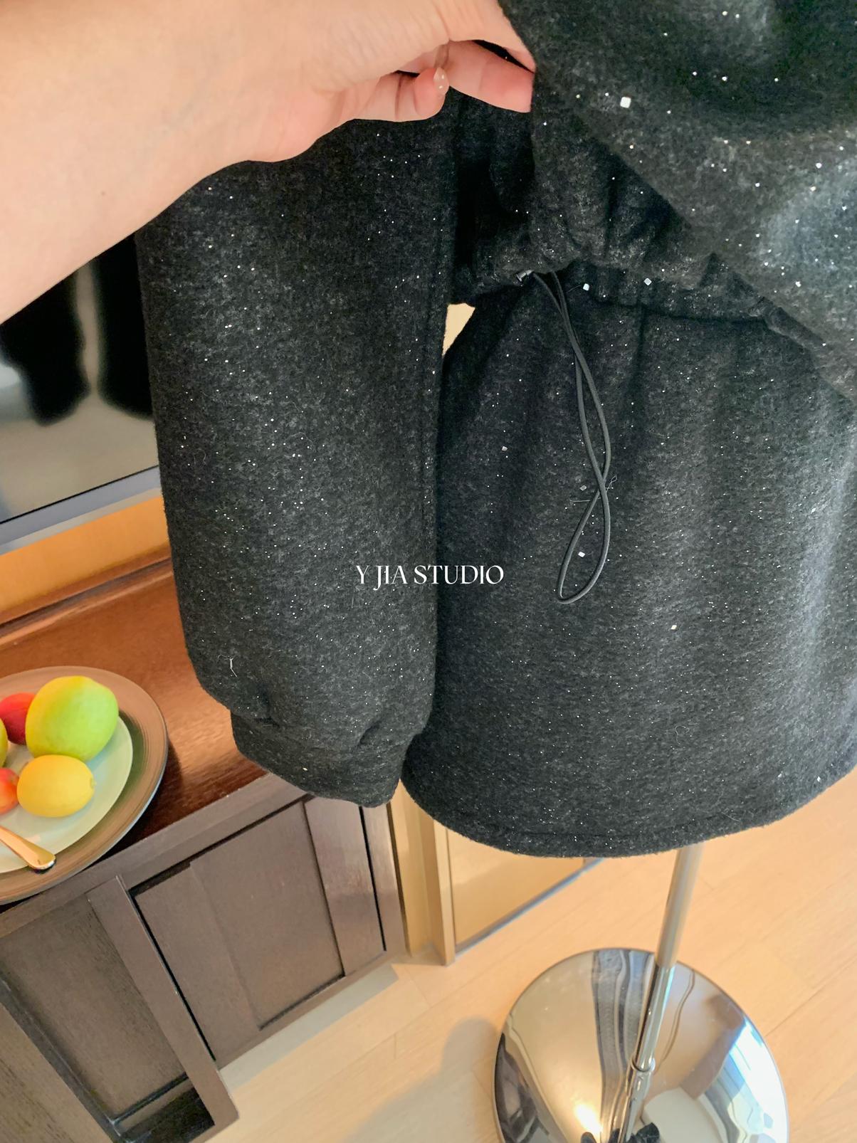 【C8365】亮閃閃套裝”高級感亮片圓領毛呢衛衣+高腰A字半身裙套裝(配可拆卸狐狸毛仿毛毛領)