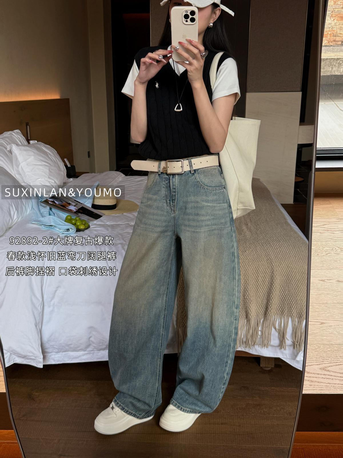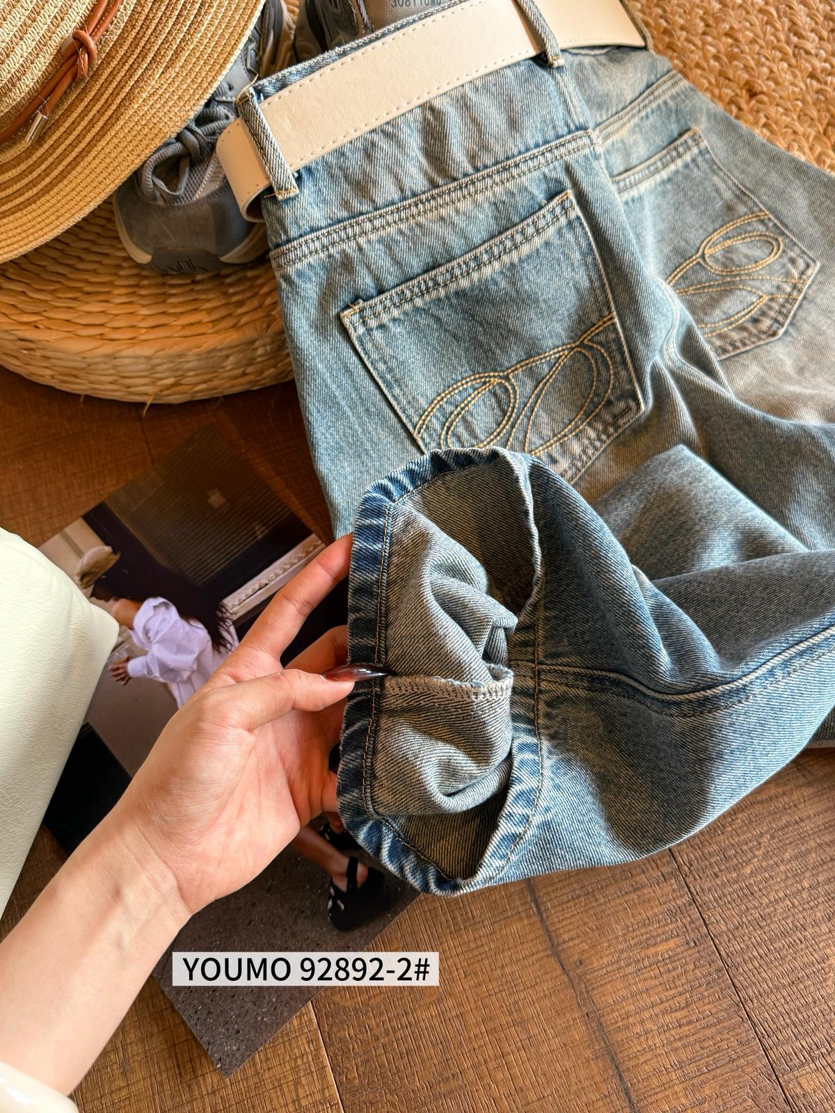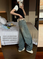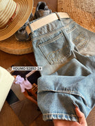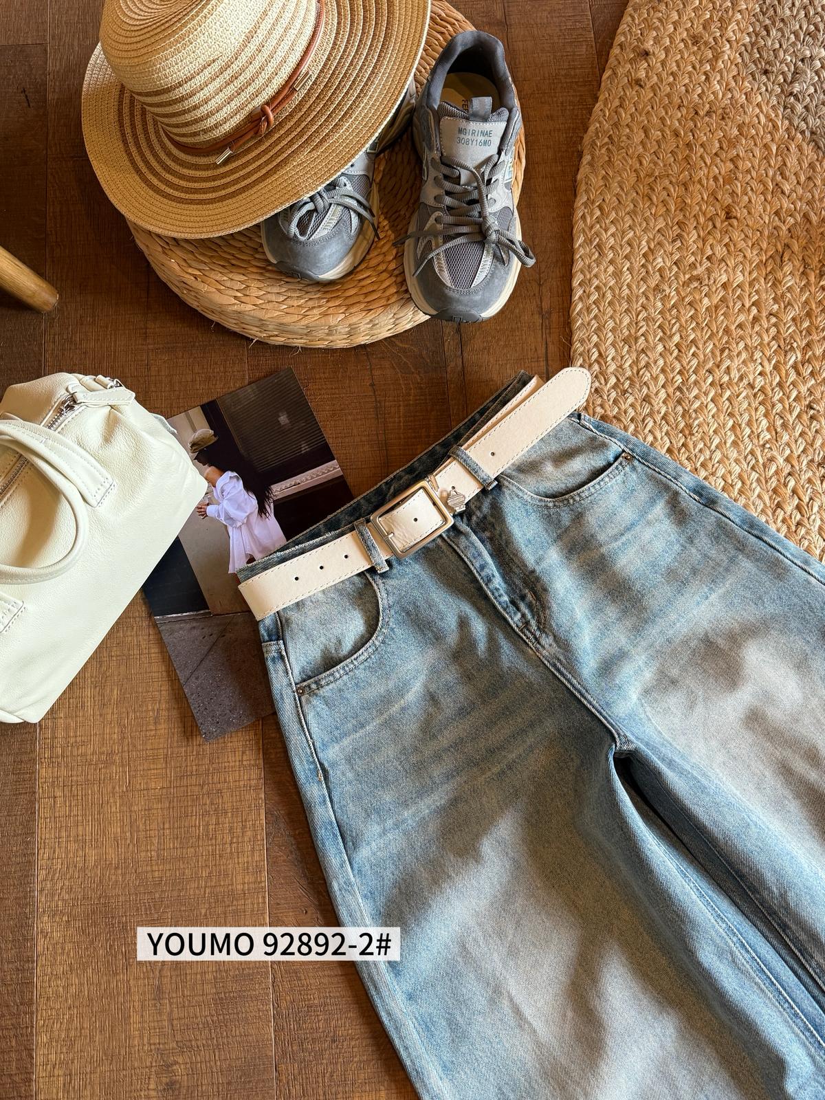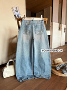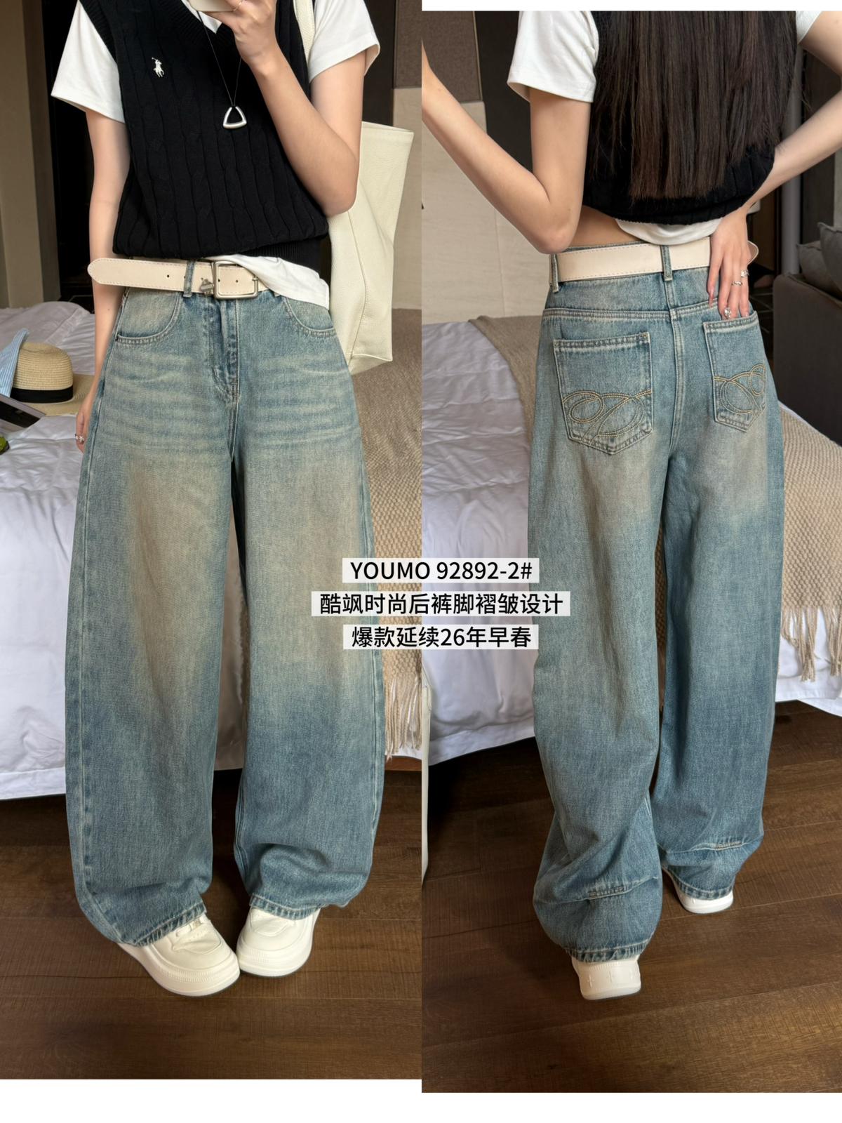 【C8377】酷颯街頭風后褲腳褶皺設計牛仔褲(配腰帶)