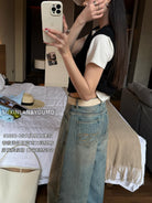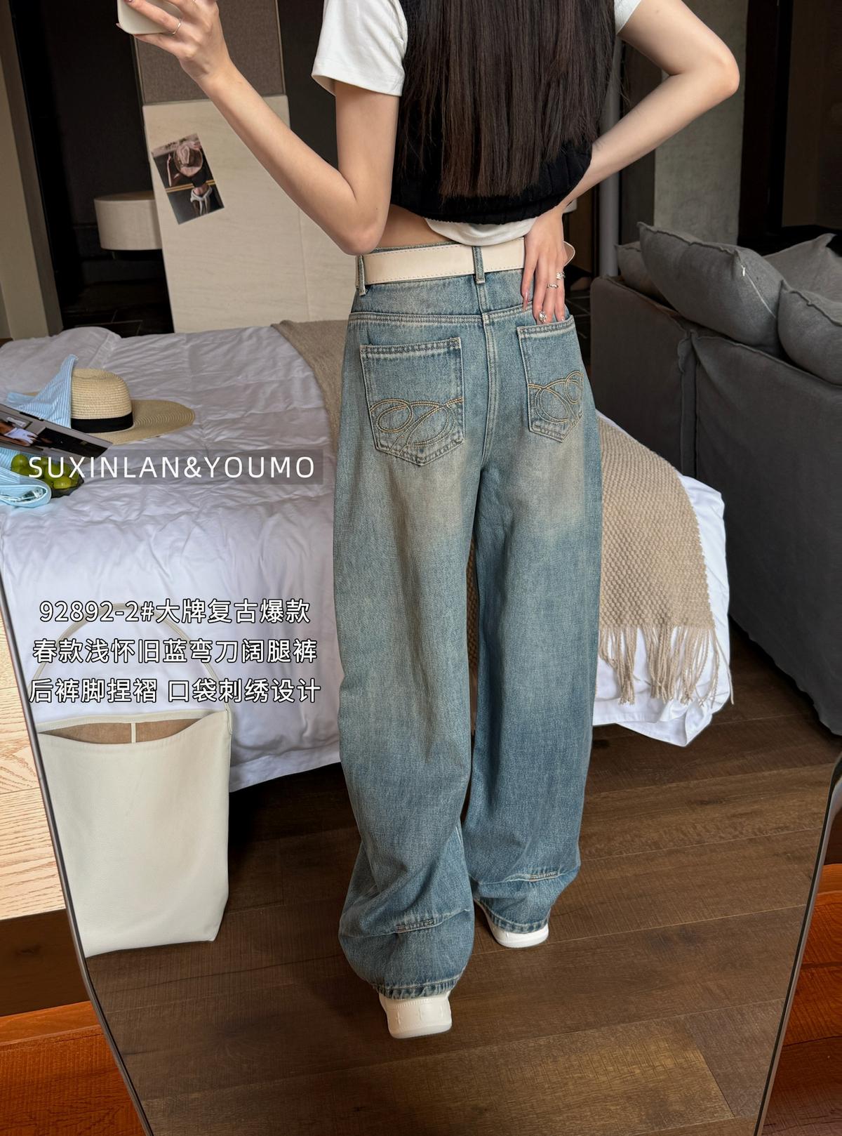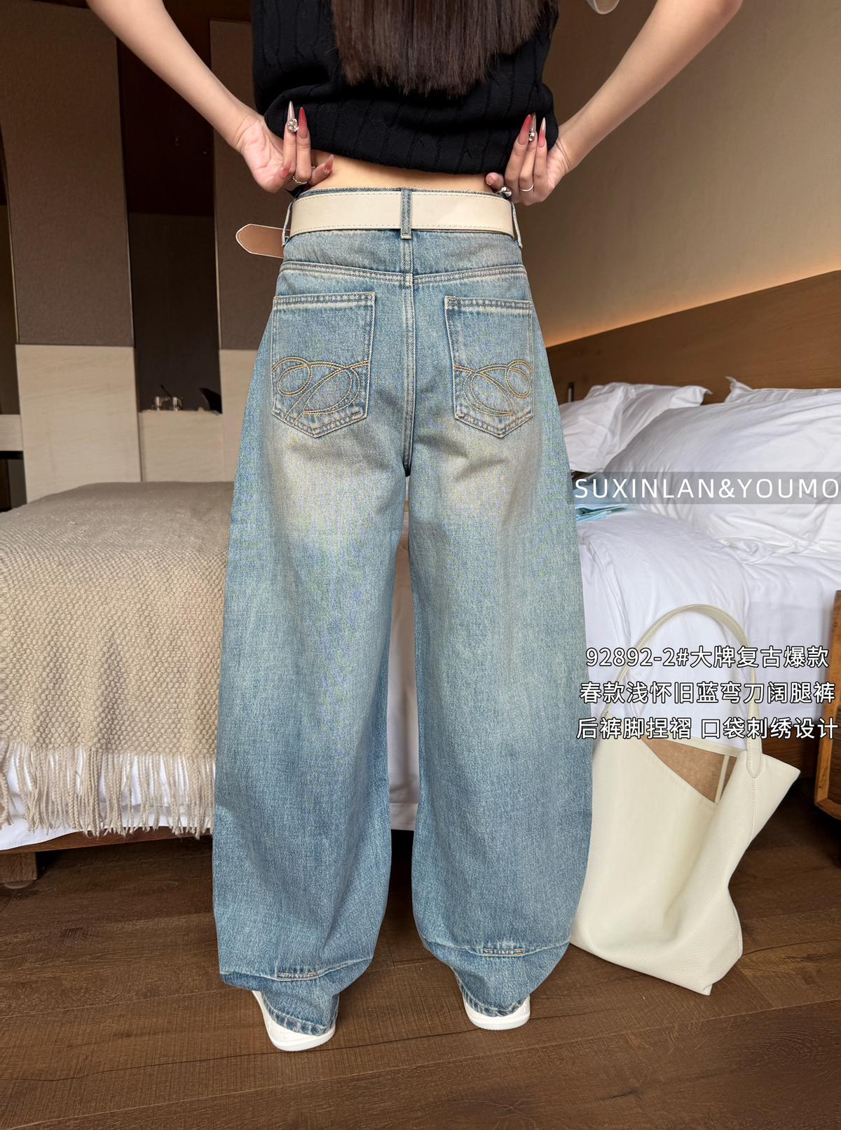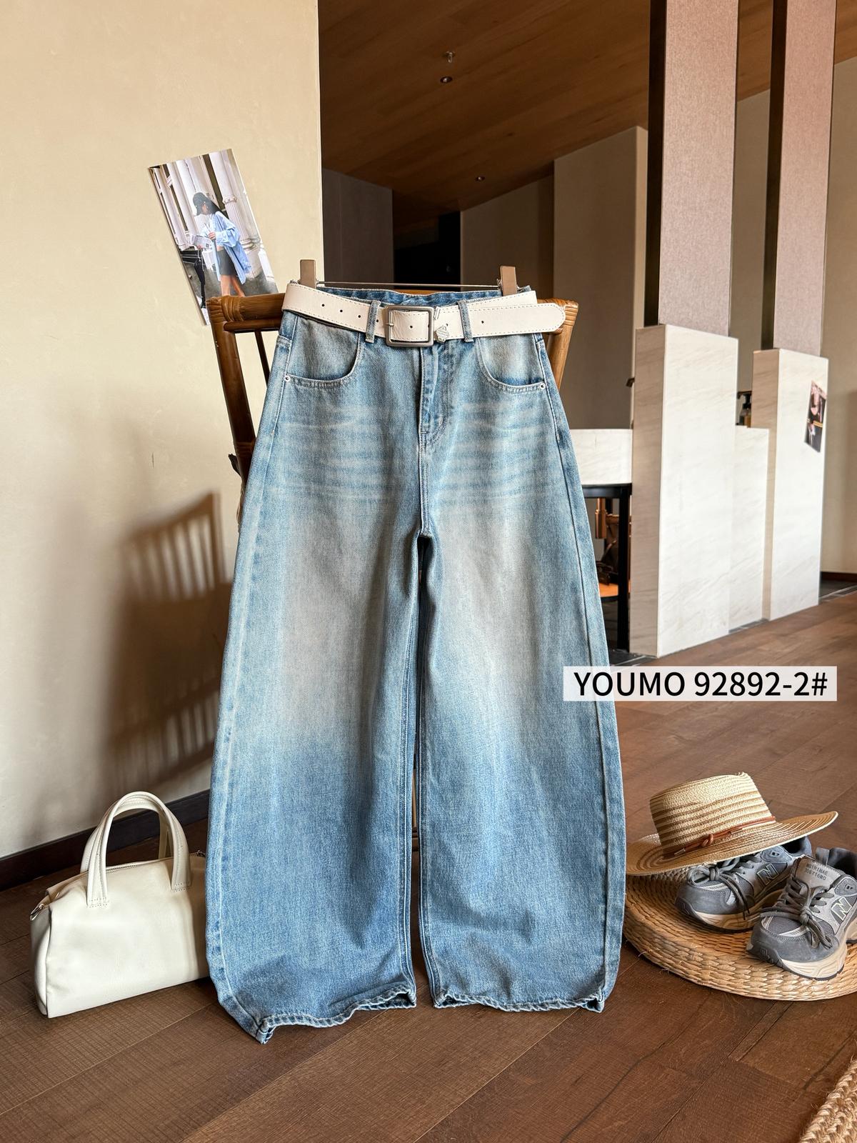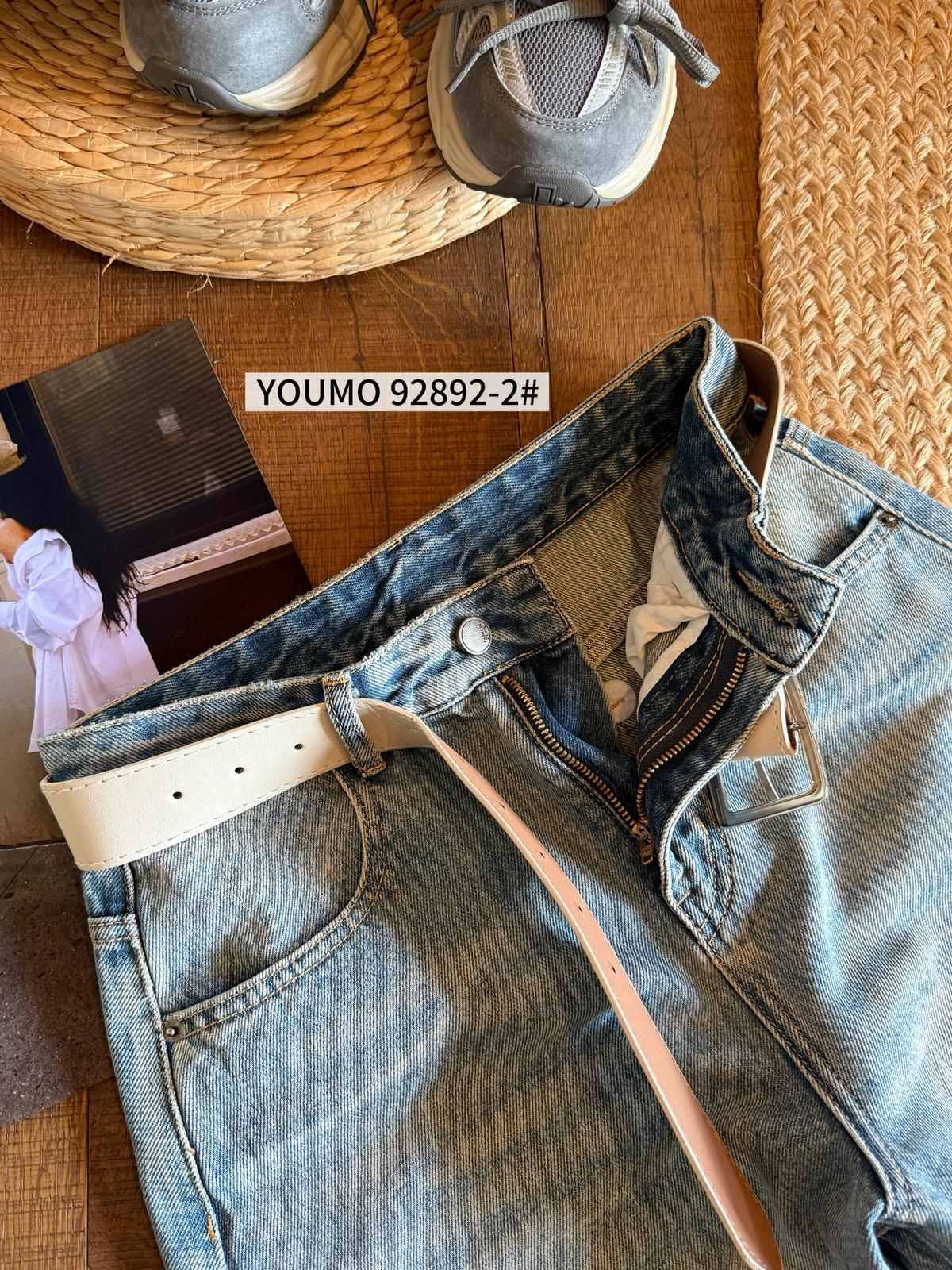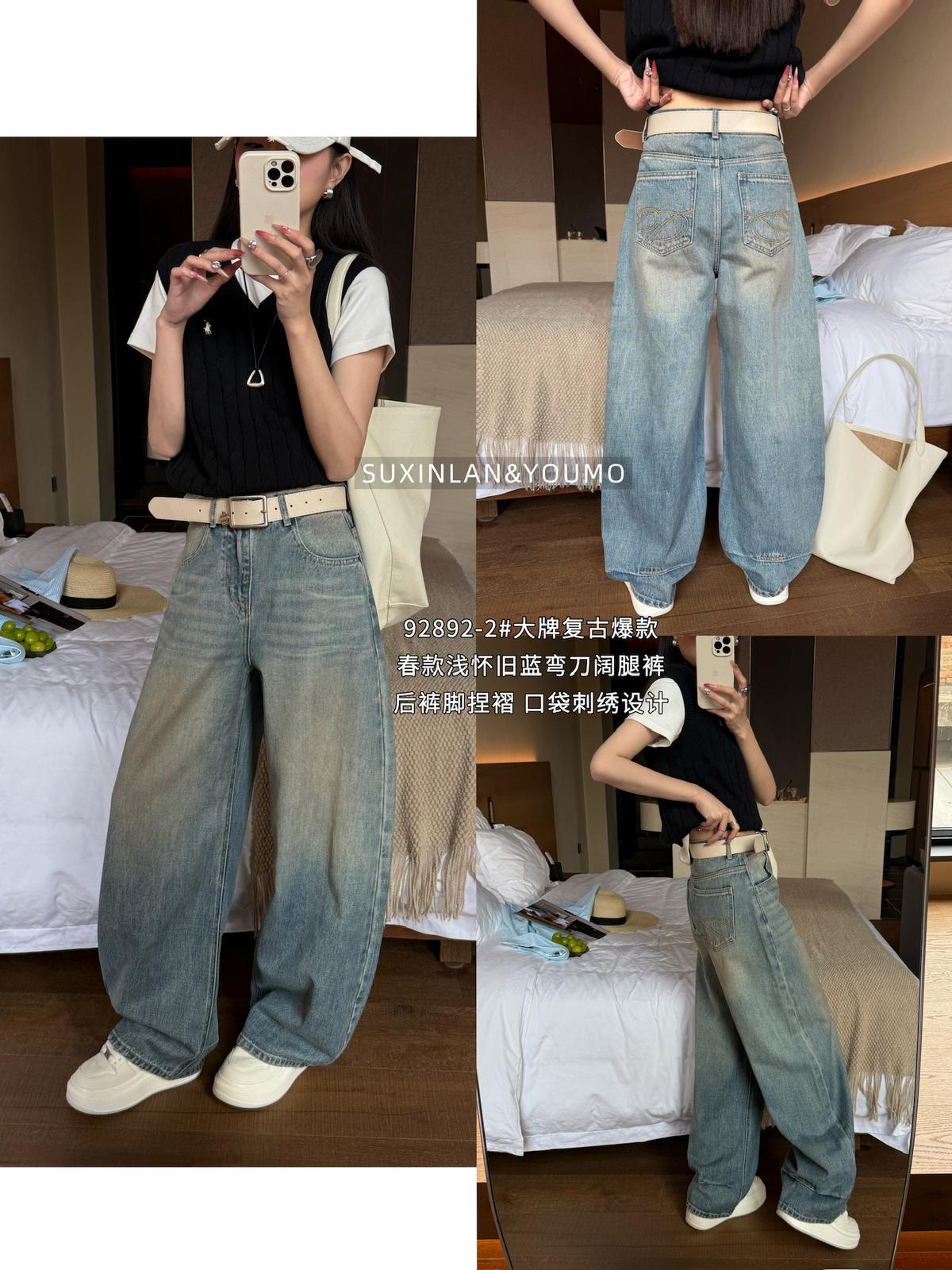 【C8377】酷颯街頭風后褲腳褶皺設計牛仔褲(配腰帶)