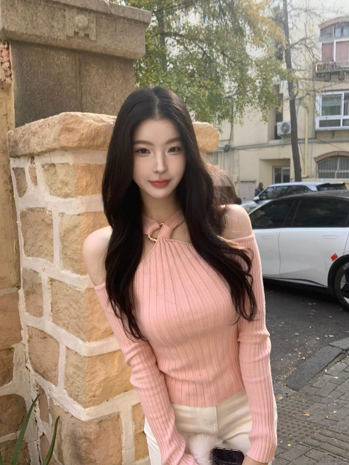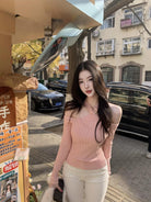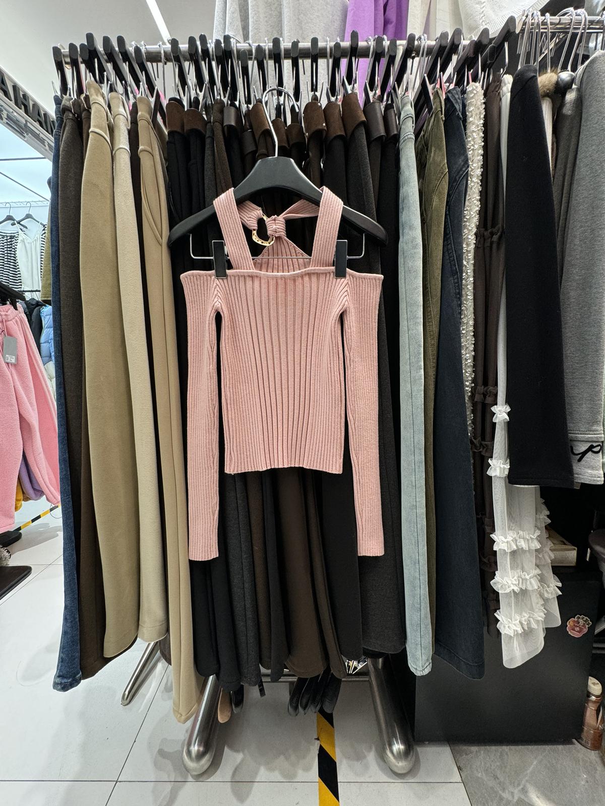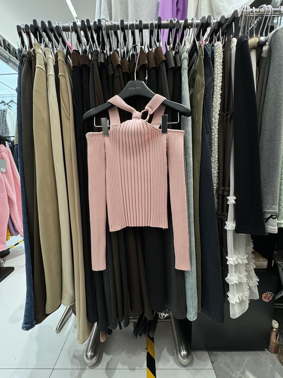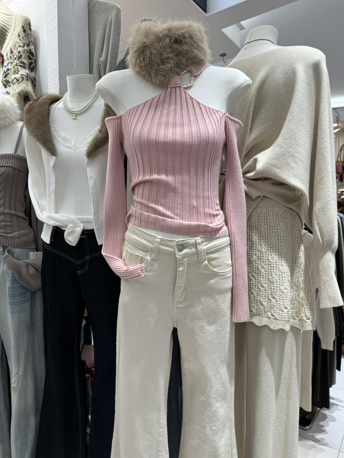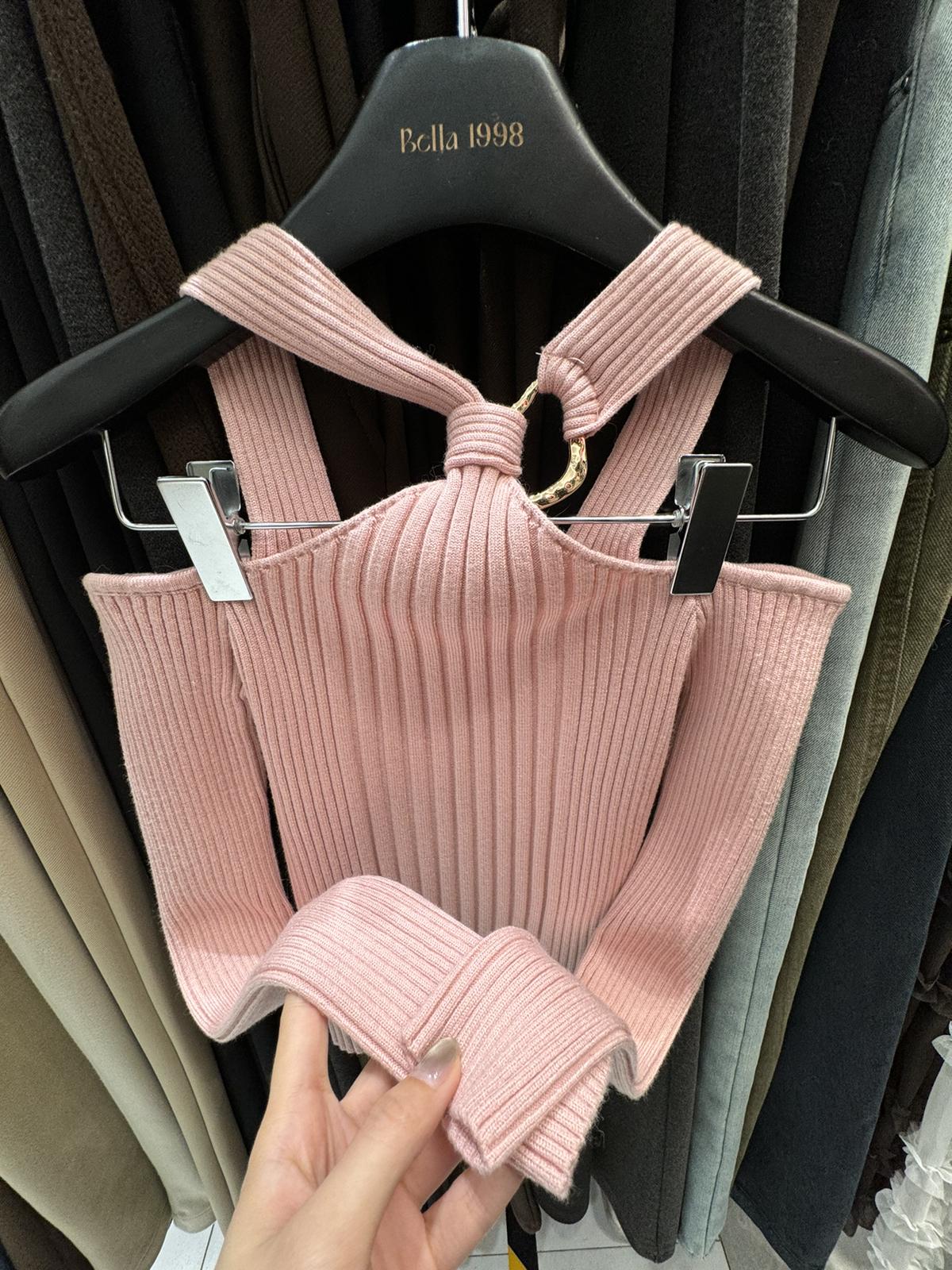 3. 【C8379】純欲露肩掛脖長袖坑條粉色毛衣修身收腰針織衫