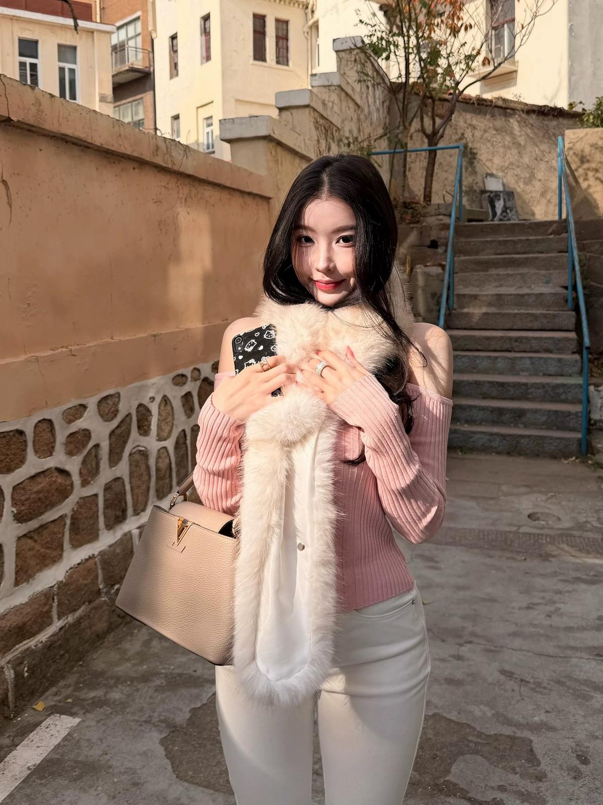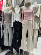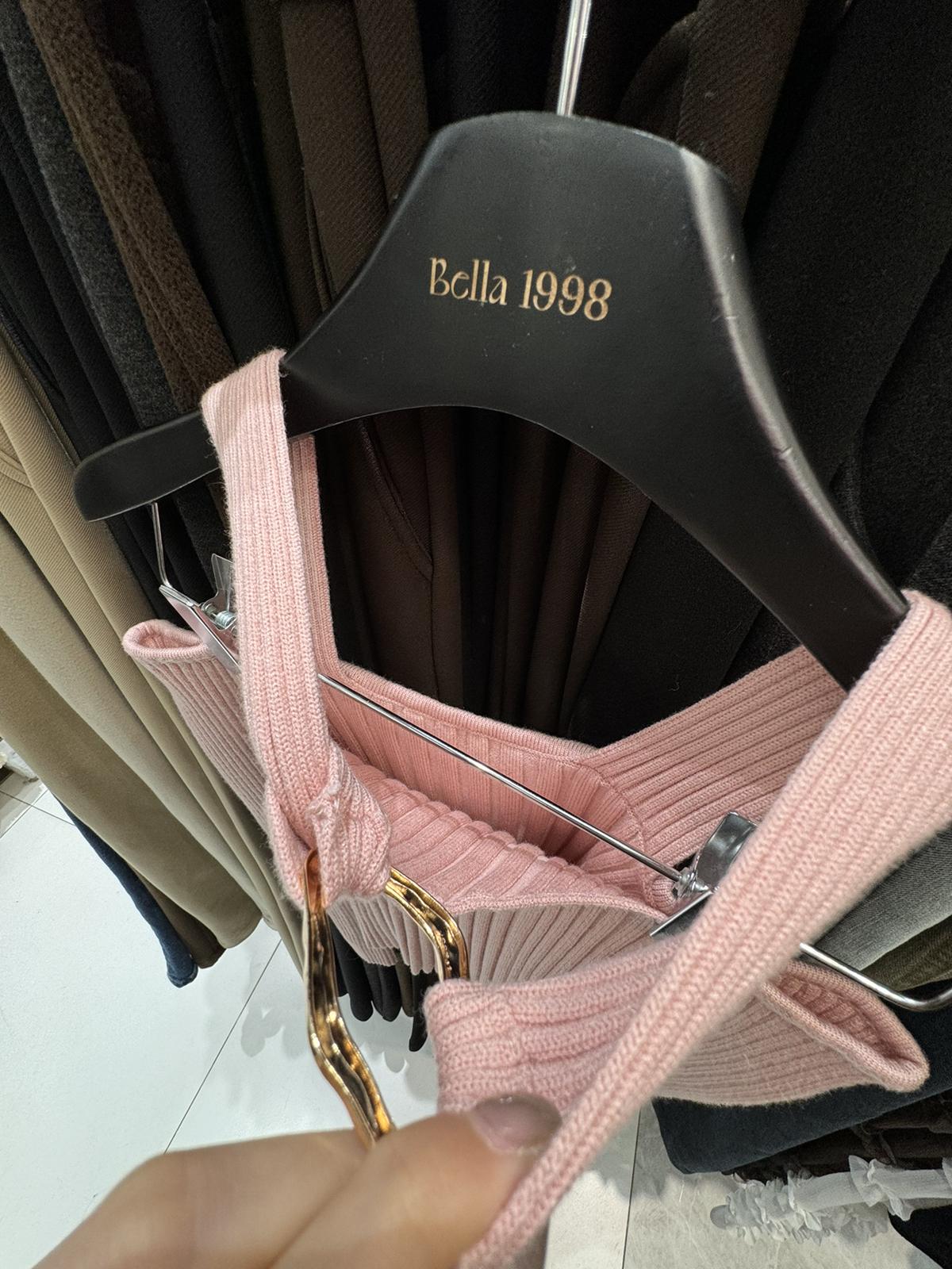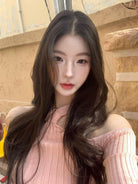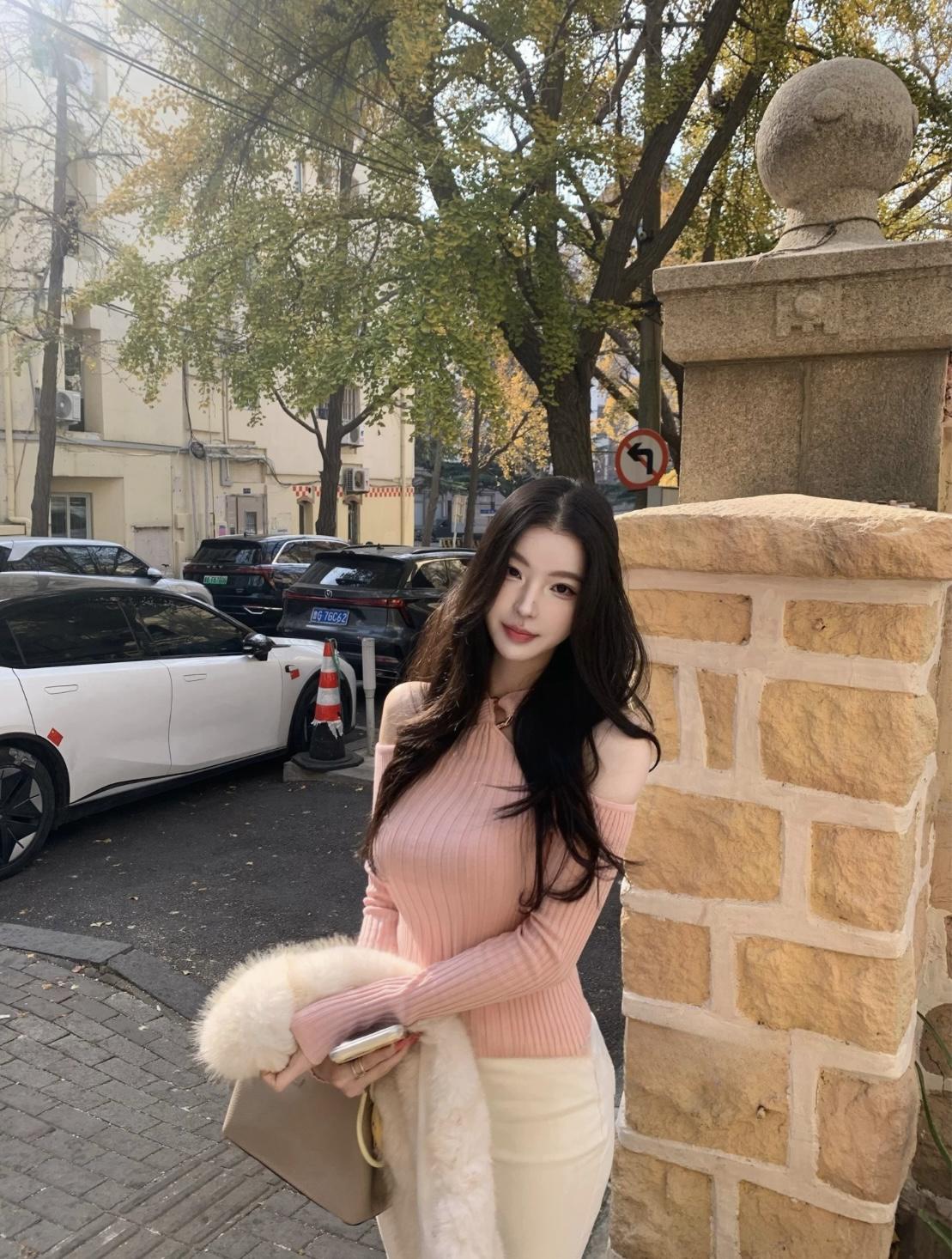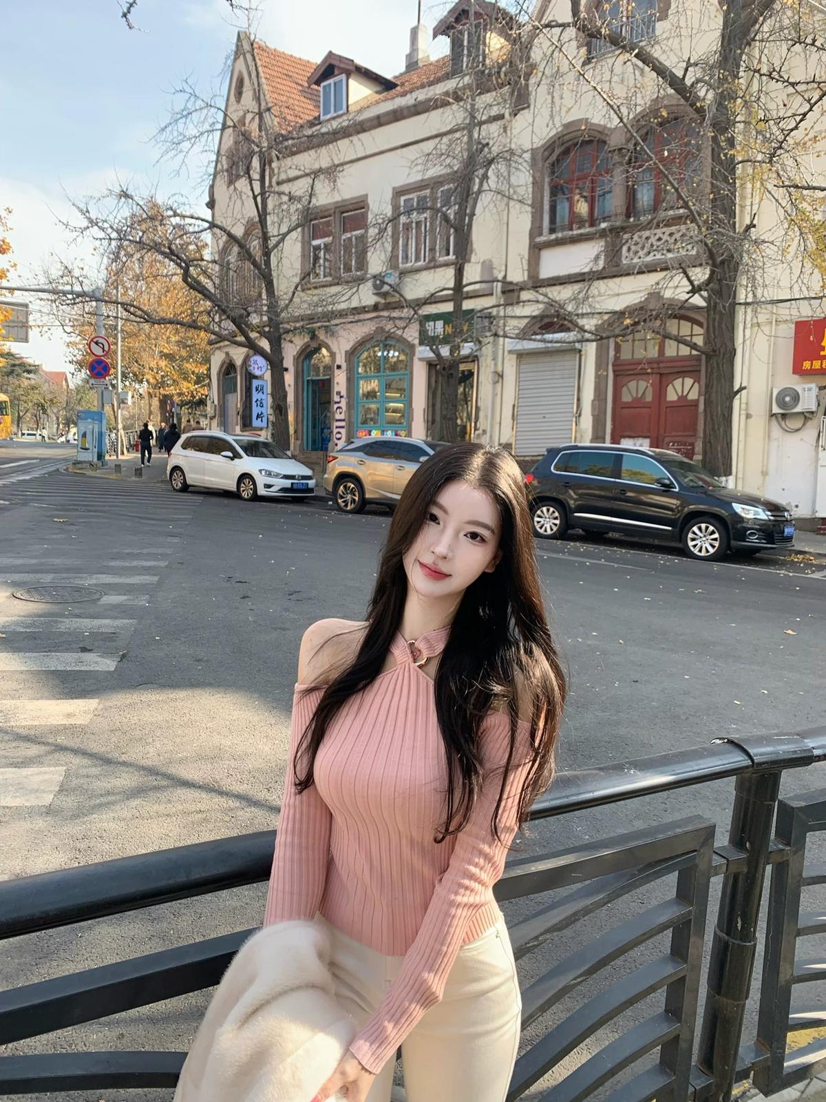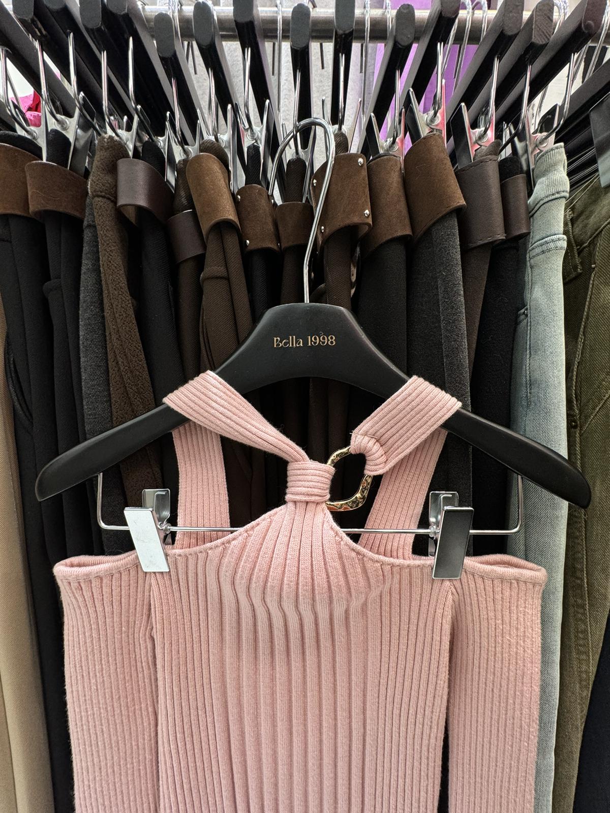 3. 【C8379】純欲露肩掛脖長袖坑條粉色毛衣修身收腰針織衫